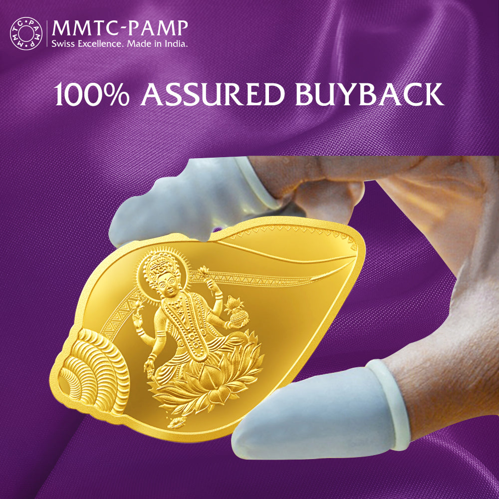 Laxmi Ganesh 24 carat (999.9 g) set of 10 gram Shankh shaped gold coins. Symbolizing wealth, prosperity and auspicious beginnings, these coins feature the revered images of Goddess Lakshmi and Lord Ganesha in a unique Shankh shape. Symbolically rich, this pair of stylish 24 carat 99.99%+ purest gold coins are precision crafted with finely embossed images of Goddess Lakshmi and Lord Ganesha in a first of its kind Shankh design. Both Goddess Lakshmi and Lord Ganesha are symbols of auspiciousness and prosperity and are revered across India.