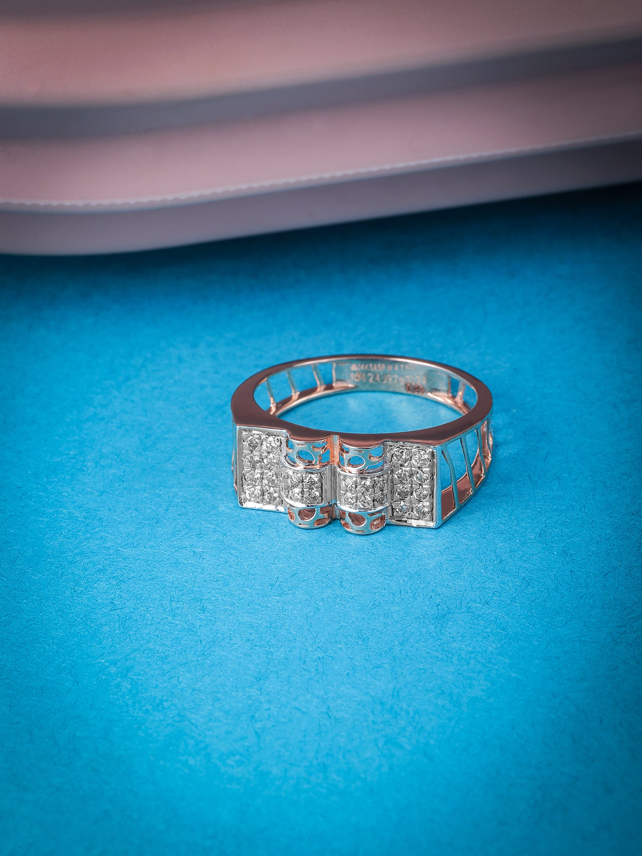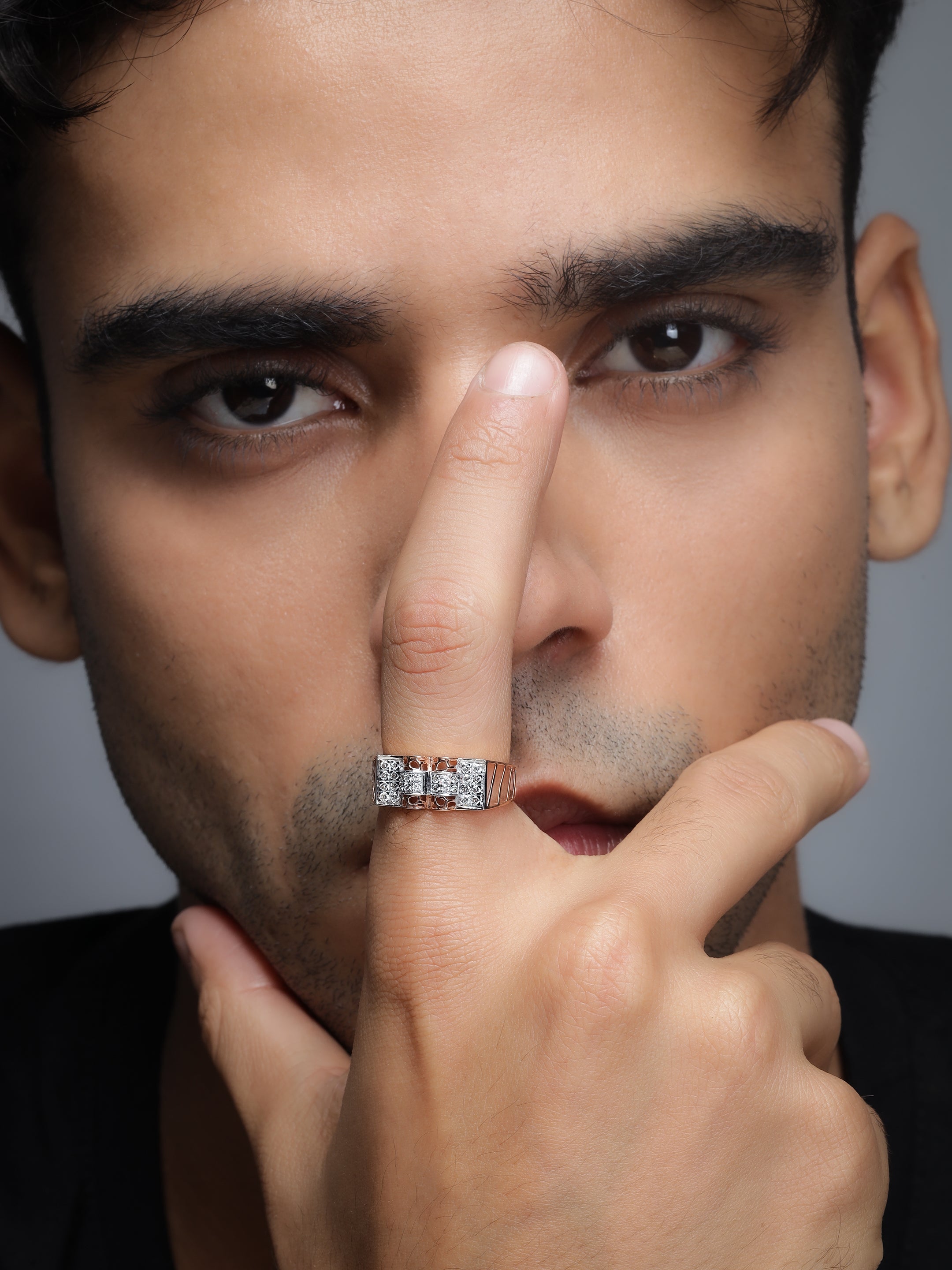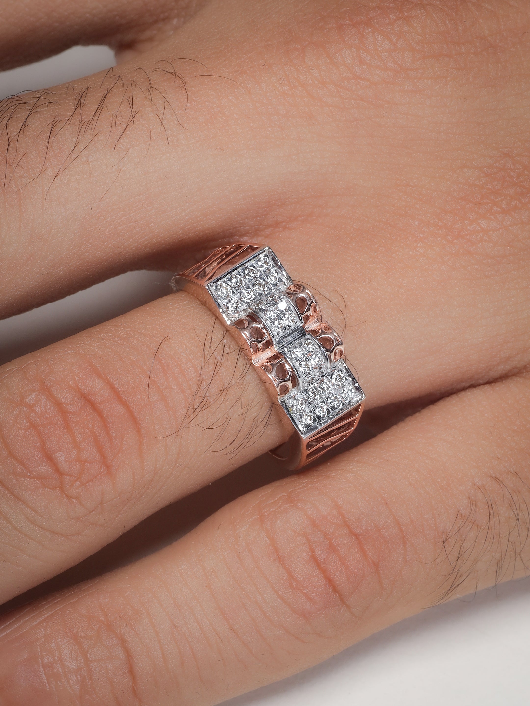 This ring is a sophisticated blend of classic opulence and modern flair. The central feature is a pair of intricately crafted bars that gracefully frame two clusters of brilliant diamonds. The bars are accentuated by a unique lattice pattern carved into the band, evoking a sense of regal elegance. The rose gold setting adds warmth and depth, enhancing the brilliance of the diamonds while the symmetrical design creates a balanced and harmonious aesthetic. This ring is a statement piece, perfect for the modern man with a taste for timeless luxury.