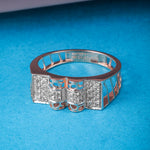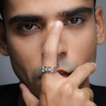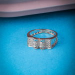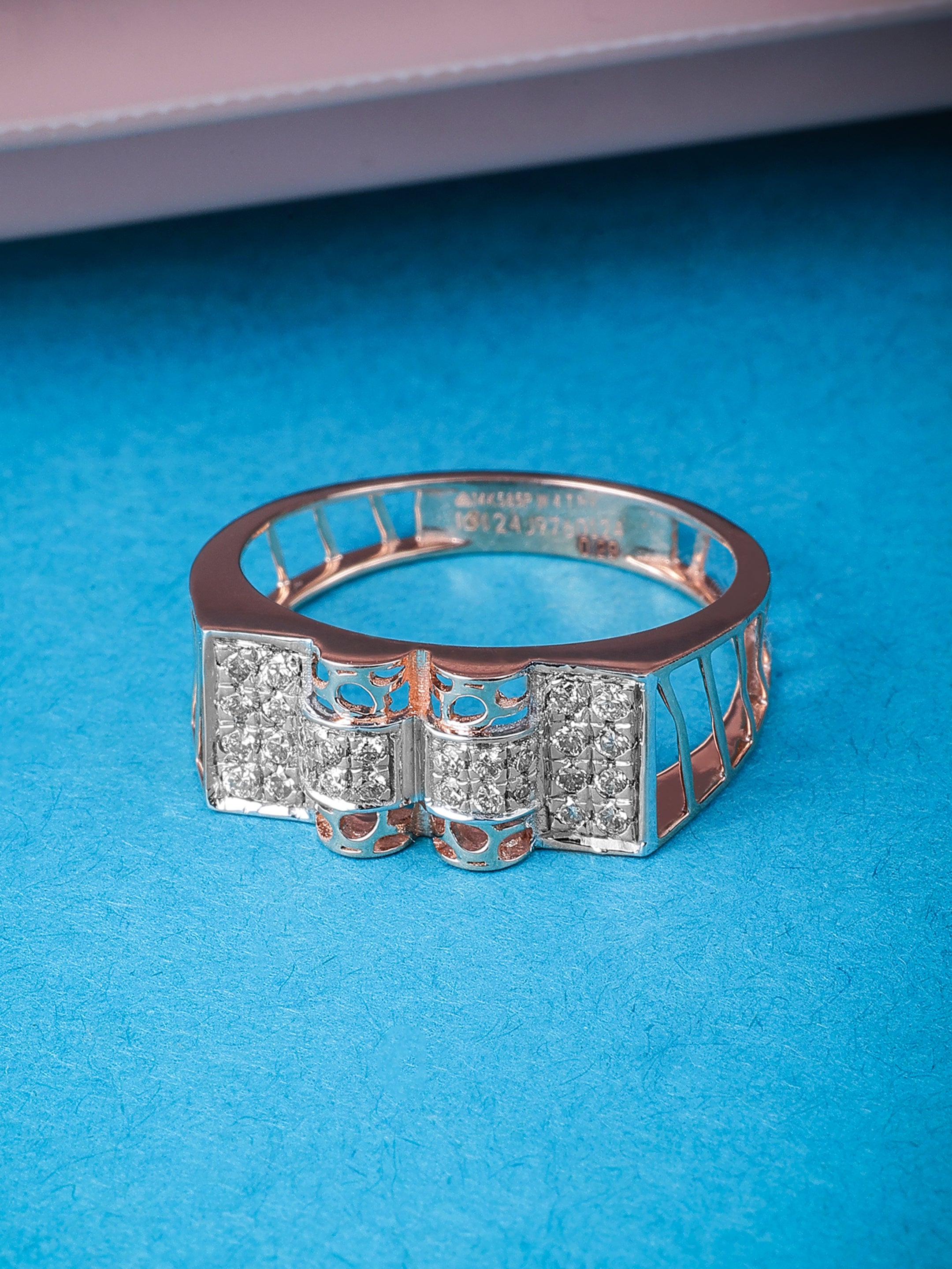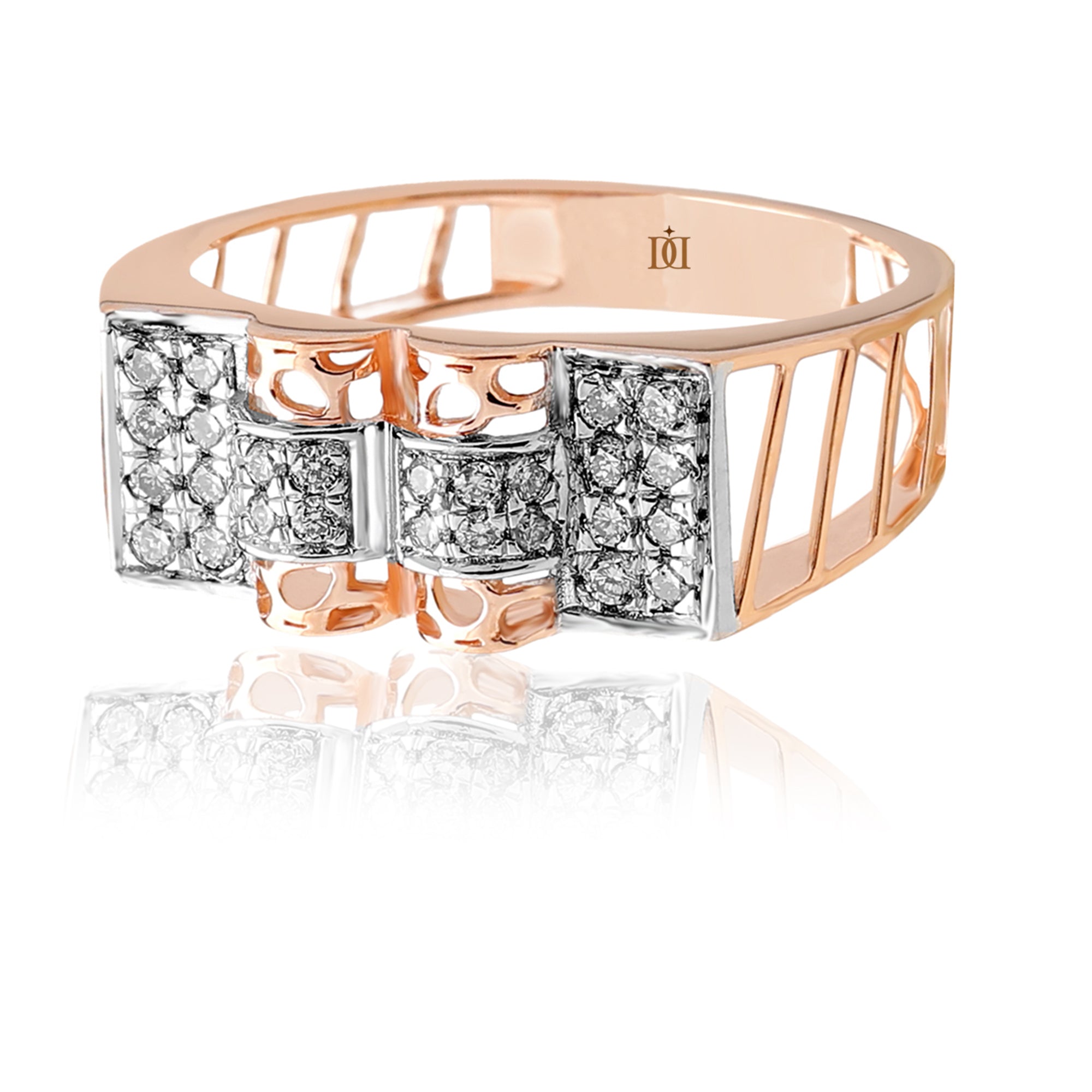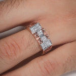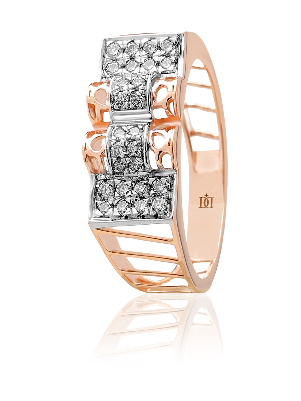 This ring is a sophisticated blend of classic opulence and modern flair. The central feature is a pair of intricately crafted bars that gracefully frame two clusters of brilliant diamonds. The bars are accentuated by a unique lattice pattern carved into the band, evoking a sense of regal elegance. The rose gold setting adds warmth and depth, enhancing the brilliance of the diamonds while the symmetrical design creates a balanced and harmonious aesthetic. This ring is a statement piece, perfect for the modern man with a taste for timeless luxury.