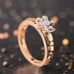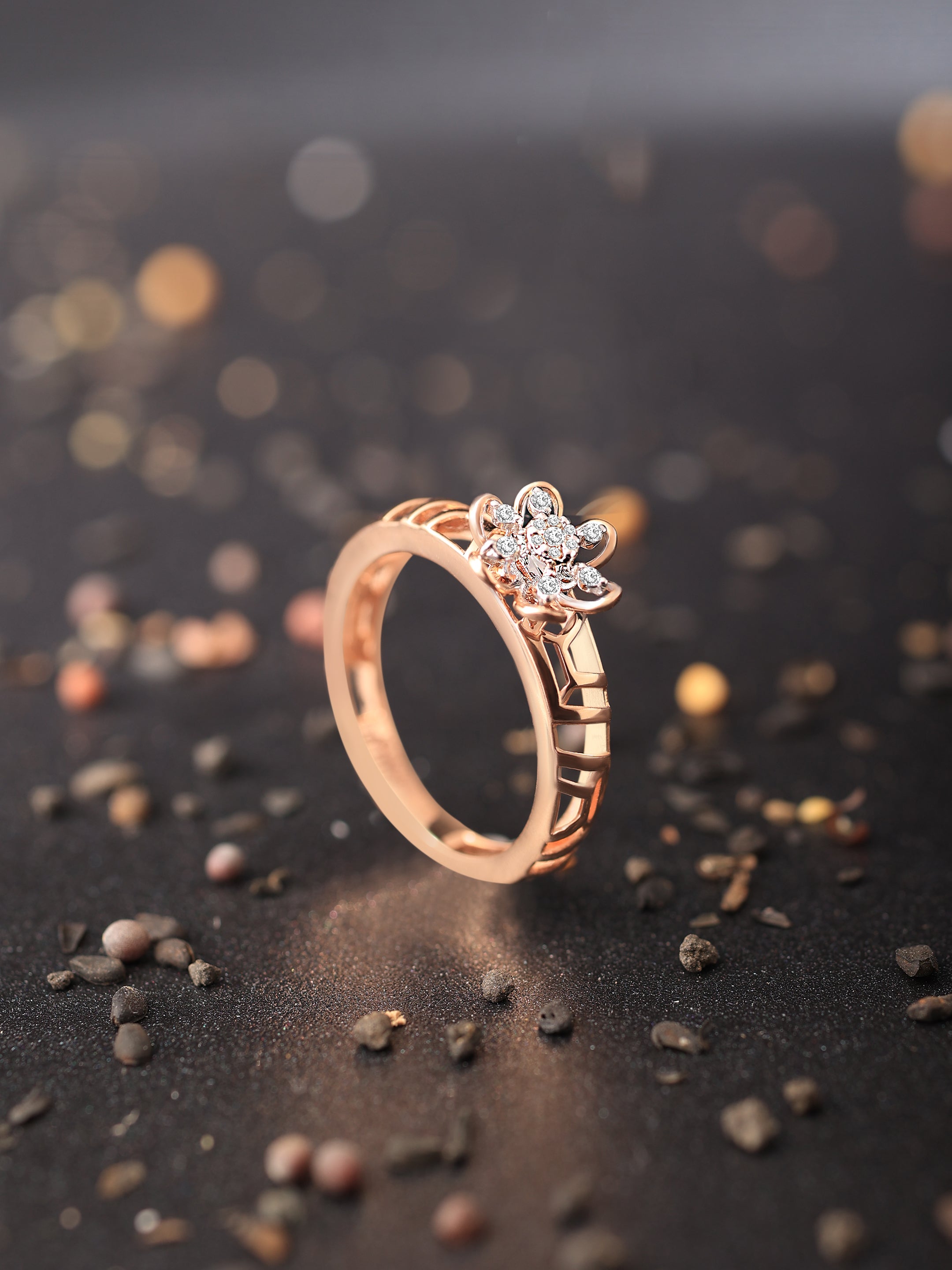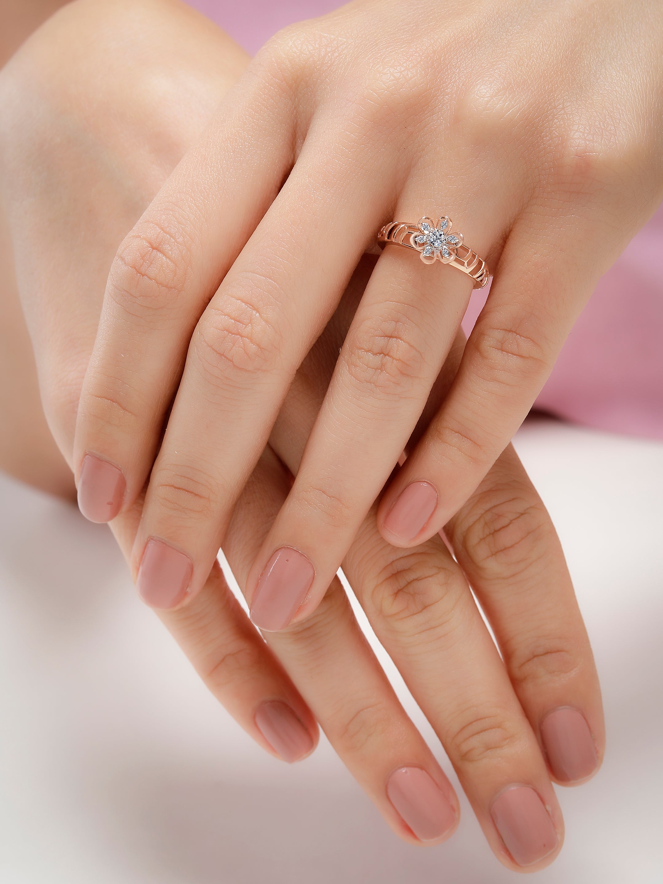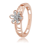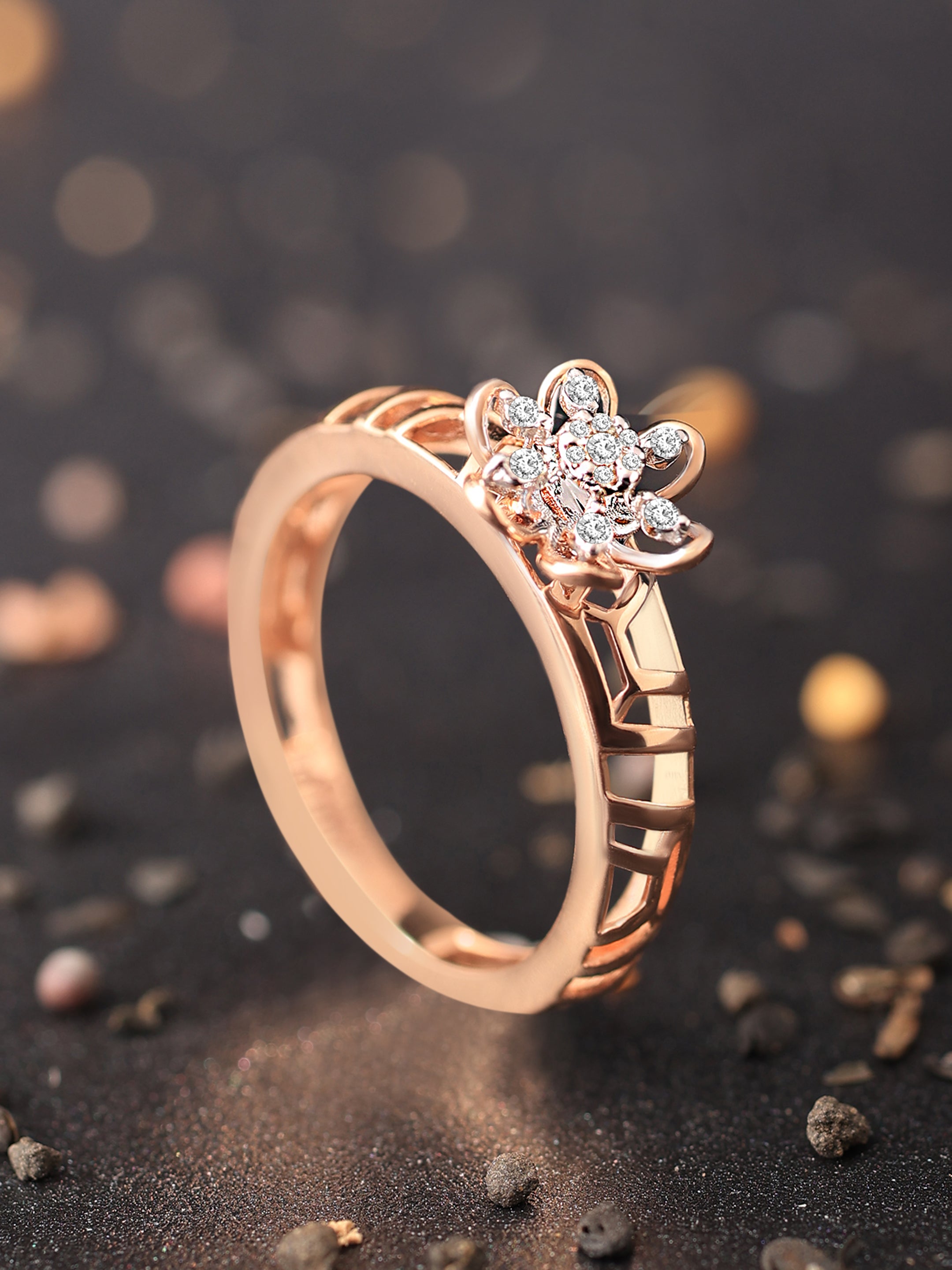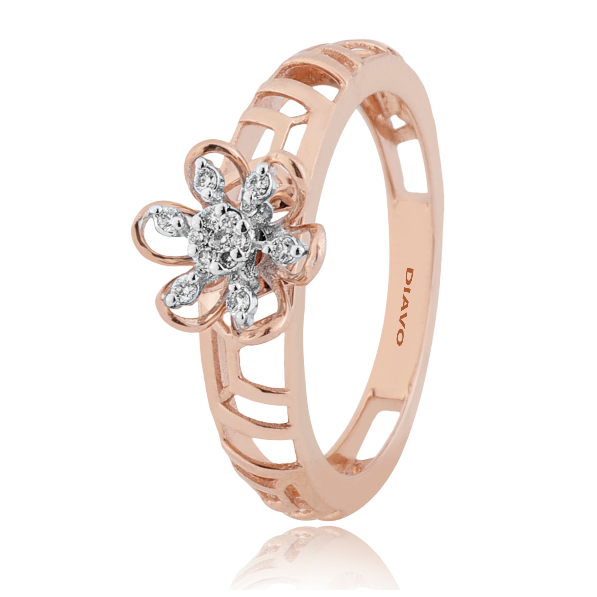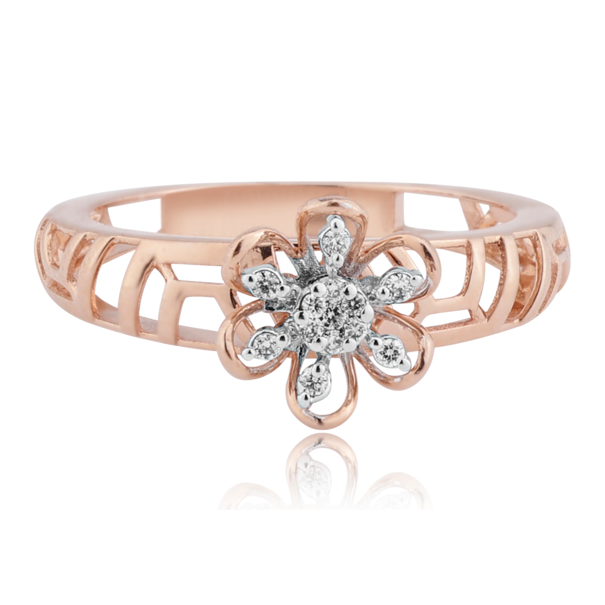 Introducing the Blossom Bliss Diamond Ring: Elevate your style with the Blossom Bliss Diamond Ring. Crafted in gold, this exquisite ring features a captivating band with an authentic design. The band showcases an intricate pattern with open spaces. At the heart of the ring, a delicate flower flourishes, adorned with natural round brilliant diamonds. This design embodies the elegance of nature's harmony.