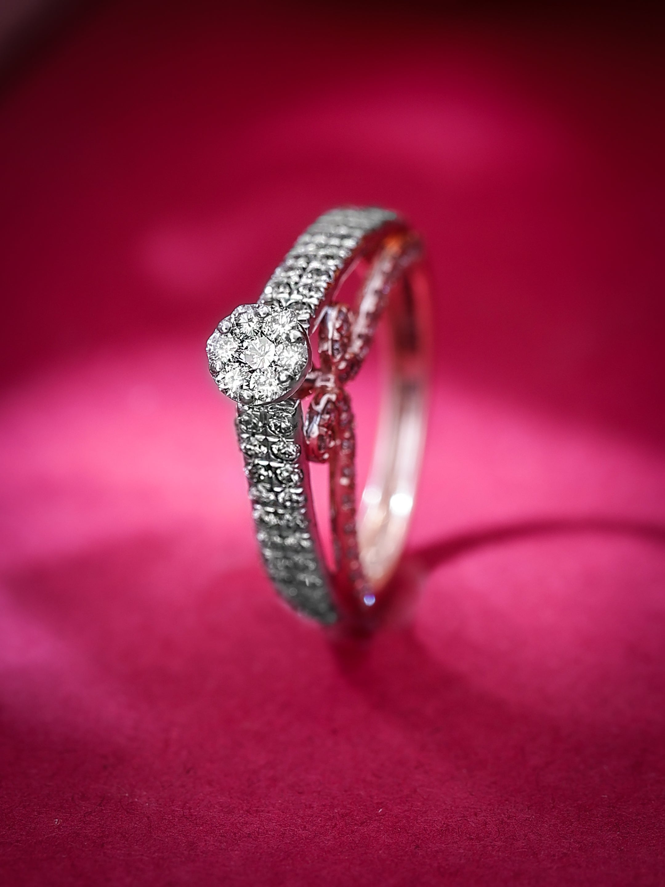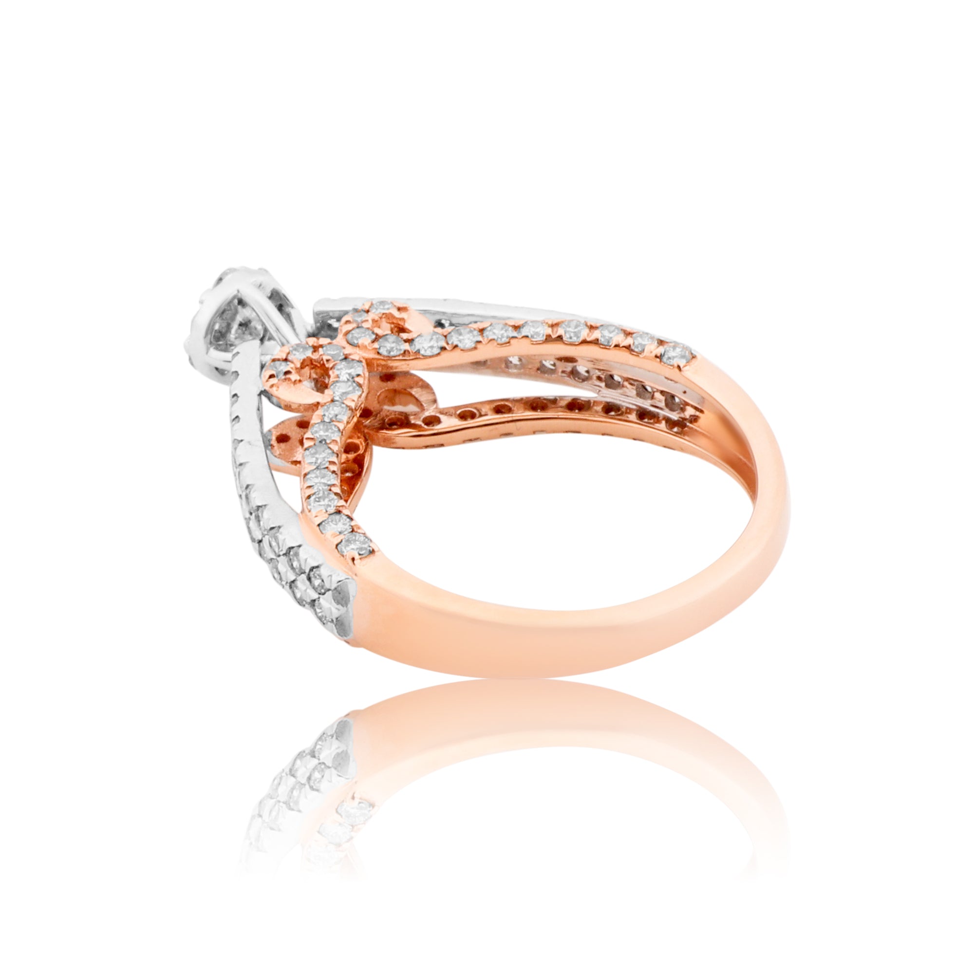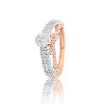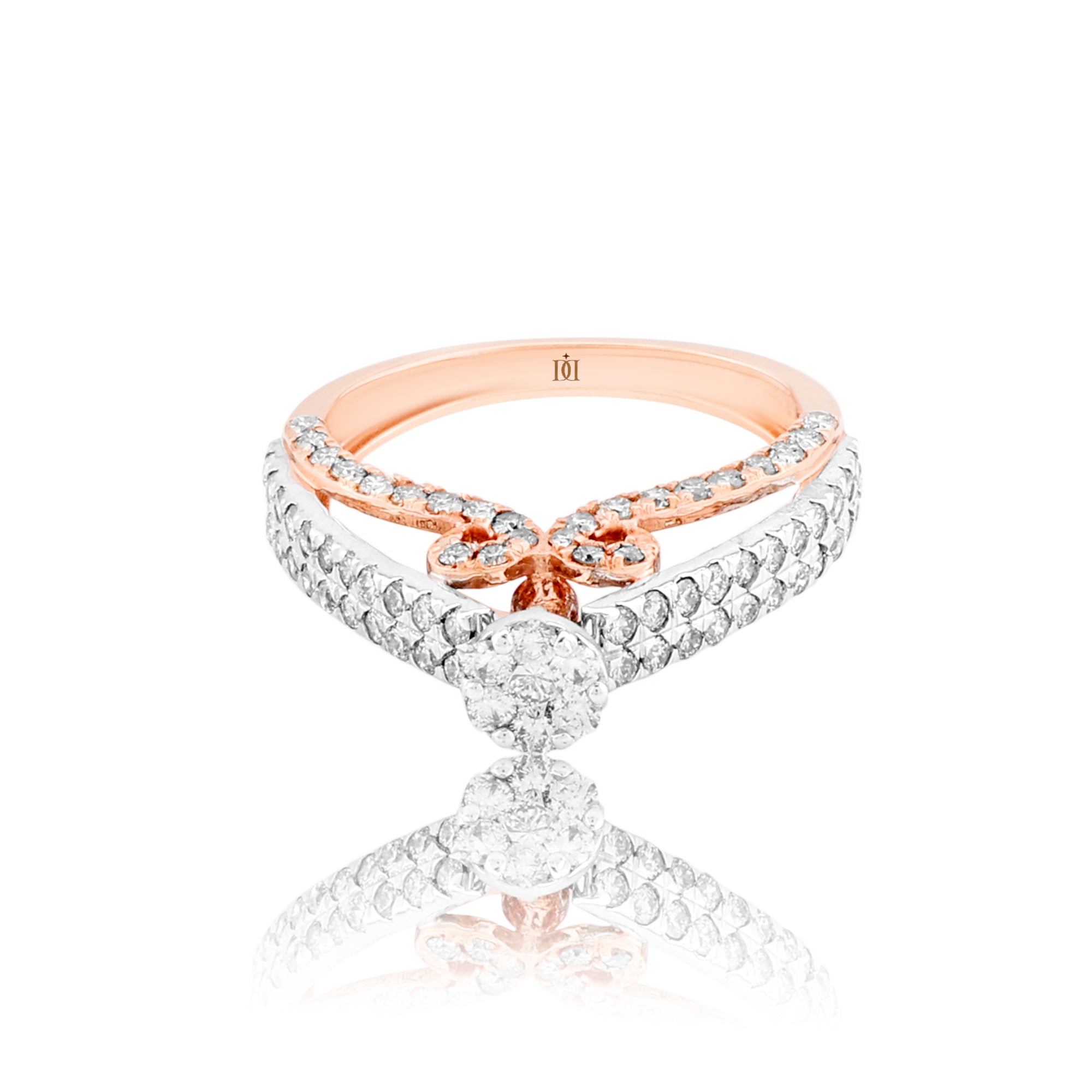 Introducing the Bow of Brilliance Dual Layer Diamond Ring, a masterpiece of layered elegance and sparkling sophistication. This stunning ring features two exquisite layers: the lower layer crafted in rose gold adorned with petite diamonds, and the upper layer completely covered with a shimmering array of diamonds. At the center, an elevated bow-shaped design takes center stage, encrusted with brilliant diamonds, adding a touch of whimsical charm and refinement. Perfect for those who appreciate intricate details and luxurious finishes, the Bow of Brilliance Dual Layer Diamond Ring is a true symbol of timeless beauty and elegance, designed to captivate and enchant.