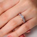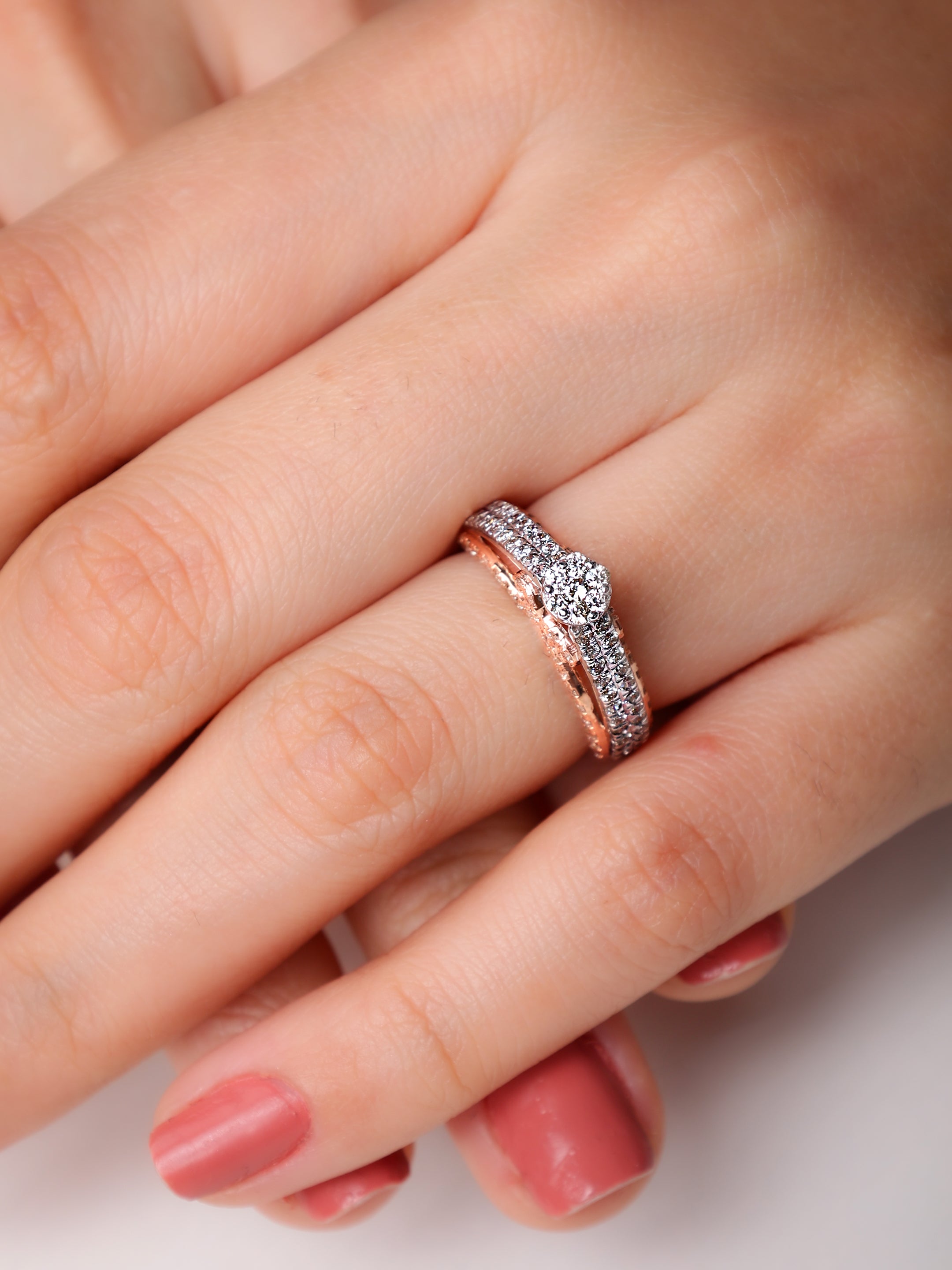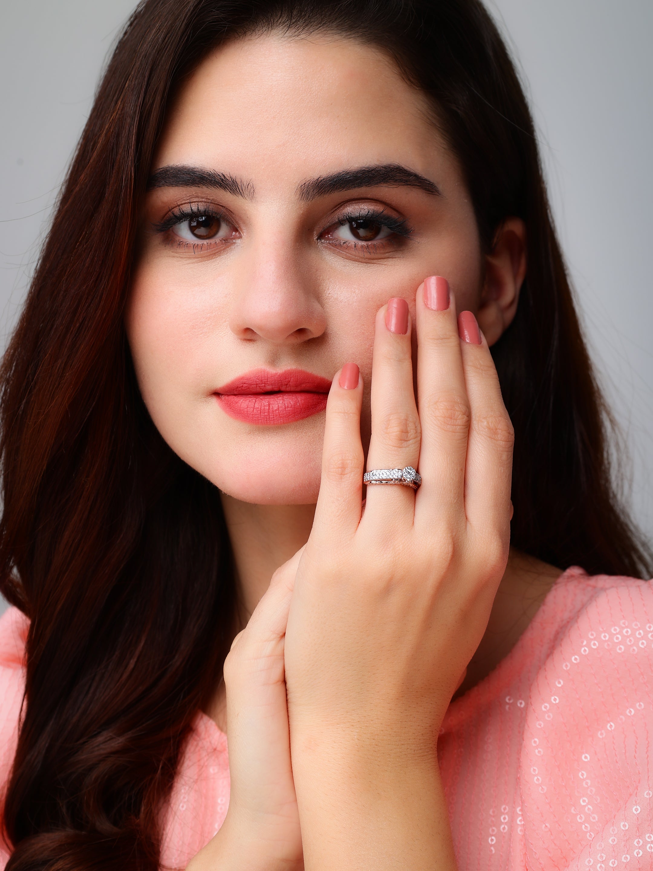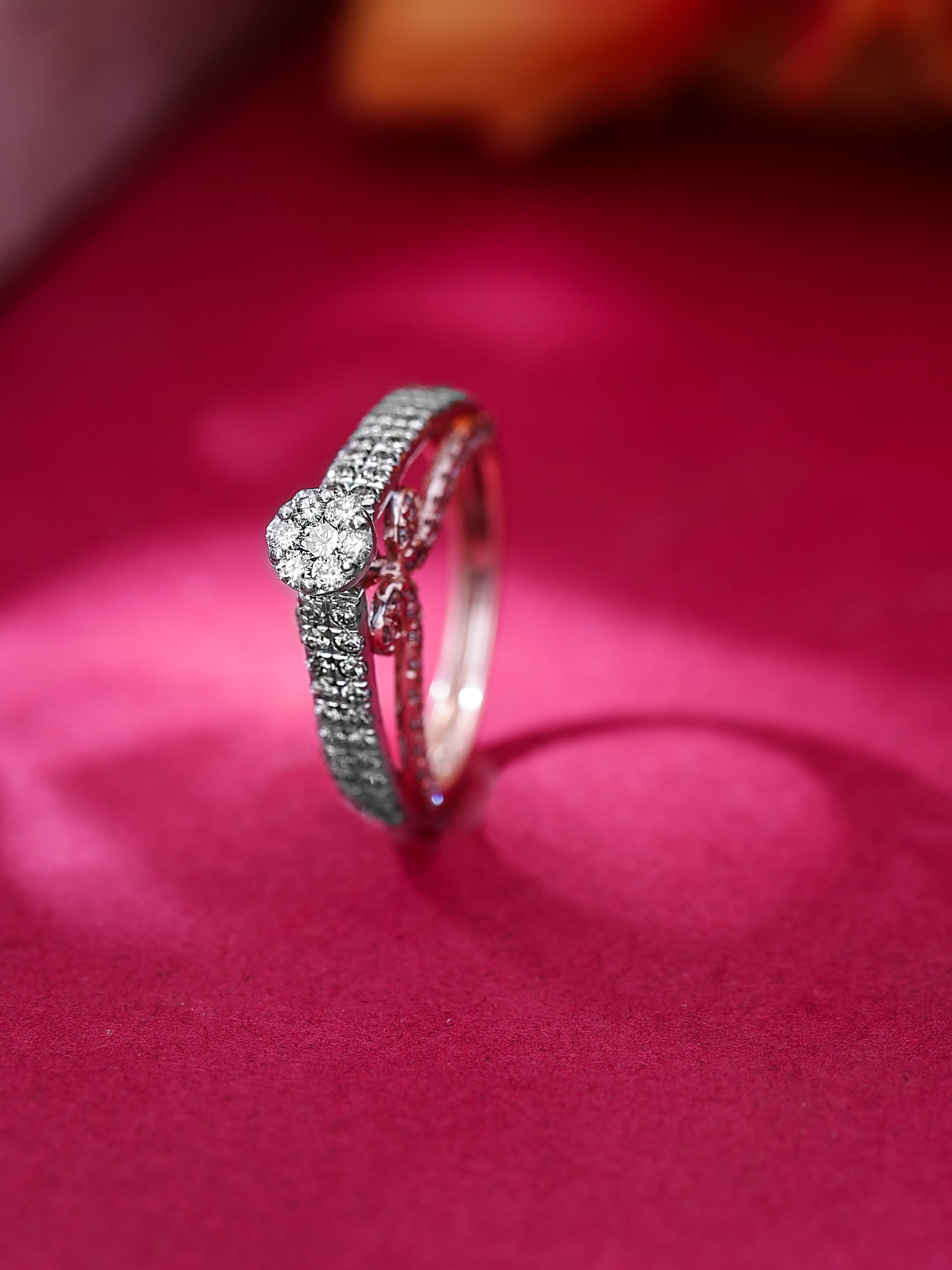 Introducing the Bow of Brilliance Dual Layer Diamond Ring, a masterpiece of layered elegance and sparkling sophistication. This stunning ring features two exquisite layers: the lower layer crafted in rose gold adorned with petite diamonds, and the upper layer completely covered with a shimmering array of diamonds. At the center, an elevated bow-shaped design takes center stage, encrusted with brilliant diamonds, adding a touch of whimsical charm and refinement. Perfect for those who appreciate intricate details and luxurious finishes, the Bow of Brilliance Dual Layer Diamond Ring is a true symbol of timeless beauty and elegance, designed to captivate and enchant.