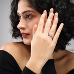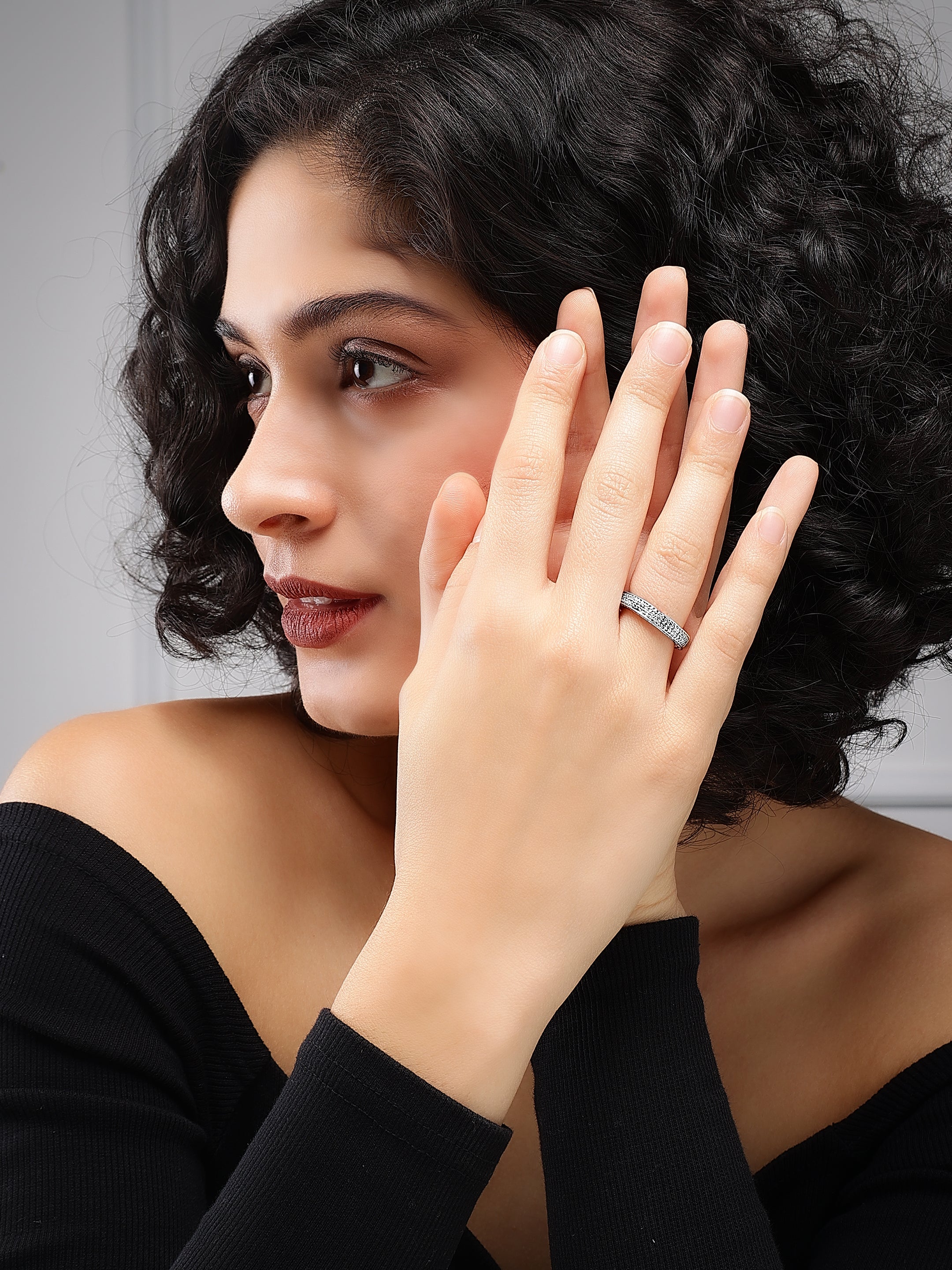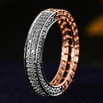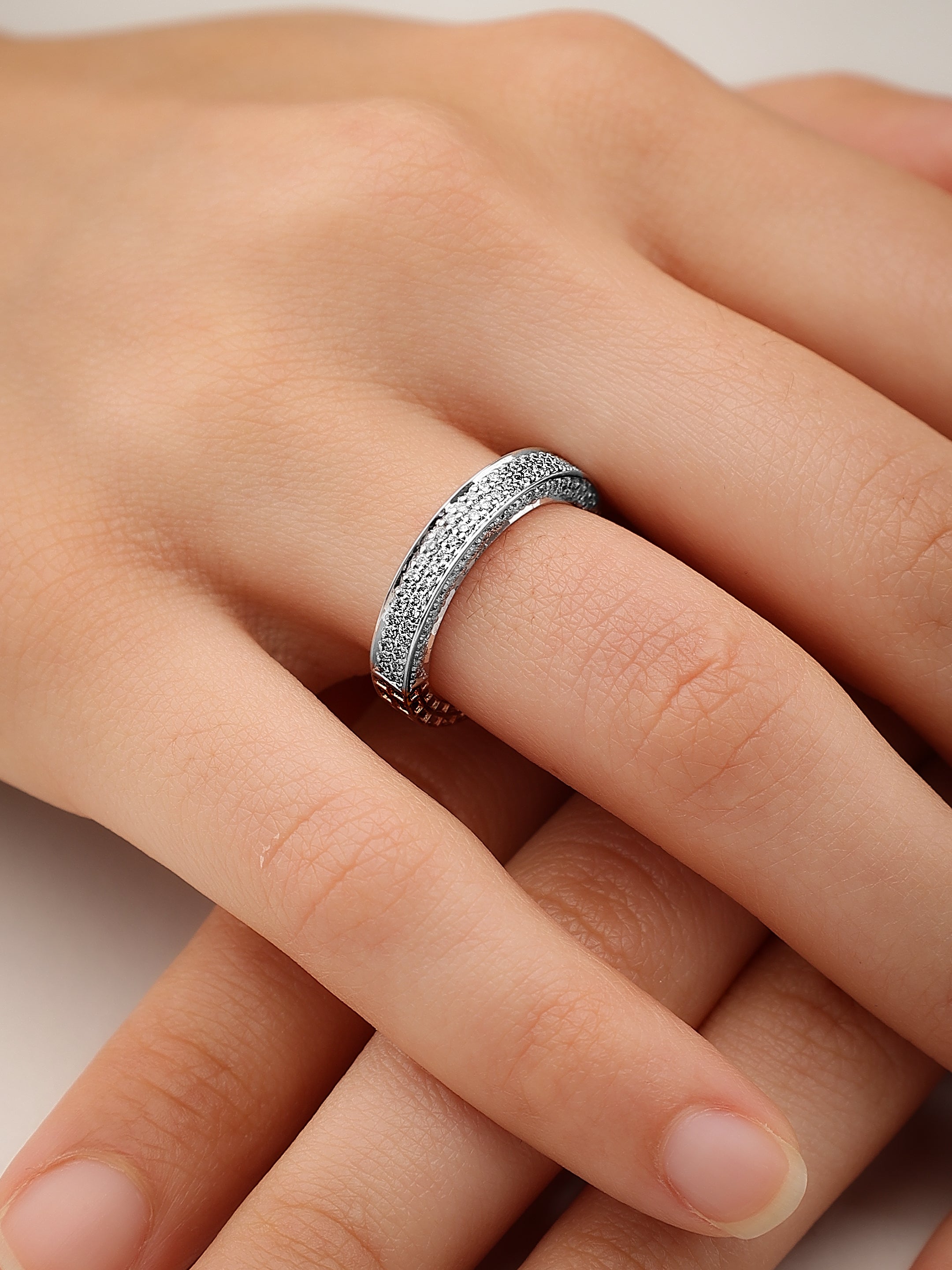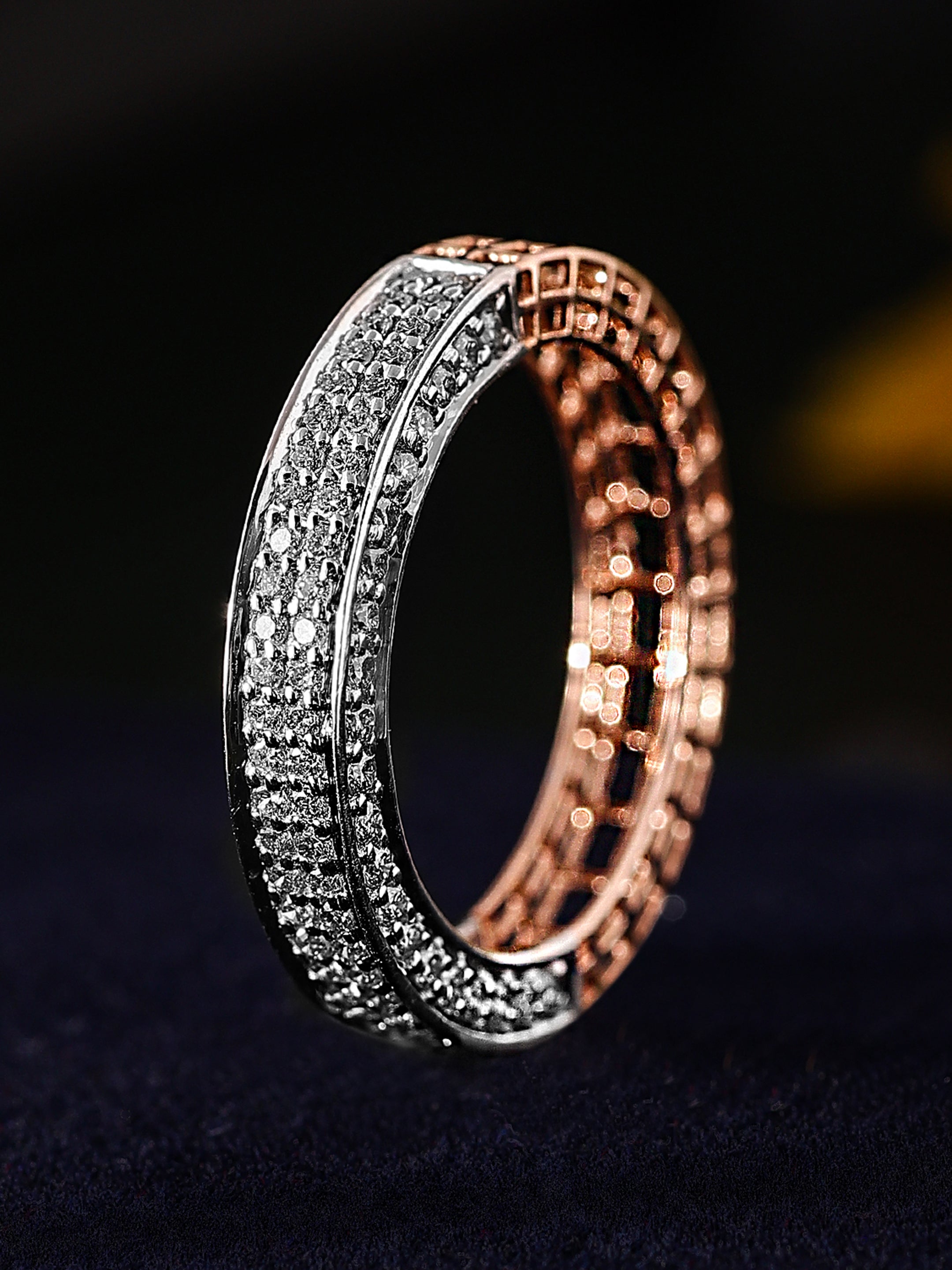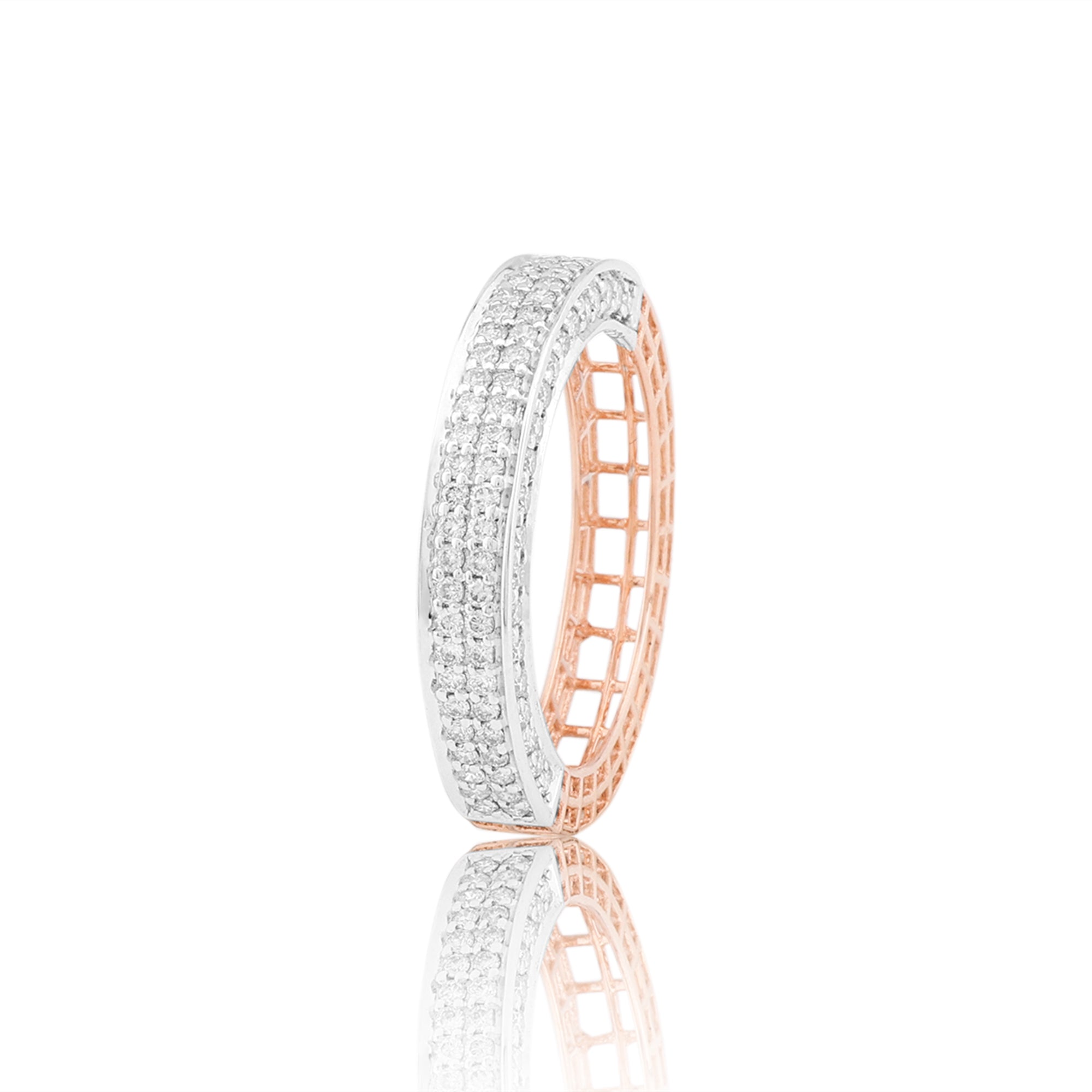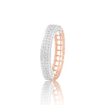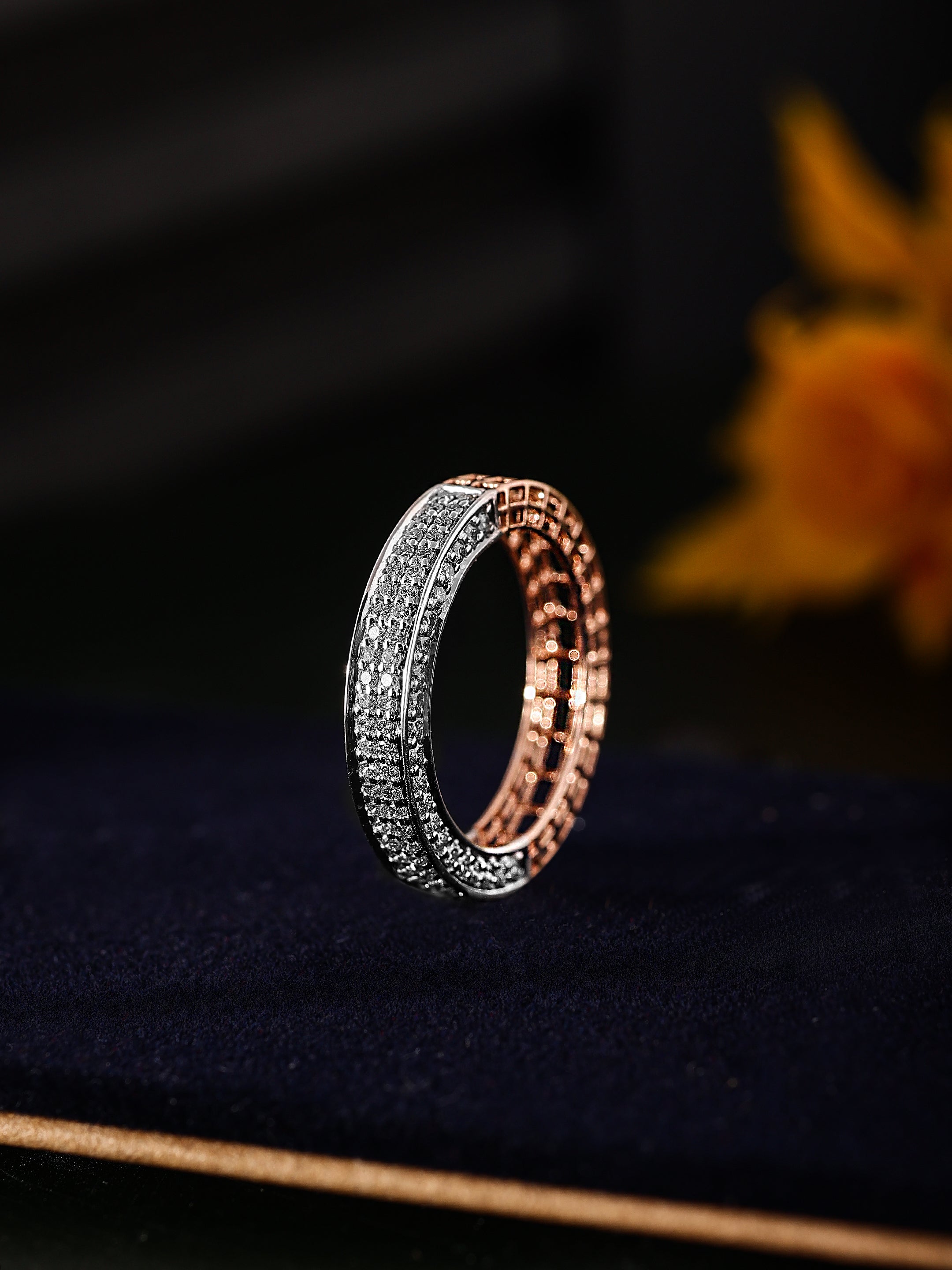 The Brilliant Mosaic Eternity Diamond Band is a stunning fusion of elegance and intricate design. This captivating ring features a dual-tone structure with the cool brilliance of white gold seamlessly transitioning into the warm glow of rose gold. The outer surface is adorned with a cascade of sparkling diamonds, meticulously set to create a continuous mosaic of shimmering light. The inner band reveals an intricate lattice pattern, adding depth and architectural beauty to the design. Perfect for marking special moments, this band embodies a harmonious blend of luxury and contemporary sophistication, making it a timeless symbol of enduring beauty and grace.