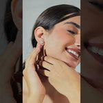 These exquisite earrings showcase a sophisticated blend of geometric precision and floral elegance. The design features a central cross motif, formed by sleek, rose gold bars intersecting gracefully. At each intersection and end of the bars, clusters of sparkling diamonds are arranged in a floral pattern, creating a dazzling display of light and texture. The combination of warm rose gold and brilliant stones adds depth and contrast, enhancing the overall visual appeal. Perfect for adding a touch of refined glamour to any ensemble, these earrings embody a harmonious balance of structure and organic beauty, making them a versatile and timeless accessory.