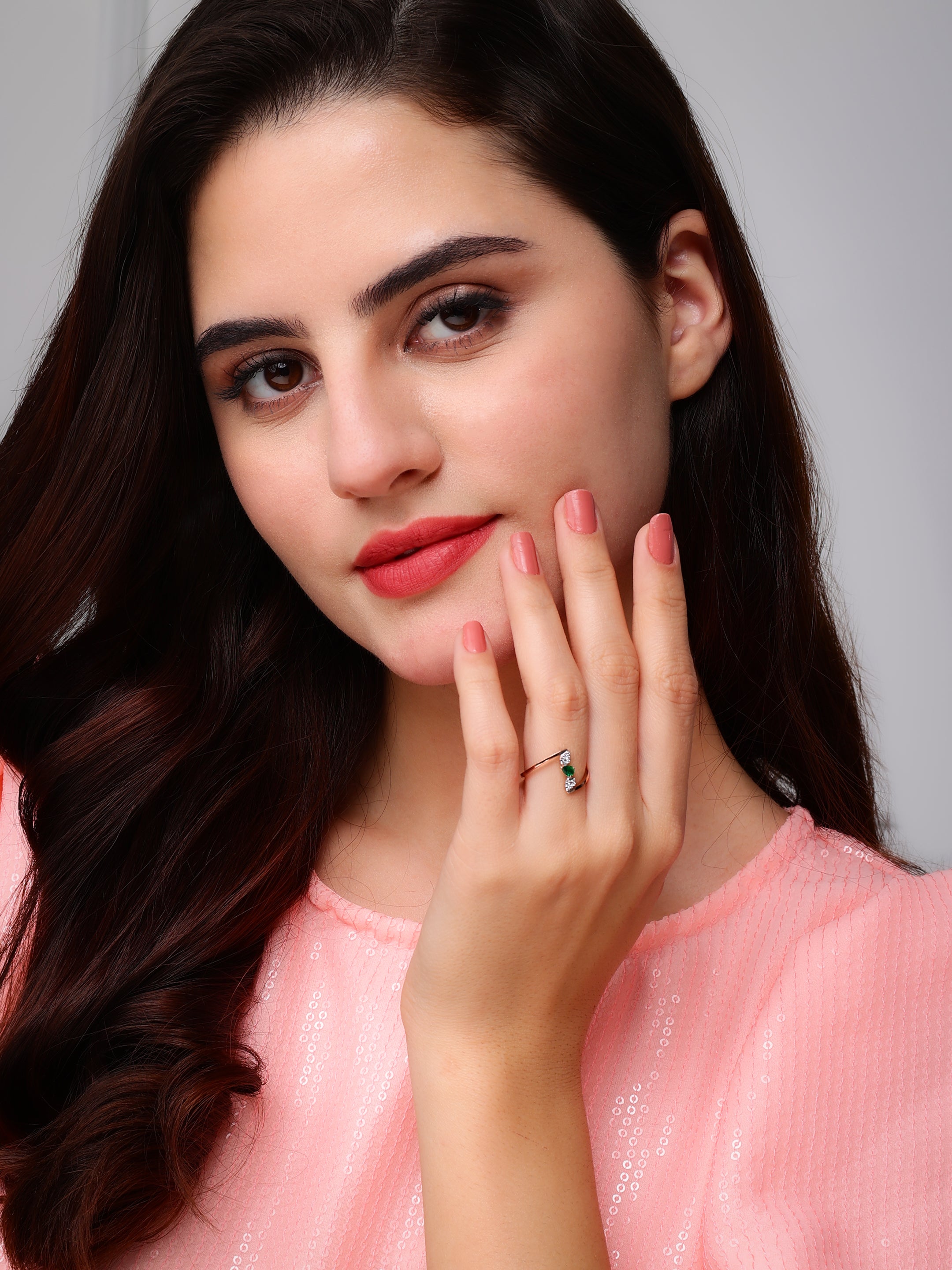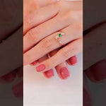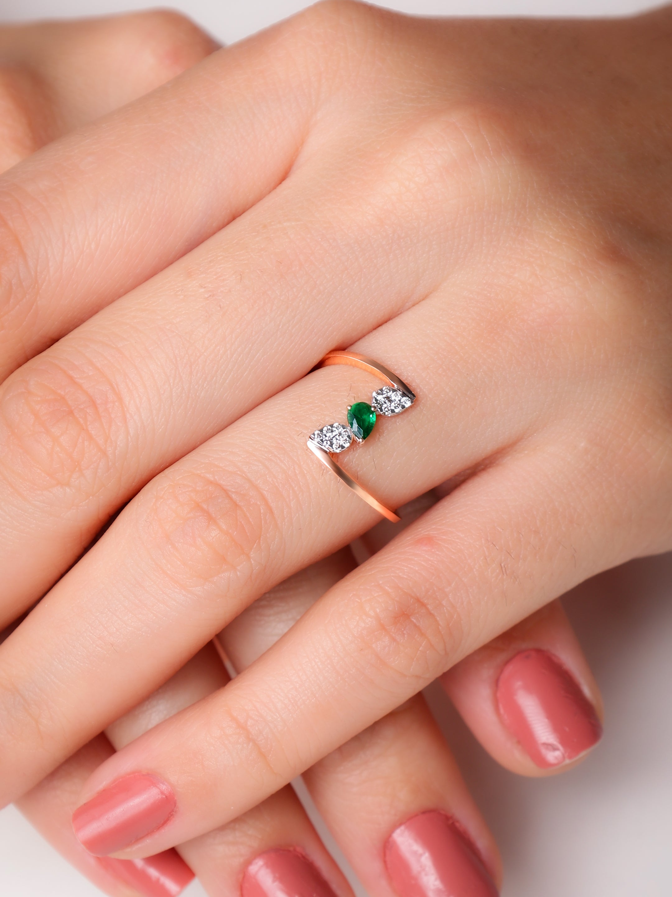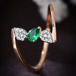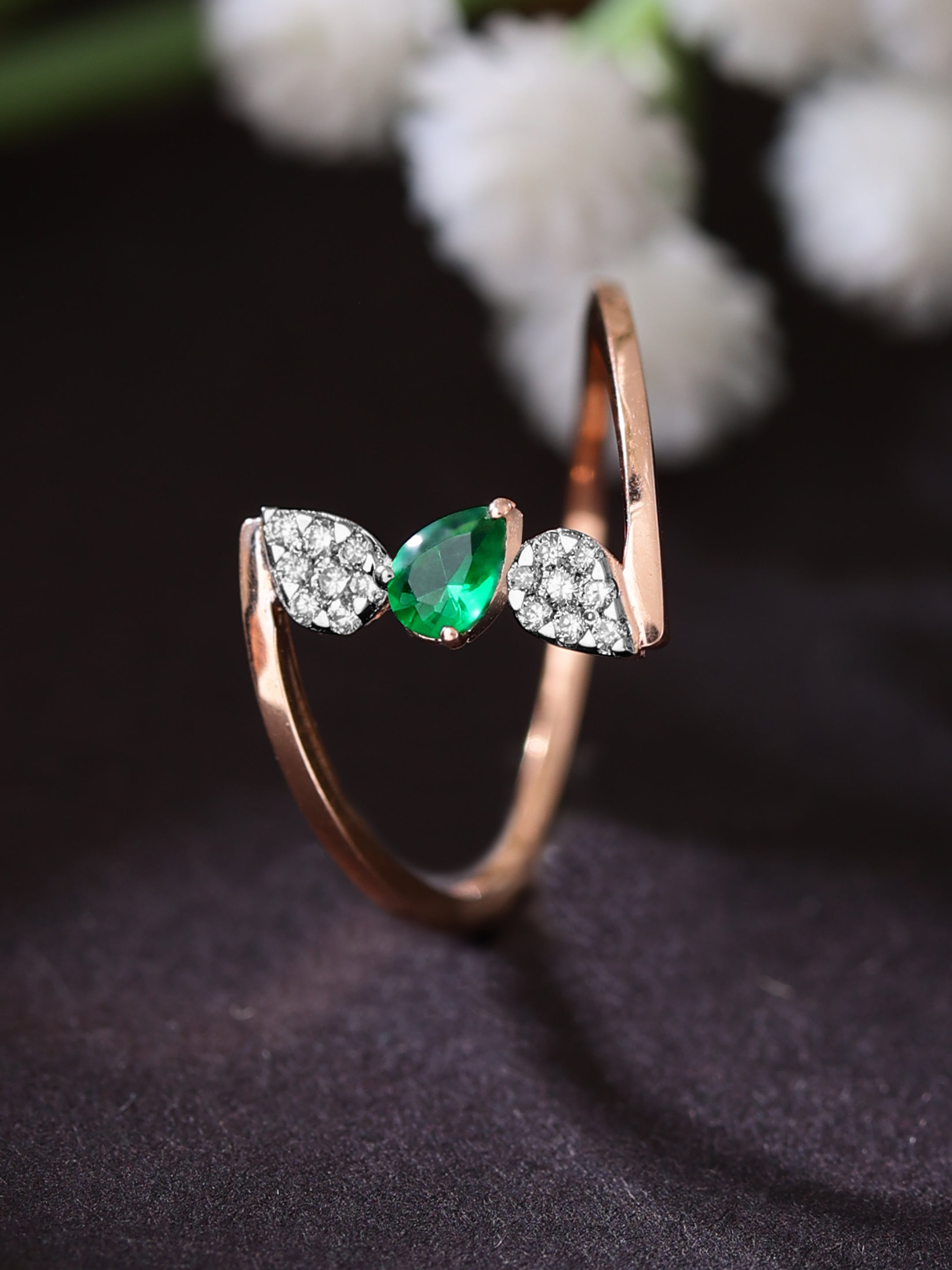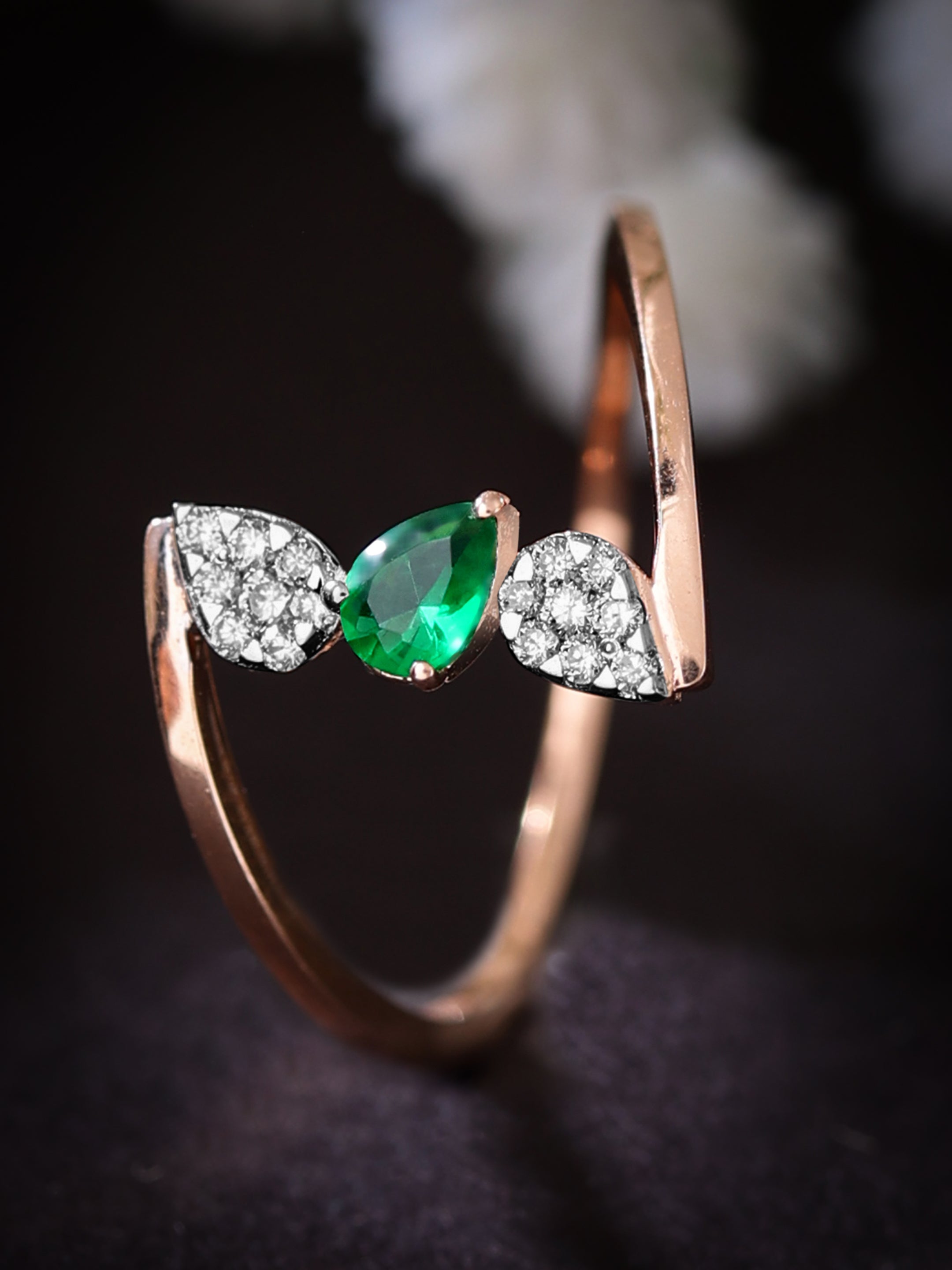 Step into a world of enchanting beauty with the Dawn's Kiss Starrer Diamond Ring. This exquisite piece features a stunning rose gold band that elegantly cradles a unique floral design. At its heart, a deep green emerald gleams with captivating allure, framed by a halo of brilliant diamonds that add a touch of celestial sparkle. The intricate detailing of the rose gold petals exudes sophistication and artistry, making this ring a true masterpiece. The harmonious blend of the emerald's rich hue with the warm tones of rose gold and the dazzling diamonds creates a mesmerizing effect. Perfect for those who appreciate both nature's beauty and fine craftsmanship, the Emerald Blossom ring is a statement of timeless elegance and charm.