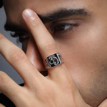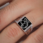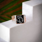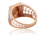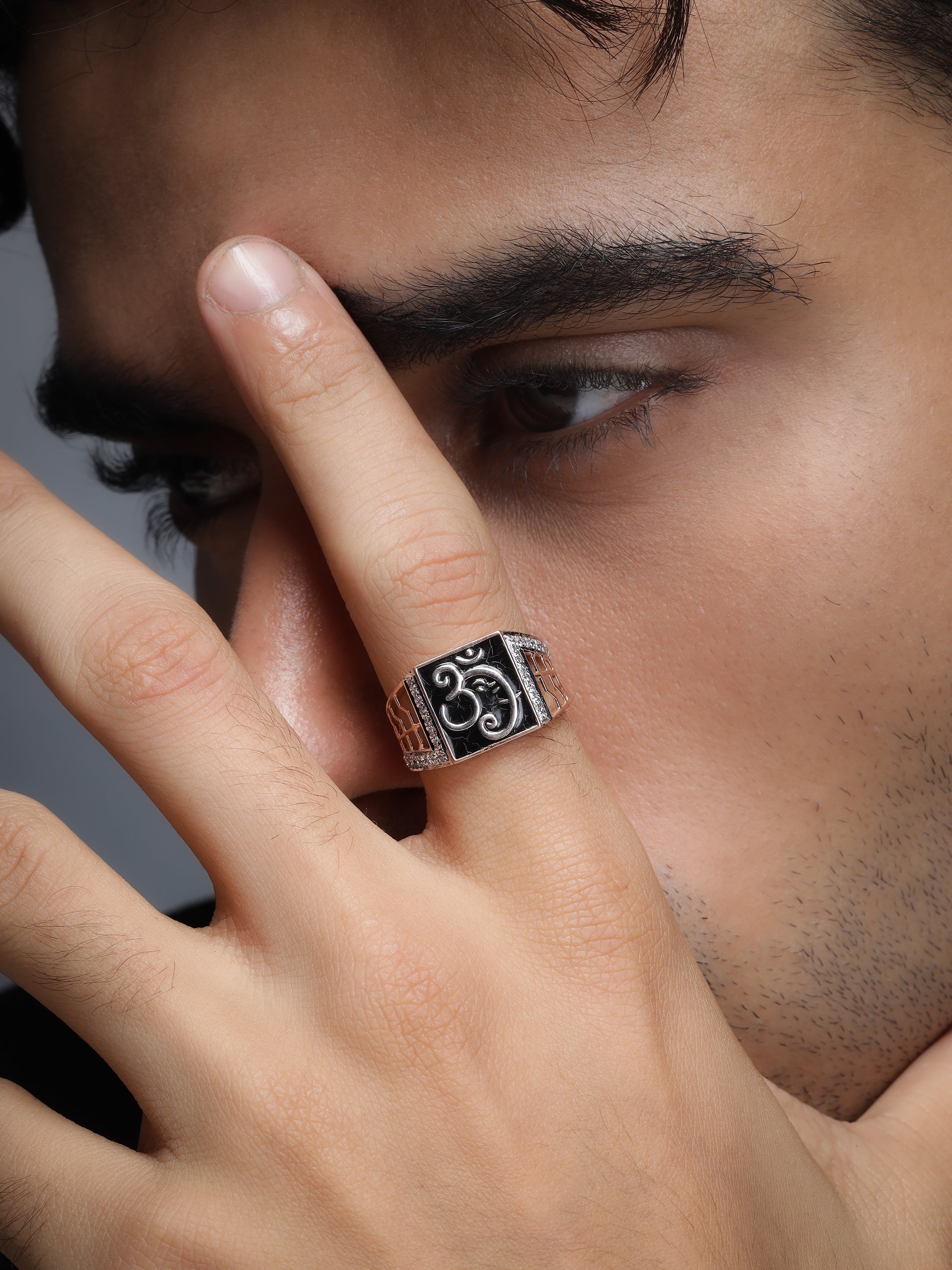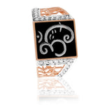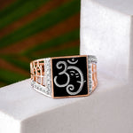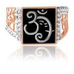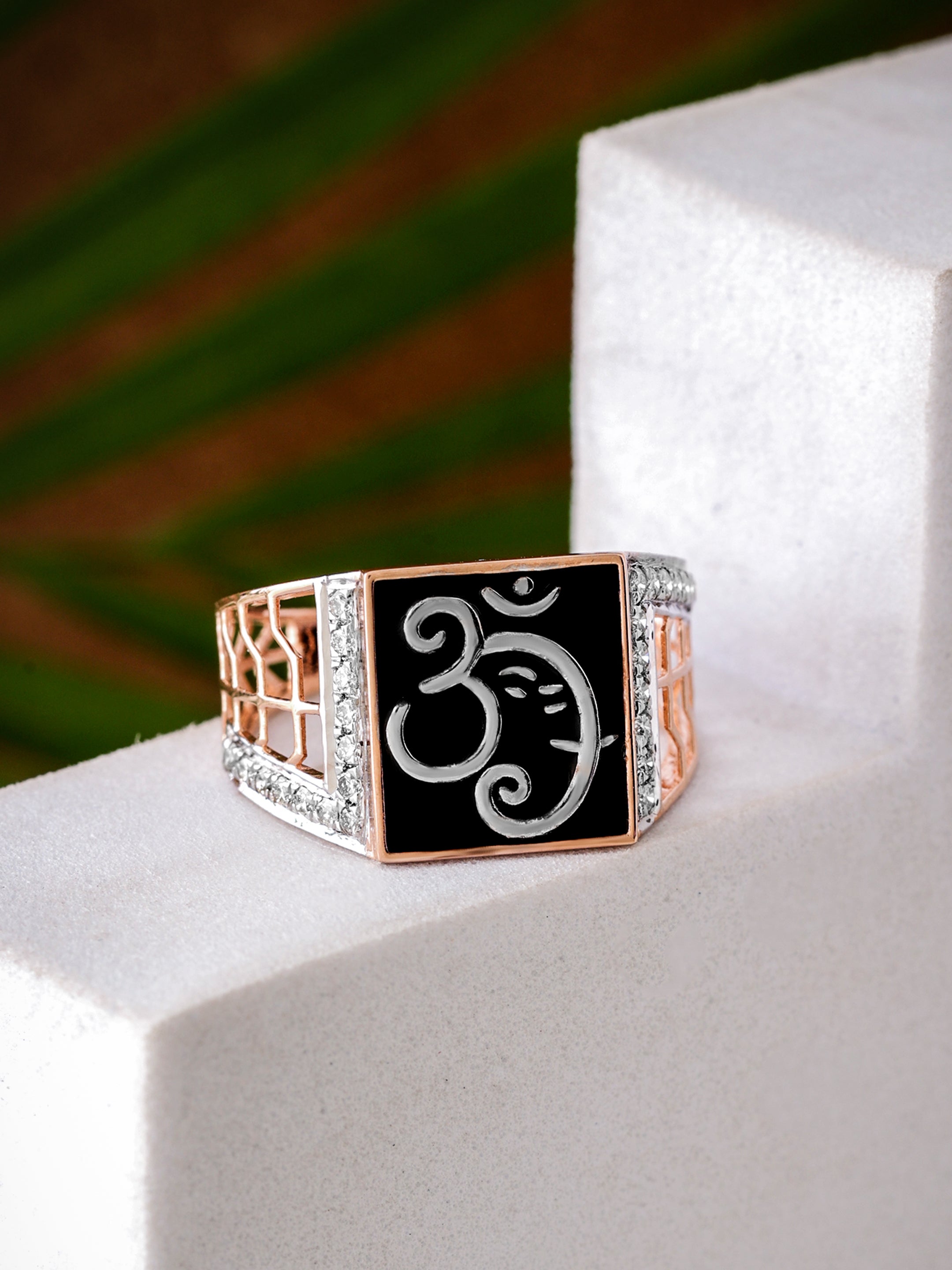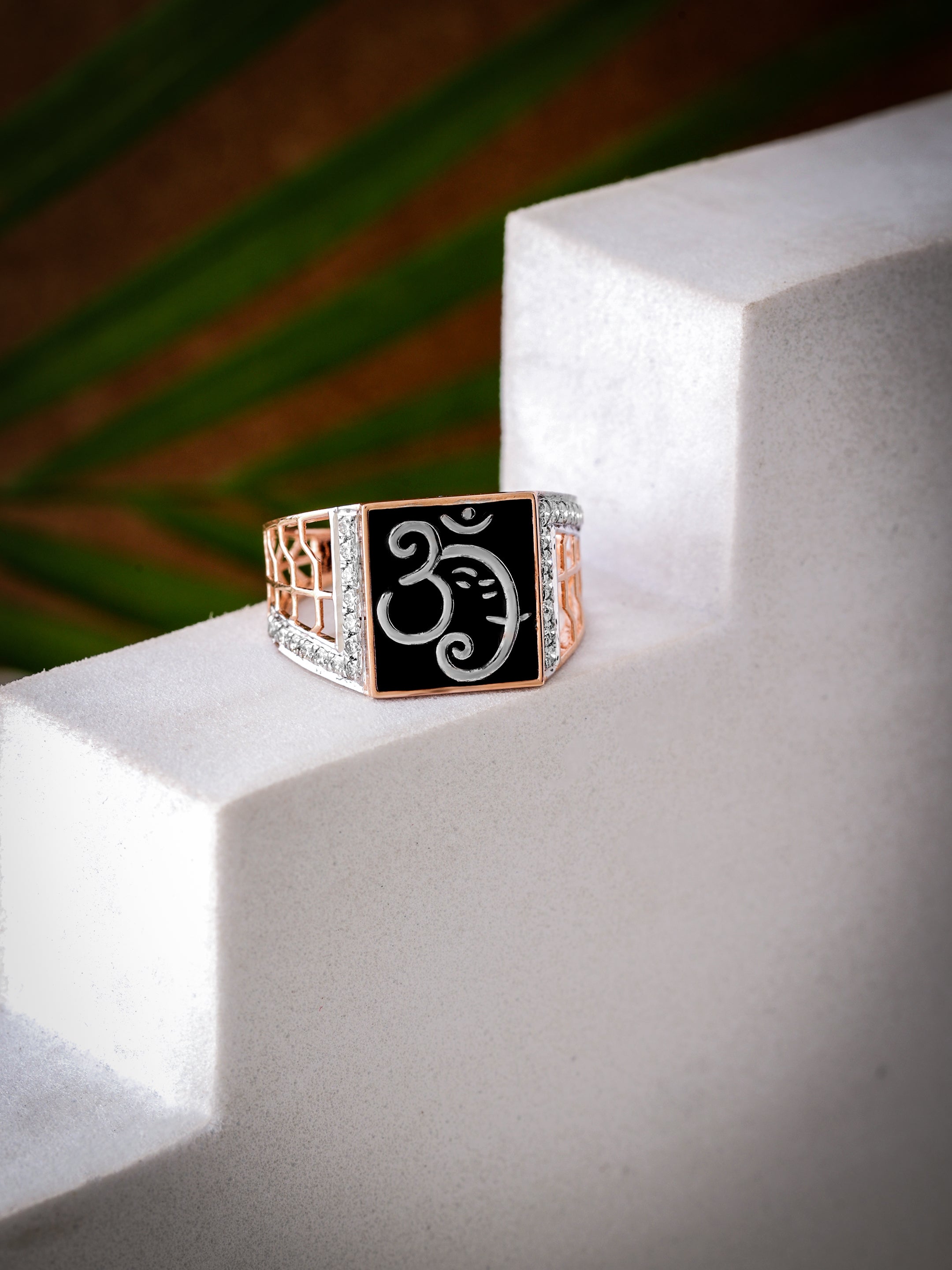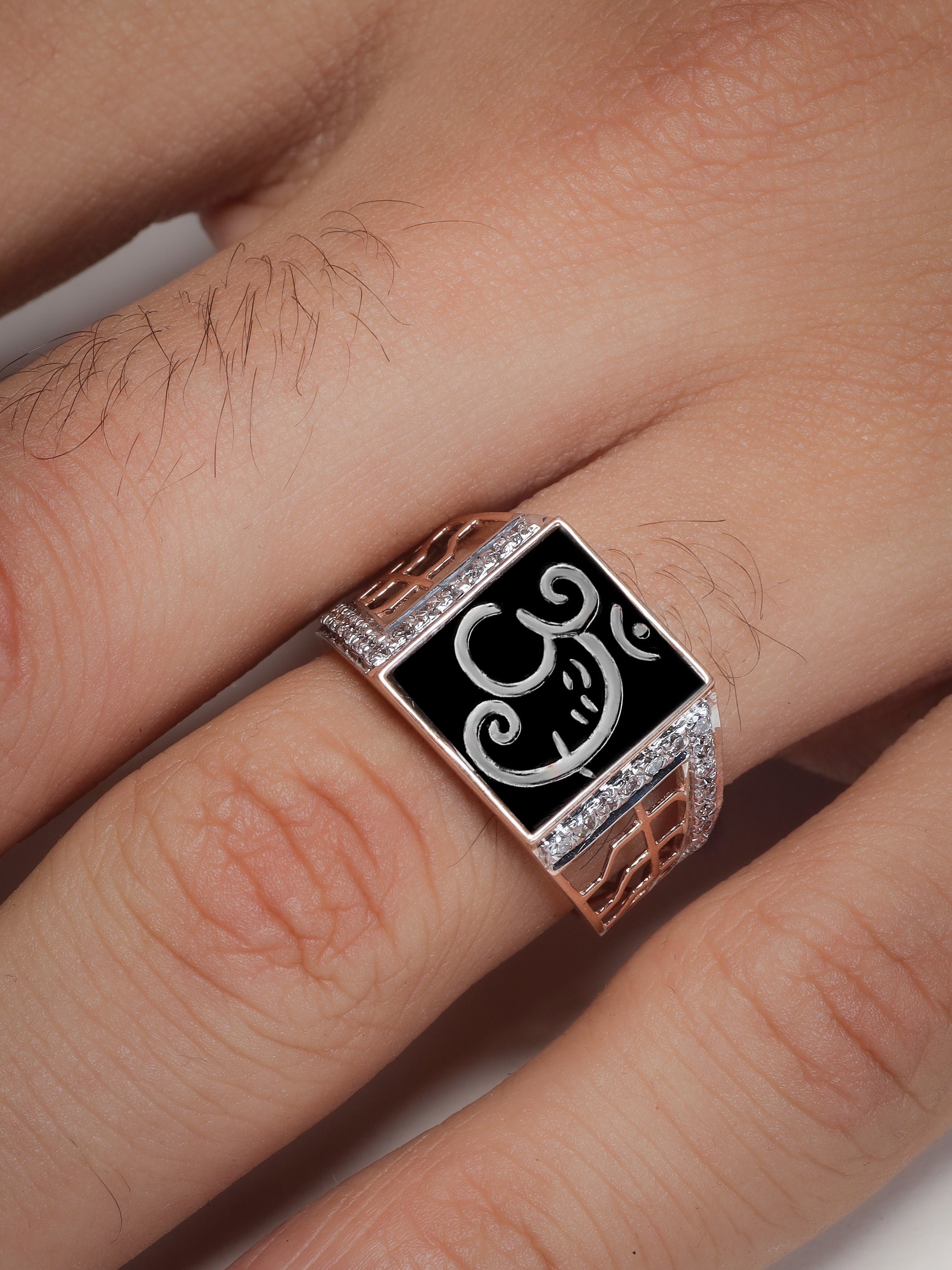 This men’s ring is a powerful fusion of spirituality and artistic craftsmanship, beautifully crafted in rose gold. The centerpiece of the ring features a prominent Om symbol, which subtly transitions into the form of Lord Ganesha, creating a harmonious blend of two sacred symbols. The Om-Ganesha symbol is set against a deep black enamel backdrop, making the intricate design stand out with a profound sense of reverence and divinity. The band of the ring is adorned with a lattice pattern on the sides, further embellished with rows of shimmering diamonds, adding a touch of luxury to the spiritual design. The warm hue of rose gold, combined with the symbolic significance of Divine Om and Lord Ganesha, makes this ring a perfect choice for the man who seeks a meaningful connection with the divine while showcasing sophisticated style.