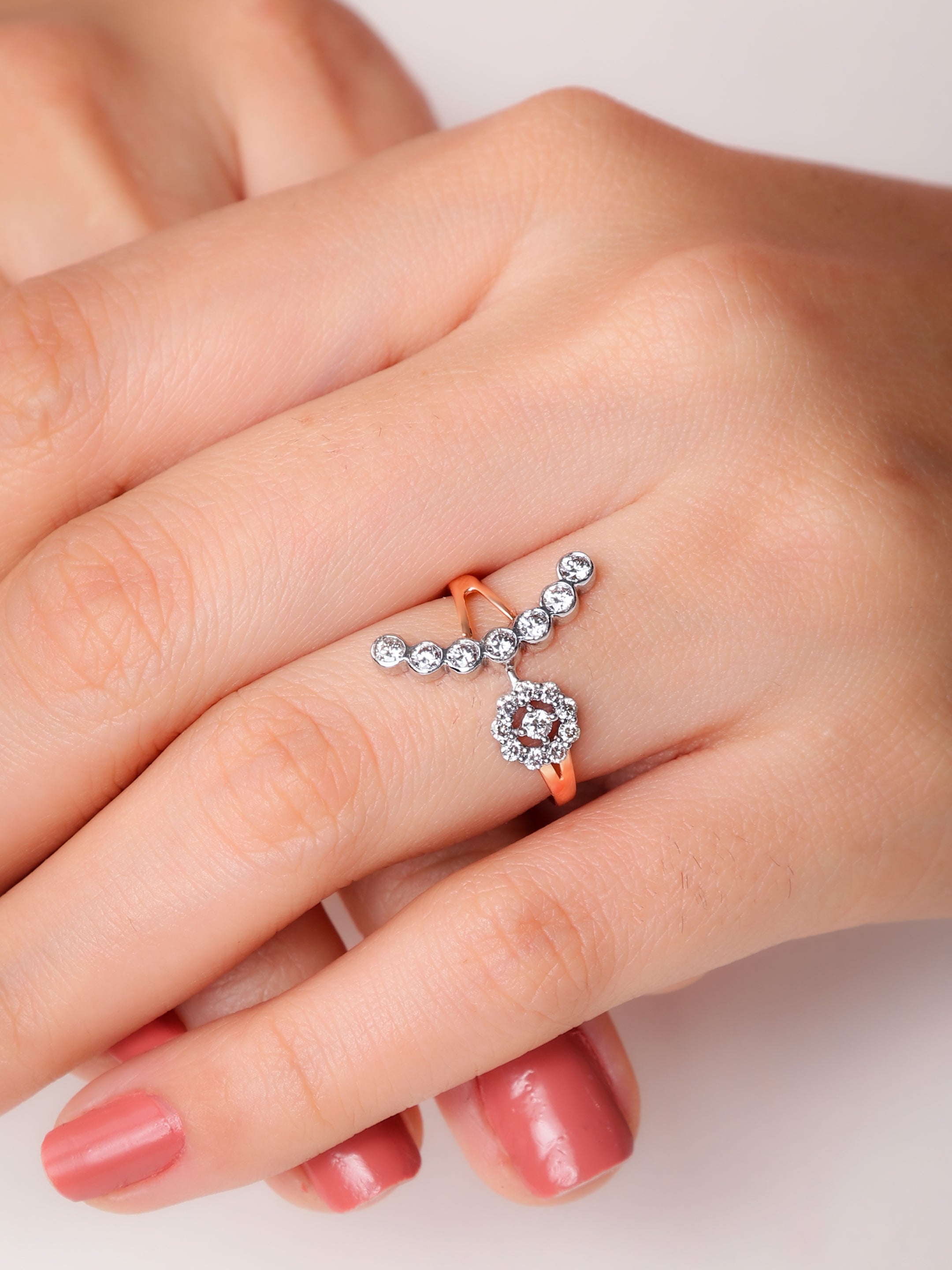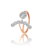 The Ecliptic Elegance Floret Diamond Ring is a dazzling embodiment of grace and modern sophistication. Crafted in luxurious rose gold, this unique ring features a striking cut-out design that artfully showcases a captivating arrangement of round diamonds. At its heart, a cluster of diamonds forms a radiant bloom, symbolizing eternal beauty and brilliance. Below, a row of perfectly set bezel diamonds extends gracefully. This ring's innovative design and sparkling elegance make it a truly exceptional piece, perfect for those who seek a blend of contemporary style and timeless charm.
