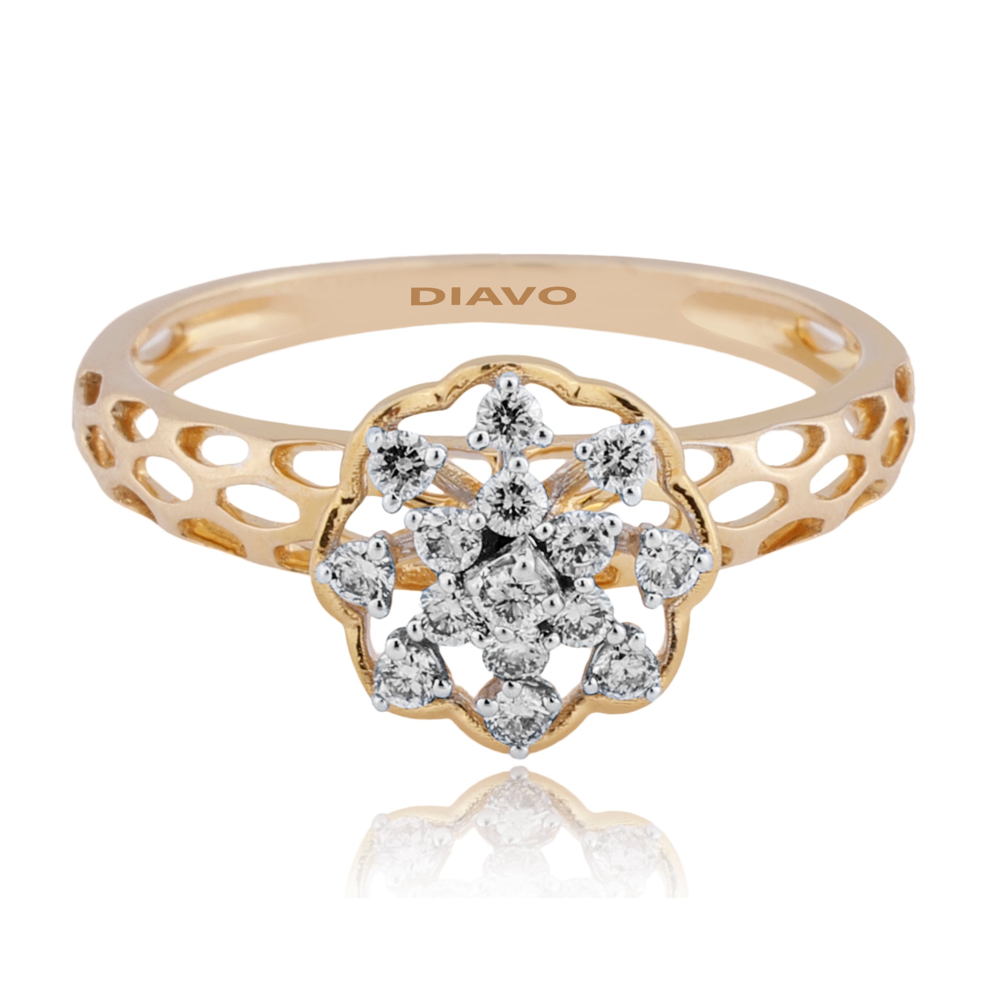 Introducing the Elysian Blossom Diamond Ring: Elegance meets nature in the exquisite Elysian Blossom Diamond Ring. This enchanting piece features a beautifully crafted designer band, culminating in the centerpiece – a delicate flower motif.