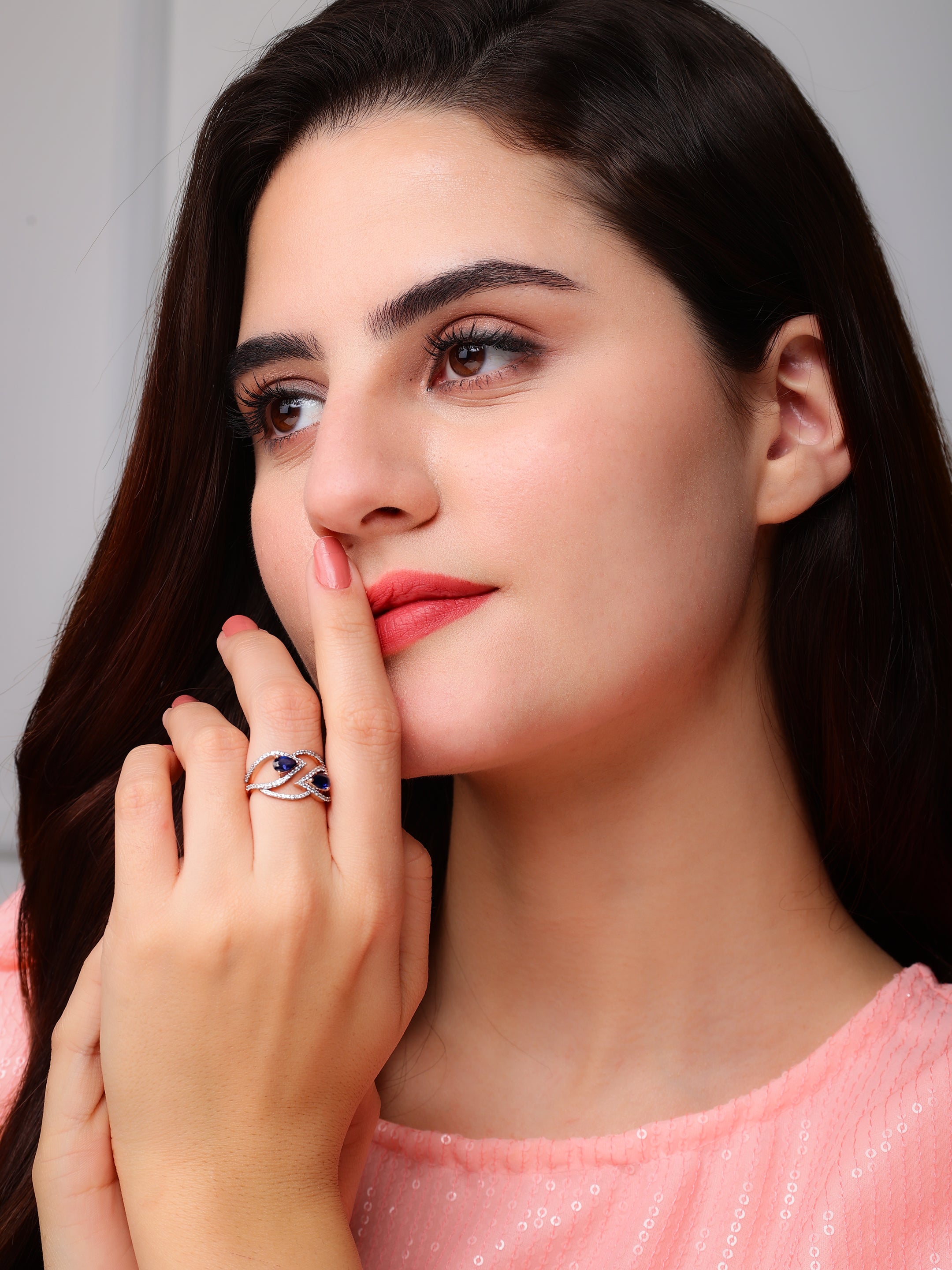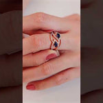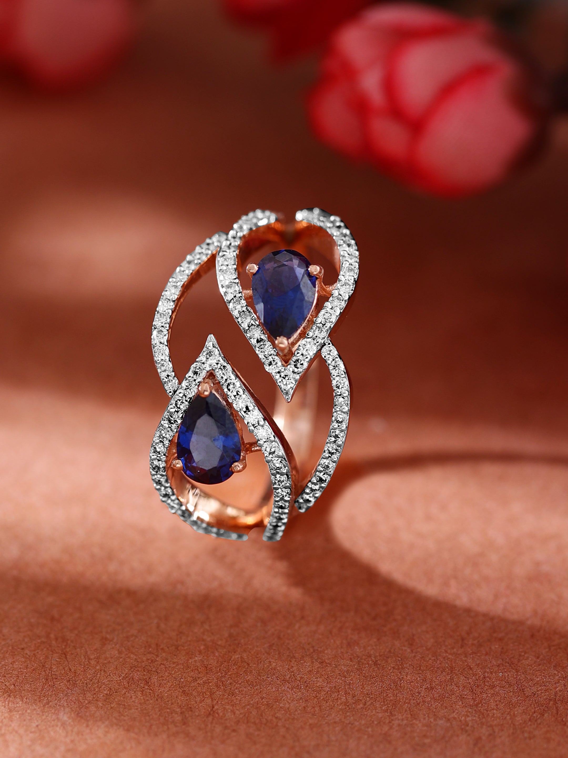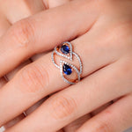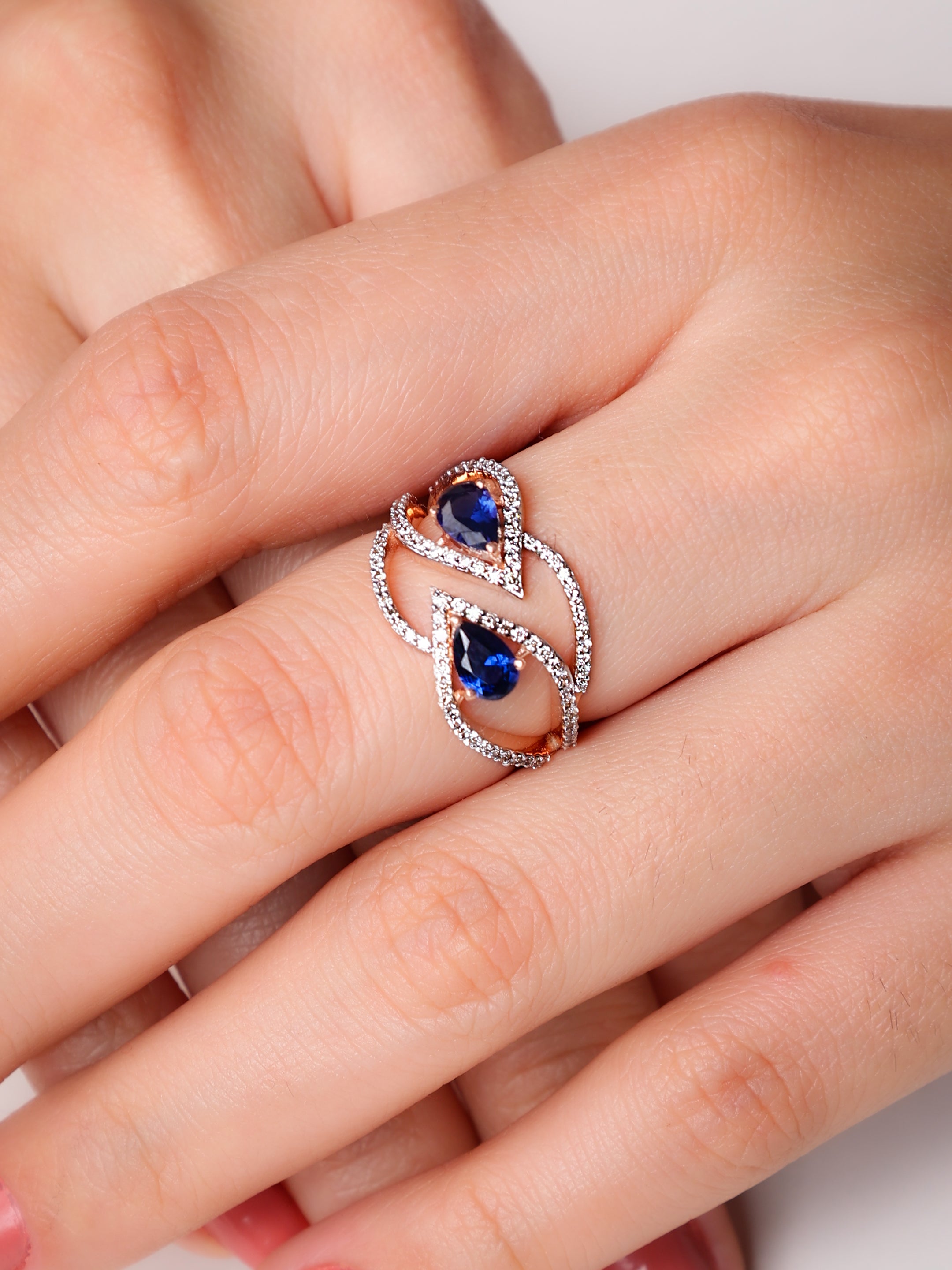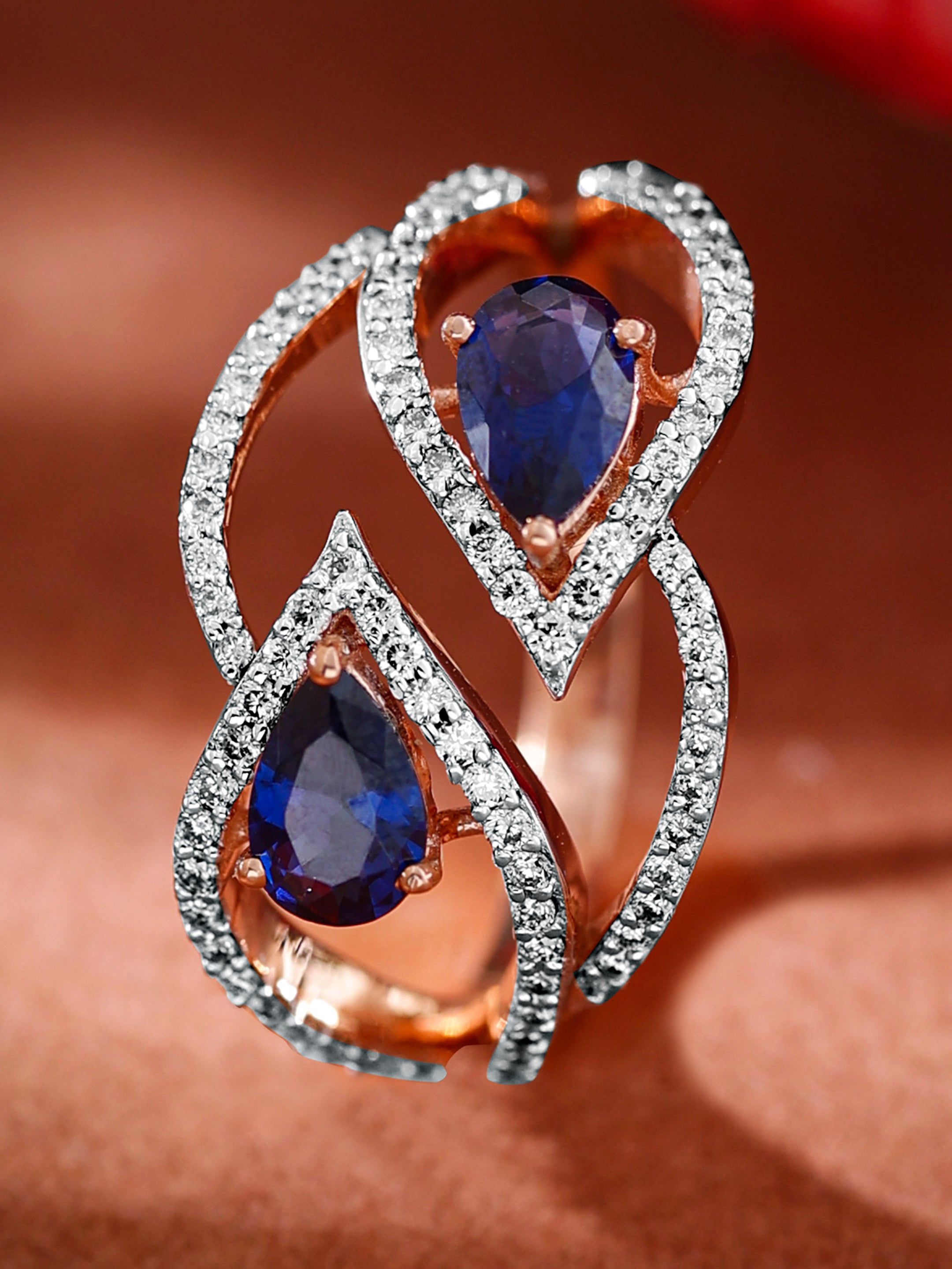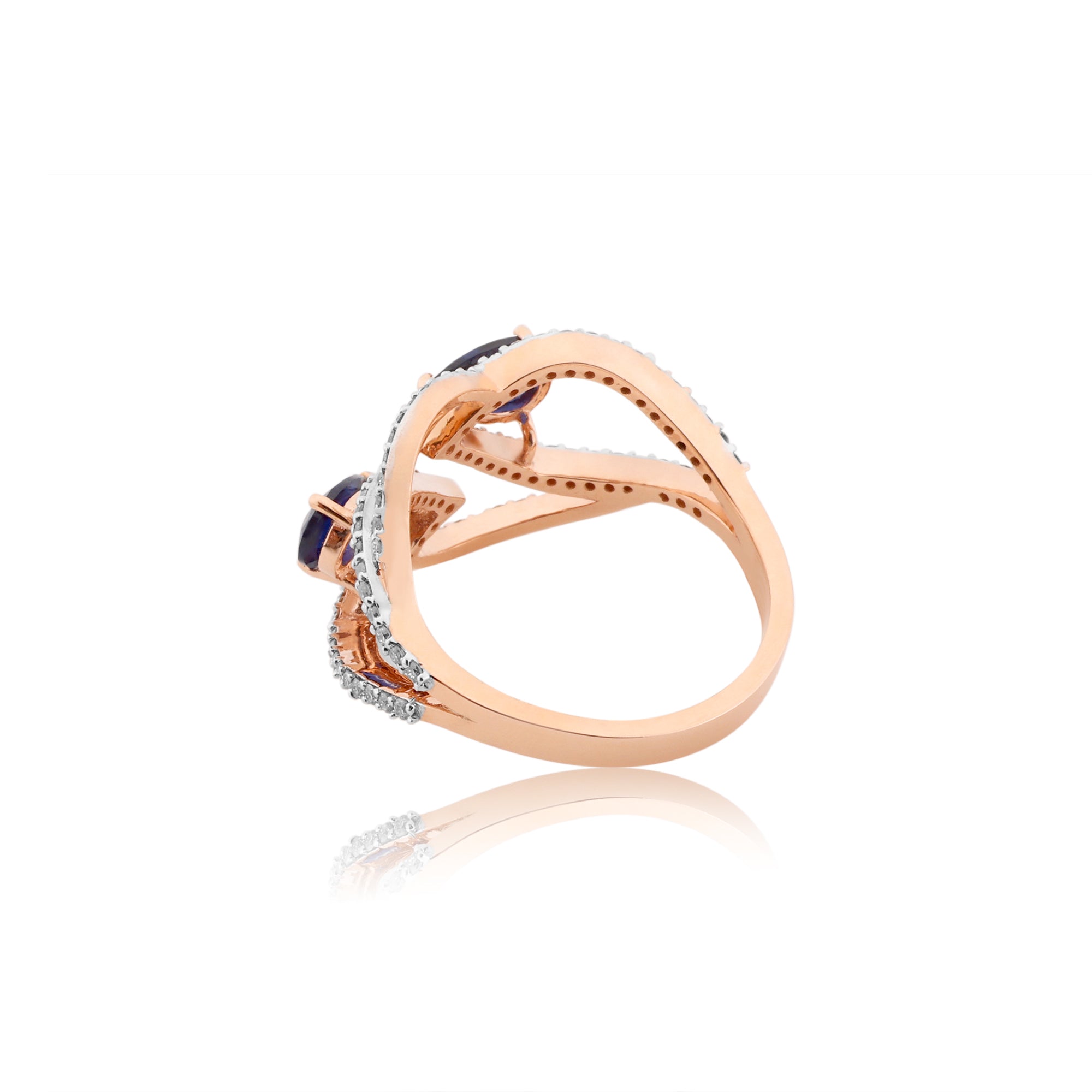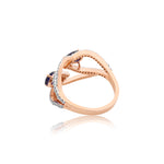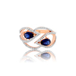 This enchanting rose gold ring exudes sophistication and romance with its intricate design. Two captivating pear-shaped sapphires, reminiscent of a serene night sky, are delicately cradled within an elegant infinity loop adorned with a dazzling array of diamonds. The shimmering stones and graceful curves create a harmonious interplay of light and color, symbolizing an eternal bond and the perfect unity of love and elegance. Ideal for those who seek a piece that combines timeless beauty with modern flair, the Elysian Twirl Diamond Ring is a true testament to exquisite craftsmanship and enduring style.