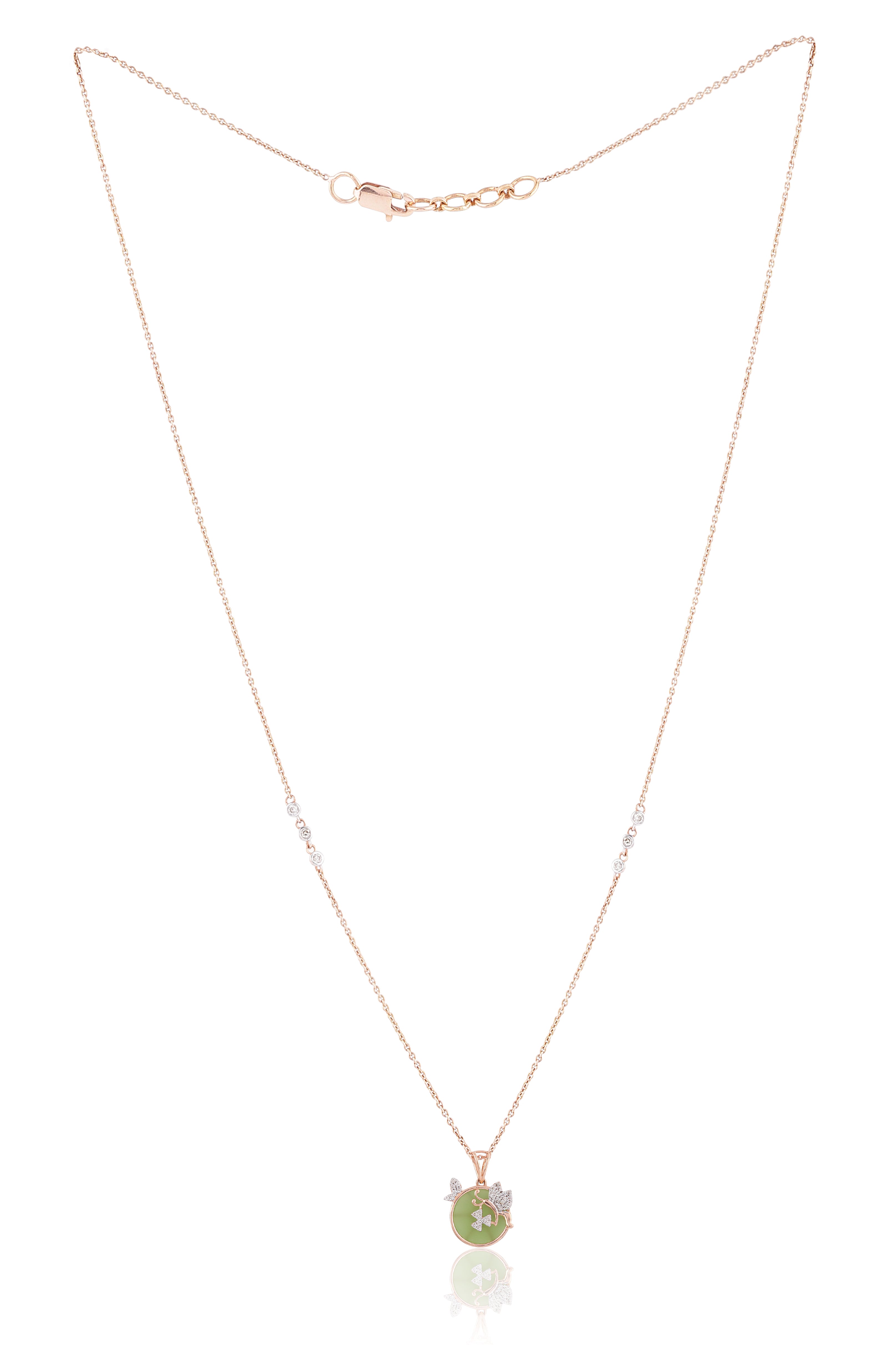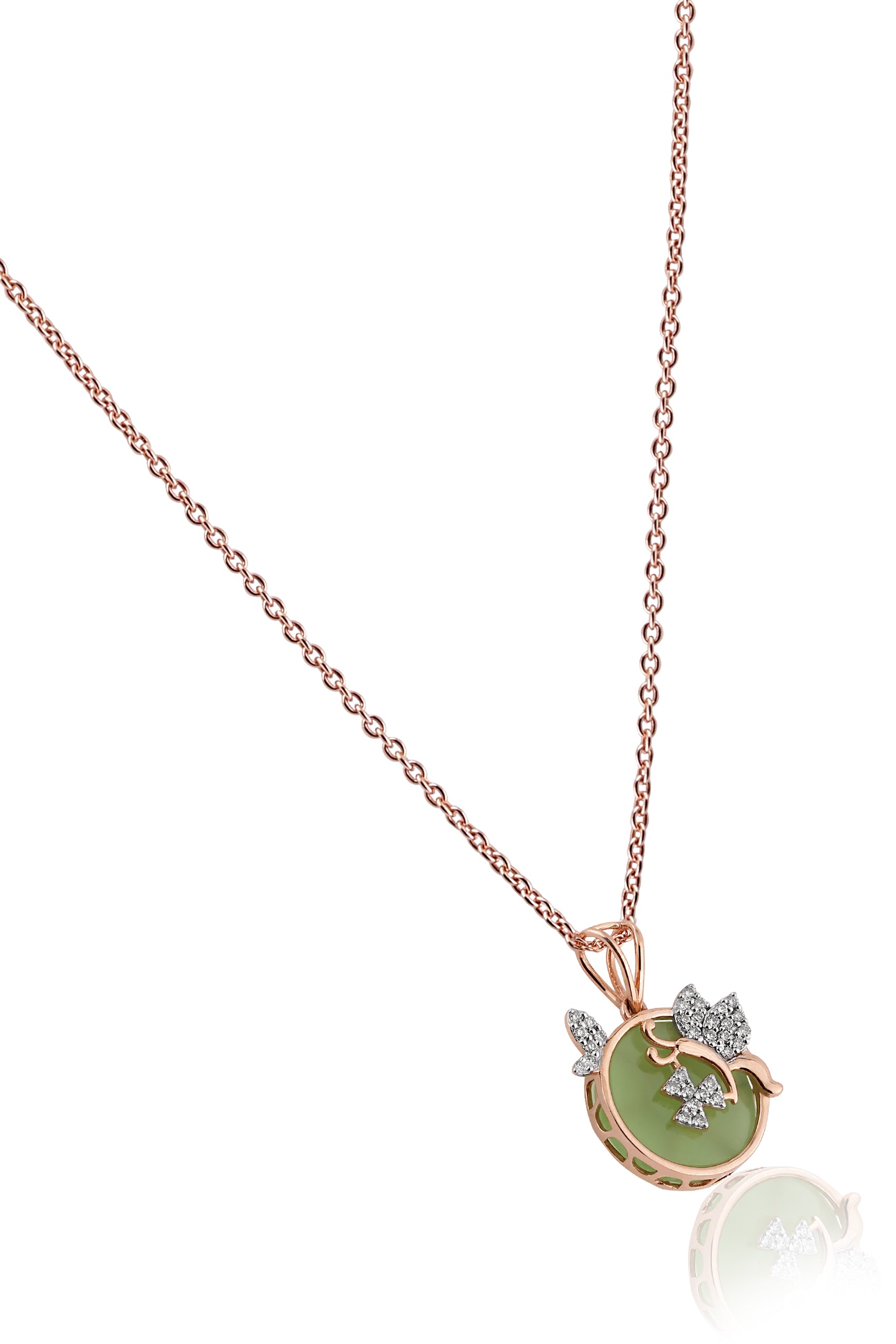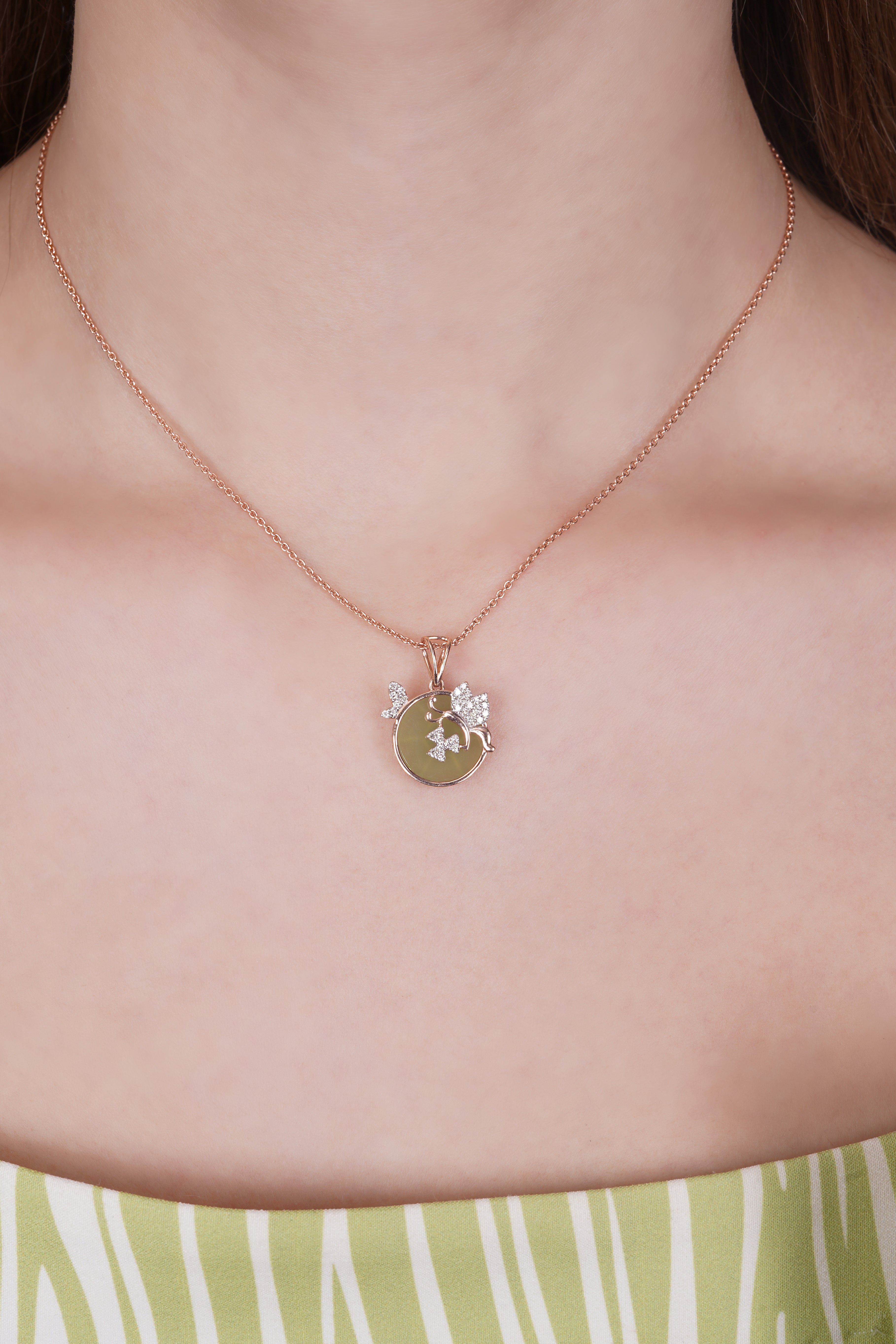 Introducing the Emerald Elegance Diamond Butterfly Pendant: This pendant embodies nature's grace. Crafted in gold, this pendant features a captivating greenish-colored stone at its heart. The exquisite butterfly shape takes flight with wings adorned by natural round brilliant diamonds. An ode to transformation and beauty, this pendant adds a touch of enchantment to your style.