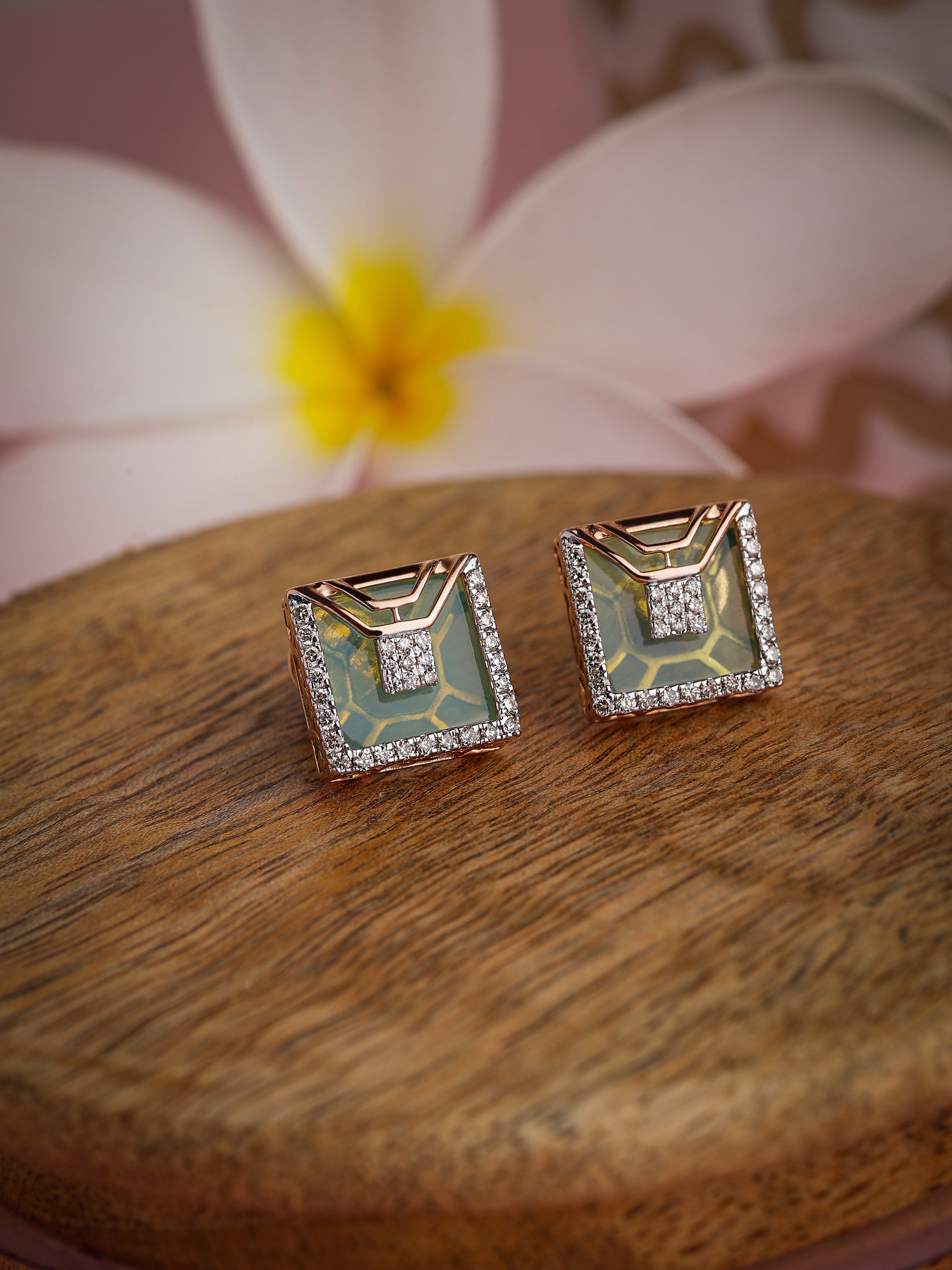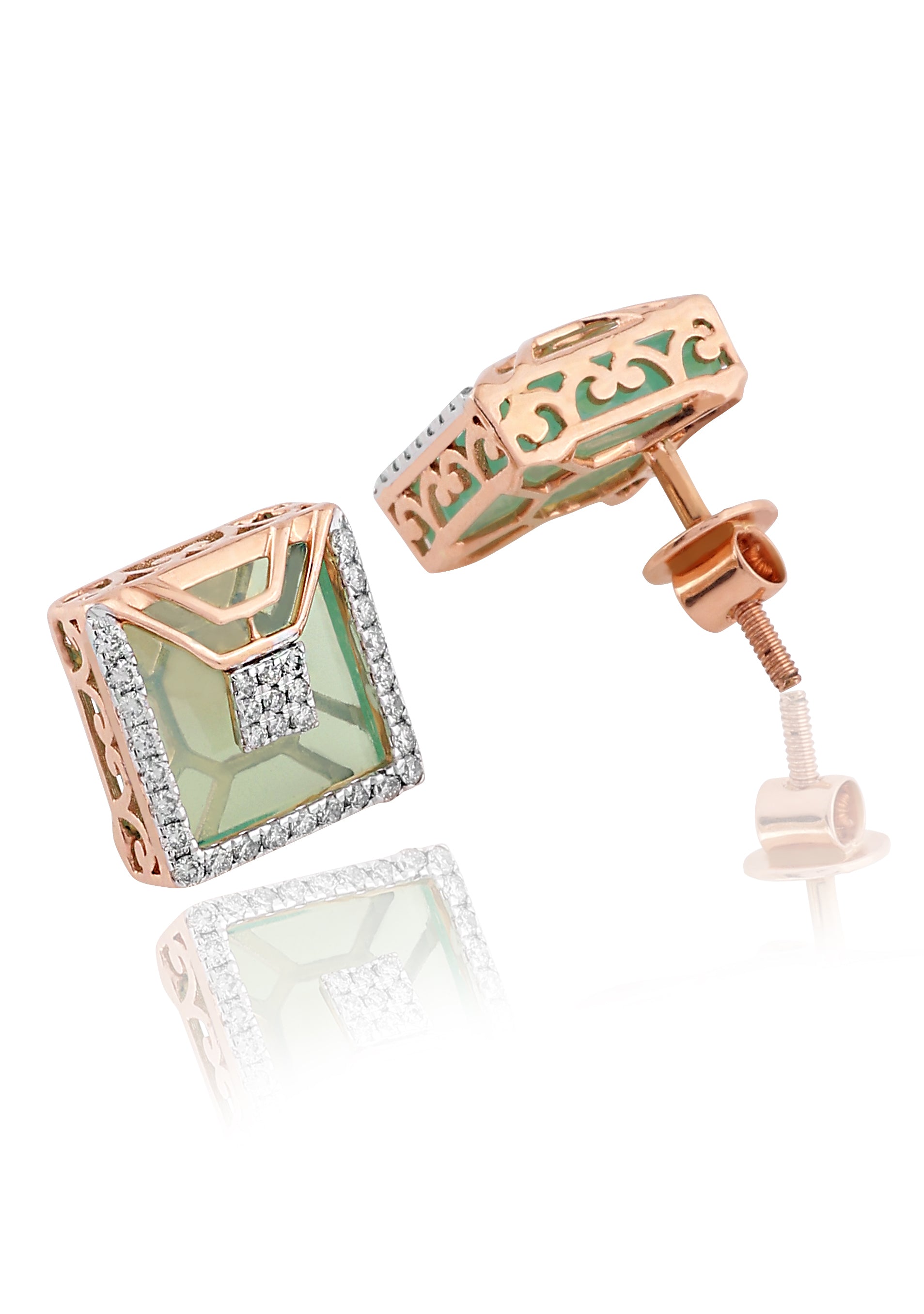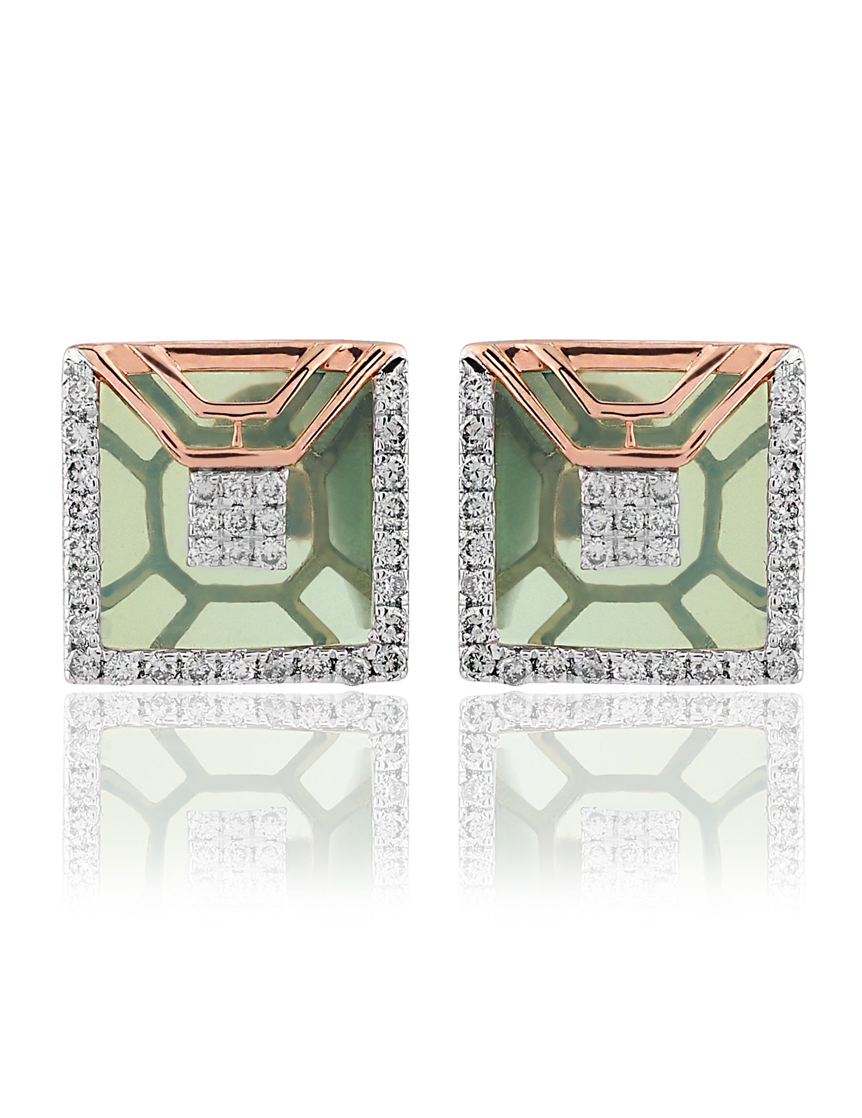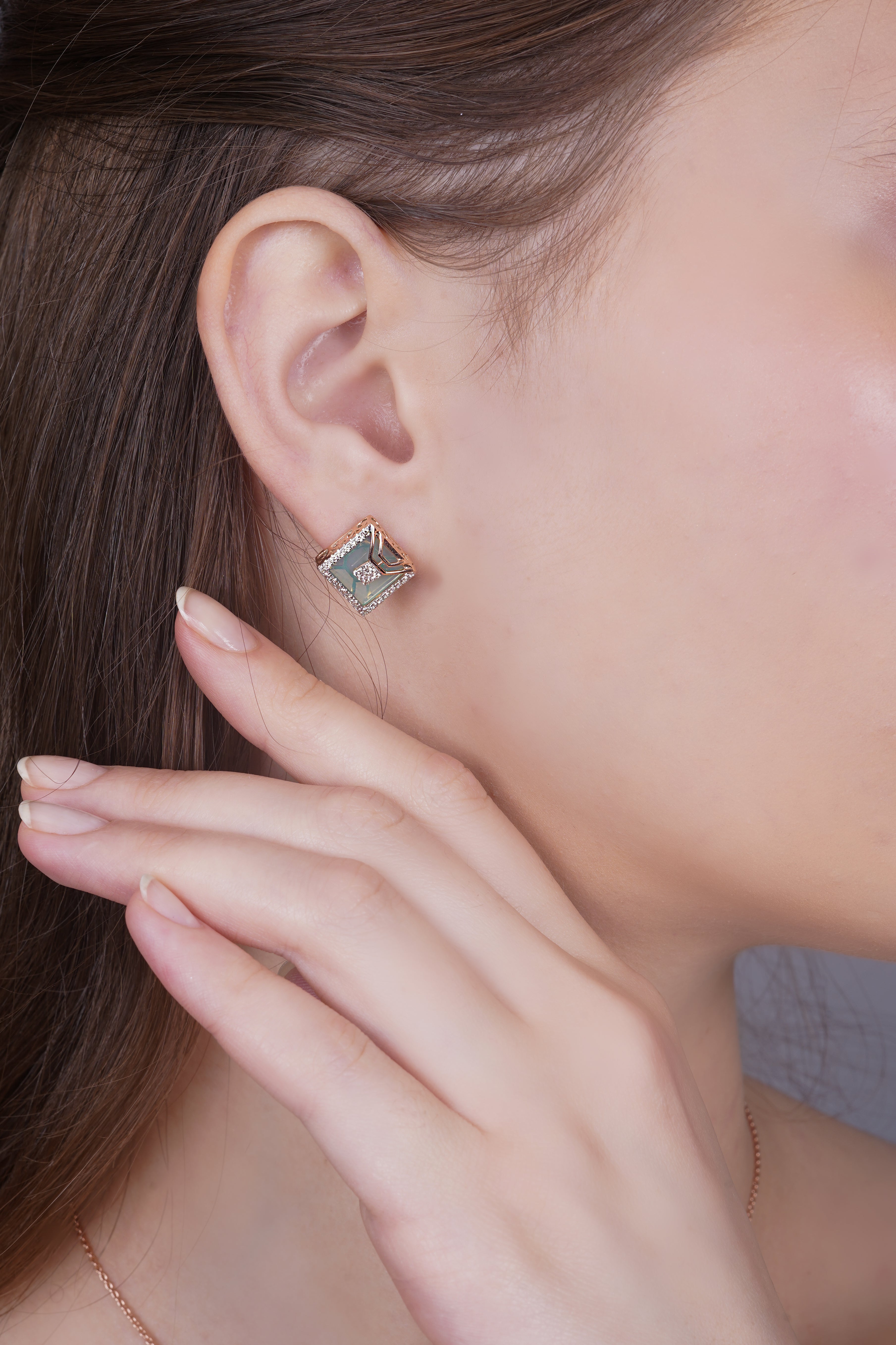 Introducing our Emerald Mirage Diamond Earrings – a fusion of elegance and allure in mesmerizing sea green hues. The Emerald Mirage Diamond Earrings are a captivating representation of timeless charm with a contemporary twist. Crafted in a captivating square shape, these earrings feature three sides embellished with round brilliant diamonds, evoking a symphony of radiance. At the heart of each earring, a captivating cluster of diamonds adds depth and brilliance, creating an enchanting mirage of light.