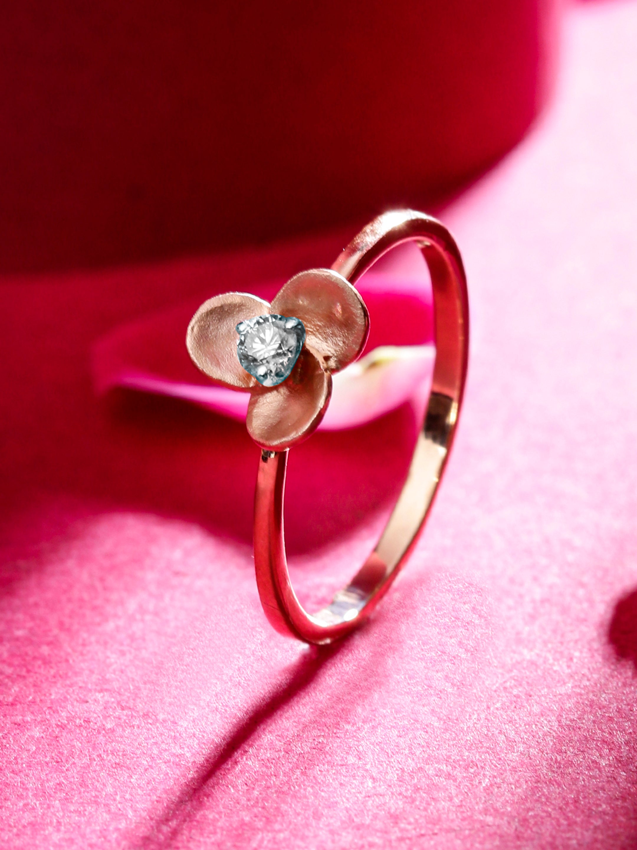 Introducing the Enchanting RoseFloral Diamond Ring - a captivating blend of nature's beauty and timeless elegance. The RoseFloral Diamond Ring features a dainty and graceful rose gold band, symbolizing love and femininity. At the center of the band, a delicate flower crafted in rose gold blooms with exquisite craftsmanship. The enchanting flower holds a brilliant diamond at its heart, adding a radiant touch to this captivating piece.