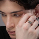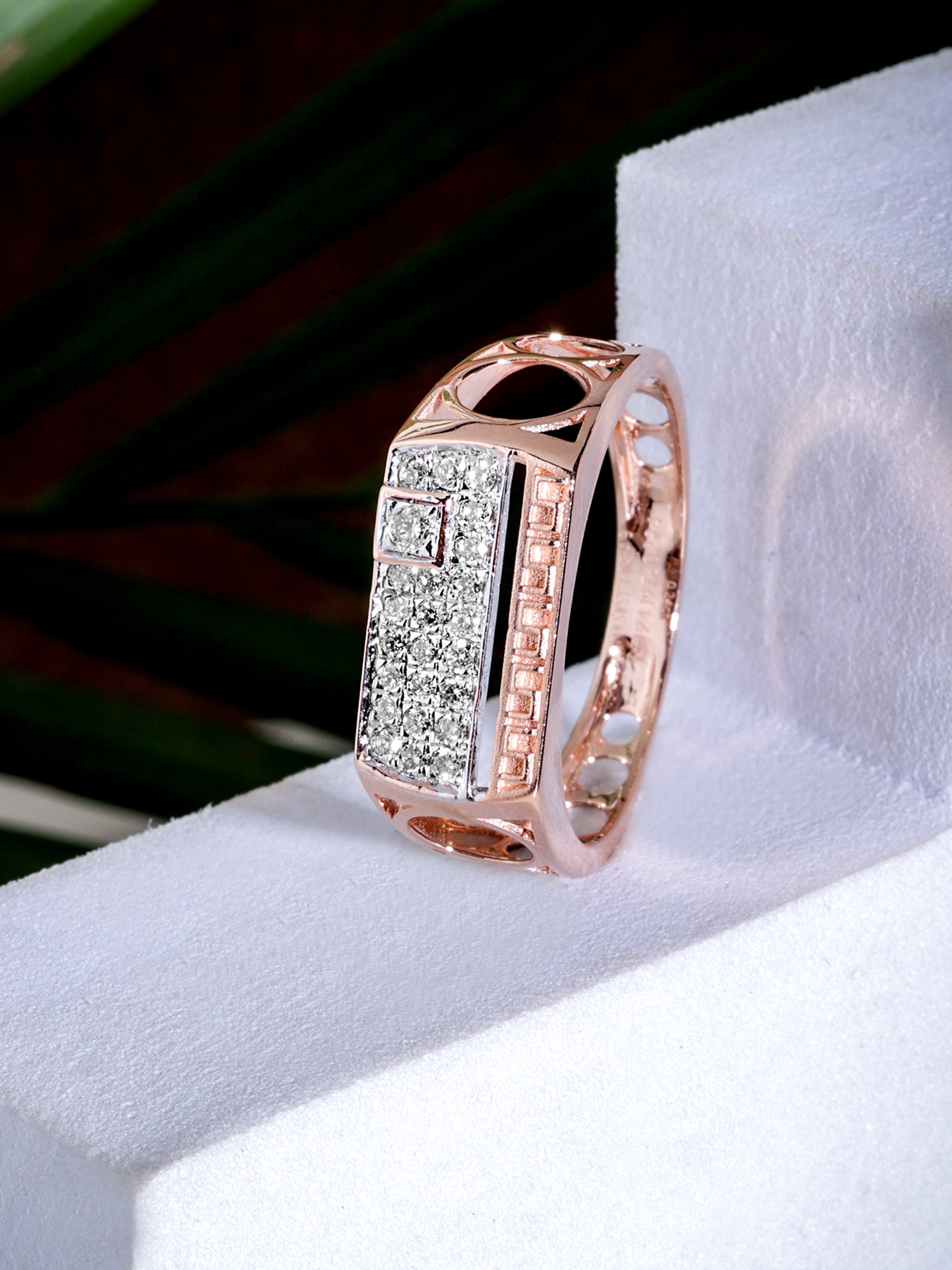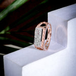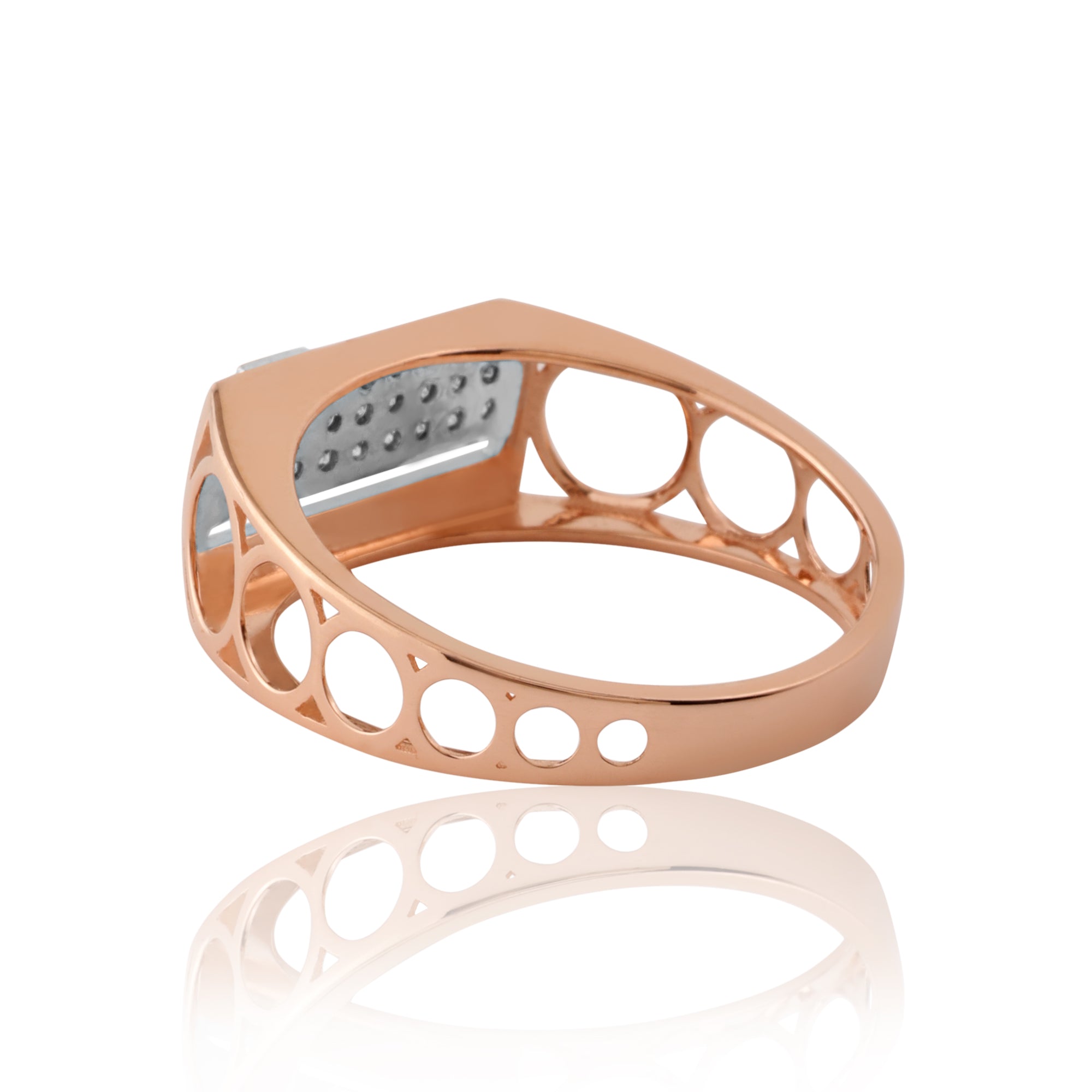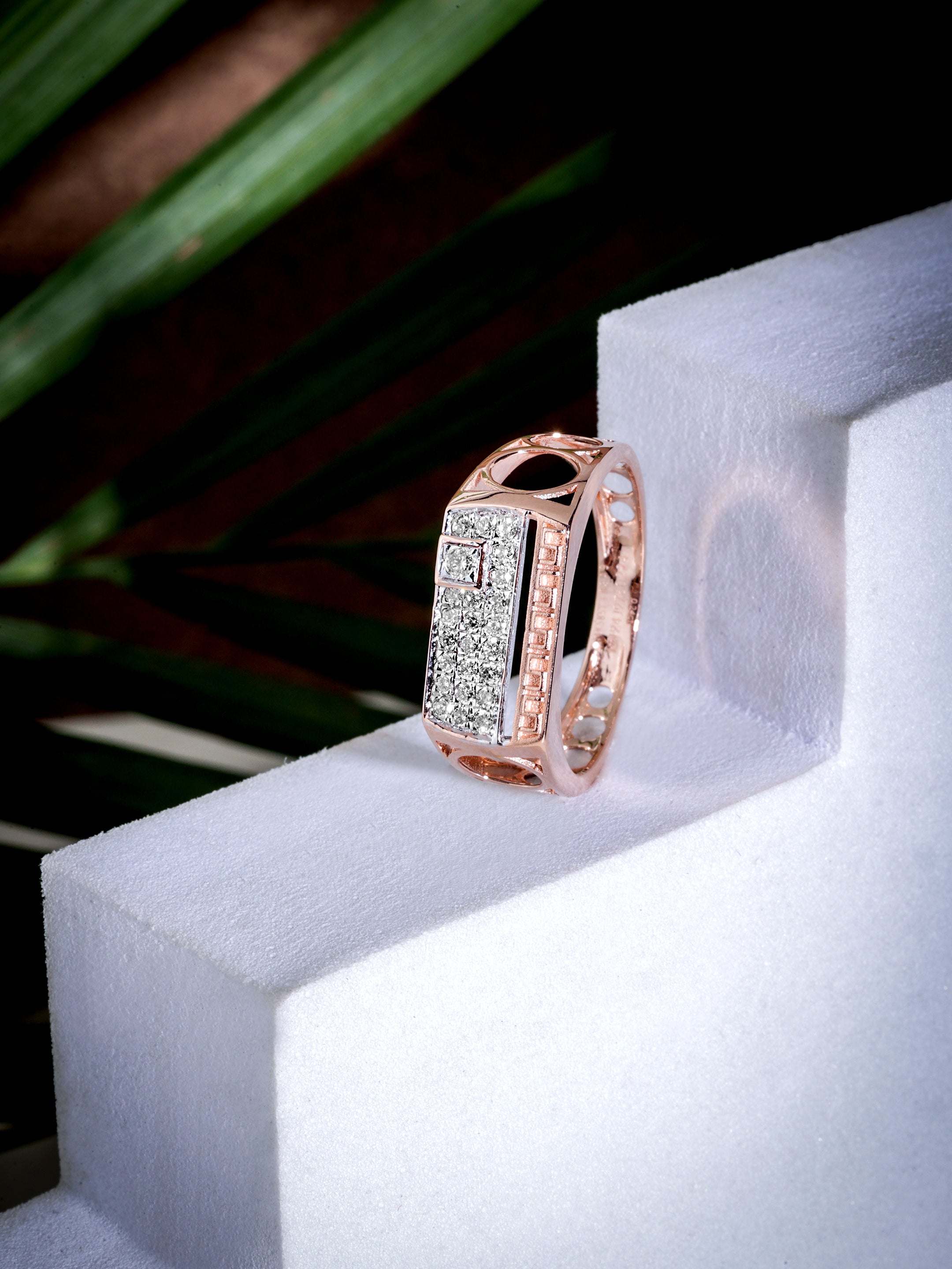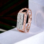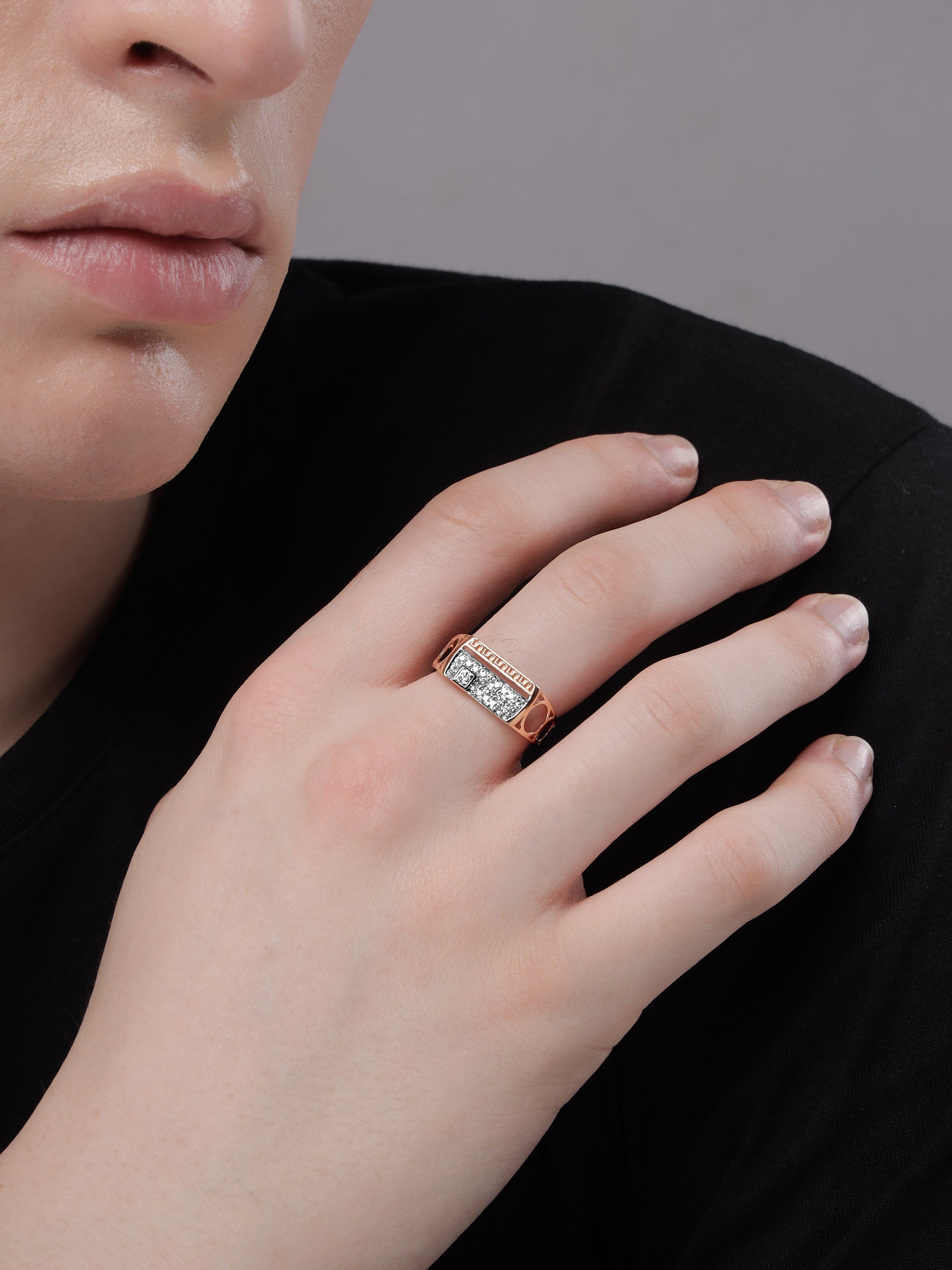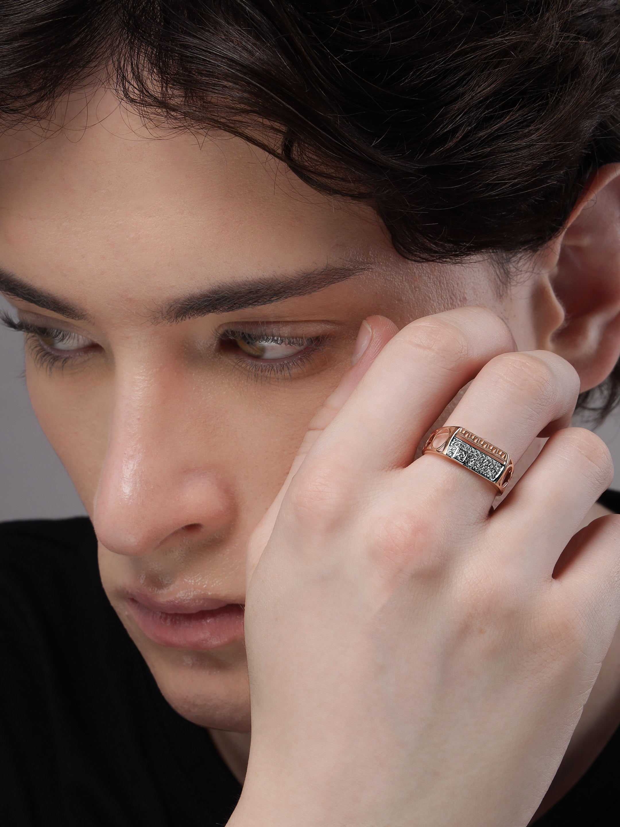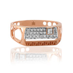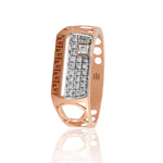The Epicurean Beacon Men's Diamond Ring is a striking statement piece crafted in rose gold, exuding a sense of royalty and elegance. The rectangular face of the ring is adorned with a meticulously arranged grid of brilliant-cut diamonds, creating a captivating mosaic effect. The edges of the ring are embellished with intricate cut-out patterns, adding depth and dimension to the overall design. A single diamond square subtly stands out within the grid, serving as a focal point and enhancing the ring's unique character. This ring is perfect for the modern man who appreciates a blend of classic and contemporary style.