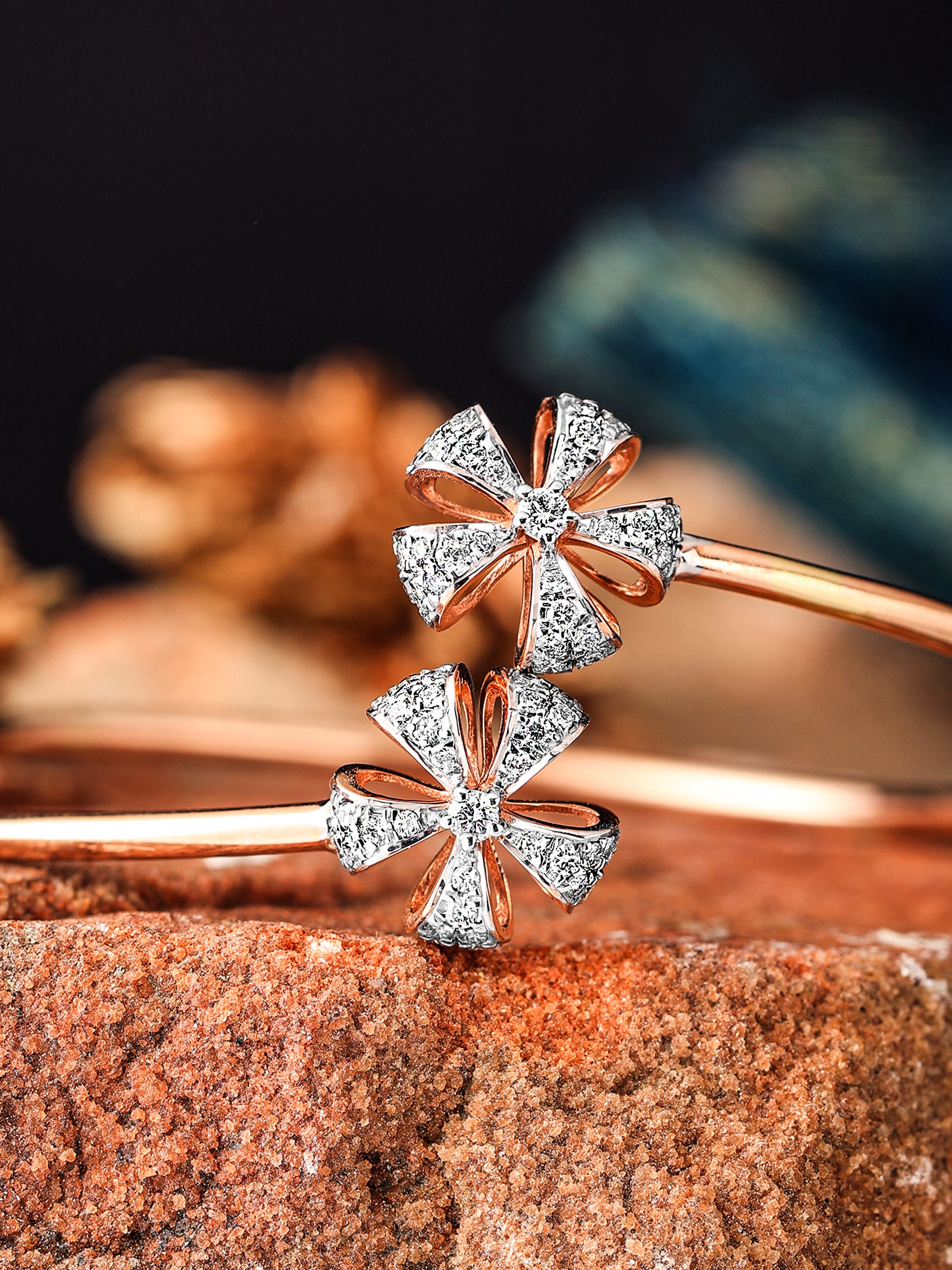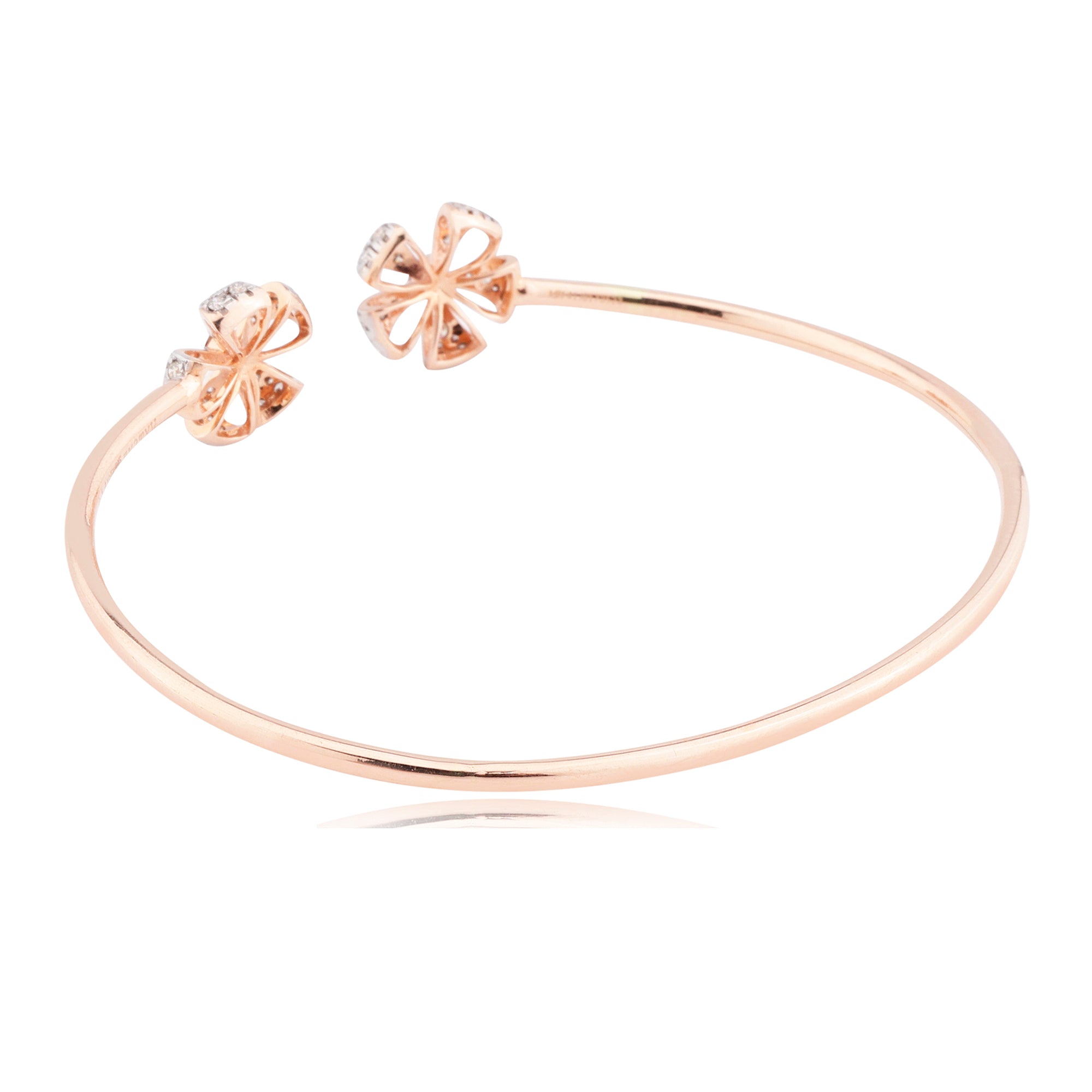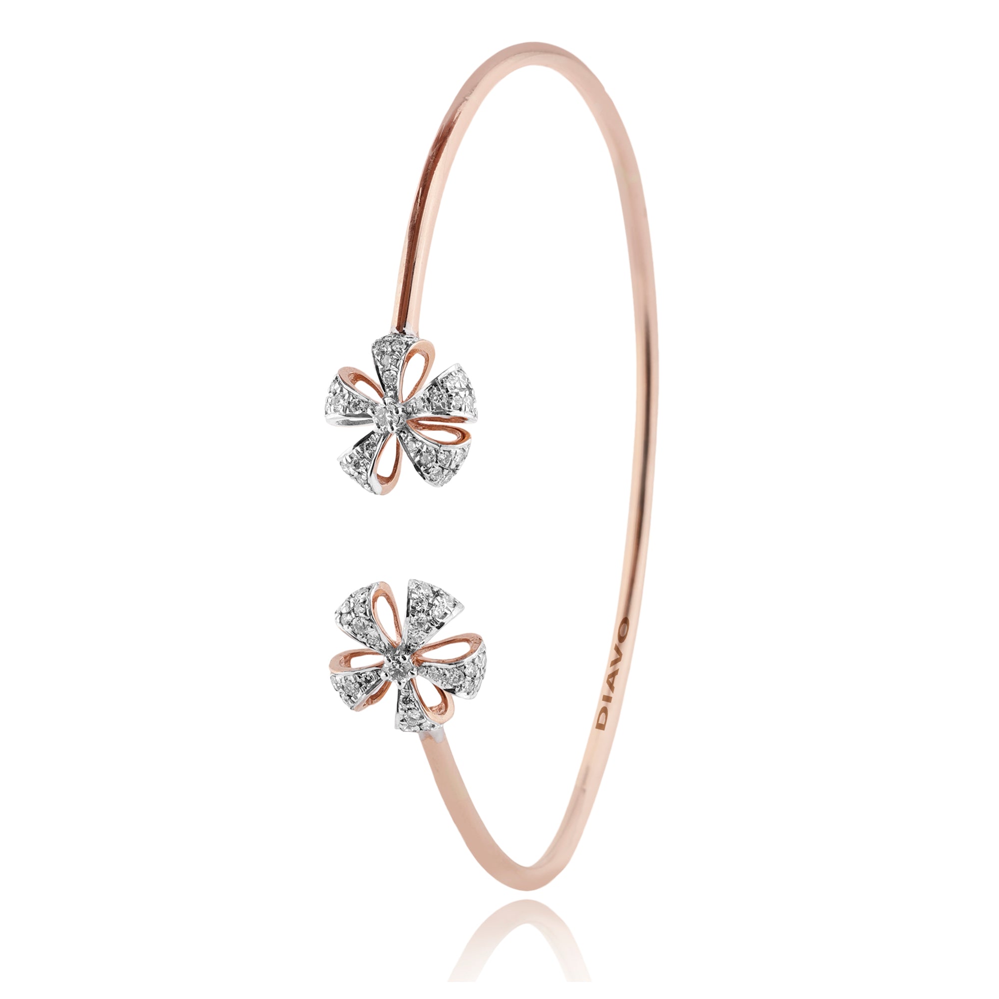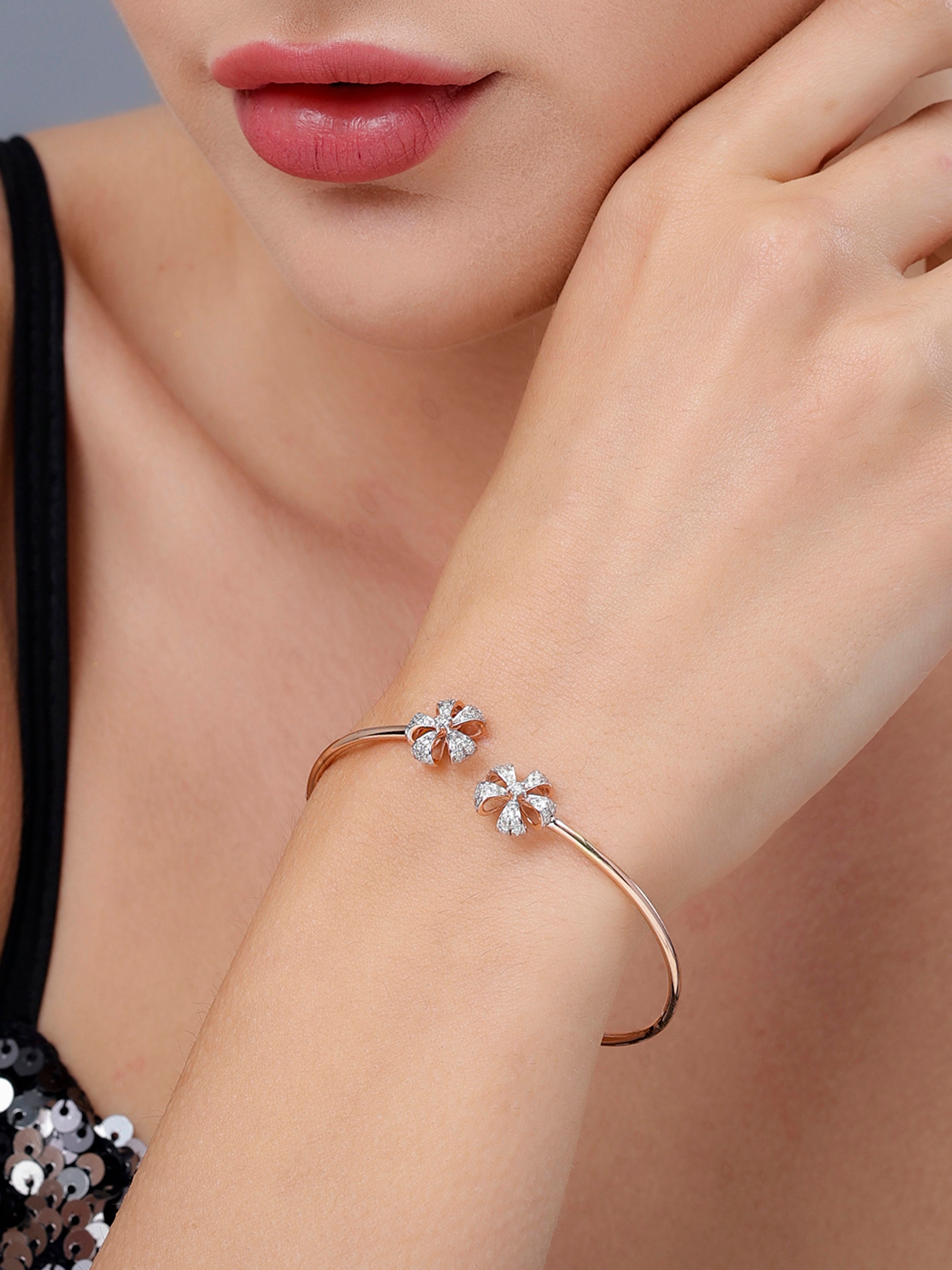 Presenting the Floral Sleek Diamond Bracelet: The Floral Sleek Diamond Bracelet is a testament to refined beauty. With a sleek band that delicately embraces your wrist, this bracelet boasts two exquisite flowers, one on the opposite edge. Each flower sparkles with the radiance of natural round brilliant diamonds. The open design adds an air of sophistication, making it a piece that effortlessly graces any occasion.