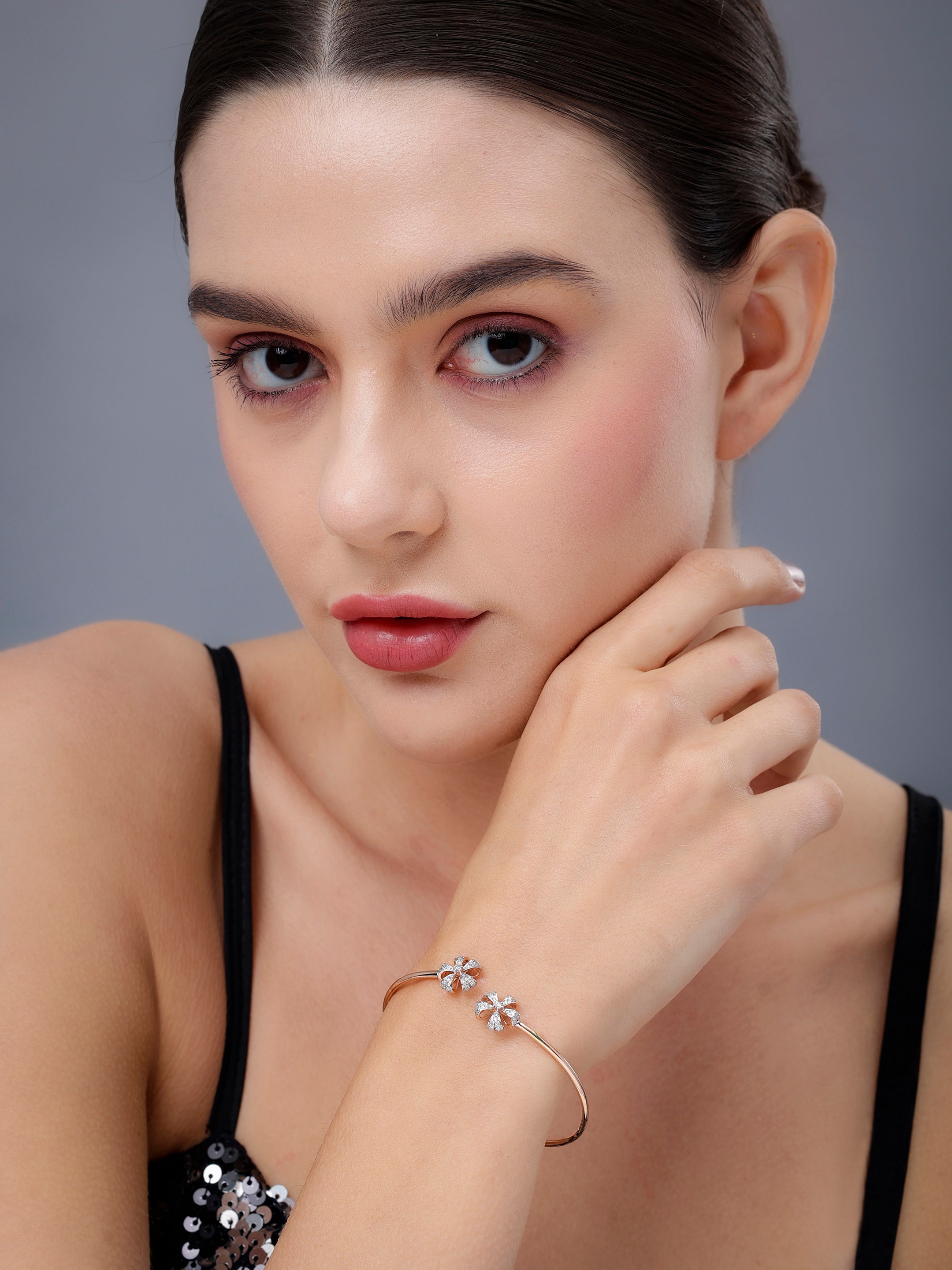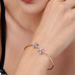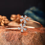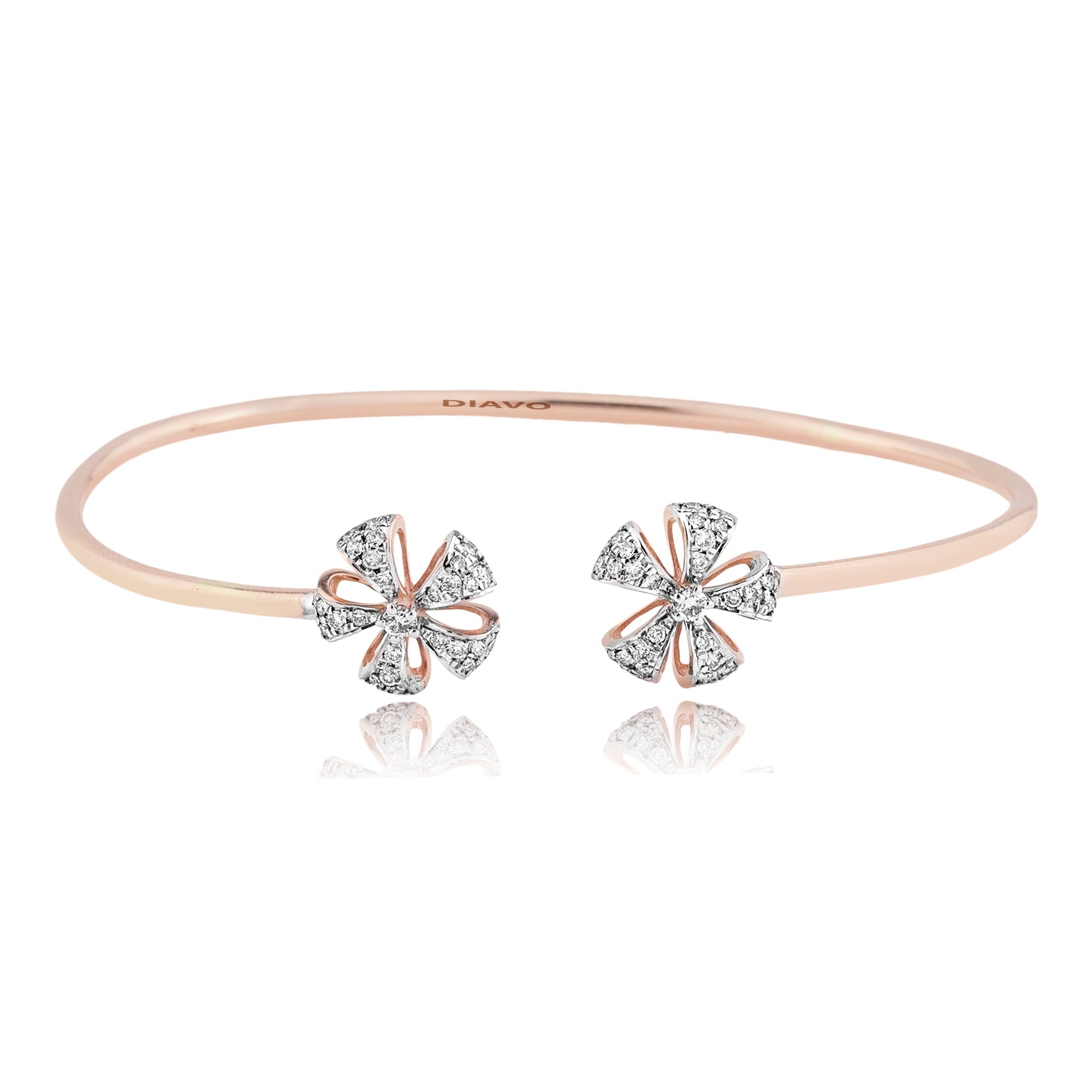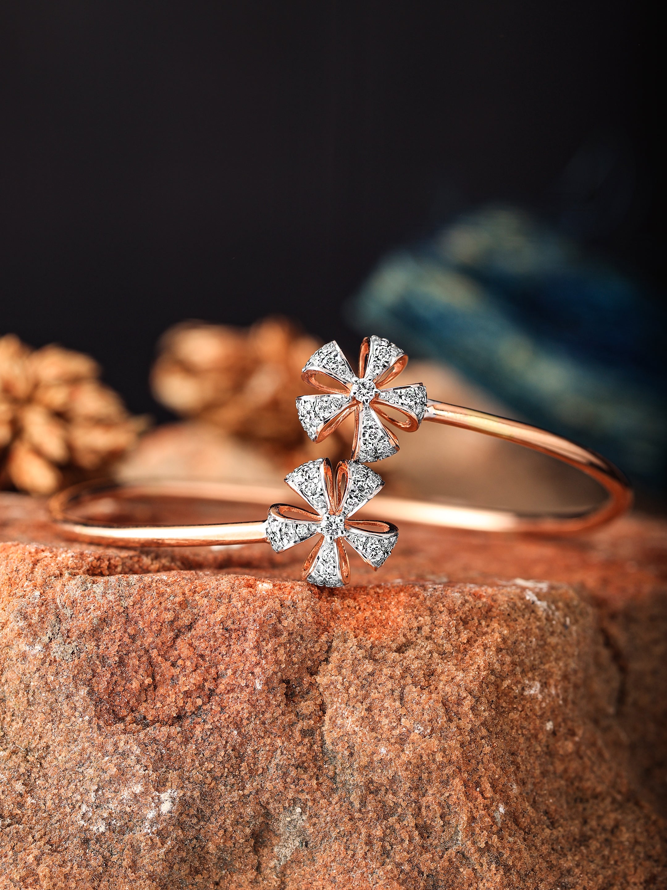 Presenting the Floral Sleek Diamond Bracelet: The Floral Sleek Diamond Bracelet is a testament to refined beauty. With a sleek band that delicately embraces your wrist, this bracelet boasts two exquisite flowers, one on the opposite edge. Each flower sparkles with the radiance of natural round brilliant diamonds. The open design adds an air of sophistication, making it a piece that effortlessly graces any occasion.