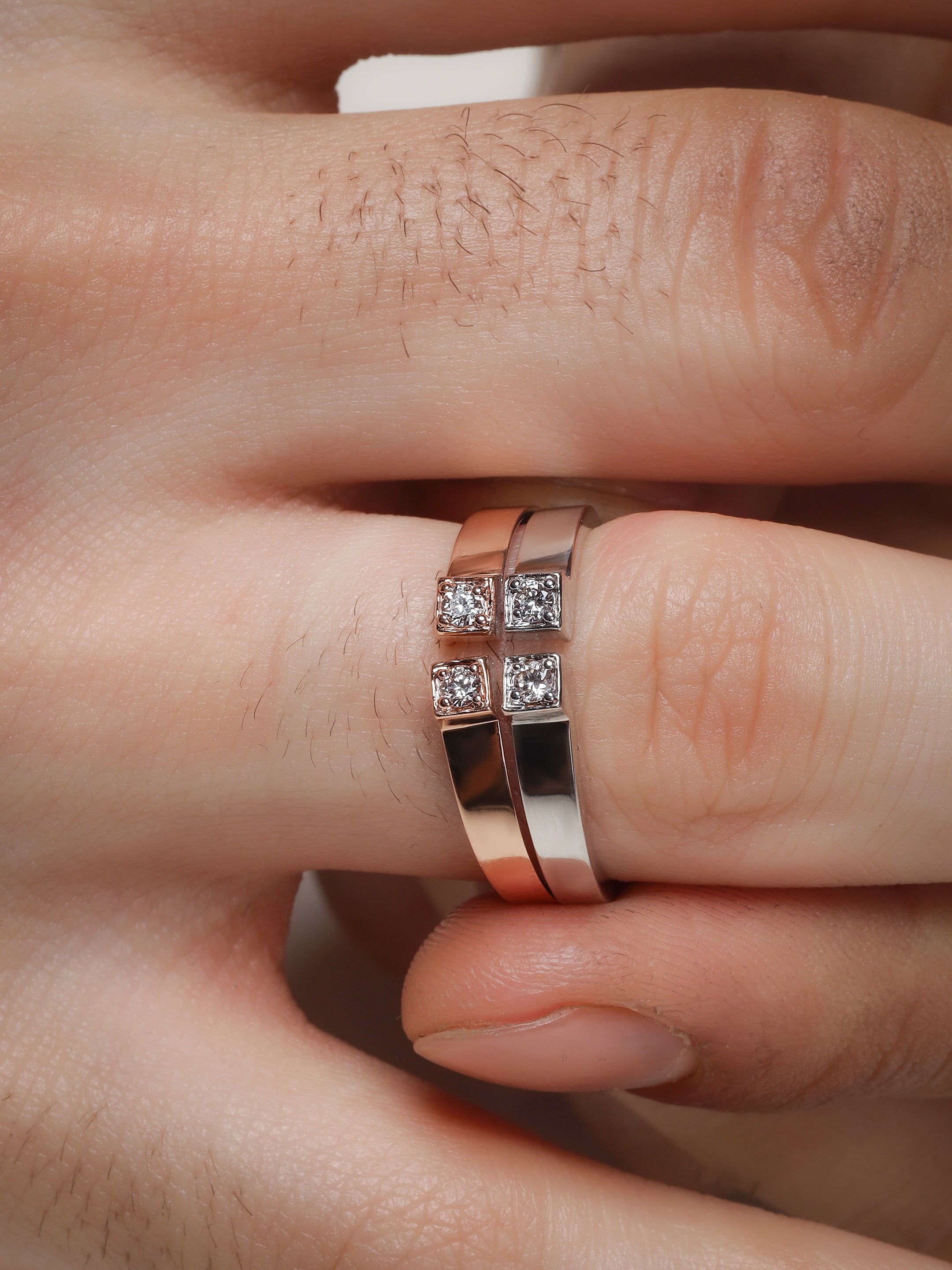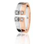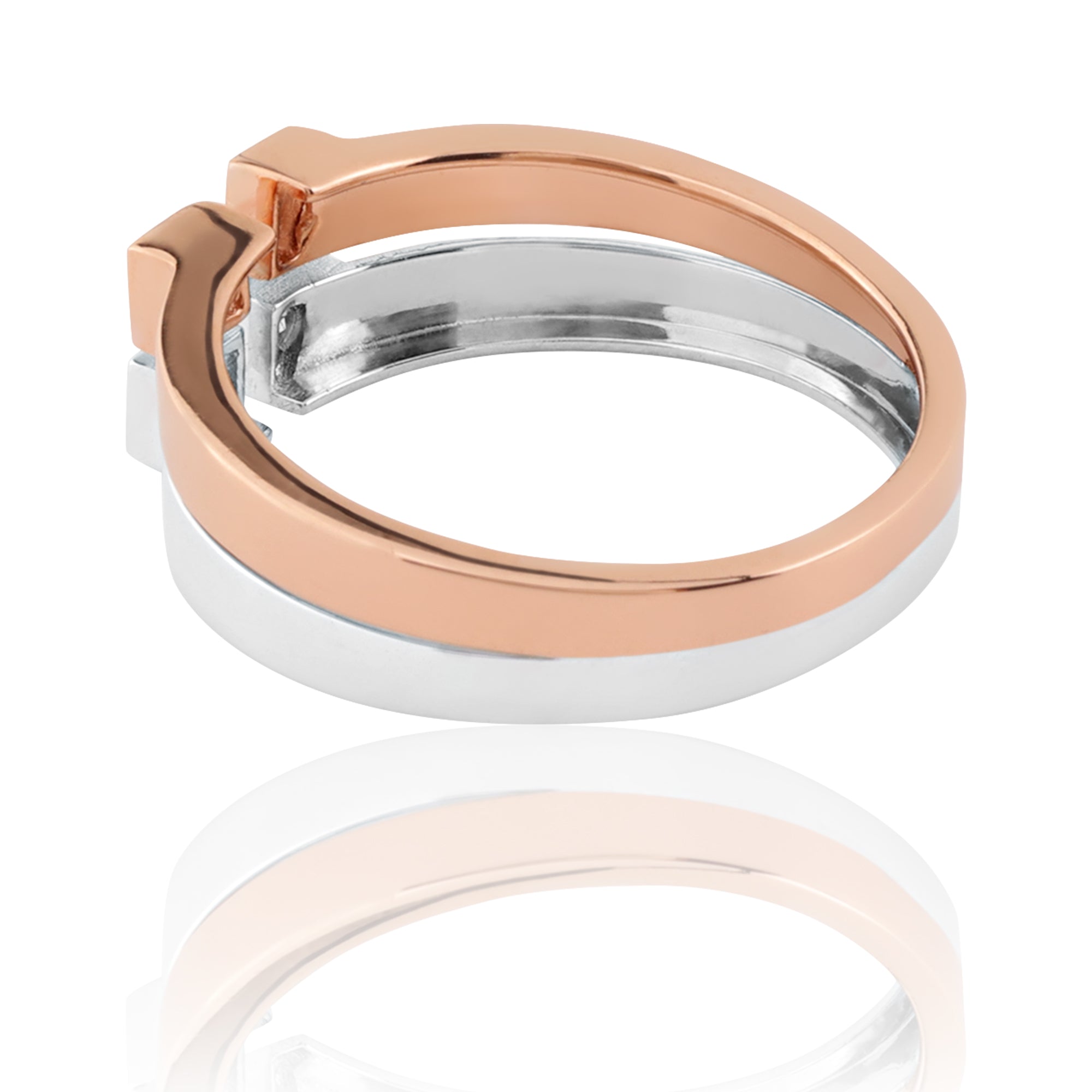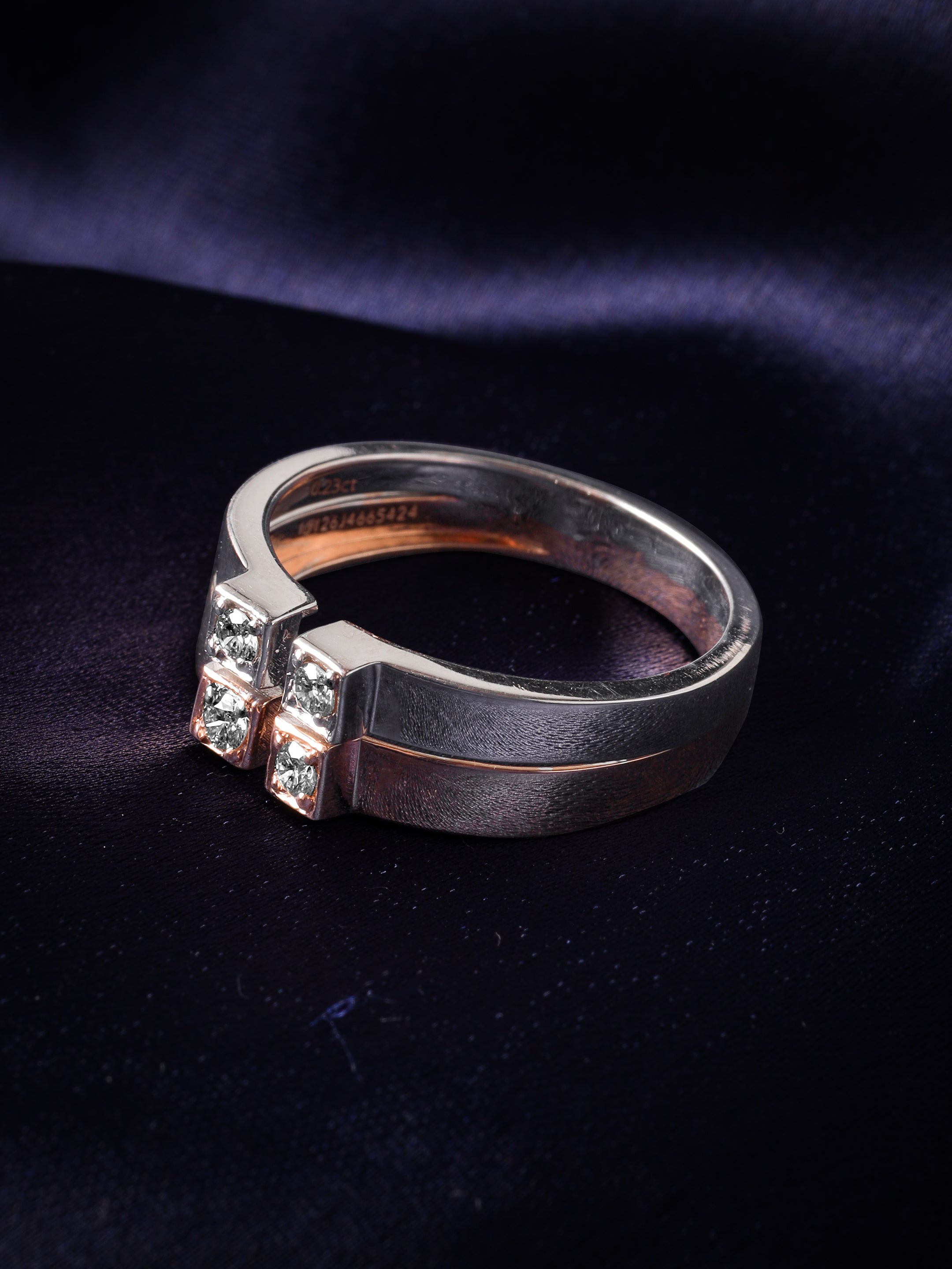 This men's ring is a stunning blend of modern design and timeless elegance, featuring a unique dual-tone composition. The band is crafted with alternating sections of sleek white gold and warm rose gold, creating a striking contrast that exudes sophistication. The focal point of the ring lies in its quartet of square diamond settings—two in each tone. Each diamond is encased in a secure bezel setting, adding both brilliance and structure to the piece. The symmetry of the design, combined with the interplay of colors, creates a harmonious and balanced aesthetic. This ring is perfect for the discerning gentleman who values both innovation and tradition, offering a bold statement of style and confidence. Ideal for special occasions or as a signature accessory, this piece embodies the perfect fusion of form and function.