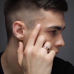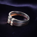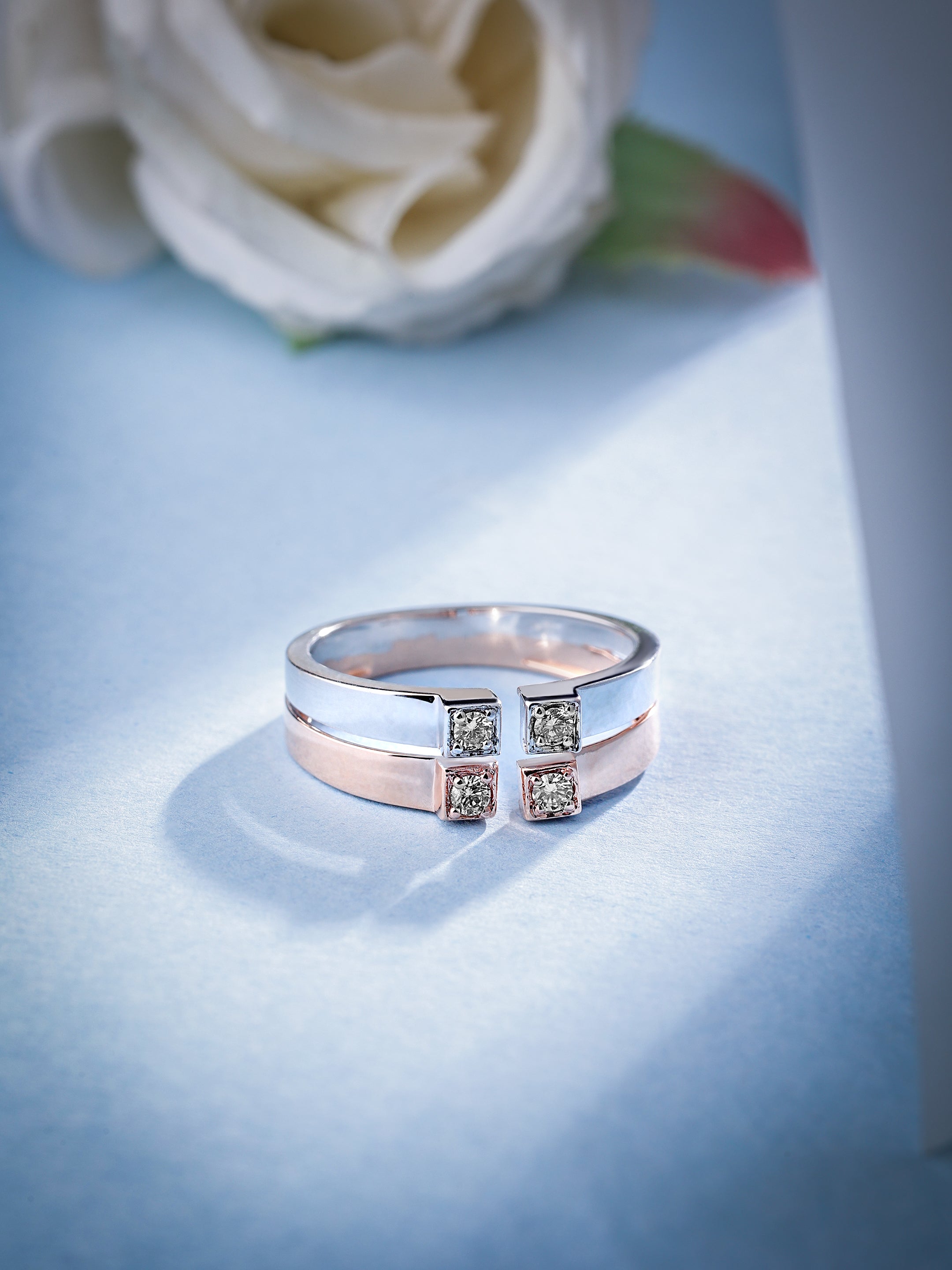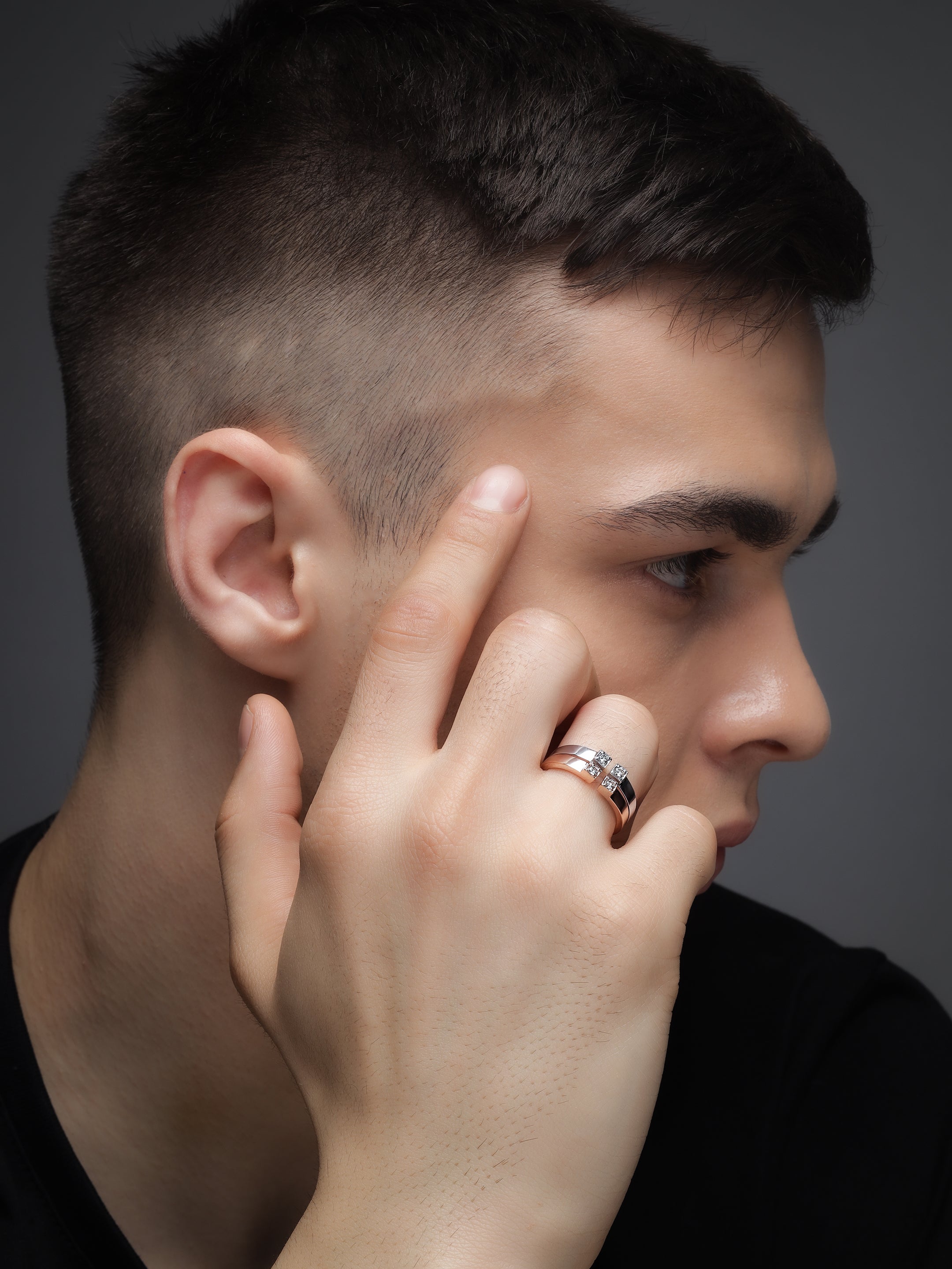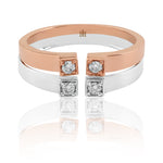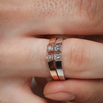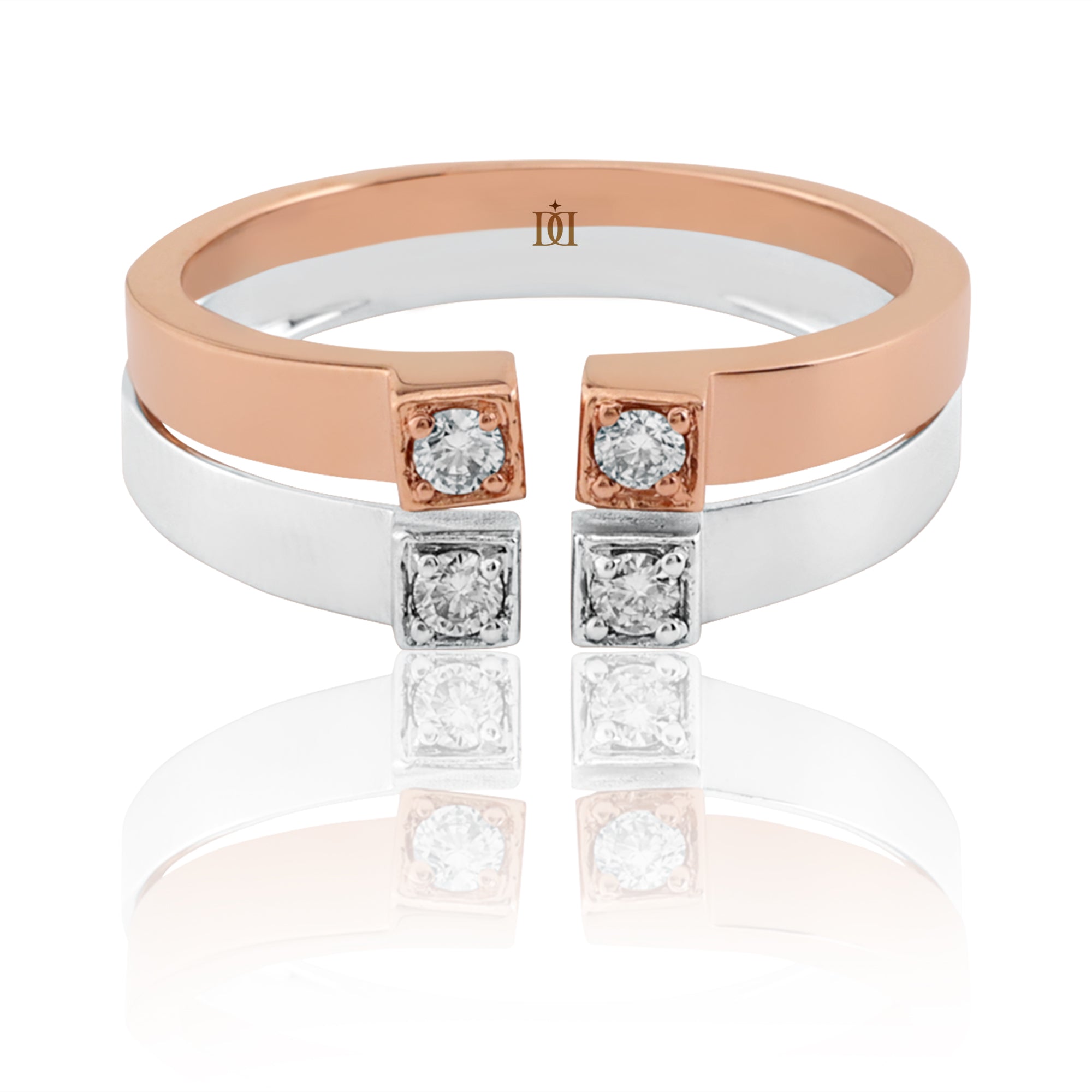 This men's ring is a stunning blend of modern design and timeless elegance, featuring a unique dual-tone composition. The band is crafted with alternating sections of sleek white gold and warm rose gold, creating a striking contrast that exudes sophistication. The focal point of the ring lies in its quartet of square diamond settings—two in each tone. Each diamond is encased in a secure bezel setting, adding both brilliance and structure to the piece. The symmetry of the design, combined with the interplay of colors, creates a harmonious and balanced aesthetic. This ring is perfect for the discerning gentleman who values both innovation and tradition, offering a bold statement of style and confidence. Ideal for special occasions or as a signature accessory, this piece embodies the perfect fusion of form and function.