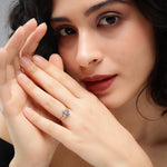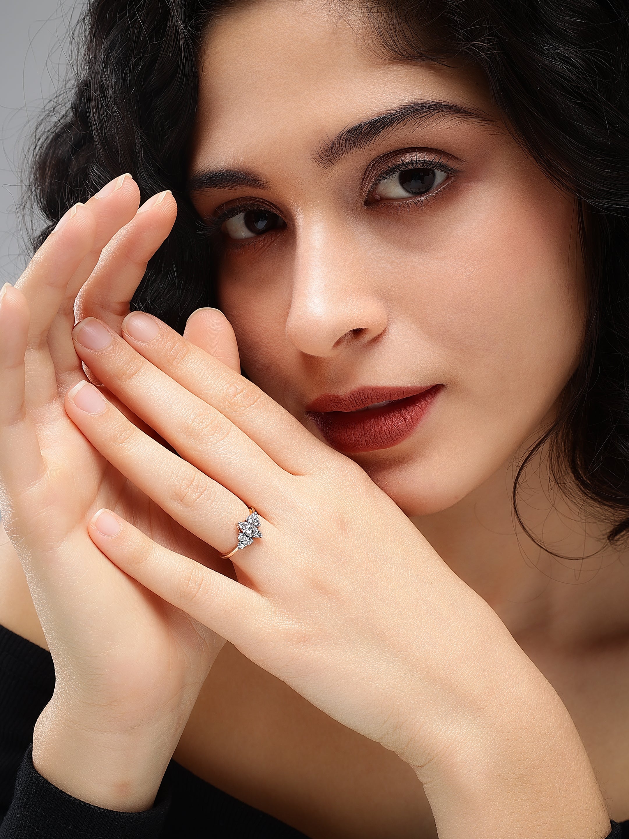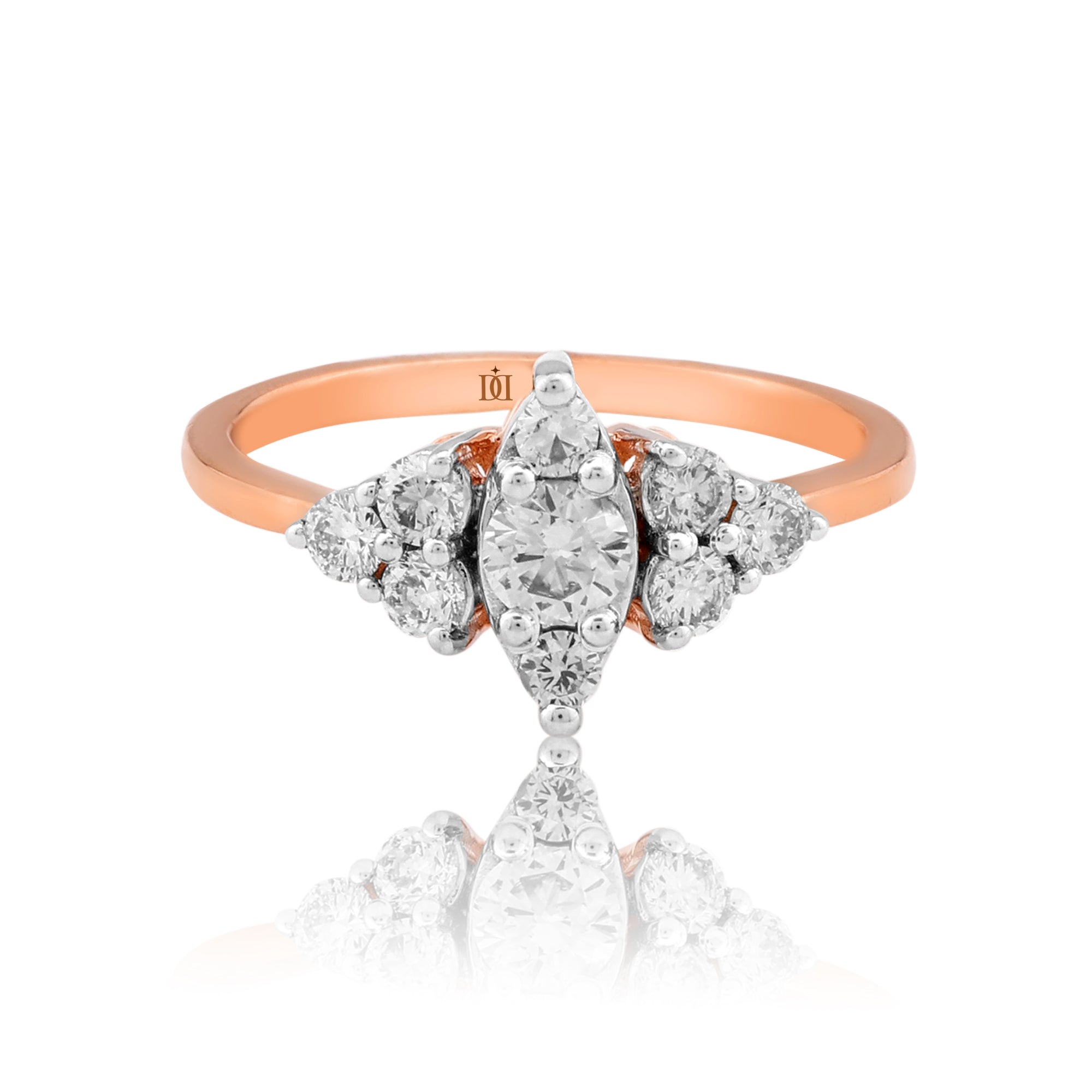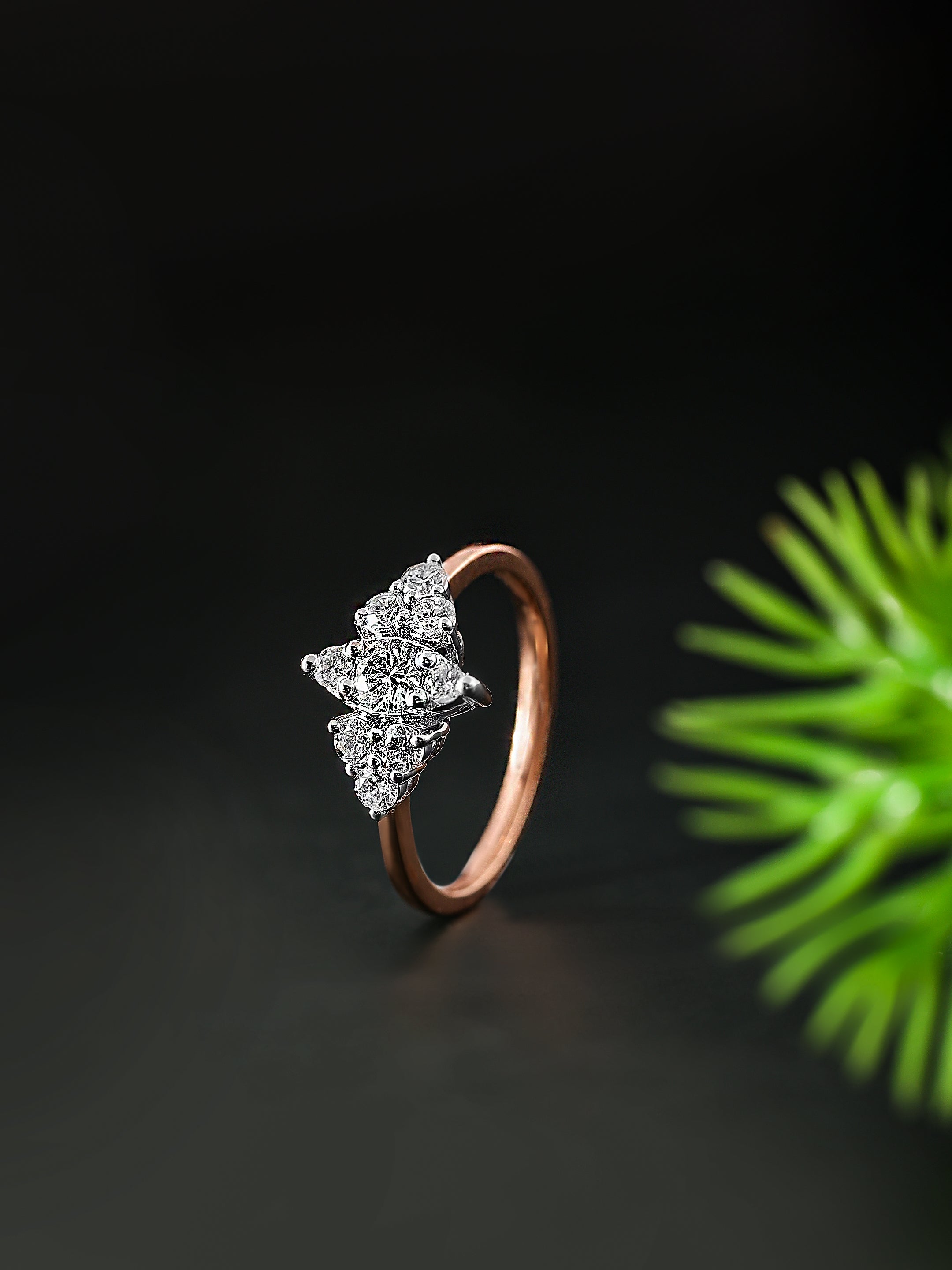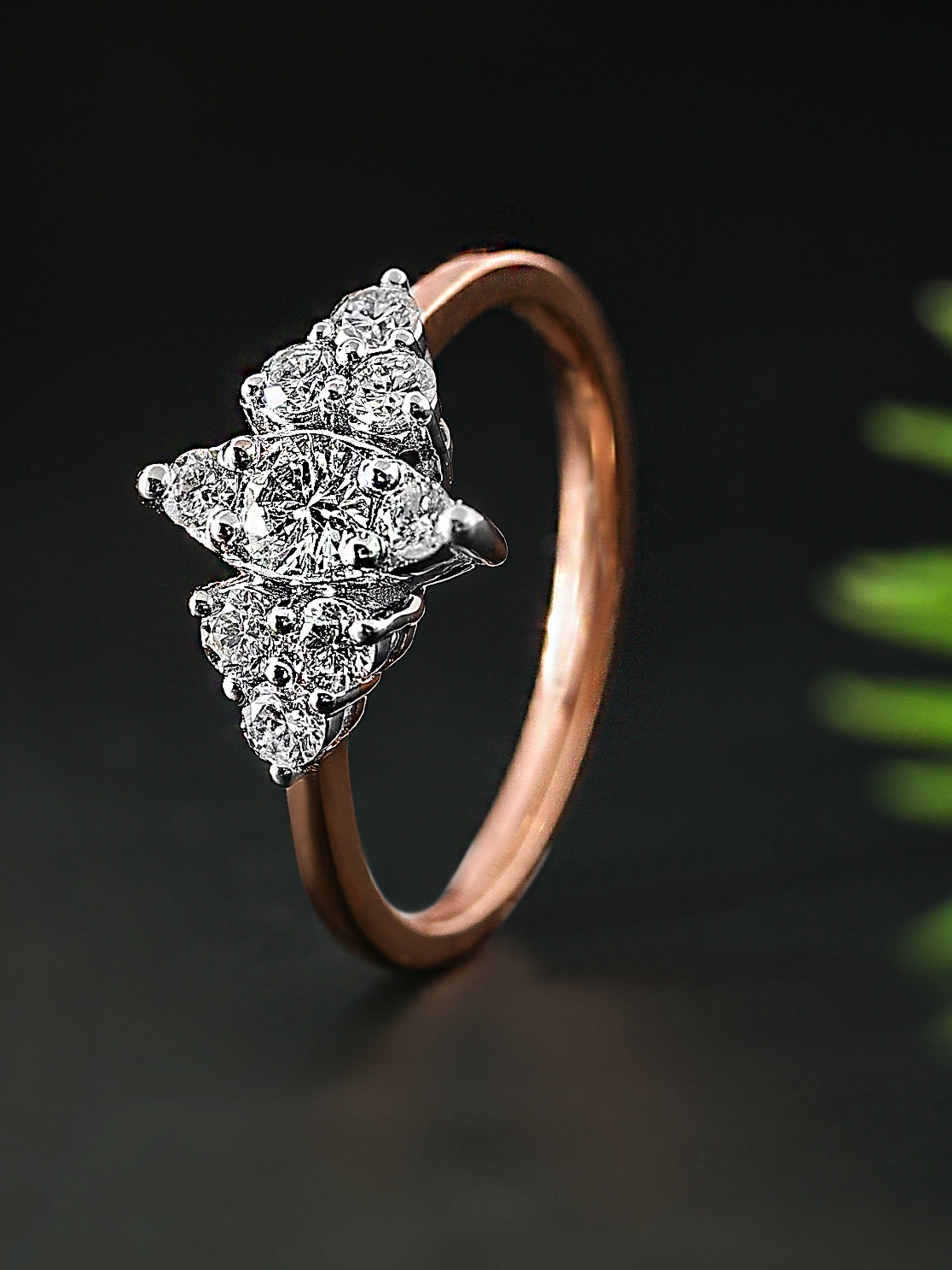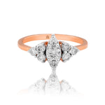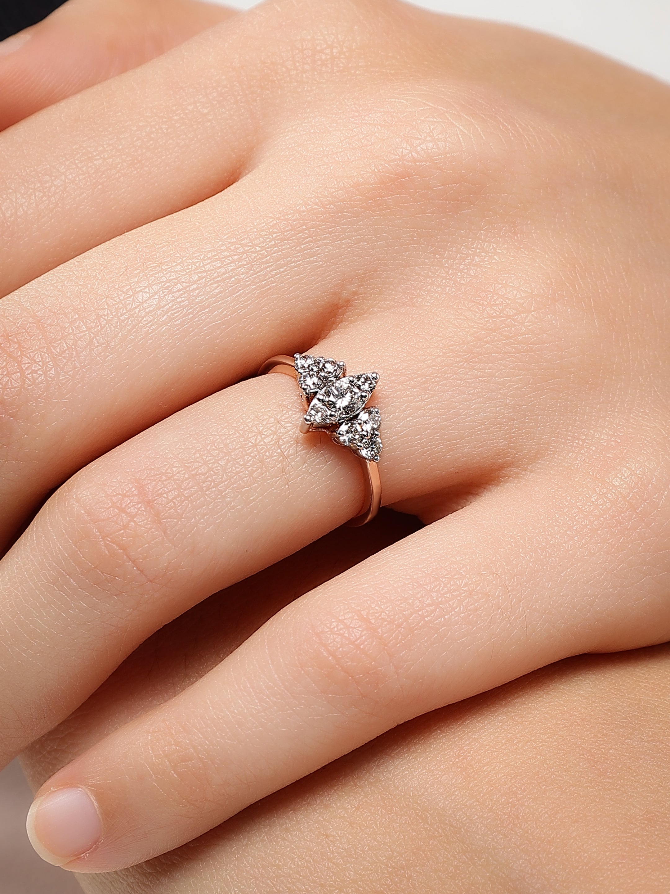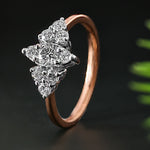 The Glittering Tri-Point Diamond Ring exudes elegance with its unique tri-point design, where clusters of brilliant-cut diamonds form a captivating triangular arrangement. At its heart, a dazzling round diamond is framed by two smaller diamond clusters, all set in warm, luxurious rose gold. The rose gold band adds a touch of sophistication and enhances the overall sparkle of the diamonds, which are meticulously set to maximize light reflection. This exquisite ring seamlessly blends modern design with timeless beauty, making it a perfect piece for both everyday wear and special occasions.