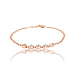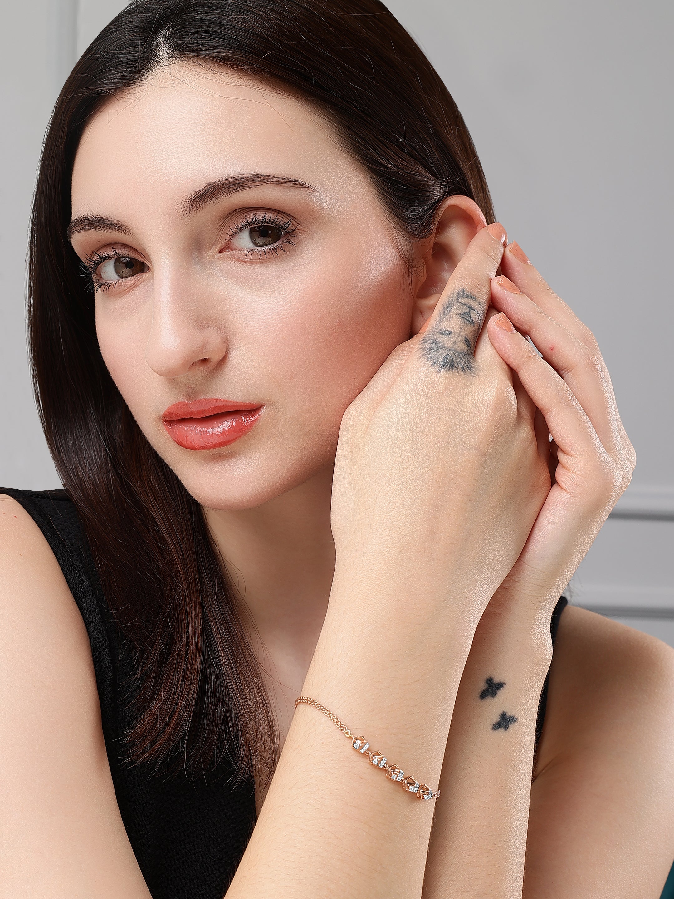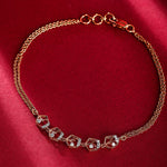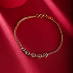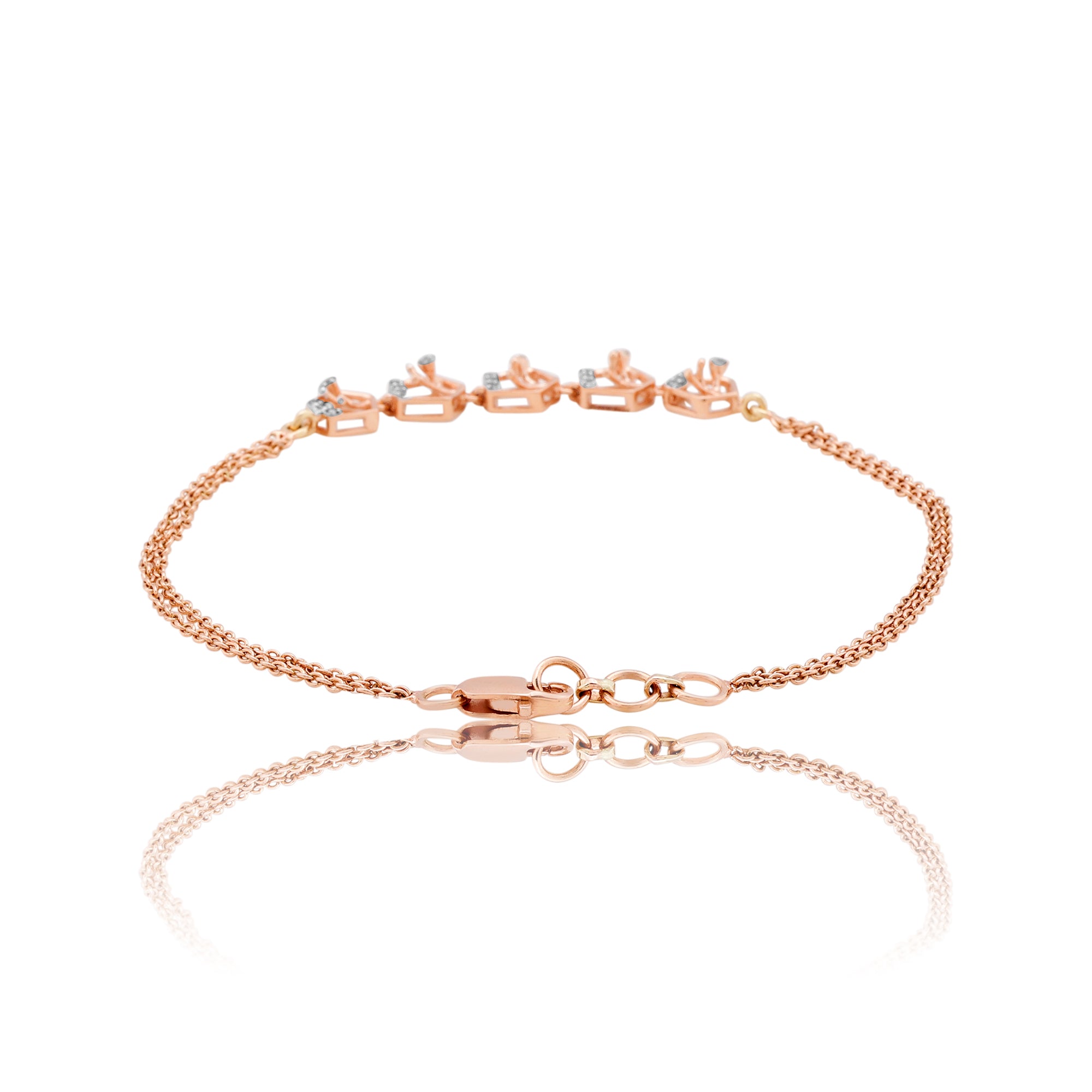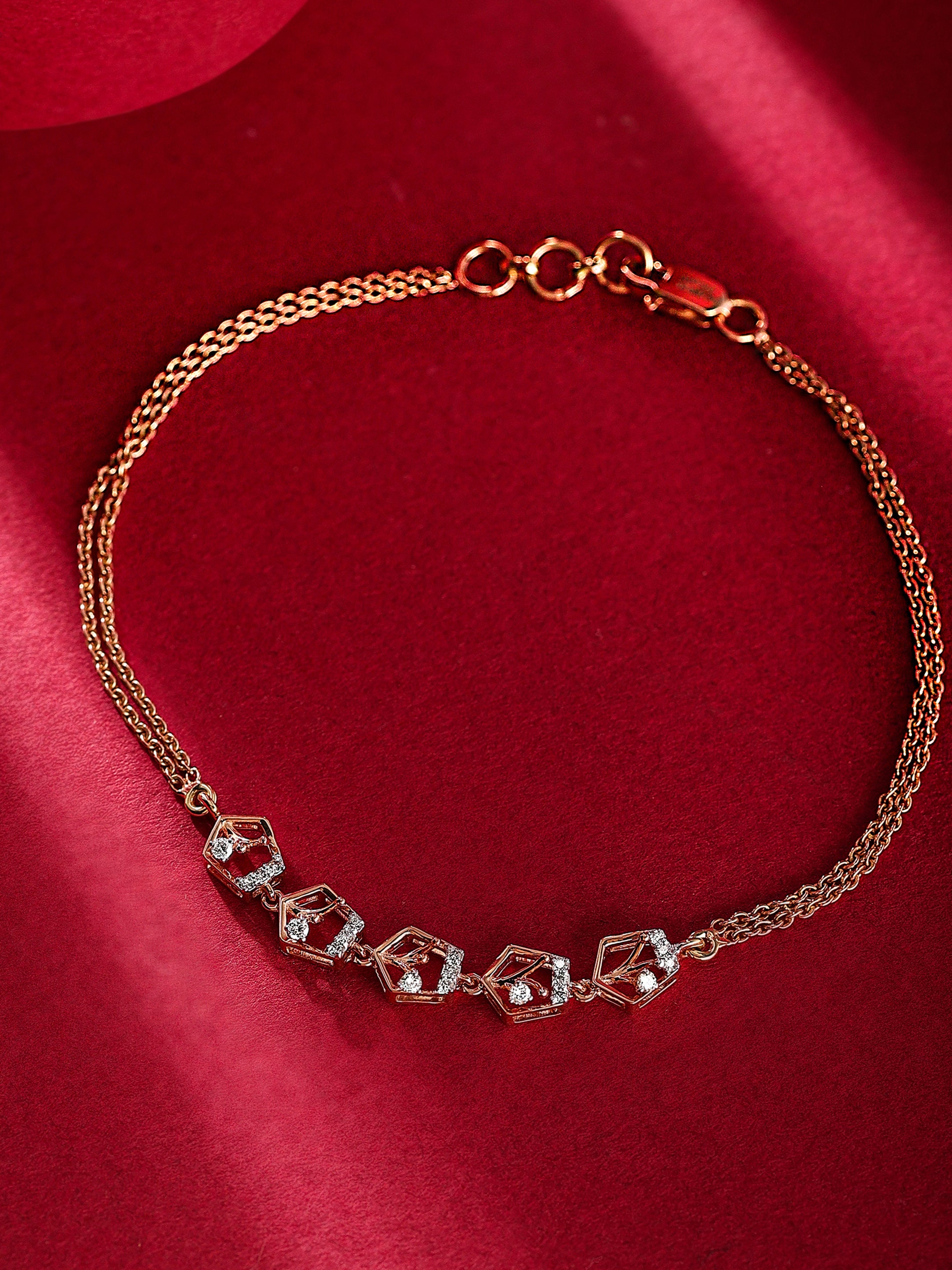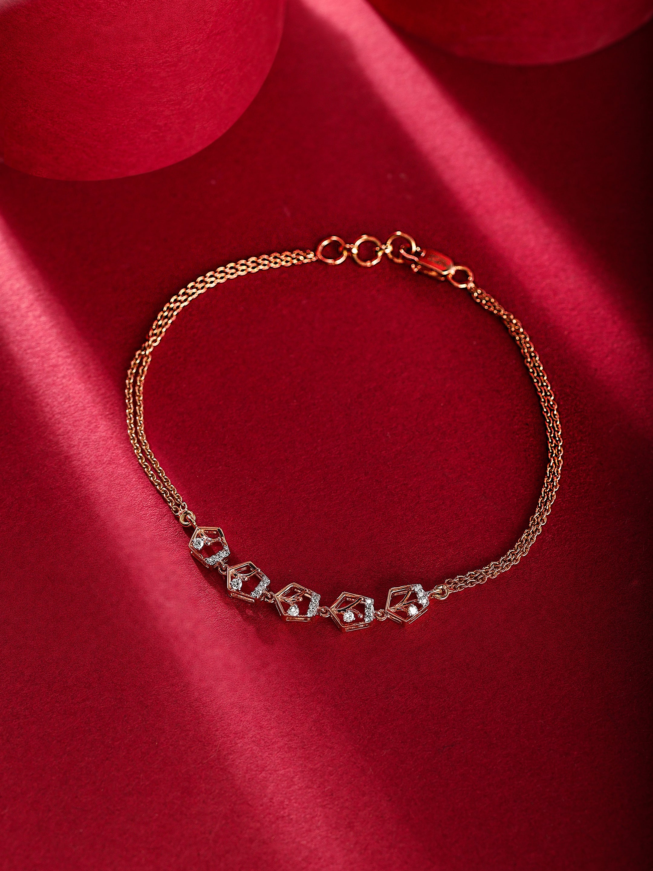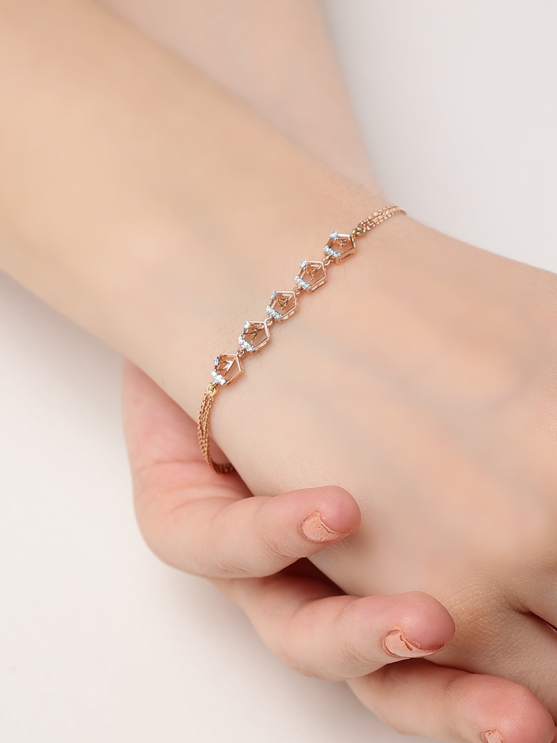 Introducing the Graceful Symmetry Diamond Bracelet: Elevate your style with the Graceful Symmetry Diamond Bracelet, a masterpiece of elegance where modern design meets the timeless allure of diamonds. Adorn your wrist with the captivating allure of this bracelet. Its sleek and minimalistic design features a band of flawless gold, artfully sculpted into a canvas of harmony. Five small diamond-studded shapes gracefully punctuate the bracelet, creating a symphony of balance and sophistication.