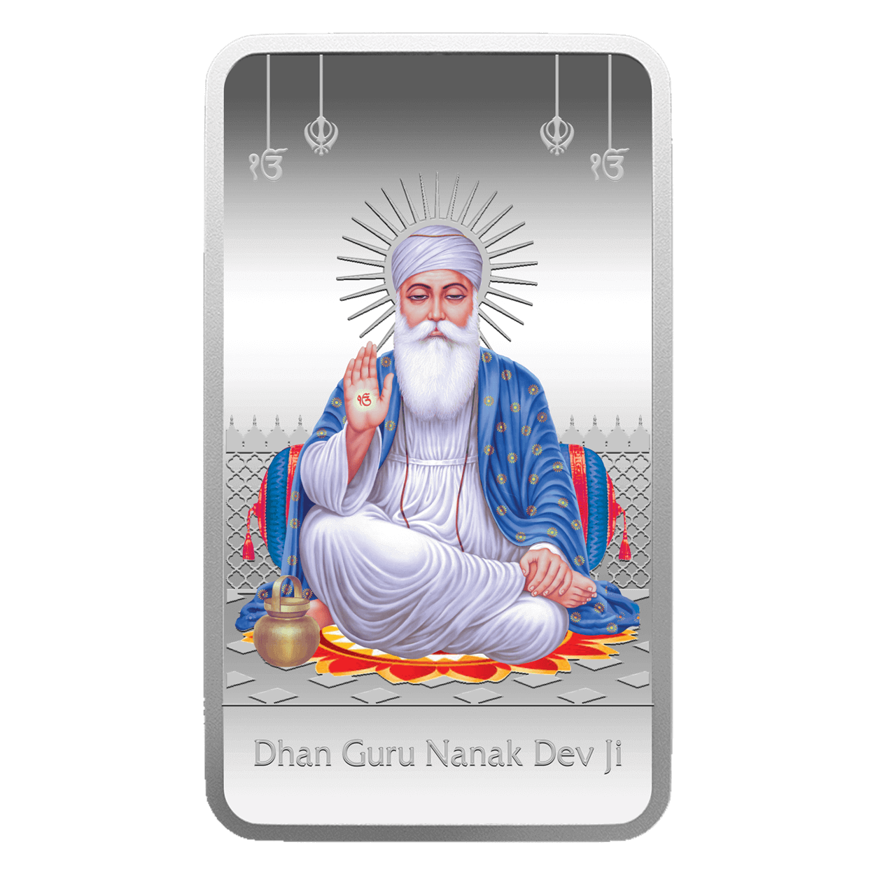 This exceptional 20gm silver bar showcases the revered figure of Guru Nanak Sahib Ji, the esteemed founder of Sikhism and the first of the ten Sikh Gurus. Guru Nanak's teachings have inspired millions worldwide, fostering values of equality, love, goodness, and virtue. This unique silver bar features a stunning colored portrayal of Guru Nanak Sahib Ji, capturing the spiritual radiance of the Saint. It is a truly exceptional product, embodying the timeless wisdom and teachings of Guru Nanak. Presented in an elegant deluxe packaging, this silver bar is not only perfect for gifting but also a must-have for collectors of limited-edition world-class products.