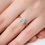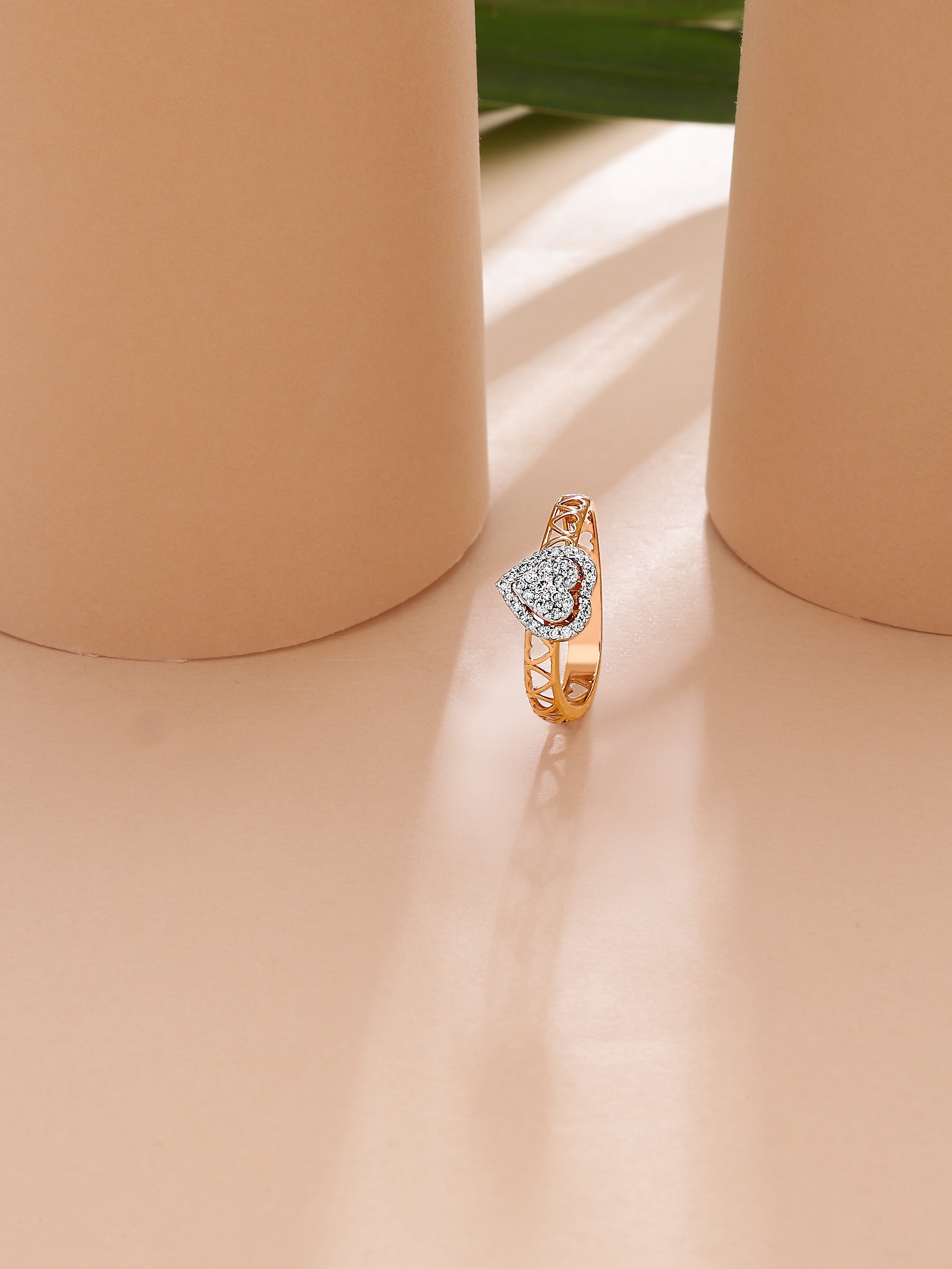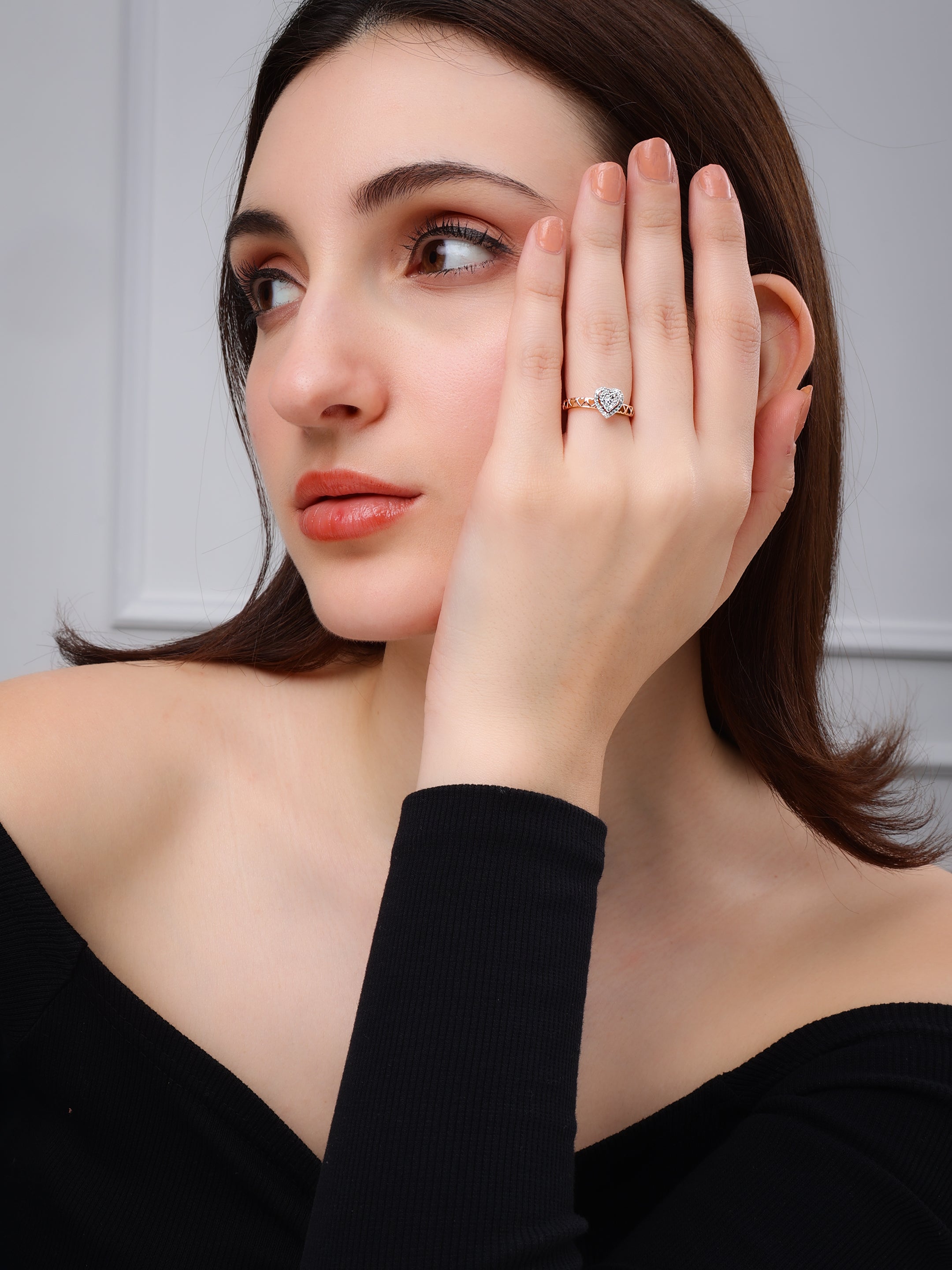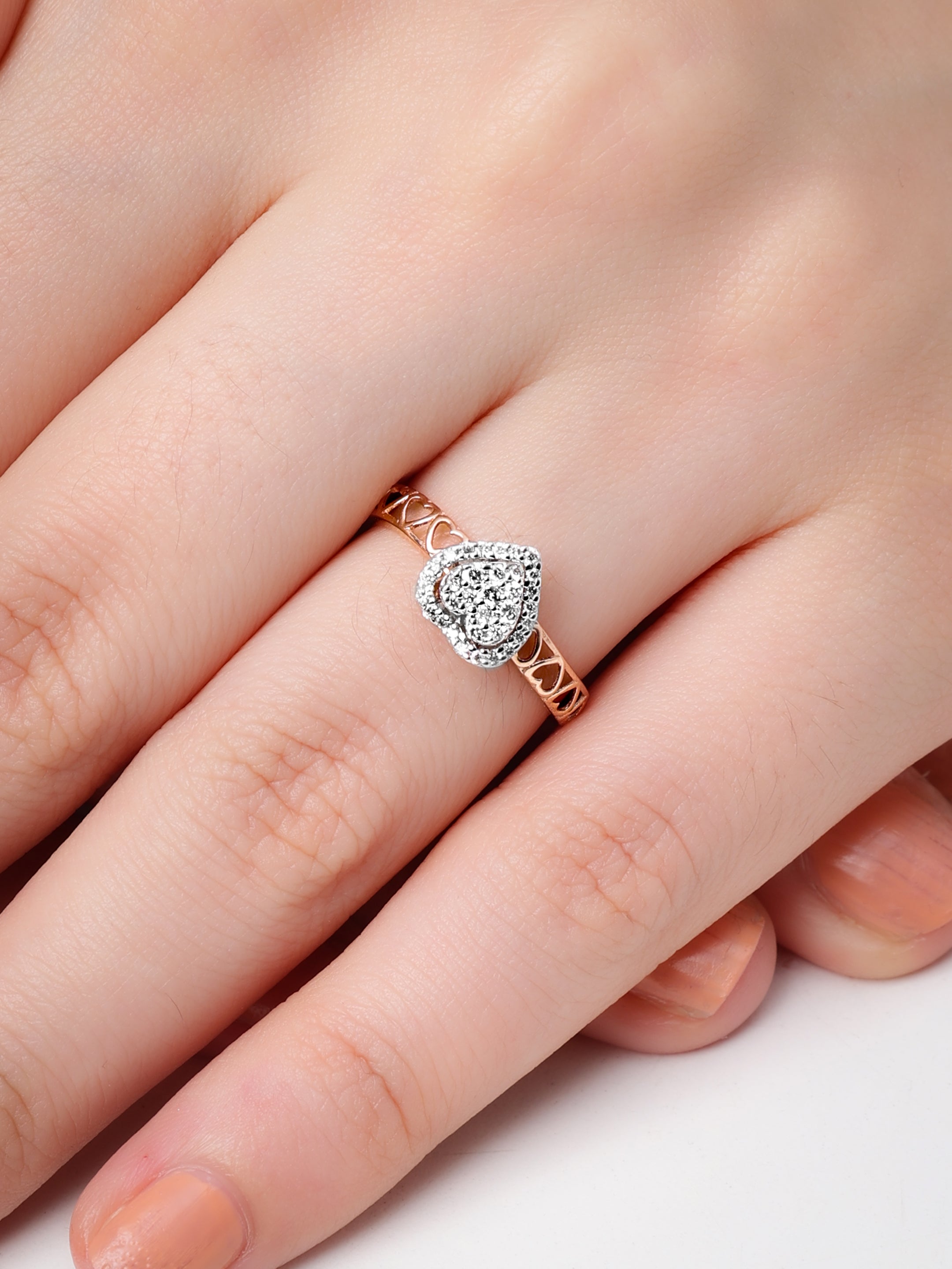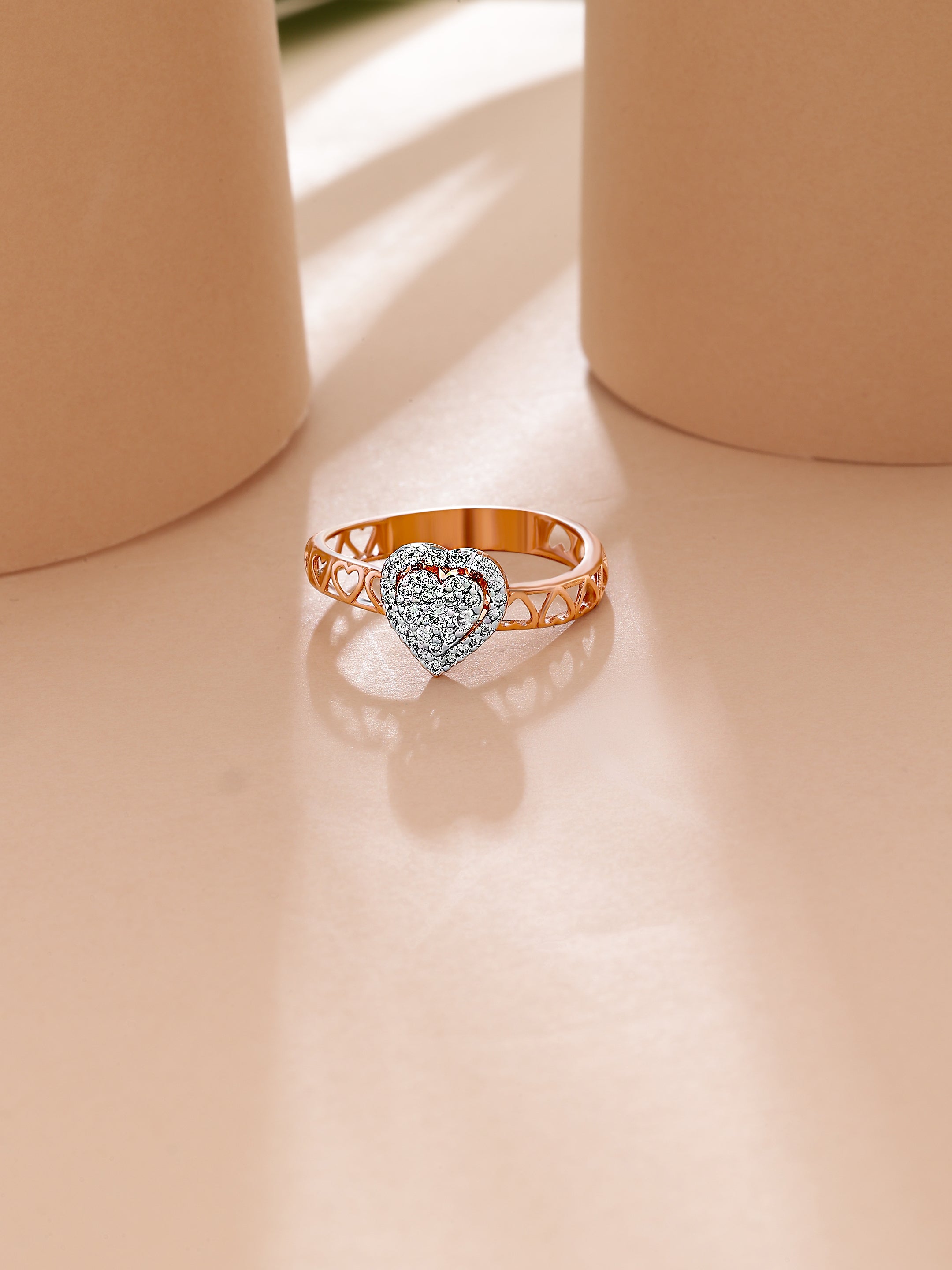 Introducing the Heartfelt Serenade Diamond Ring: Elevate your style with the Heartfelt Serenade Diamond Ring. Crafted in gold, the band showcases a delightful interplay of hearts, gracefully adorning the band's curve. Inverted hearts on one side and upright hearts on the other create a captivating visual melody. At the center, a prominent heart layer cradles a smaller heart, embellished with natural round brilliant diamonds, infusing the design with a touch of timeless elegance.