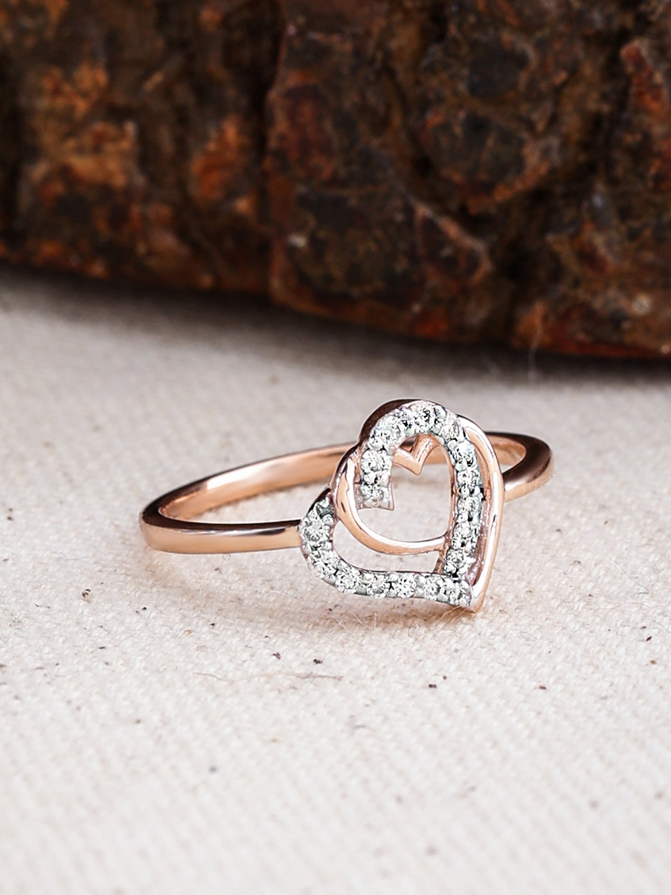This exquisite women's ring is a symbol of love and elegance, crafted from luxurious rose gold. The delicate band is adorned with a stunning open-heart design, where two intertwined hearts gracefully come together. The larger heart is encrusted with sparkling diamonds, creating a radiant frame that enhances the inner rose gold heart. The contrast between the shimmering diamonds and the warm rose gold adds depth and dimension to the piece. This enchanting design beautifully captures the essence of romance and sophistication, making it a perfect gift for someone special or a treasured addition to any jewelry collection.
