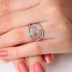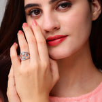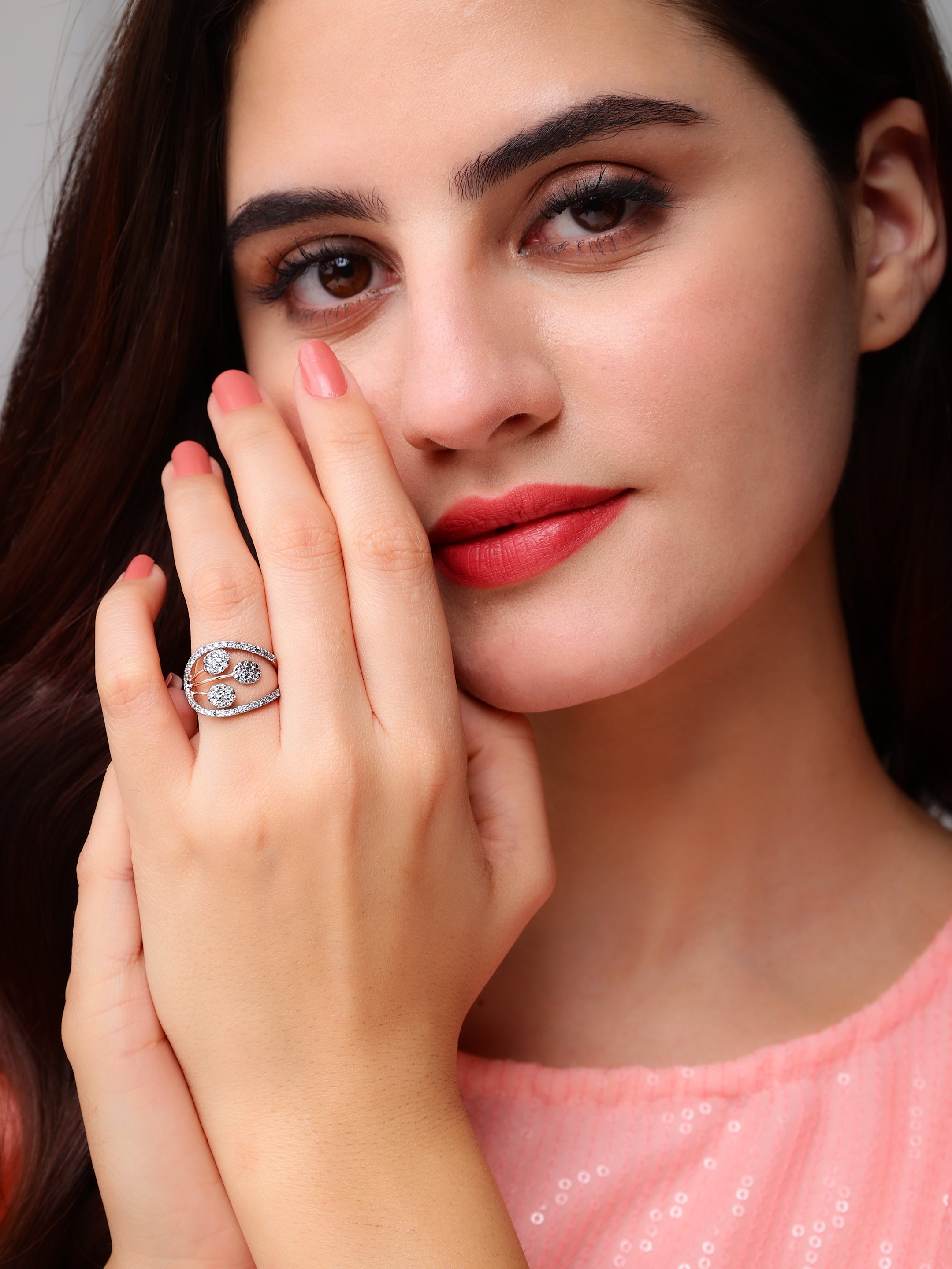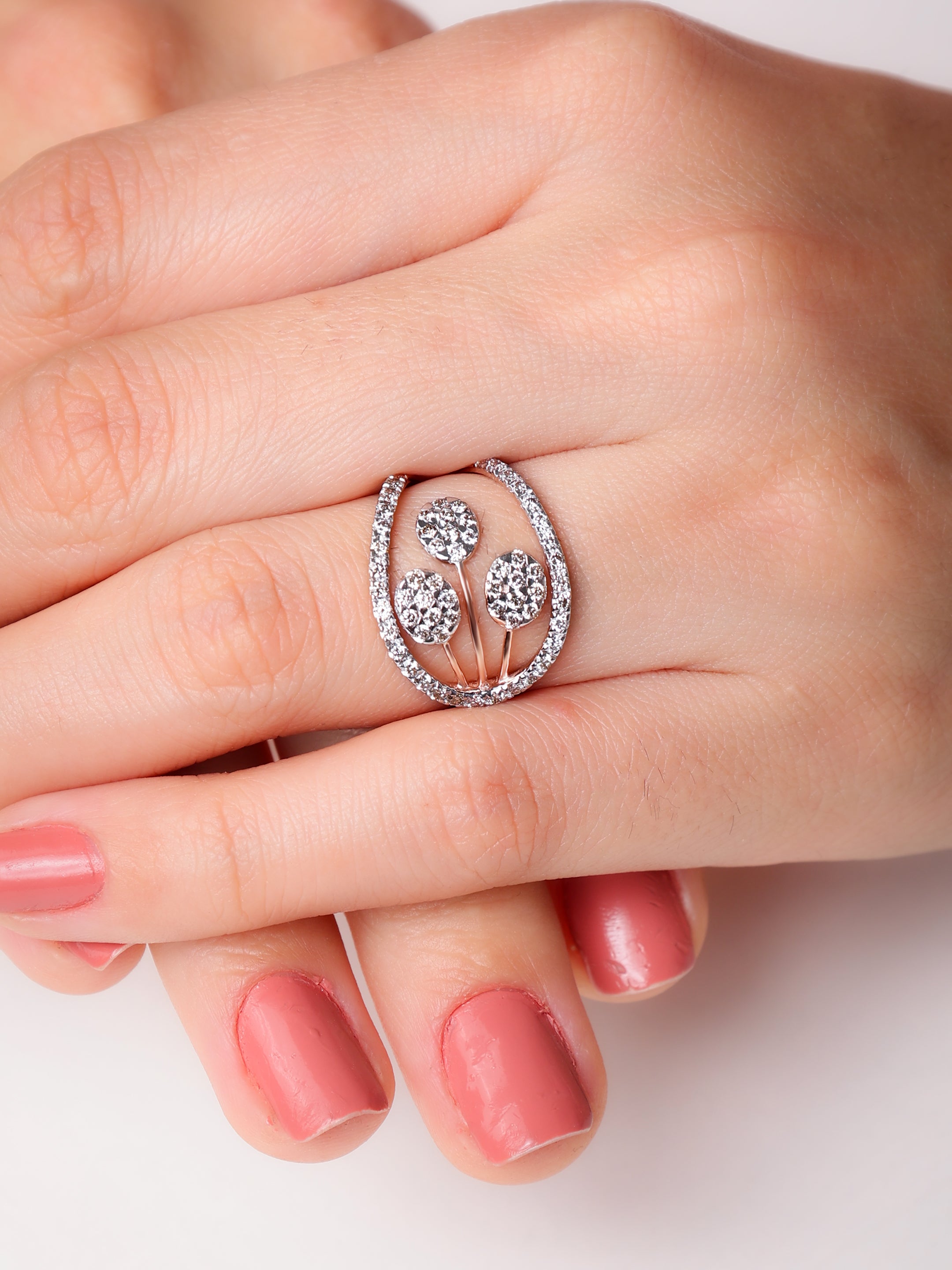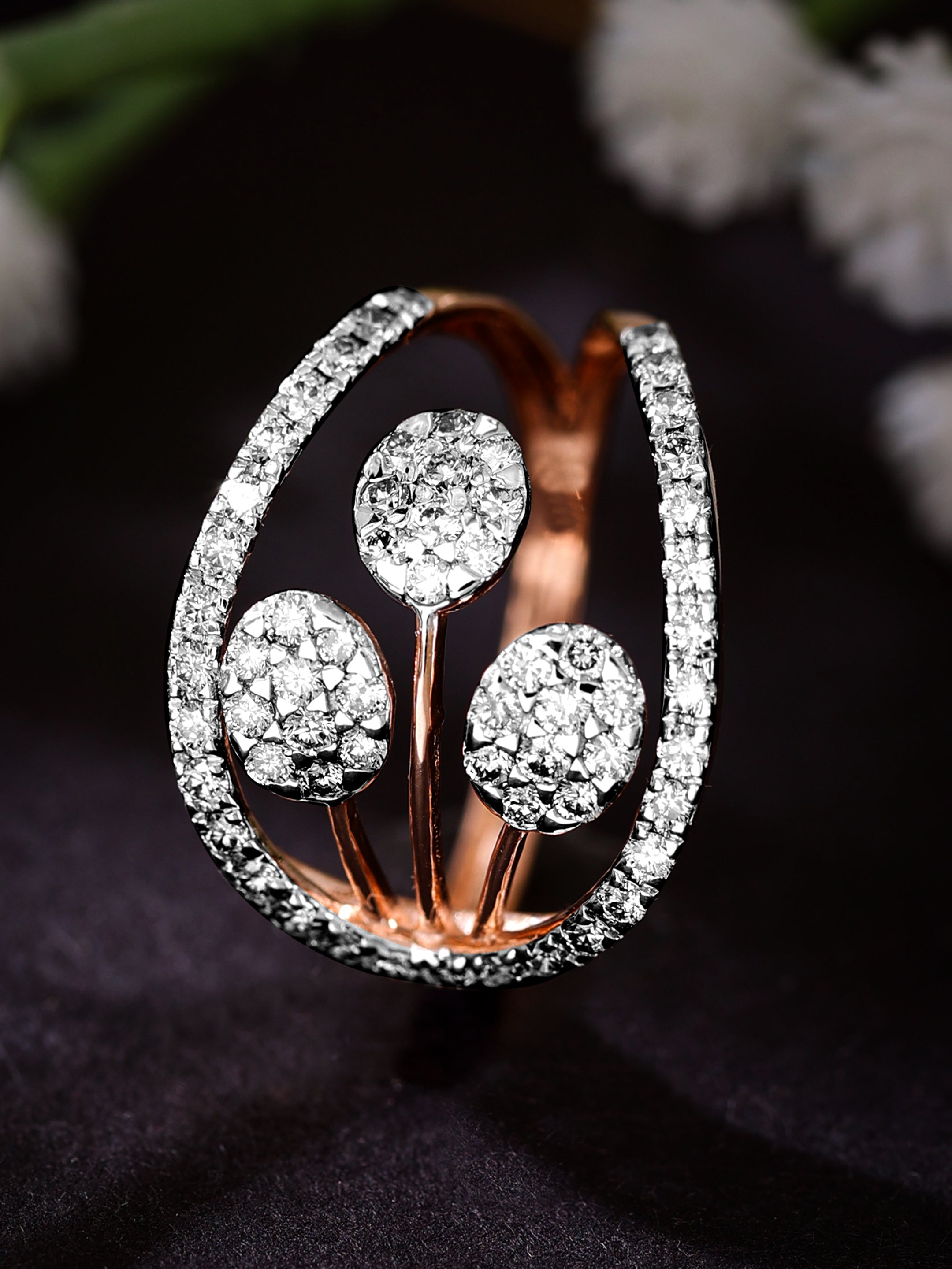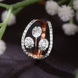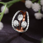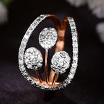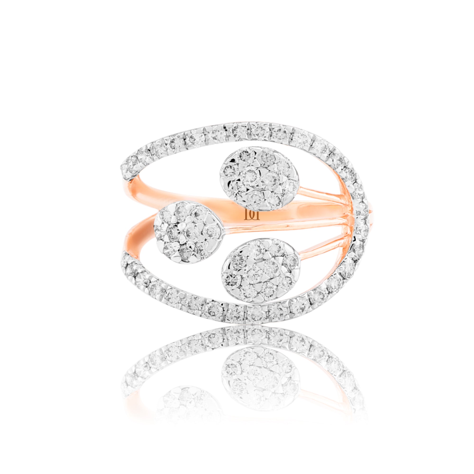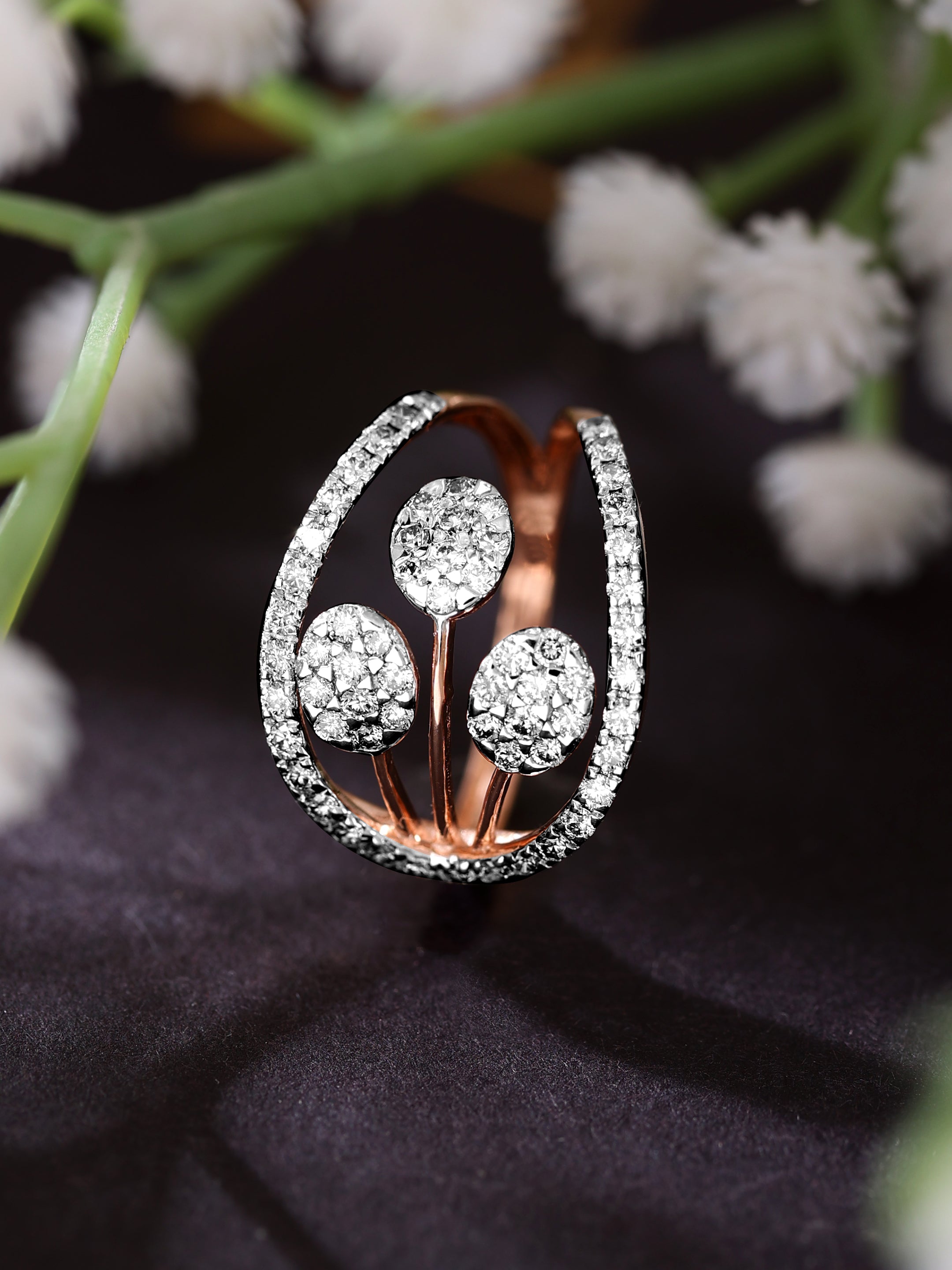 Experience the dazzling allure of the Triple Radiance Diamond Ring, featuring three brilliant clusters of diamonds set against a stunning rose gold band.This exquisite ring features a unique design with sparkling clusters of diamonds orbiting around an elegant rose gold band, creating a celestial halo effect. This unique design highlights the beauty of tri-fold symmetry, making it a perfect statement piece for those who love to shine. Embrace the triple brilliance and timeless sophistication of this exquisite ring, a true symbol of radiant elegance and style.