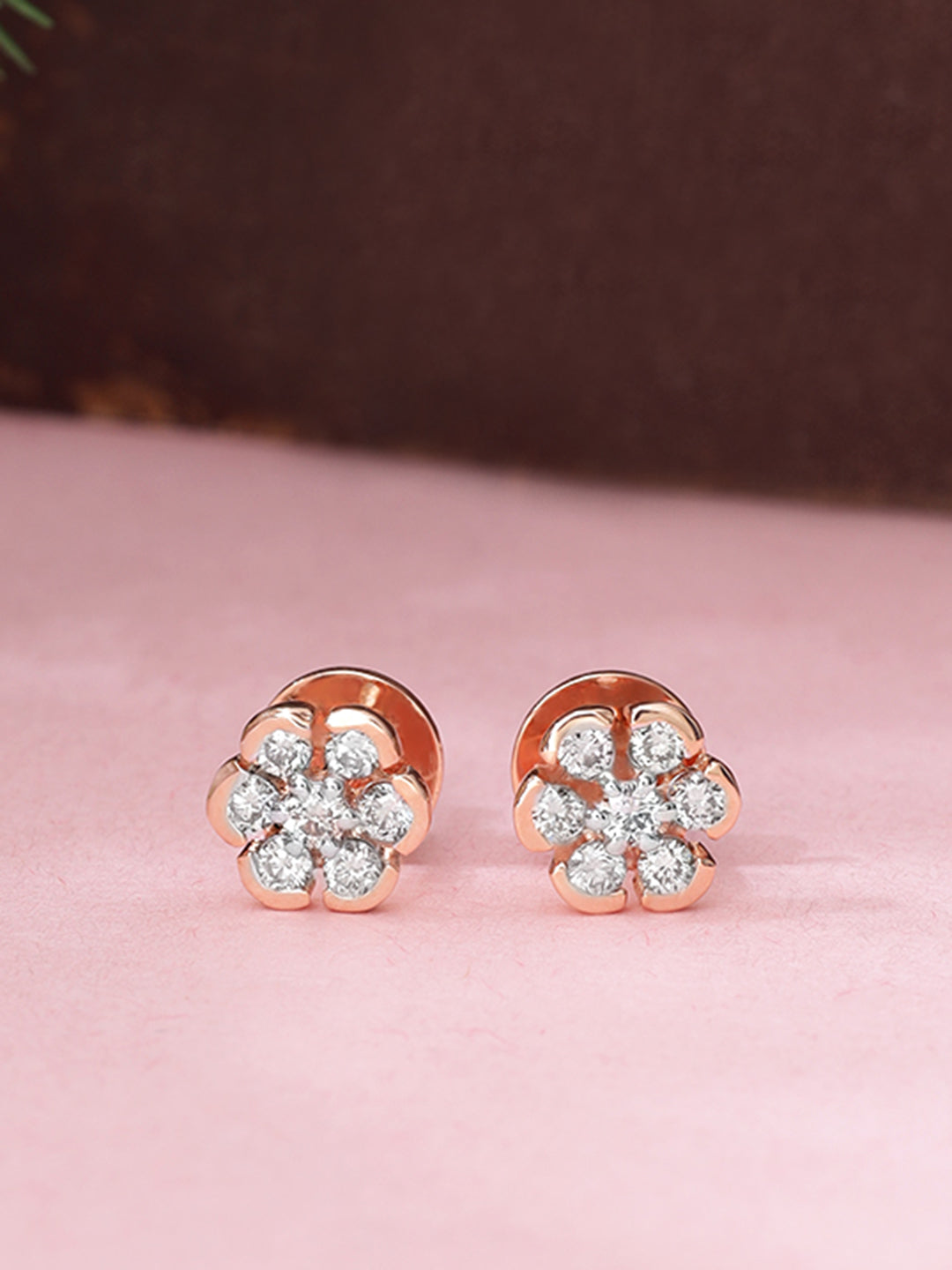 Presenting the Hexad Petals Golden Starburst Diamond Studs, an exquisite pair of earrings that blend timeless elegance with a touch of celestial magic. Each earring showcases a stunning cluster of diamonds meticulously set in a starburst pattern, radiating brilliance from every angle. The diamonds are encased in a warm rose gold setting, creating a harmonious balance between the cool sparkle of the stones and the rich glow of the gold. These earrings are designed to capture the essence of sophistication and luxury, making them an ideal accessory for any occasion. Whether worn to enhance a formal ensemble or to add a touch of glamour to a casual outfit, the Golden Starburst Studs are sure to make a lasting impression.