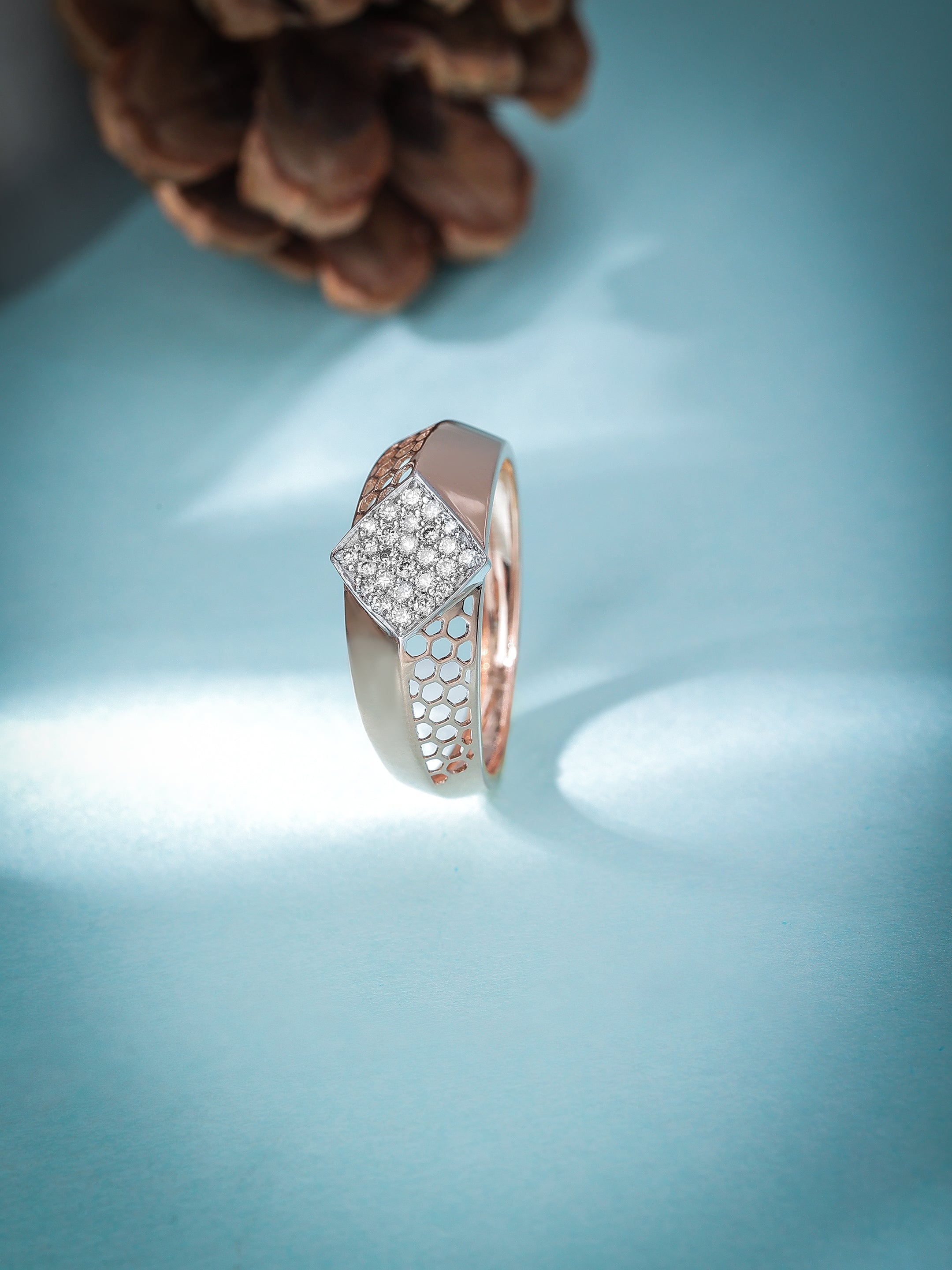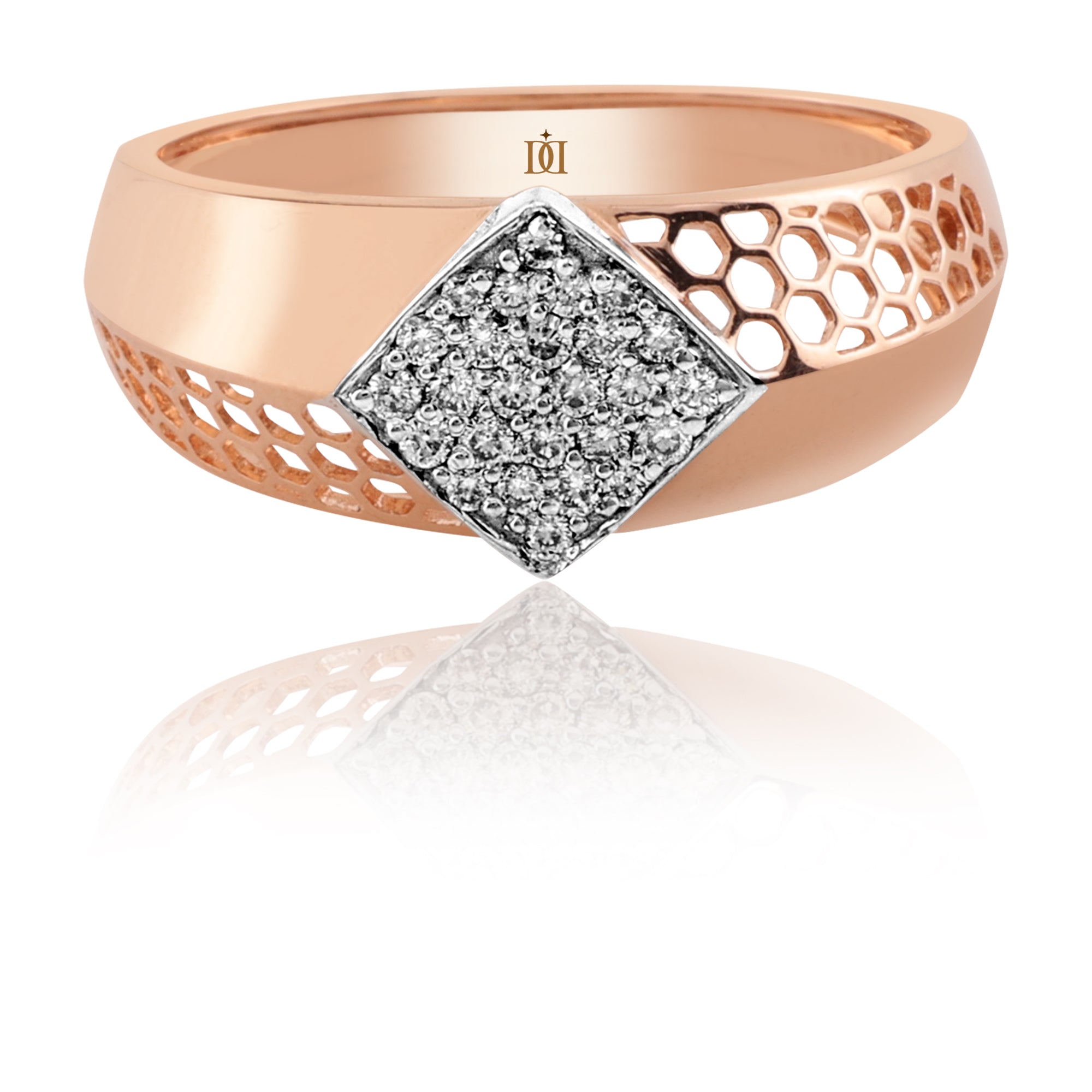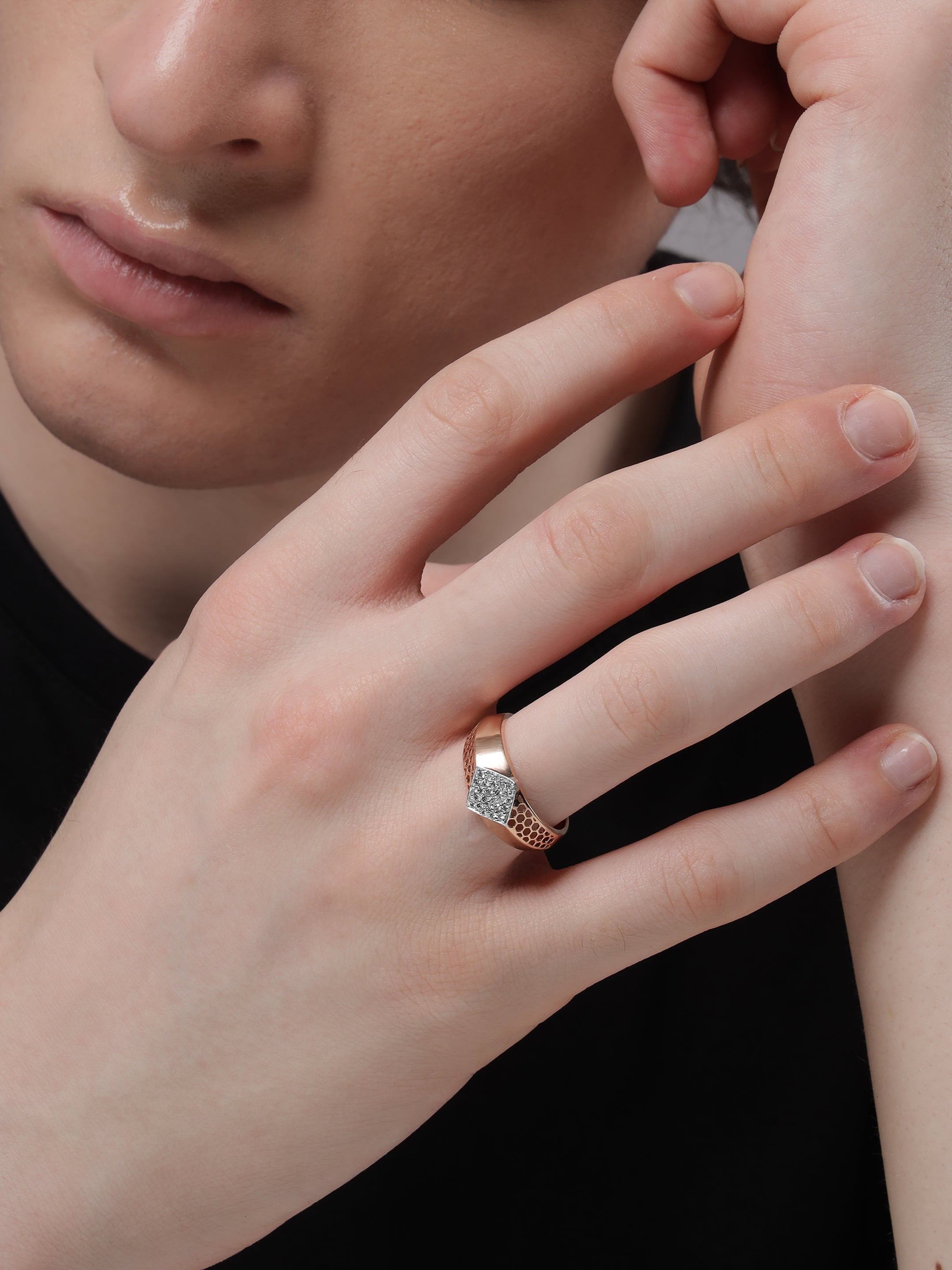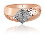 The Hexagonal Mesh Men's Diamond Ring is a masterpiece of geometric elegance, featuring a prominent diamond-shaped cluster of round-cut diamonds at its center. The boldness of the diamond shape is perfectly complemented by the intricate mesh-like pattern of hexagonal holes that adorn one side of the band. This textured pattern contrasts beautifully with the smooth, polished rose gold surface on the opposite side, creating a harmonious blend of rugged and refined elements. The design speaks to a man who values both precision and uniqueness, making this ring a striking statement piece.