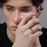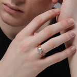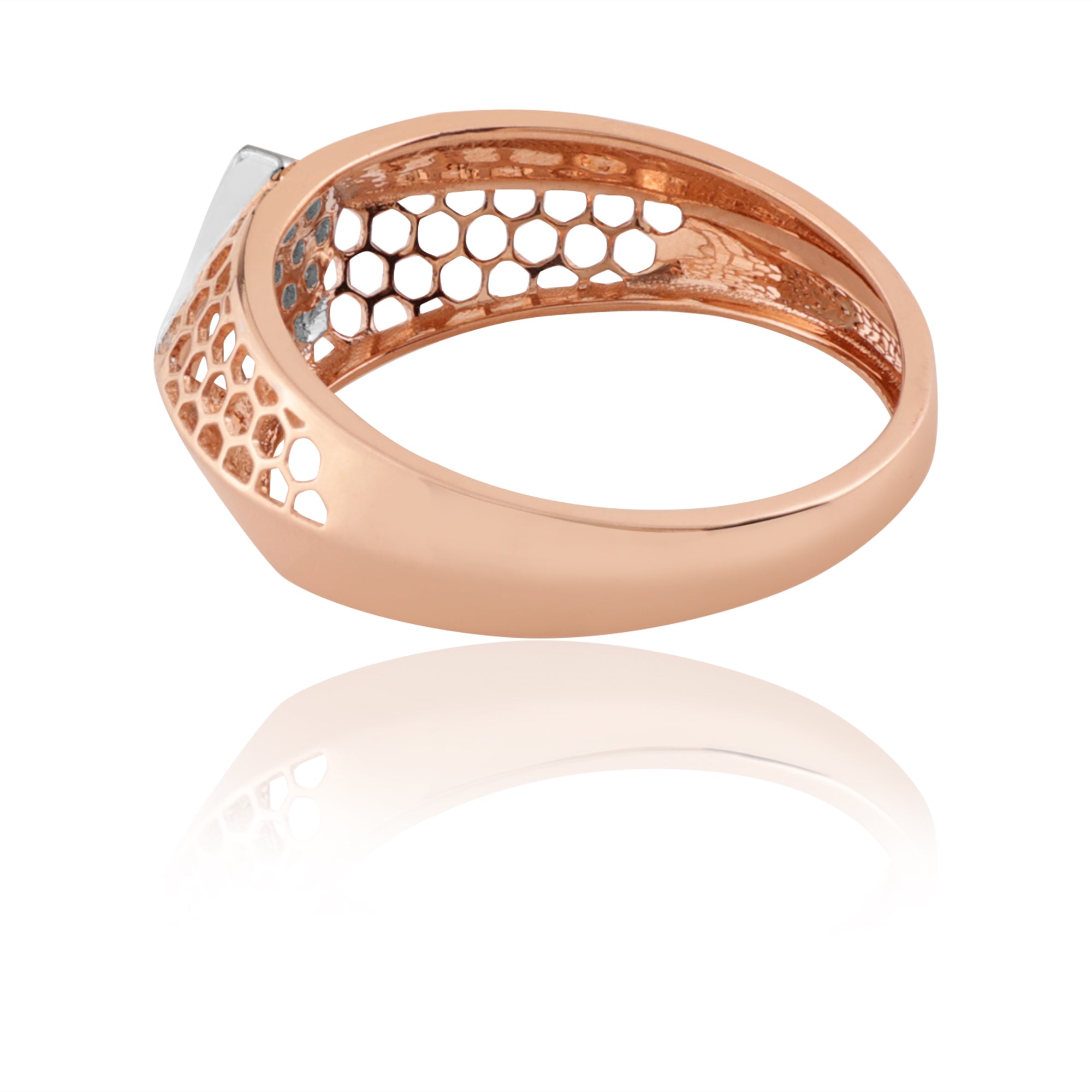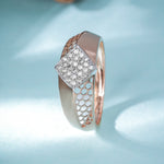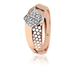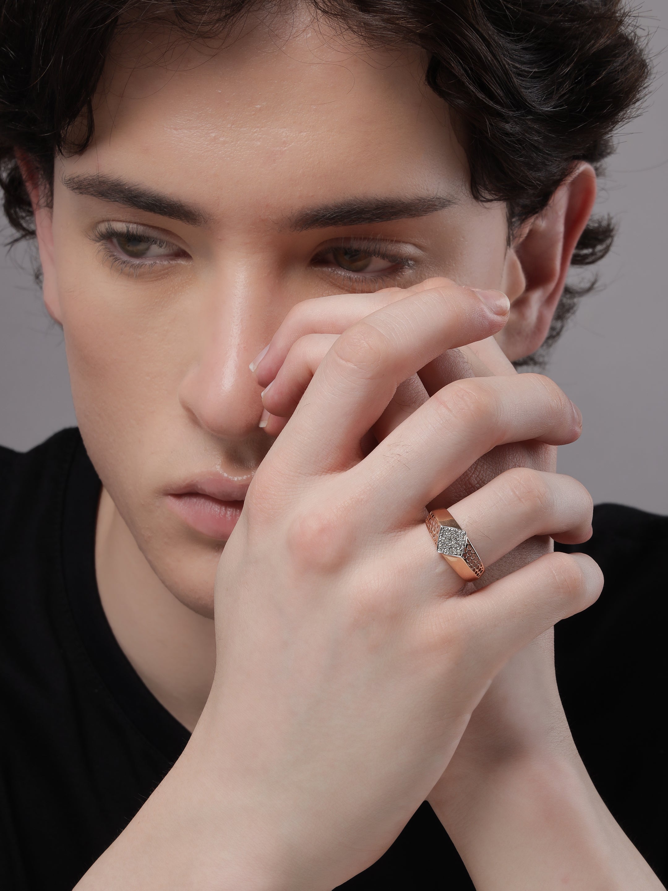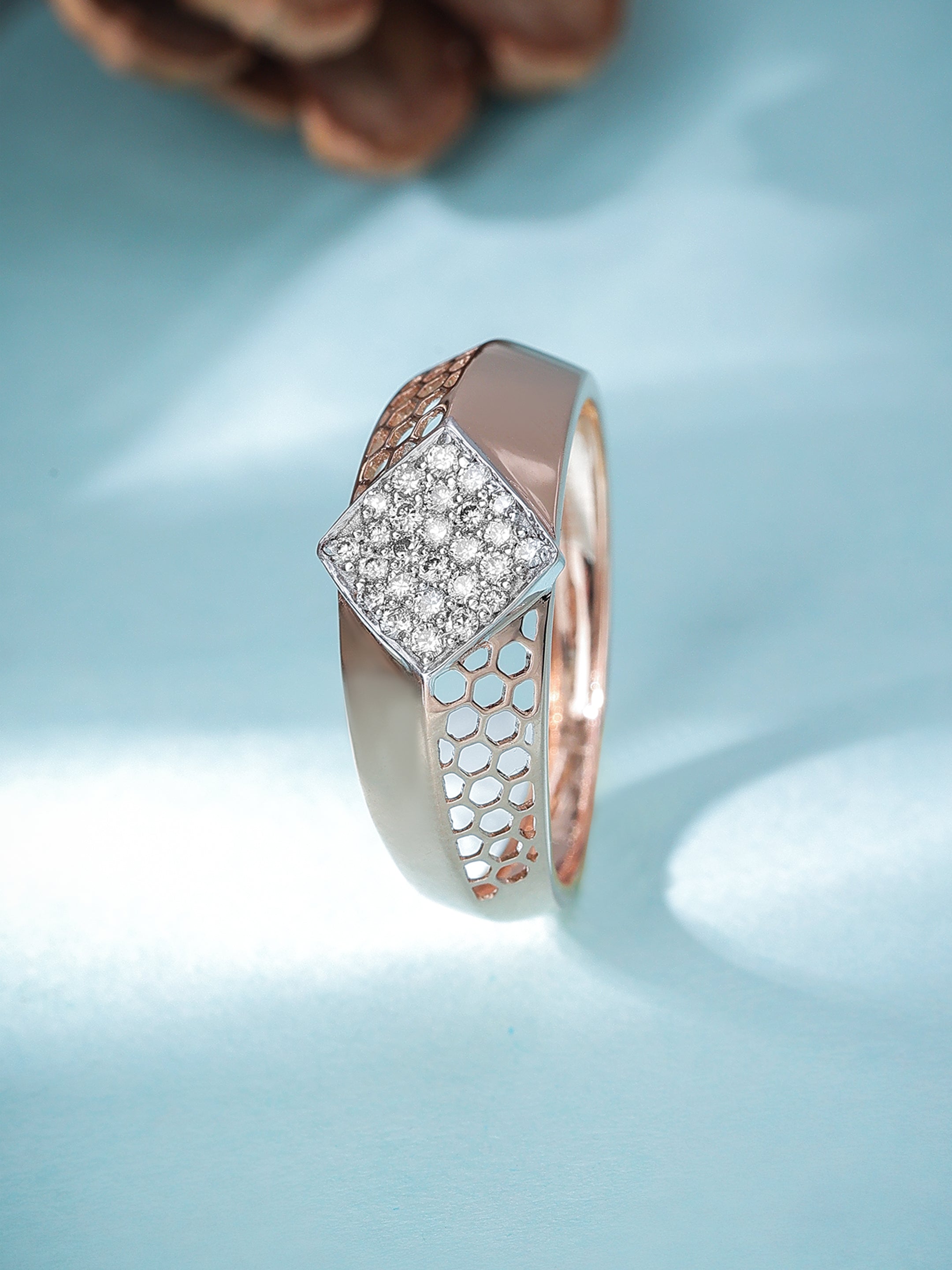The Hexagonal Mesh Men's Diamond Ring is a masterpiece of geometric elegance, featuring a prominent diamond-shaped cluster of round-cut diamonds at its center. The boldness of the diamond shape is perfectly complemented by the intricate mesh-like pattern of hexagonal holes that adorn one side of the band. This textured pattern contrasts beautifully with the smooth, polished rose gold surface on the opposite side, creating a harmonious blend of rugged and refined elements. The design speaks to a man who values both precision and uniqueness, making this ring a striking statement piece.