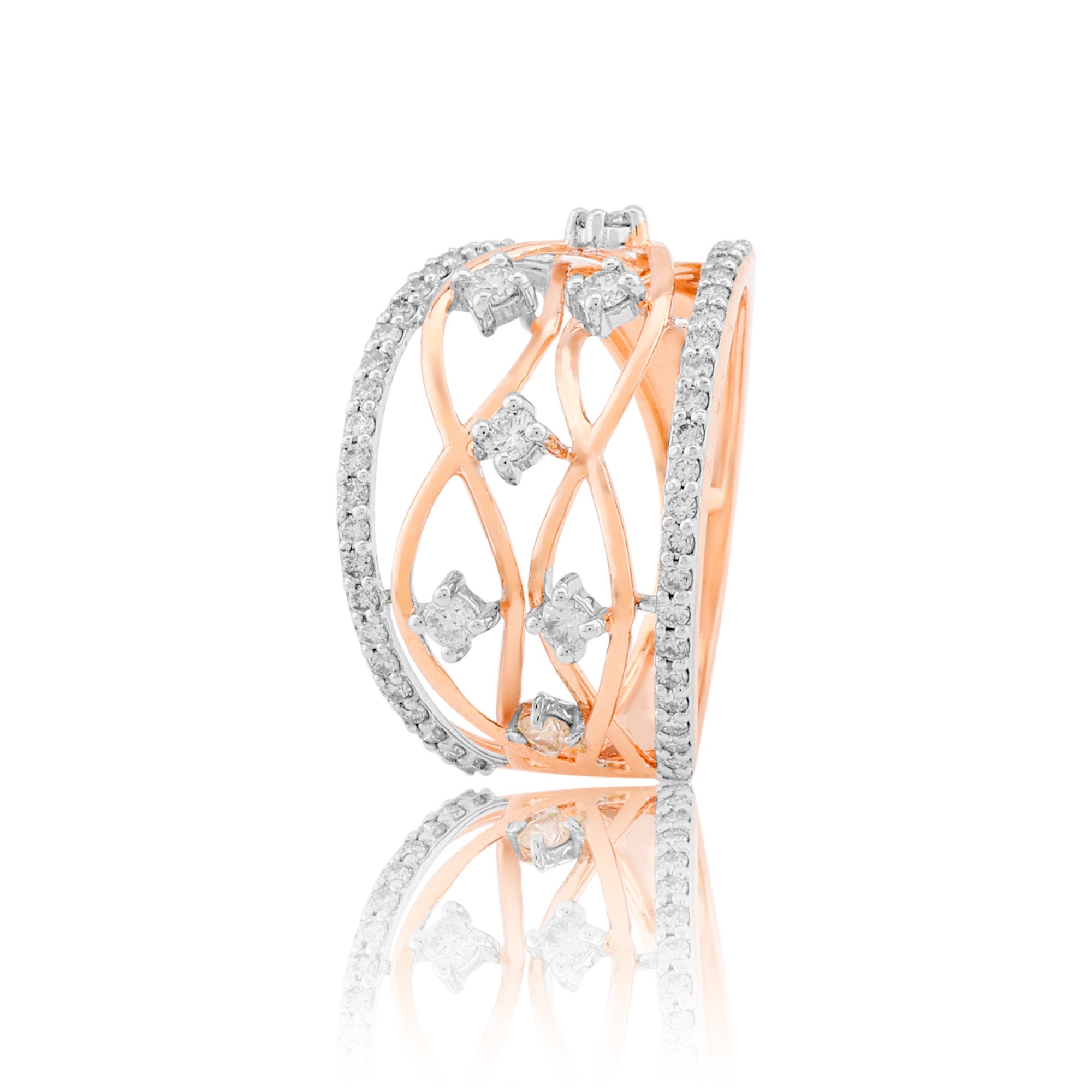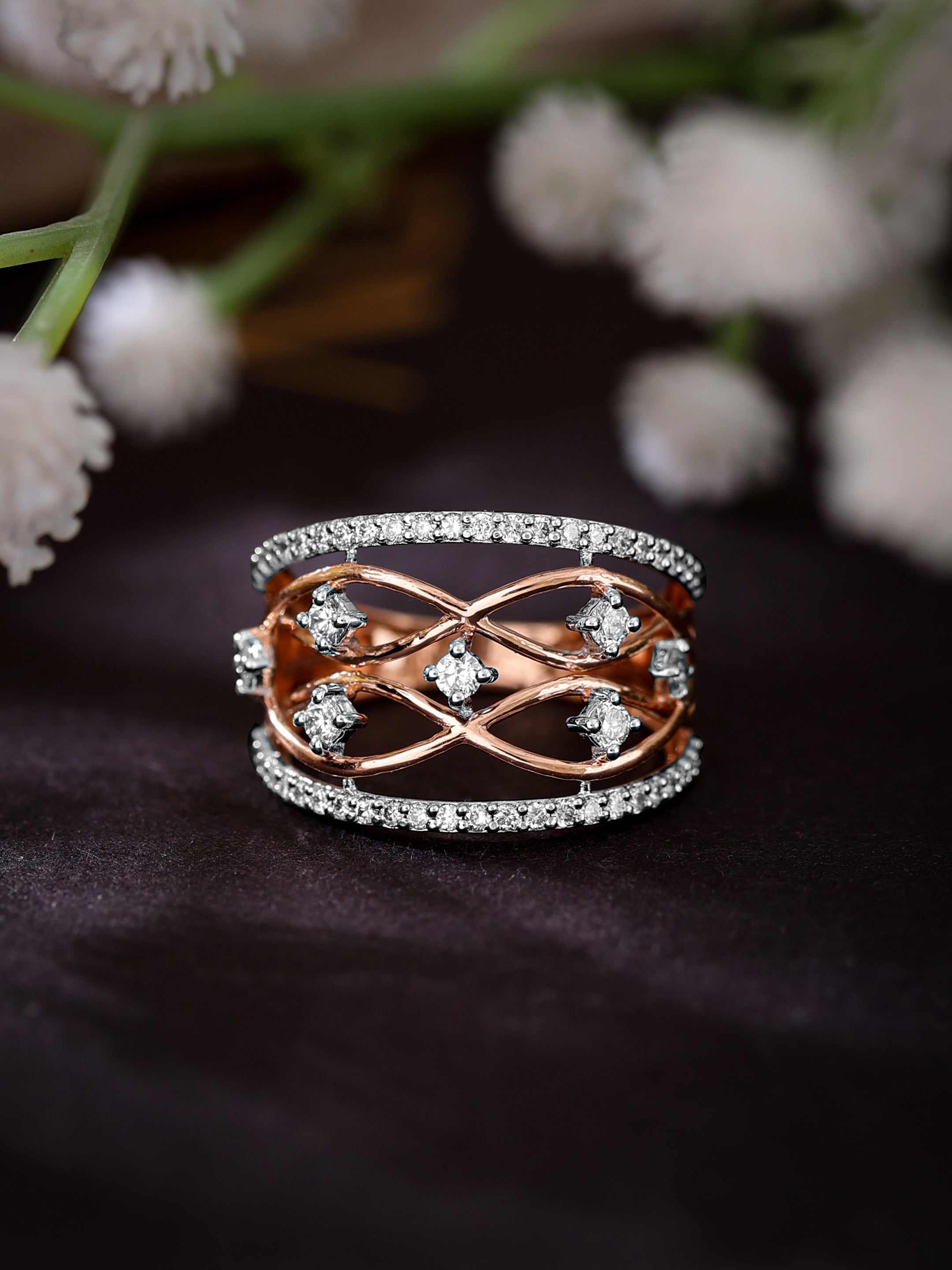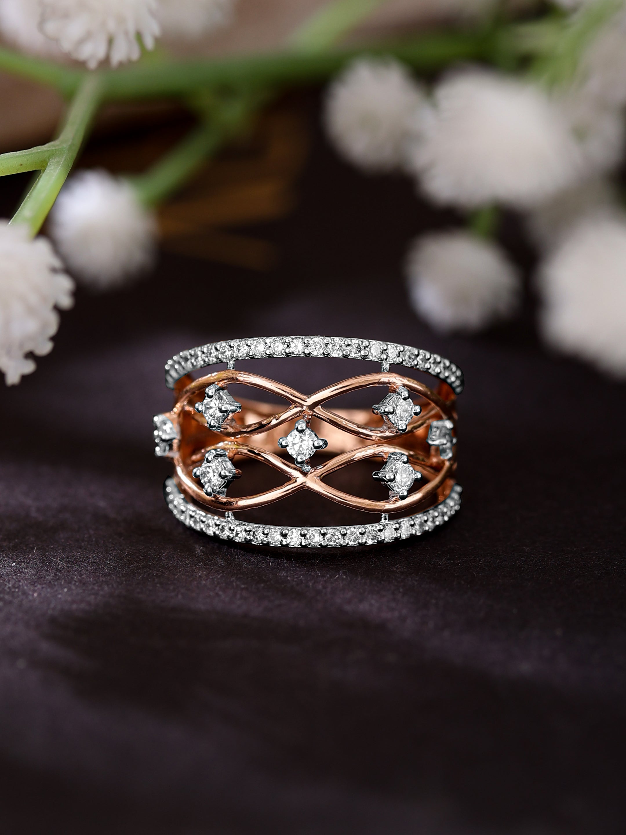 The Interlace Elysium Cut-out Diamond Ring is a mesmerizing blend of modern elegance and timeless beauty. This exquisite piece features a delicate lattice design crafted in luxurious rose gold, creating an intricate pattern of interwoven bands that encircle the finger. Accentuating the design are six brilliantly cut diamonds, each set in a charming floral motif, adding a touch of celestial sparkle. The ring is further enhanced by pavé-set diamonds along the top and bottom edges, offering a continuous shimmer that catches the light from every angle. Perfect for any occasion, this ring combines sophistication with a radiant allure, making it a standout addition to any jewelry collection.