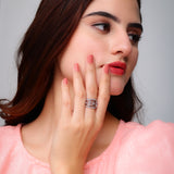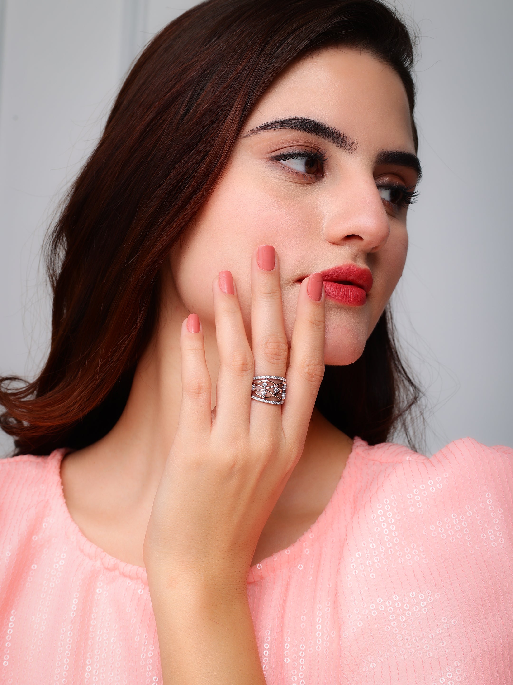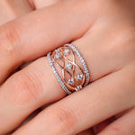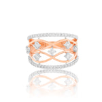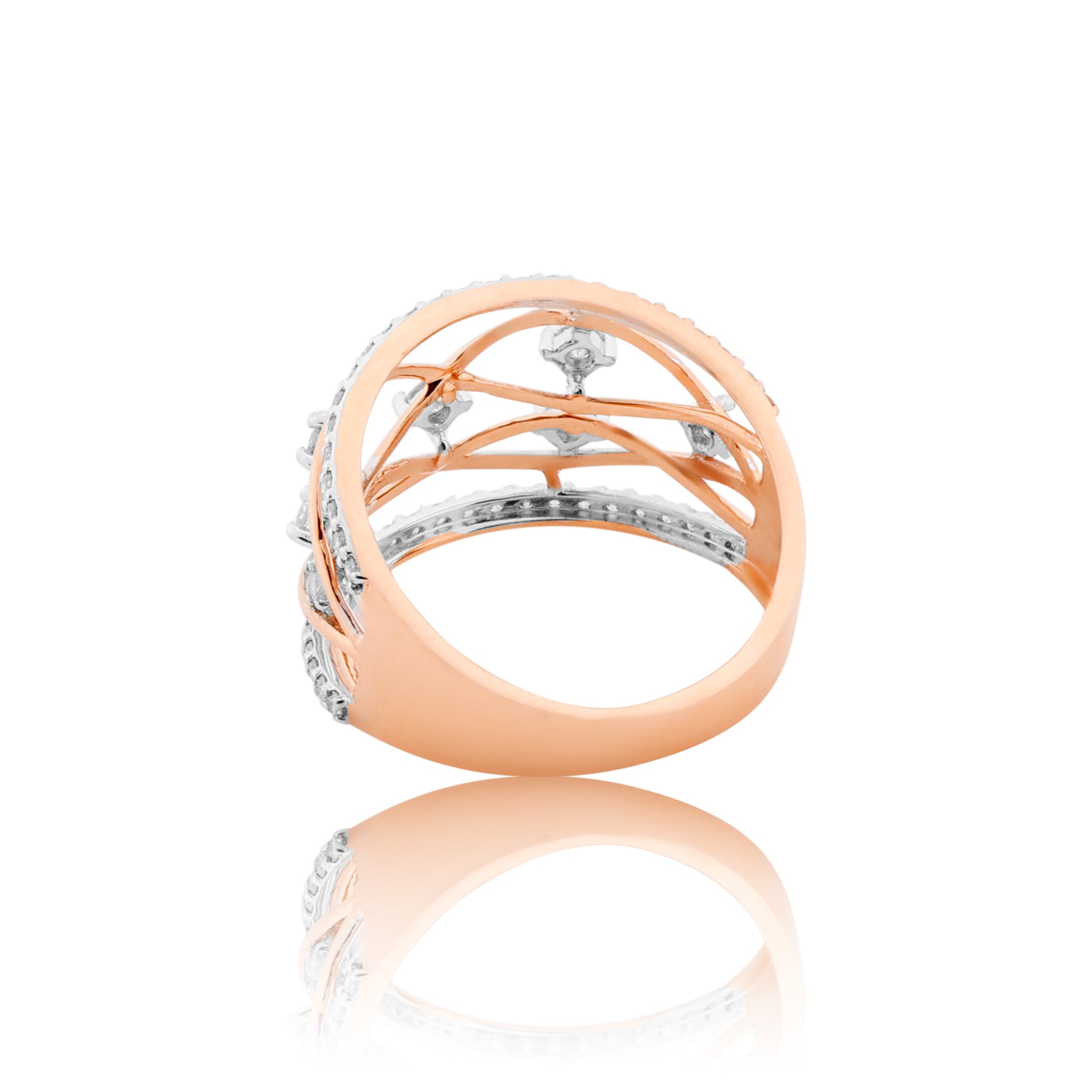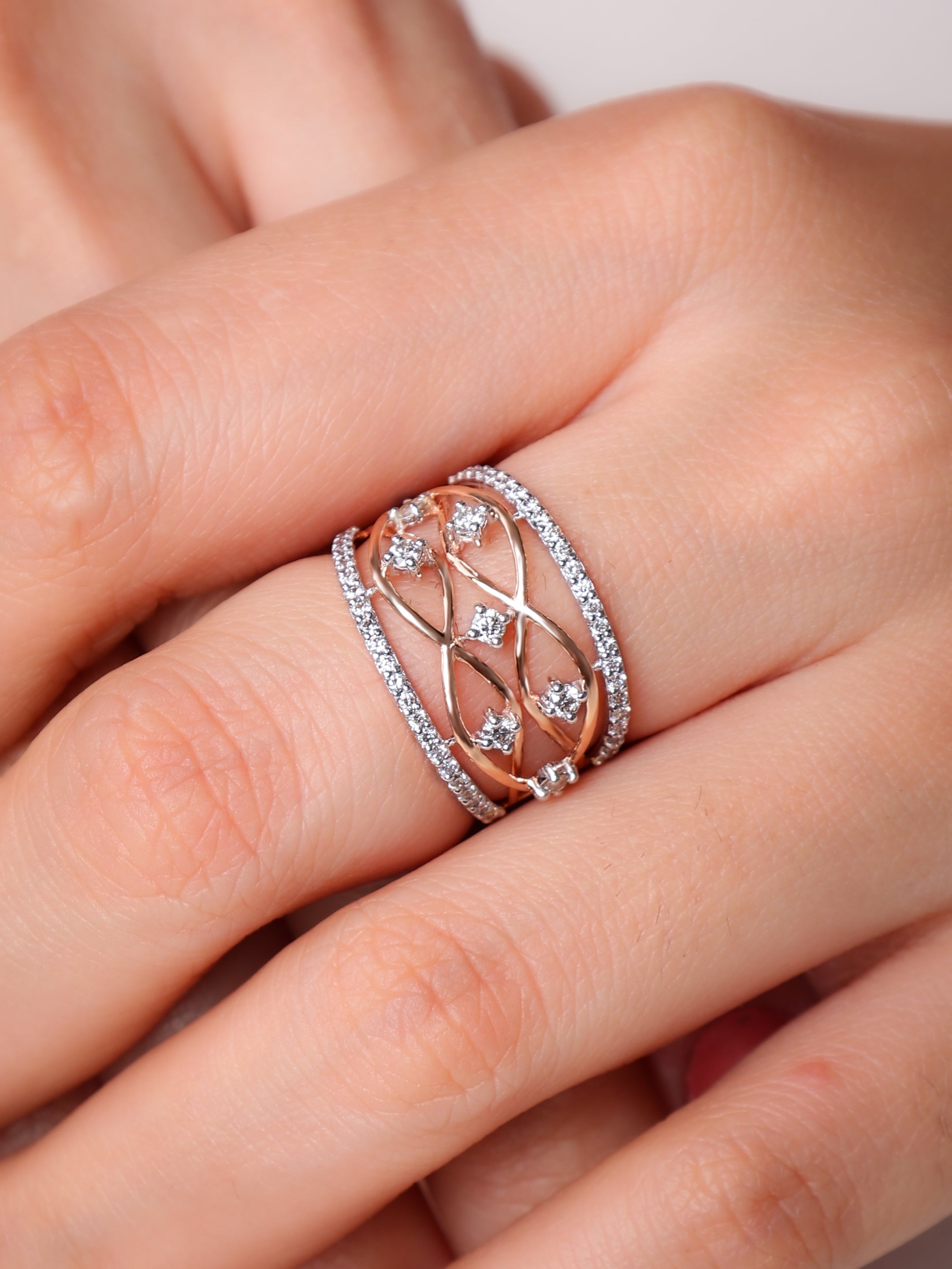 The Interlace Elysium Cut-out Diamond Ring is a mesmerizing blend of modern elegance and timeless beauty. This exquisite piece features a delicate lattice design crafted in luxurious rose gold, creating an intricate pattern of interwoven bands that encircle the finger. Accentuating the design are six brilliantly cut diamonds, each set in a charming floral motif, adding a touch of celestial sparkle. The ring is further enhanced by pavé-set diamonds along the top and bottom edges, offering a continuous shimmer that catches the light from every angle. Perfect for any occasion, this ring combines sophistication with a radiant allure, making it a standout addition to any jewelry collection.