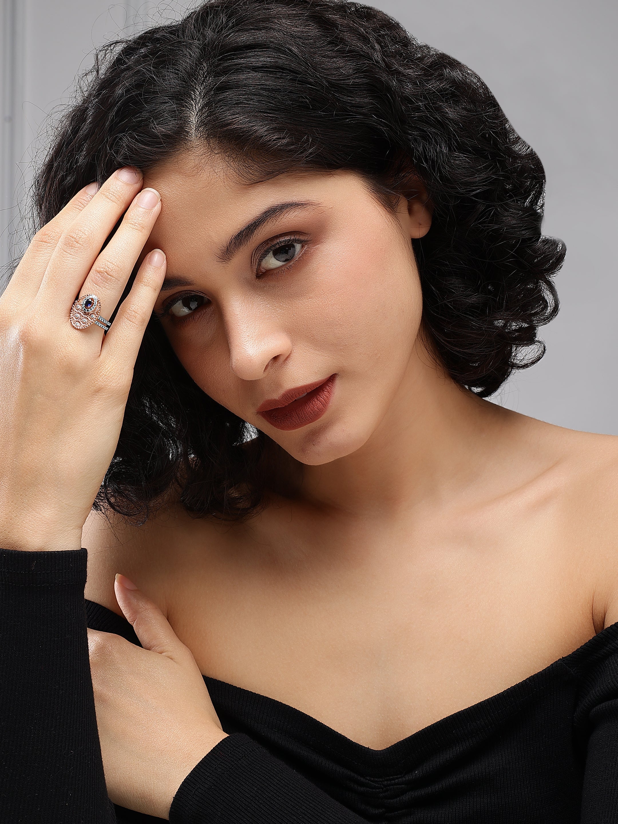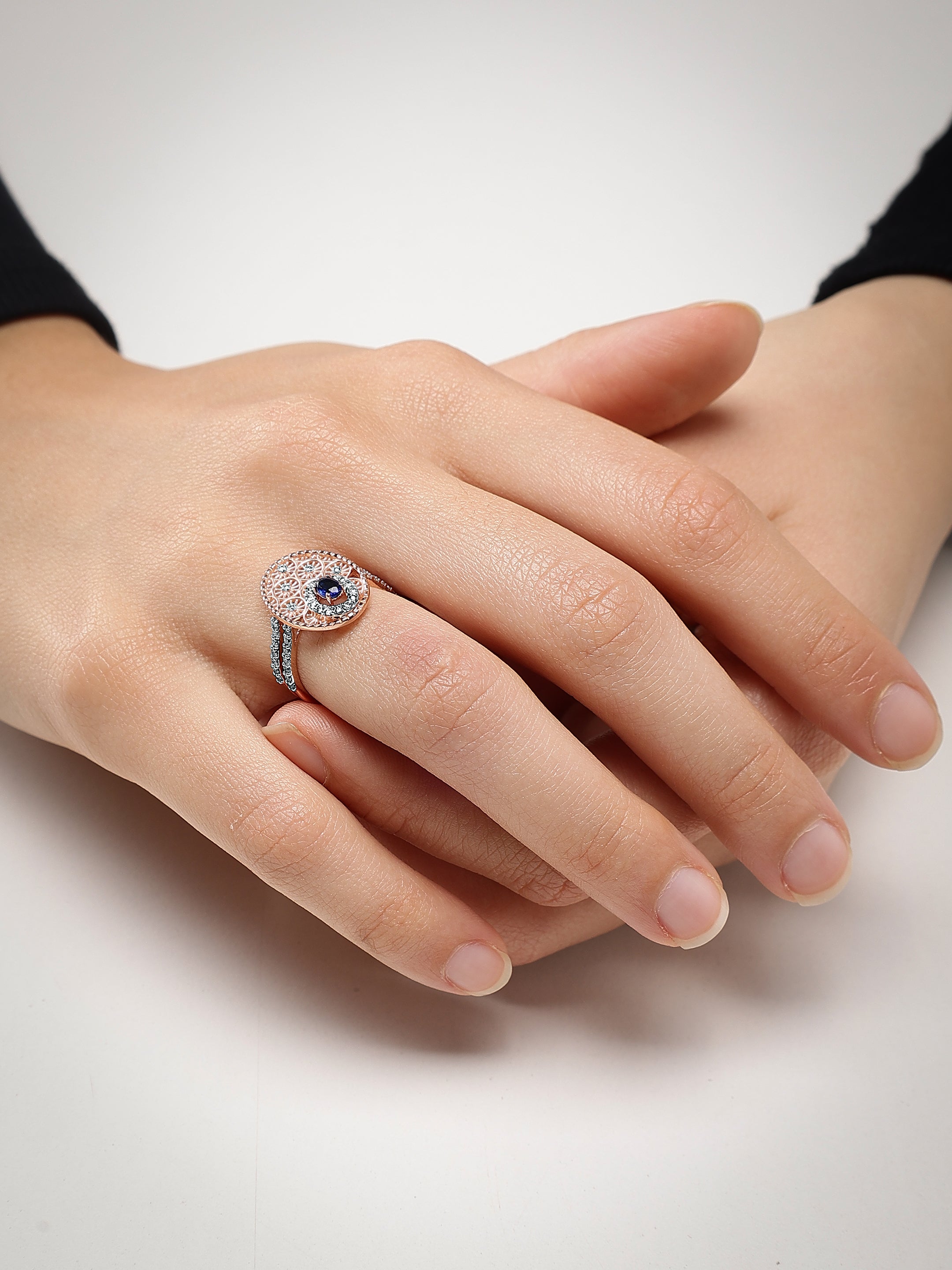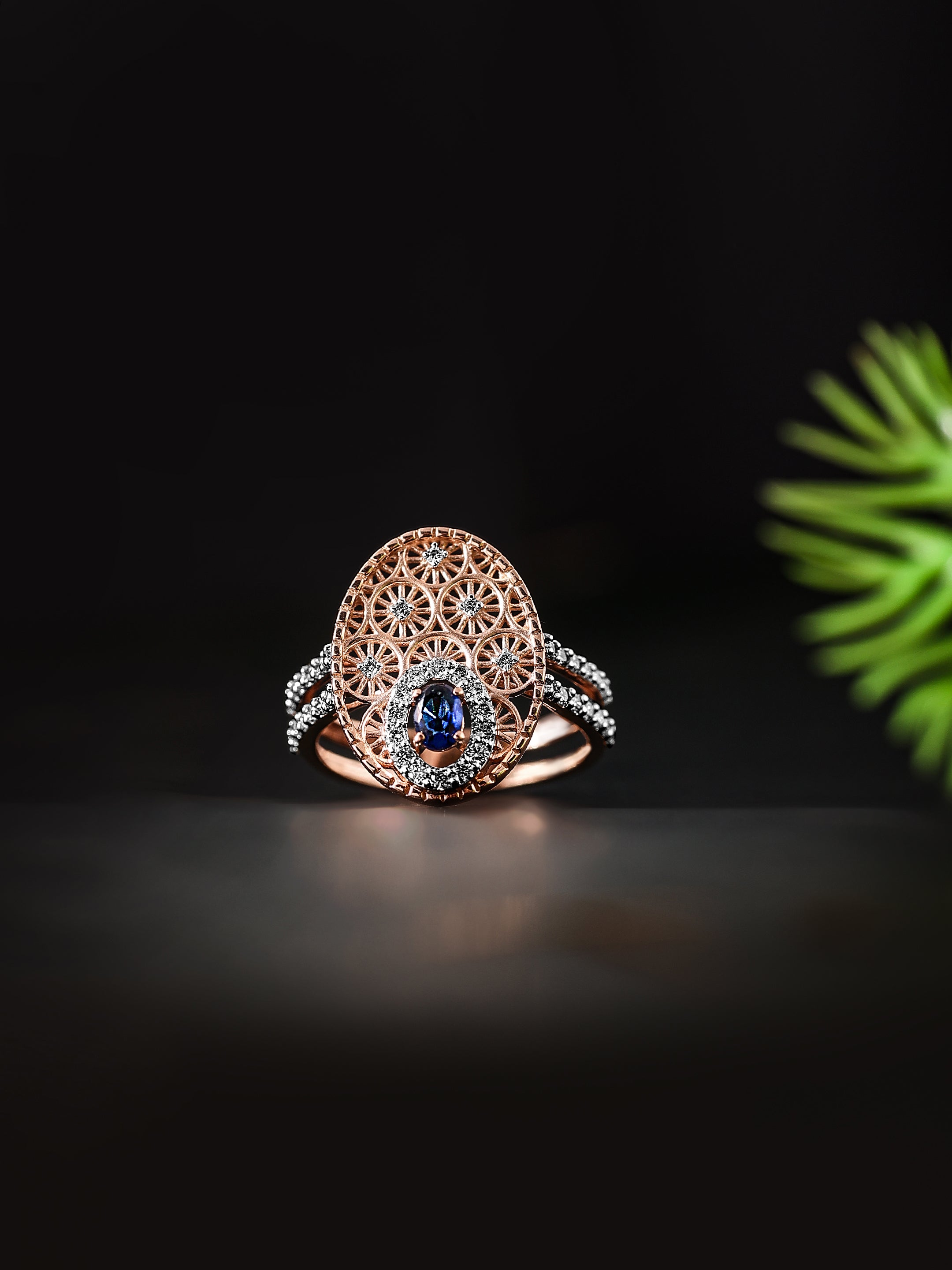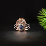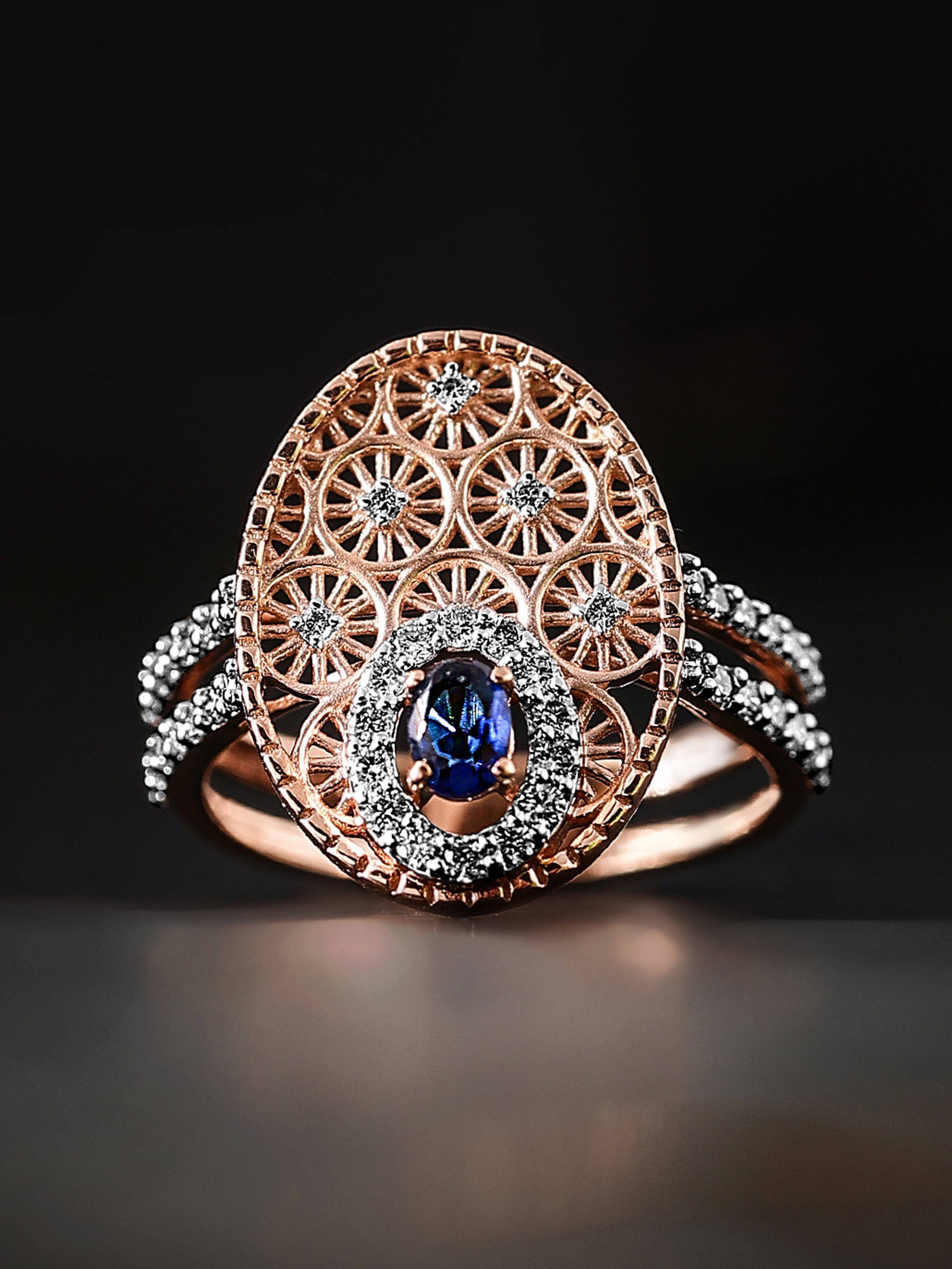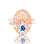 This exquisite ring features a captivating combination of rose gold and sparkling diamonds, creating a luxurious and timeless piece of jewelry. The central focal point is an oval-cut sapphire, framed by a halo of brilliant diamonds. The intricate filigree work in rose gold showcases a delicate, lace-like pattern adorned with diamond accents, reminiscent of blooming flowers. The band, encrusted with diamonds, adds a touch of elegance and sophistication, making this ring a perfect symbol of refined beauty and grace.