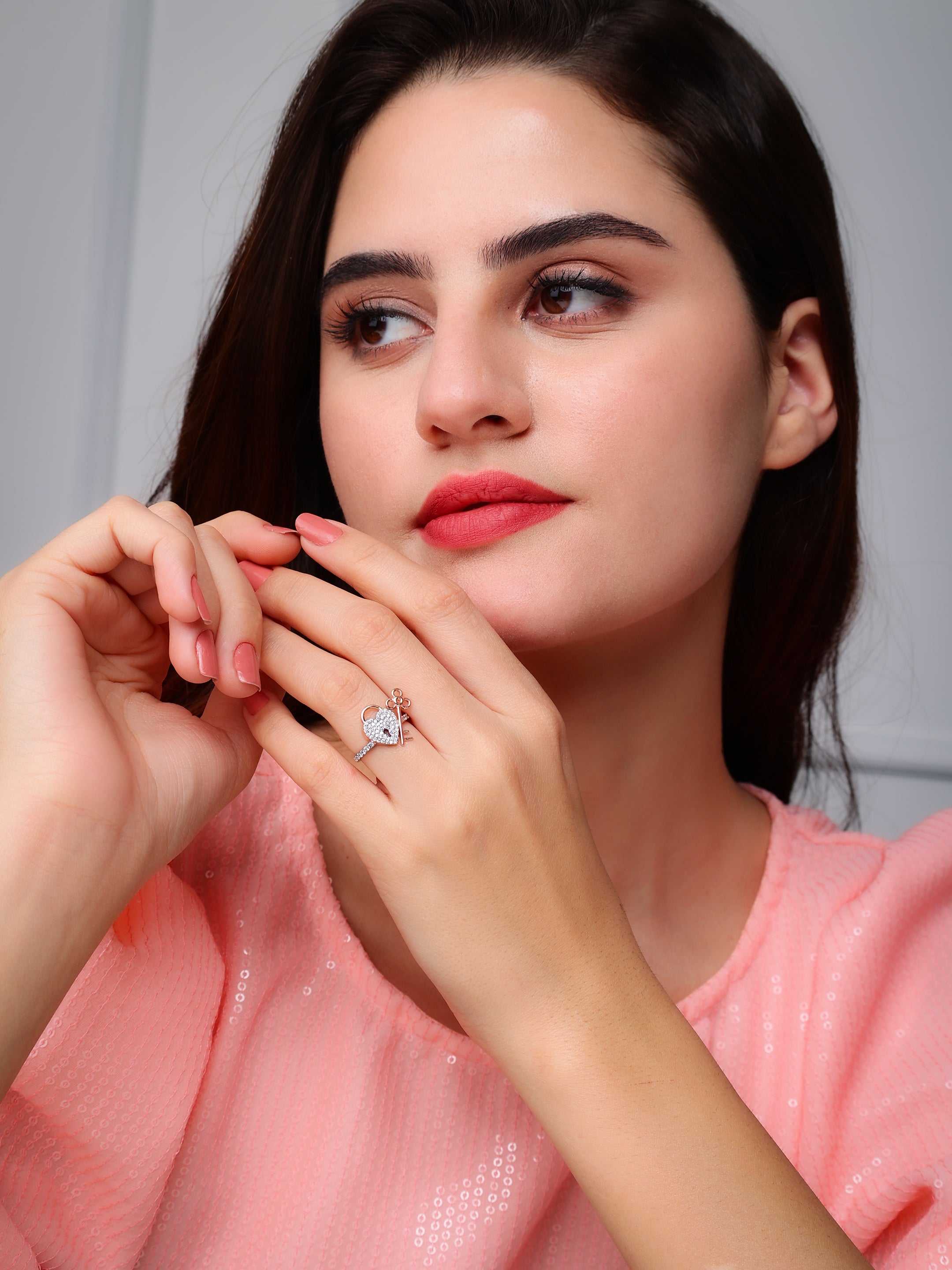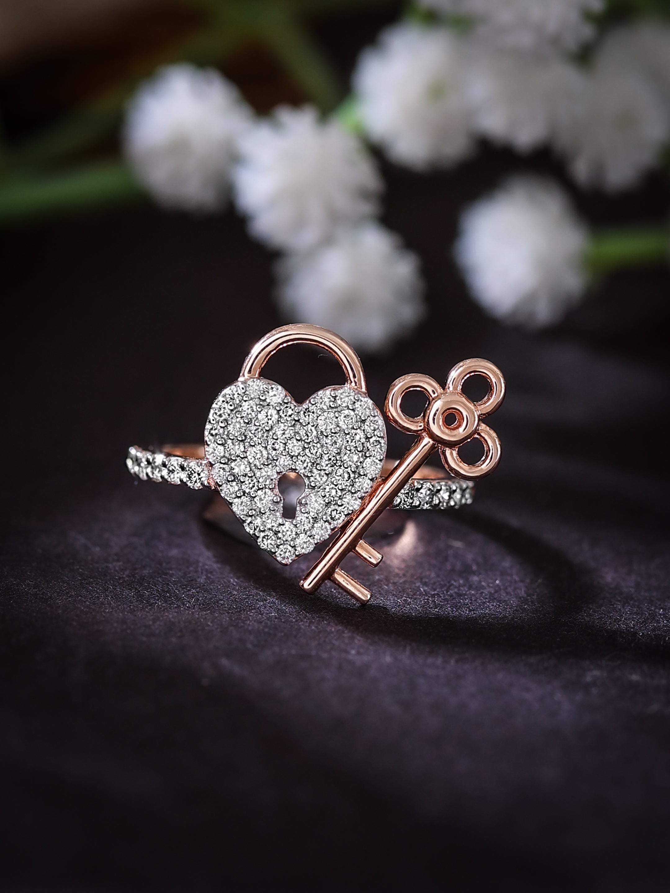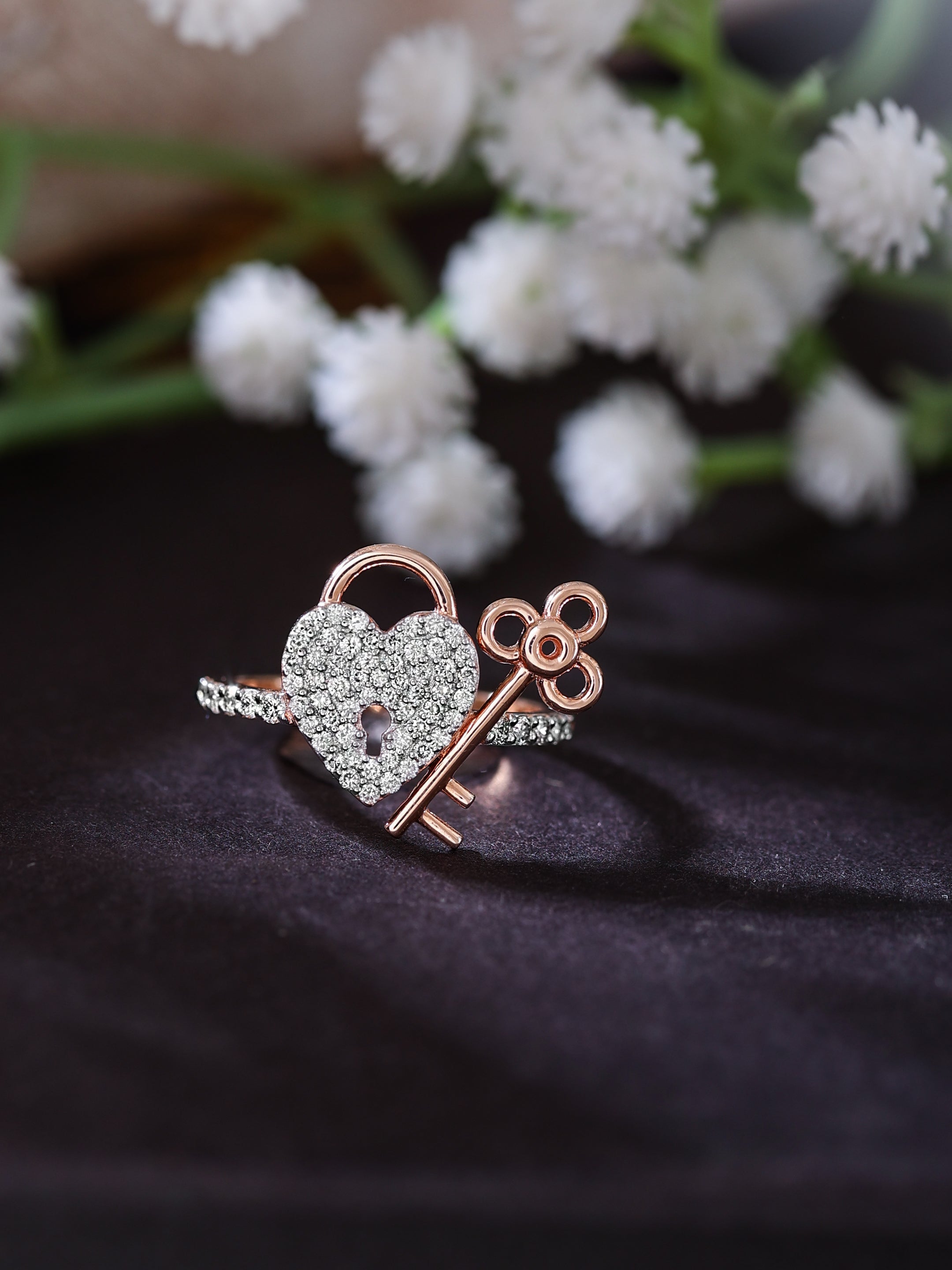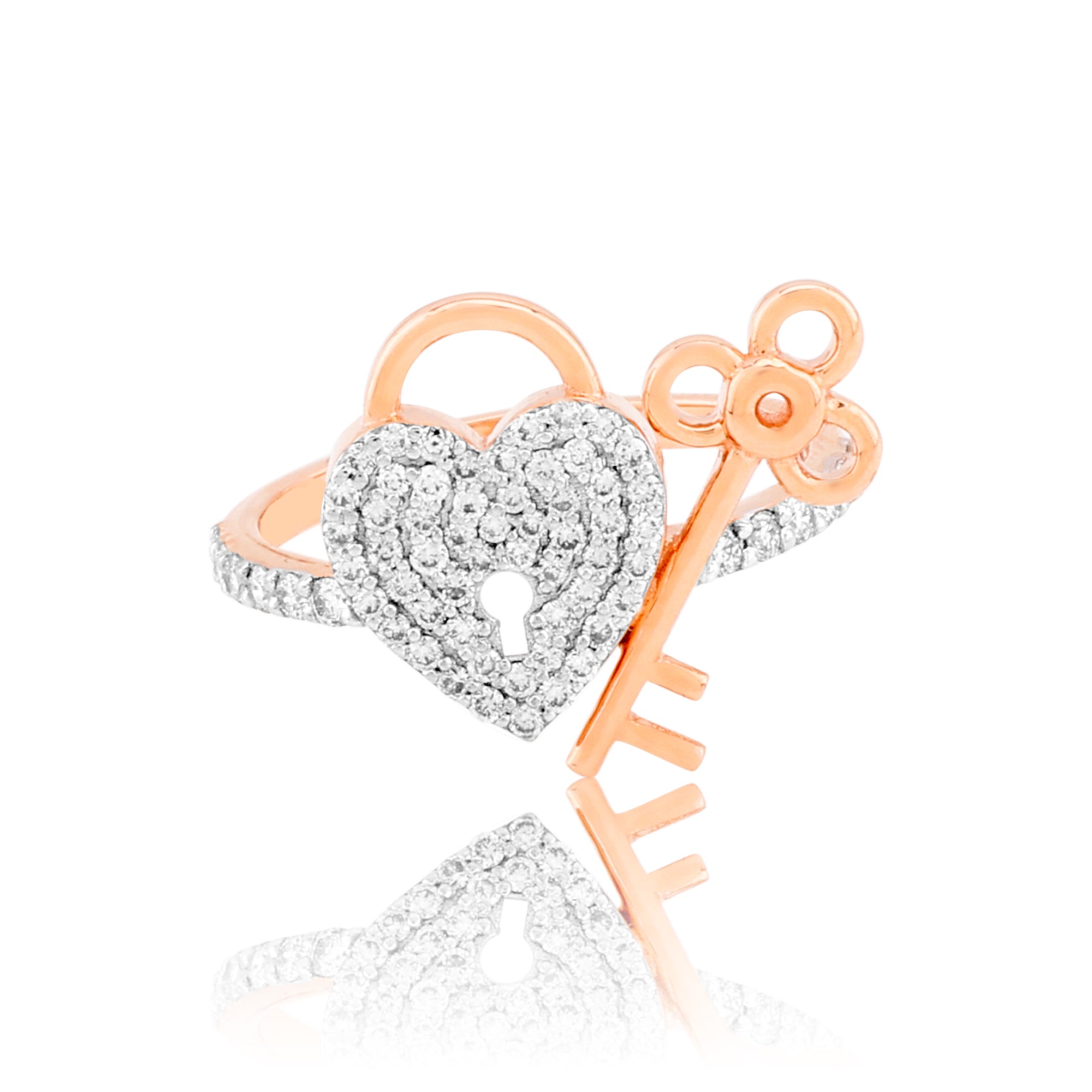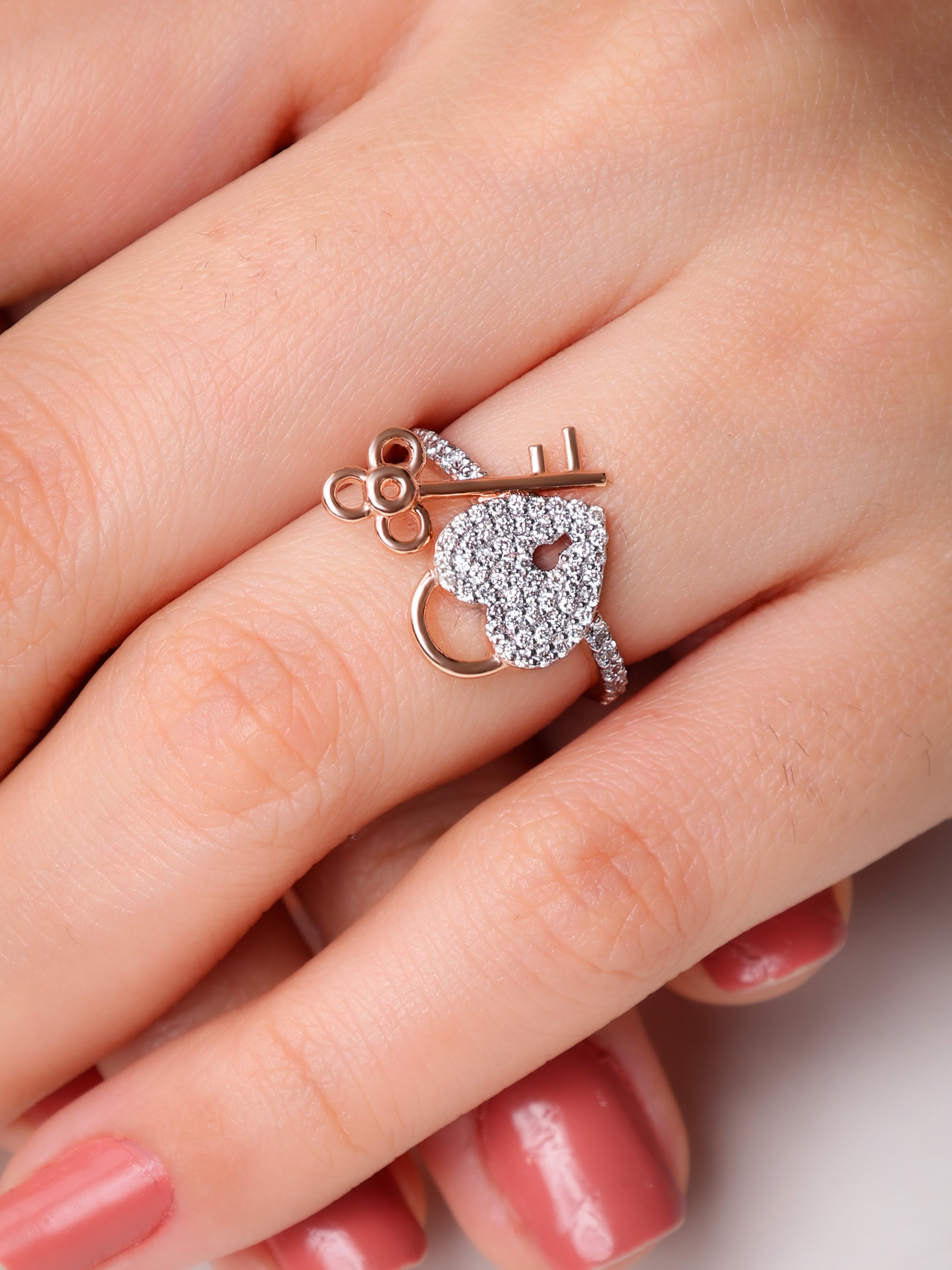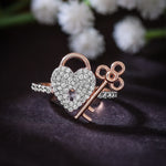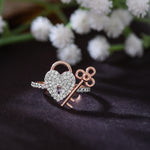The Key to My Heart Ring is an enchanting symbol of love and commitment, intricately crafted to captivate and inspire. This exquisite piece features a dazzling heart-shaped lock adorned with a multitude of brilliant diamonds, each meticulously set in radiant rose gold. The heart lock showcases a delicately carved keyhole, symbolizing the unlocking of true love and cherished secrets. Complementing the heart is an elegant key, also rendered in warm rose gold, with its bow adorned with graceful loops that add a touch of vintage charm. The band of the ring is encrusted with additional diamonds, enhancing the overall sparkle and elegance of the piece. This unique and romantic design makes the Key to My Heart Ring a perfect expression of enduring love and devotion.