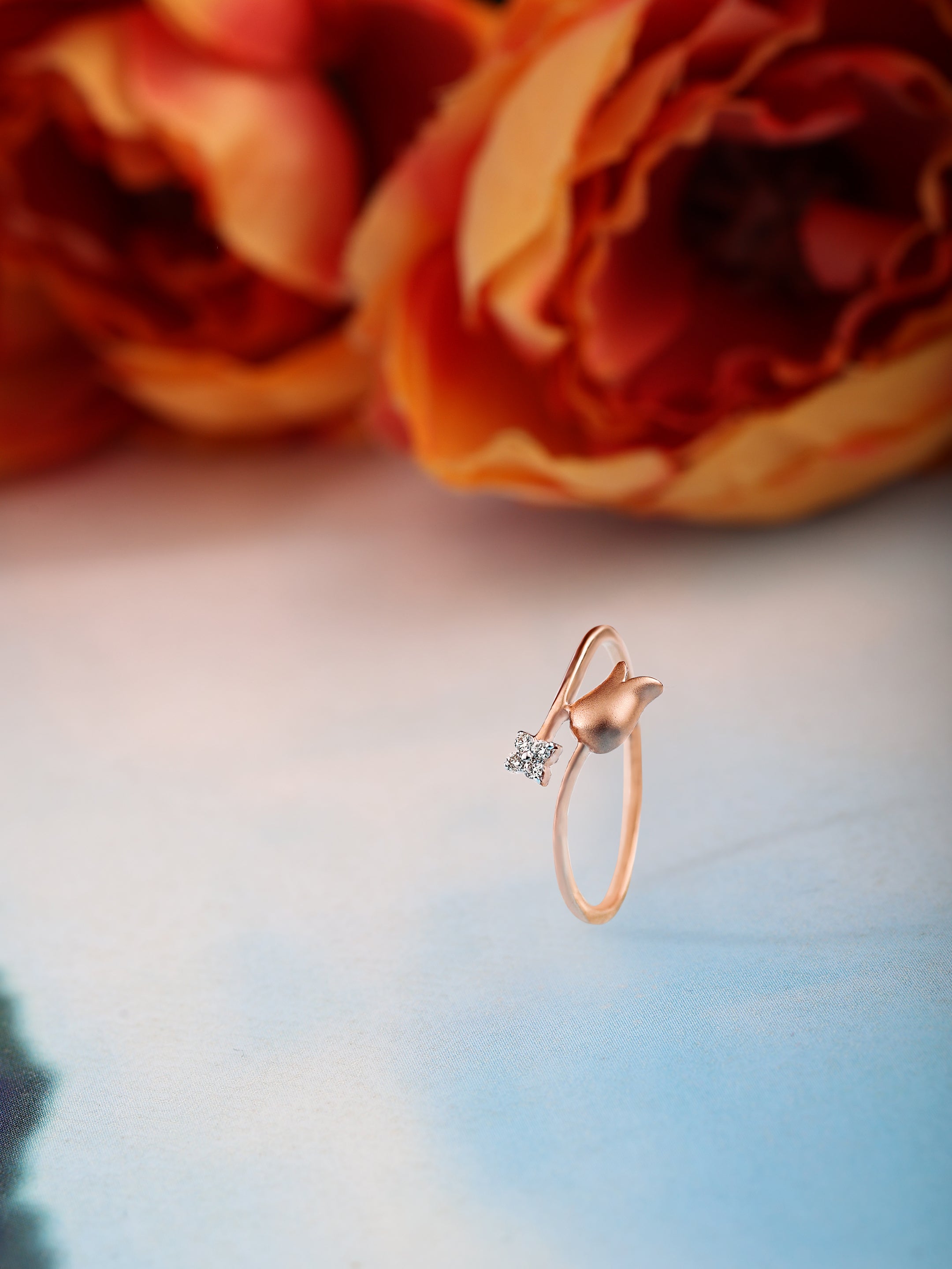 Lotus Blossom Ring, a captivating piece that showcases a graceful lotus flower facing downward, delicately connected to a beautiful four-petal flower adorned with sparkling diamonds. The Lotus Blossom Ring embodies tranquility and elegance. The lotus flower, a symbol of purity and spiritual awakening, gracefully descends while connecting to a smaller flower, representing beauty and growth. The round brilliant diamonds enhance the allure of the design, adding a touch of brilliance and sophistication.