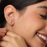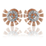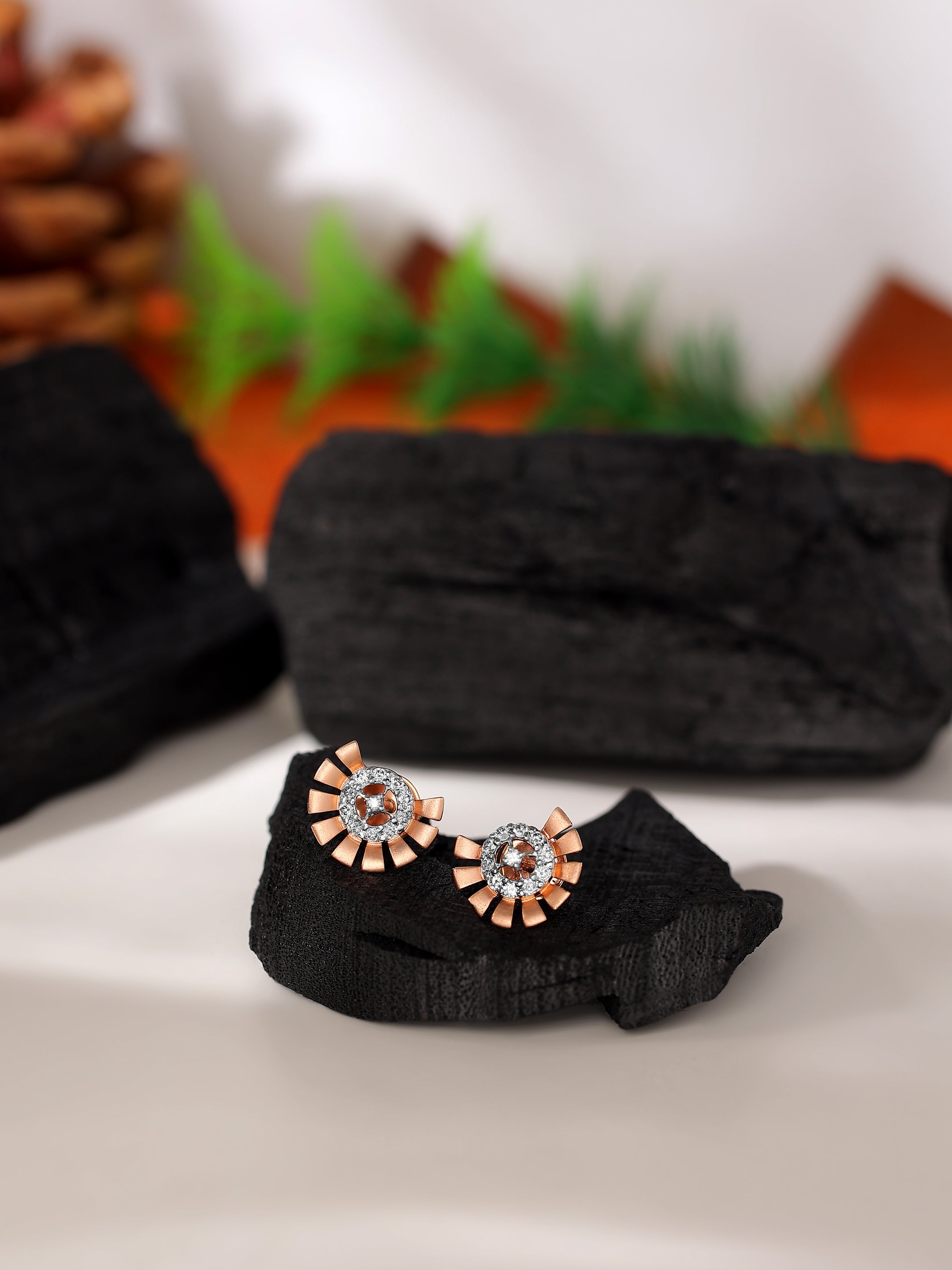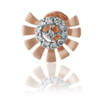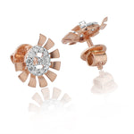 These captivating earrings feature a bold and modern design inspired by the radiant energy of the sun. The earrings are crafted in rose gold, with a central circle of sparkling white diamonds that catch the light beautifully. Surrounding the diamond center are elegantly flared spokes, reminiscent of sun rays, adding a dynamic and eye-catching element to the design. The interplay of the warm rose gold and the shimmering diamonds creates a striking contrast, making these earrings a perfect statement piece. The innovative and artistic design makes them ideal for those who appreciate unique, contemporary jewelry with a touch of elegance and sophistication. Perfect for both everyday wear and special occasions, these earrings will add a touch of radiant beauty to any outfit.