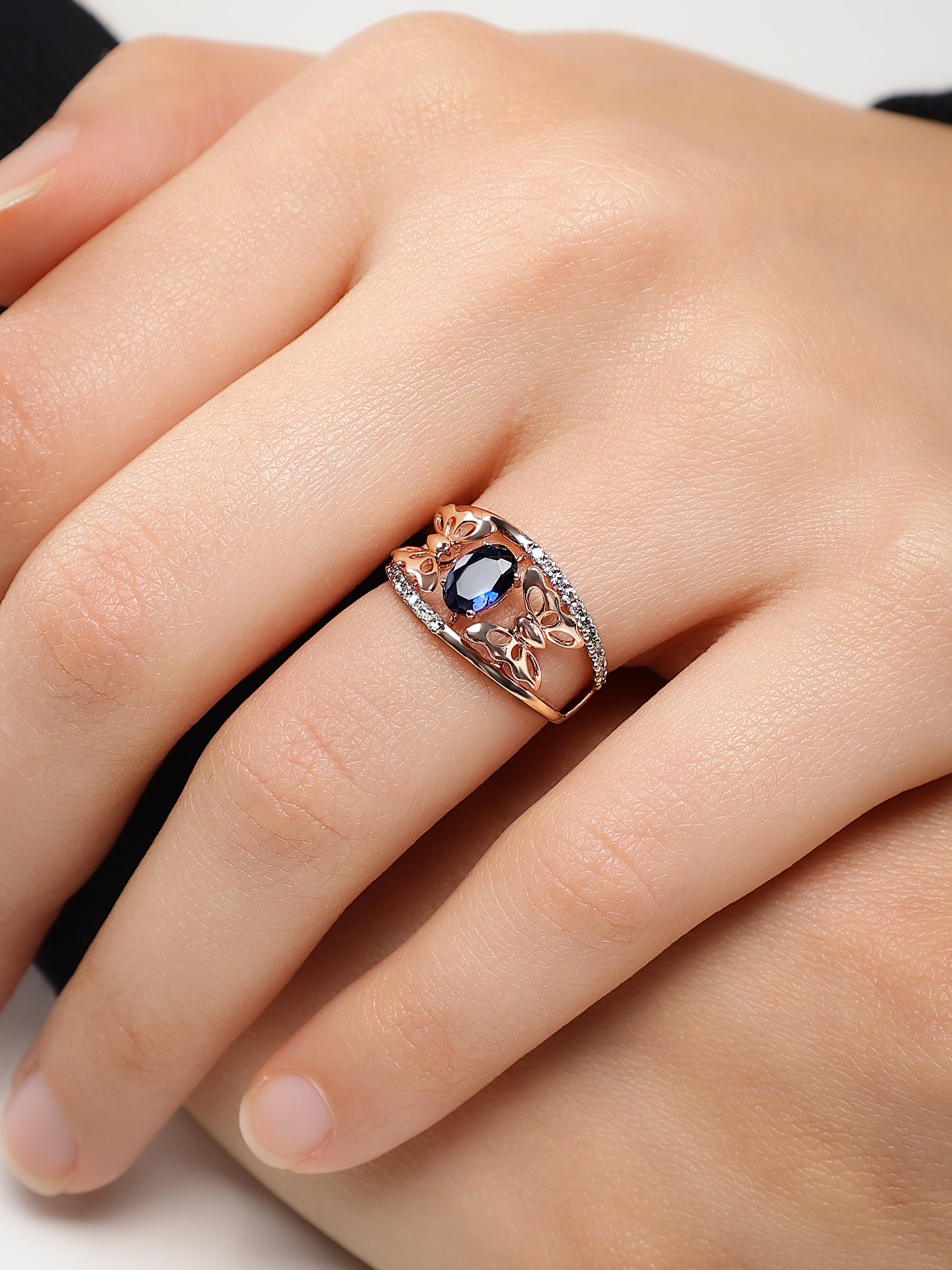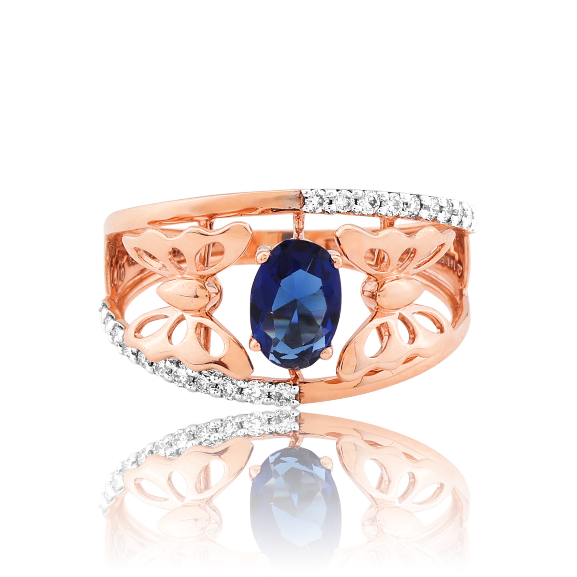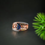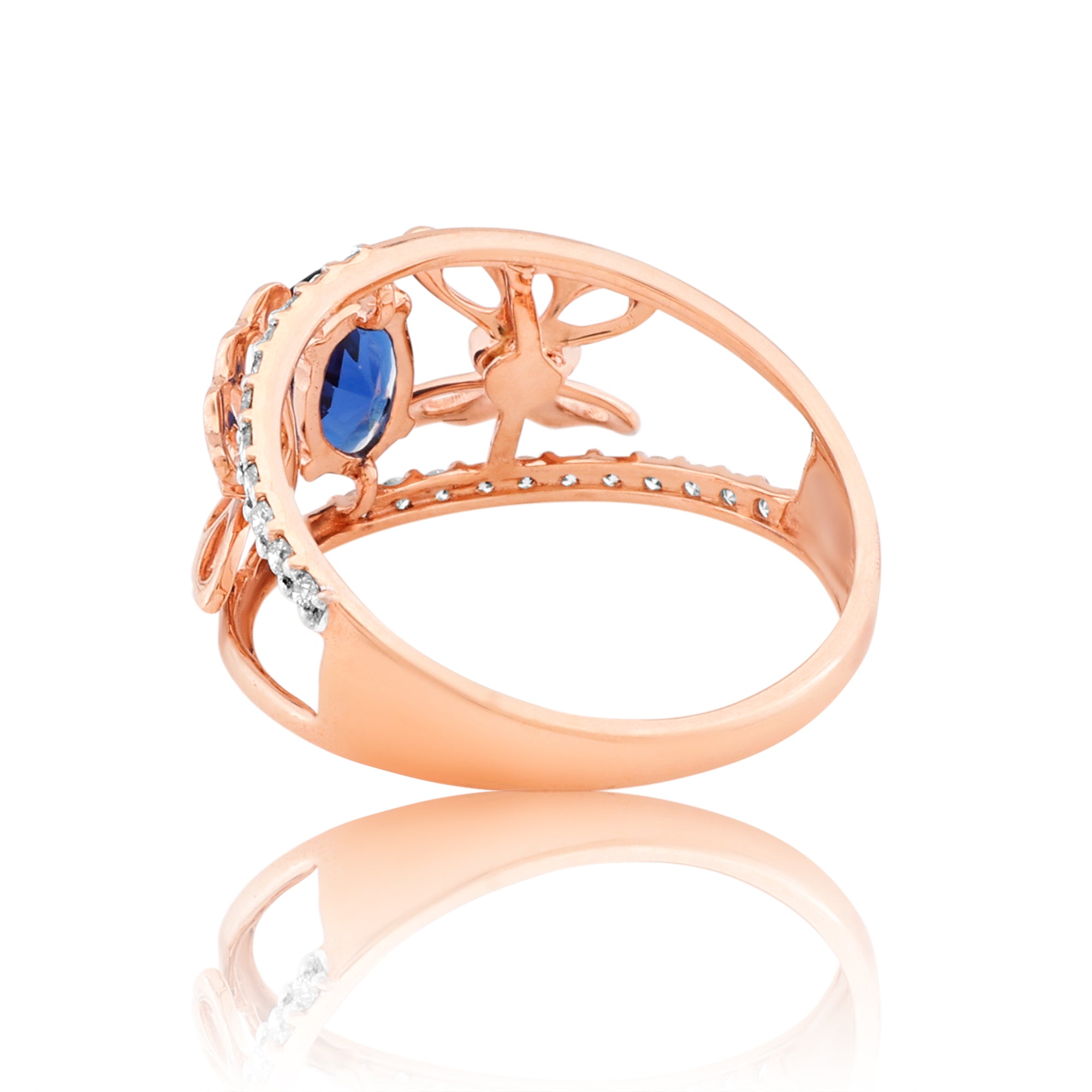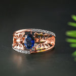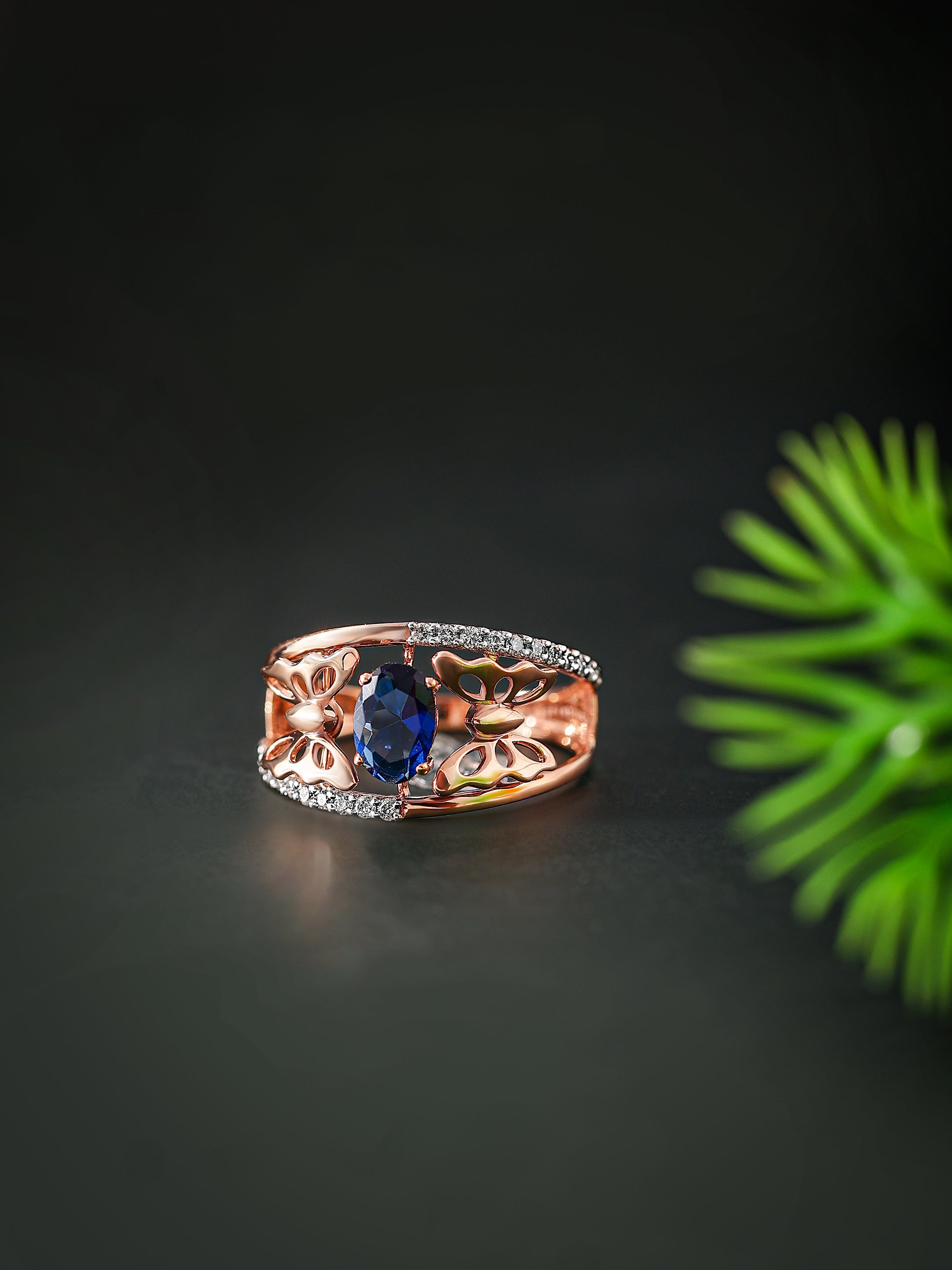 Immerse yourself in the captivating beauty of the Midnight Sapphire Dual Butterfly Diamond Ring. This exquisite piece showcases a mesmerizing oval sapphire at its core, symbolizing wisdom and serenity. The sapphire is gracefully framed by intricately designed butterfly motifs in radiant rose gold, embodying transformation and new beginnings. A delicate trail of sparkling diamonds weaves through the band, adding a touch of brilliance and elegance. Perfect for those who appreciate the harmonious blend of nature's beauty and refined craftsmanship, this ring is a timeless treasure.
