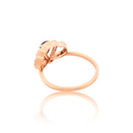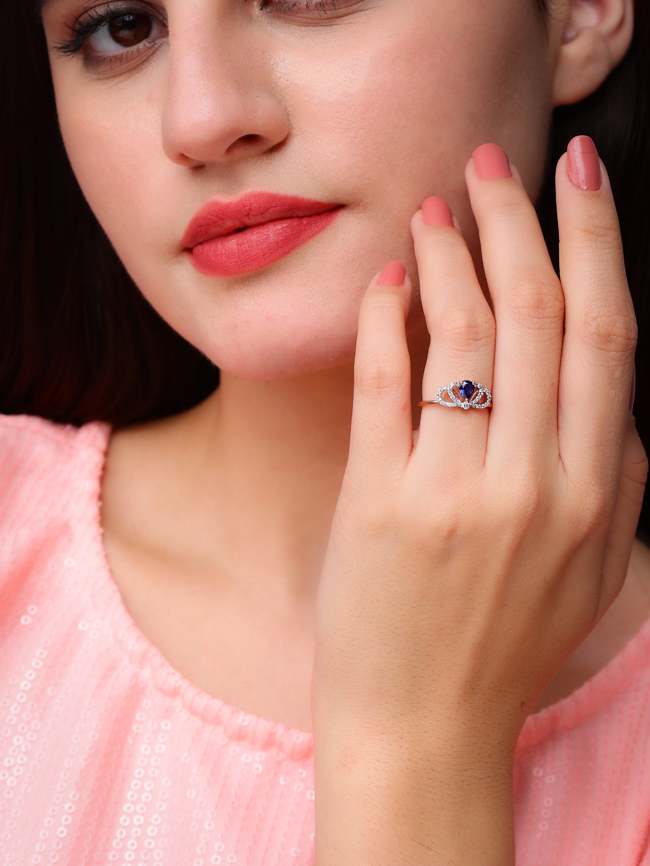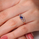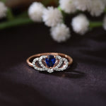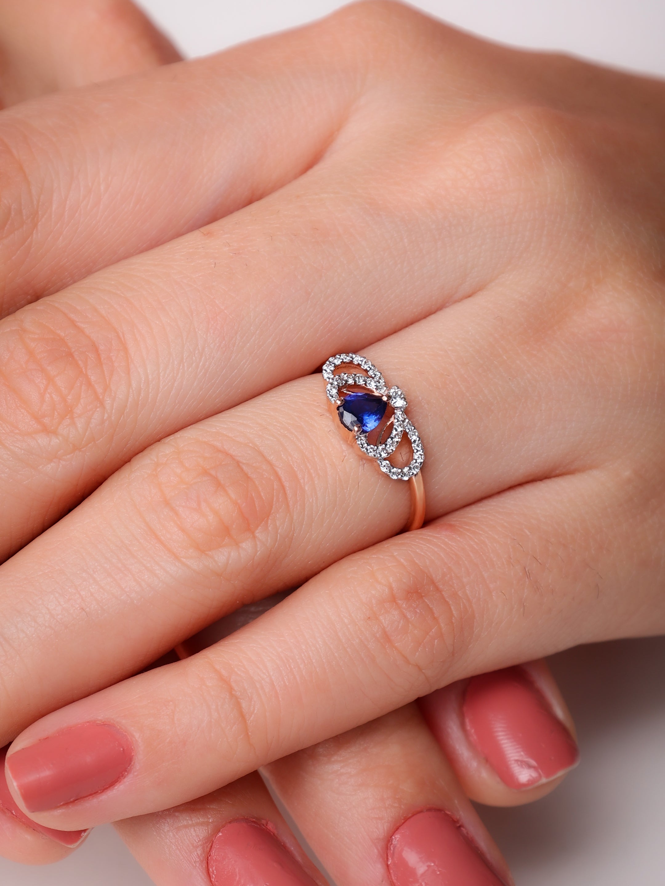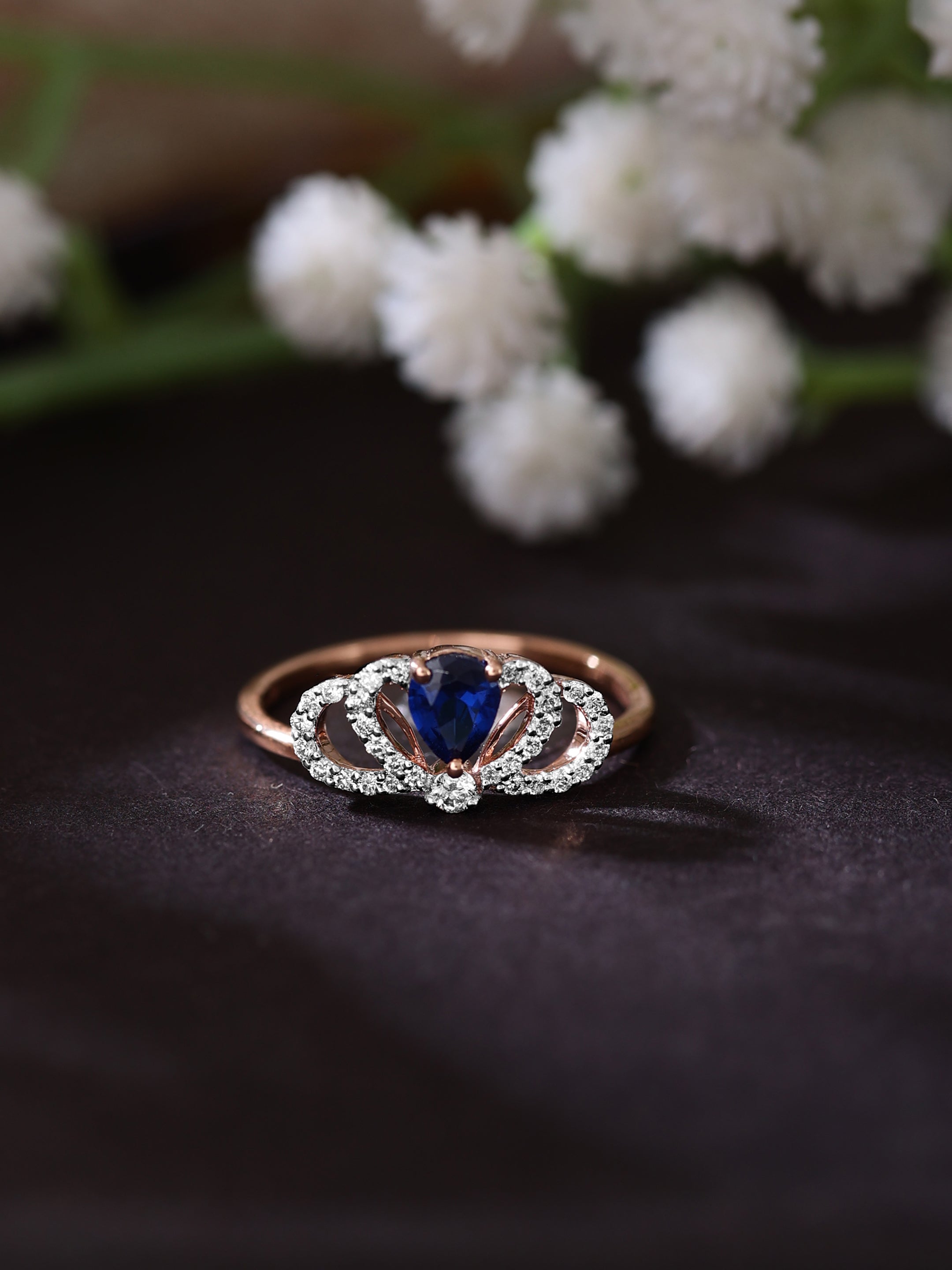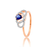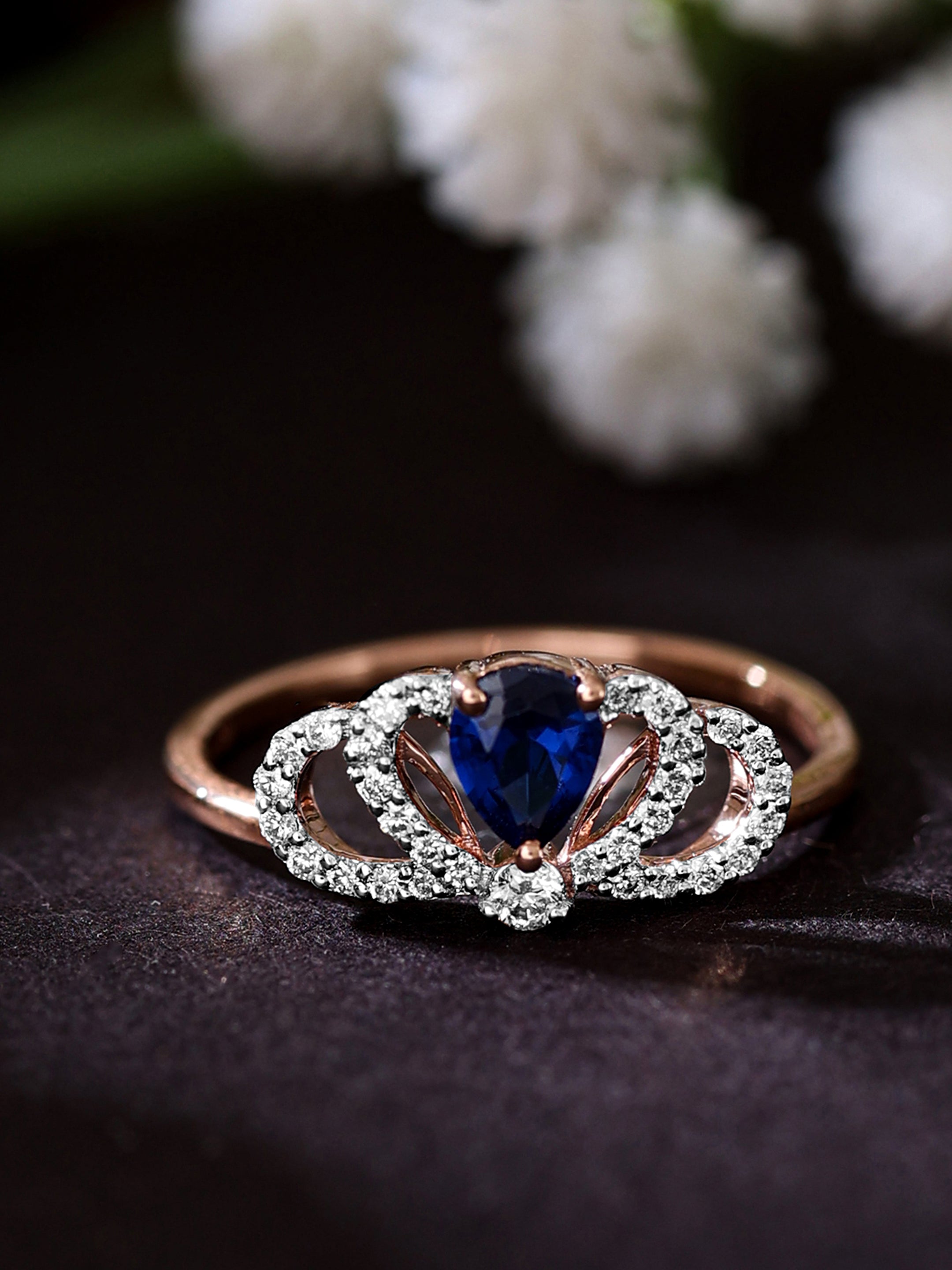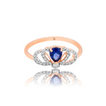 The Oceanic Halo Stardust Diamond Ring is a captivating piece of jewelry that blends timeless elegance with modern sophistication. At its center lies a stunning pear-shaped sapphire, exuding a deep, mesmerizing blue hue reminiscent of the ocean at twilight. The sapphire is gracefully embraced by a delicate rose gold band, adorned with interwoven loops of sparkling diamonds that create an intricate halo around the central gemstone.