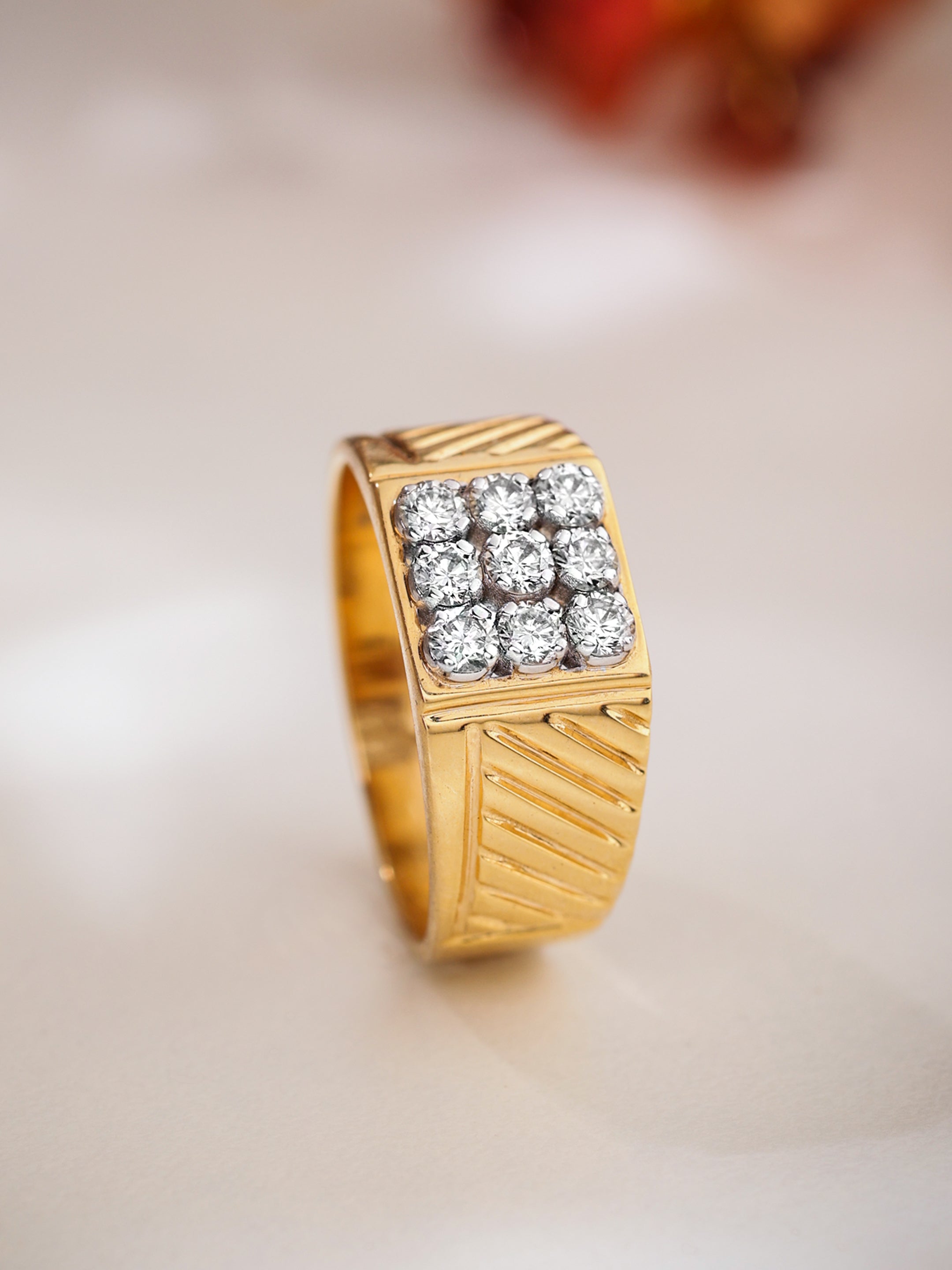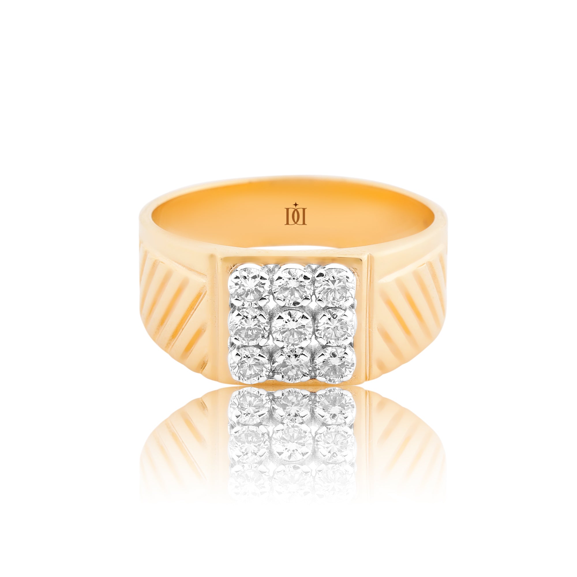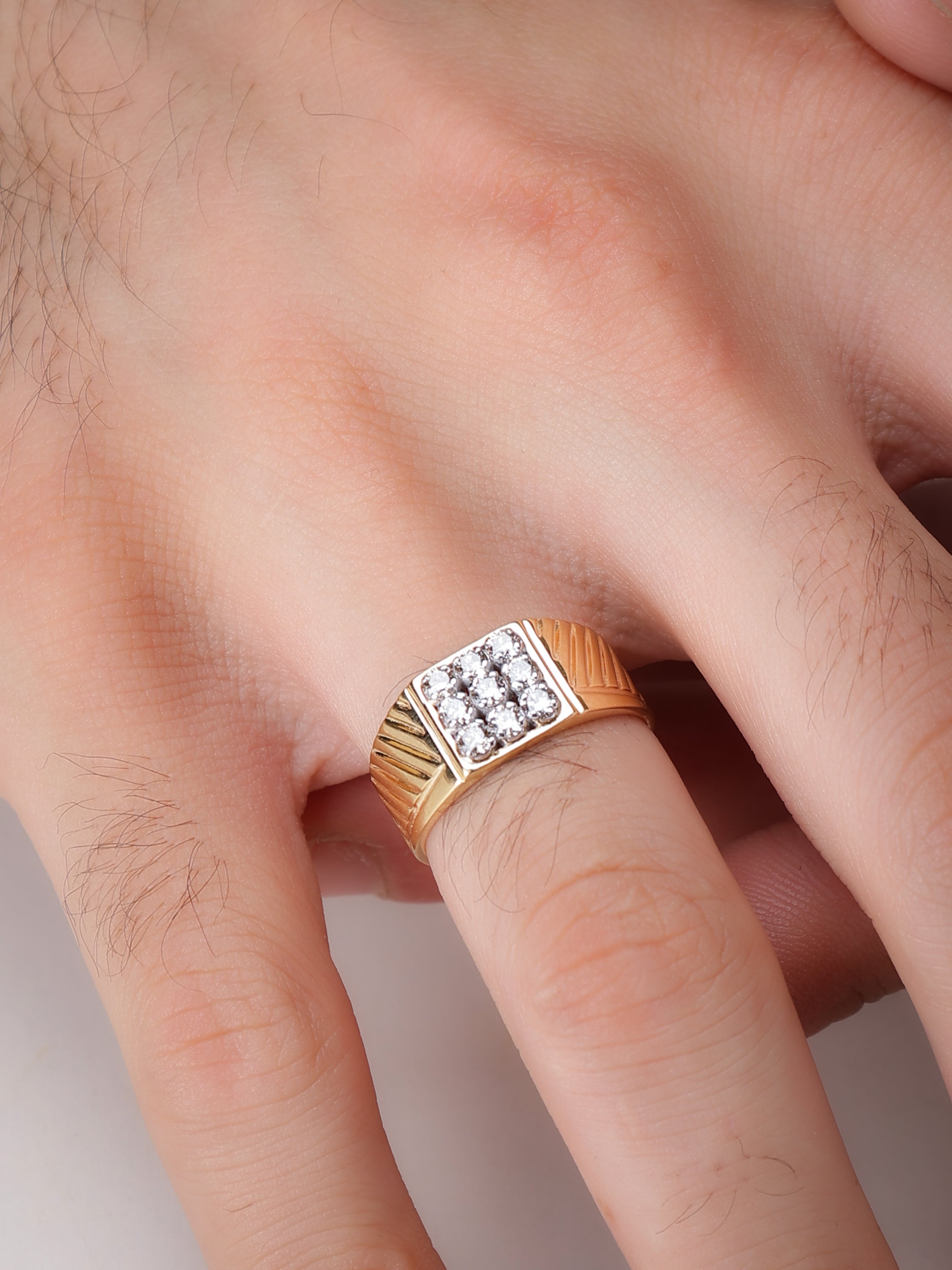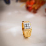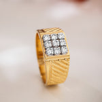 Introducing the Prestige Square-Cut Men's Diamond Ring: This distinguished piece features a bold and wide band adorned with nine exquisite natural diamonds, meticulously arranged to form a striking square at the center. The band is embellished with sleek and masculine linings, adding a touch of sophistication to your look.