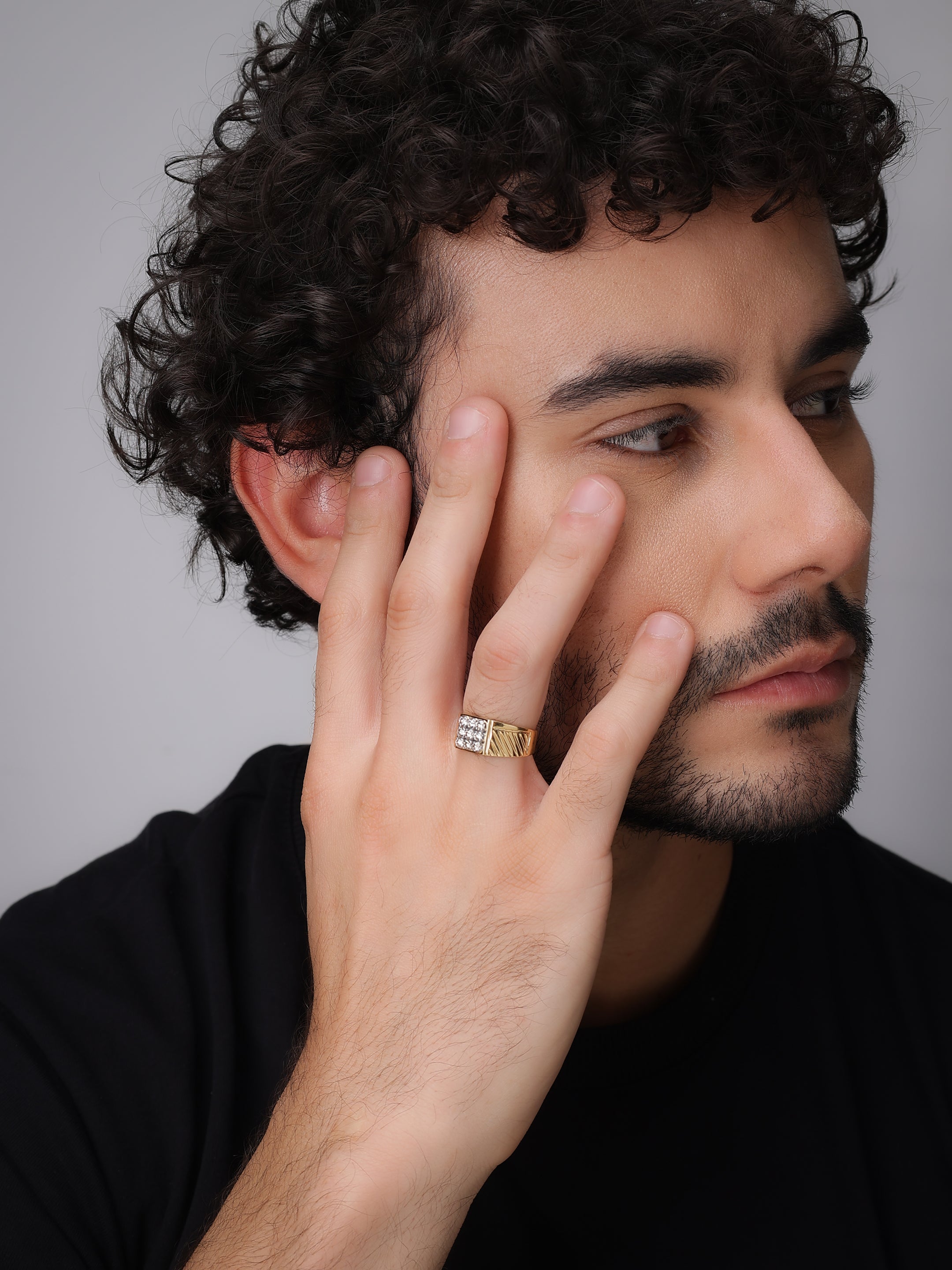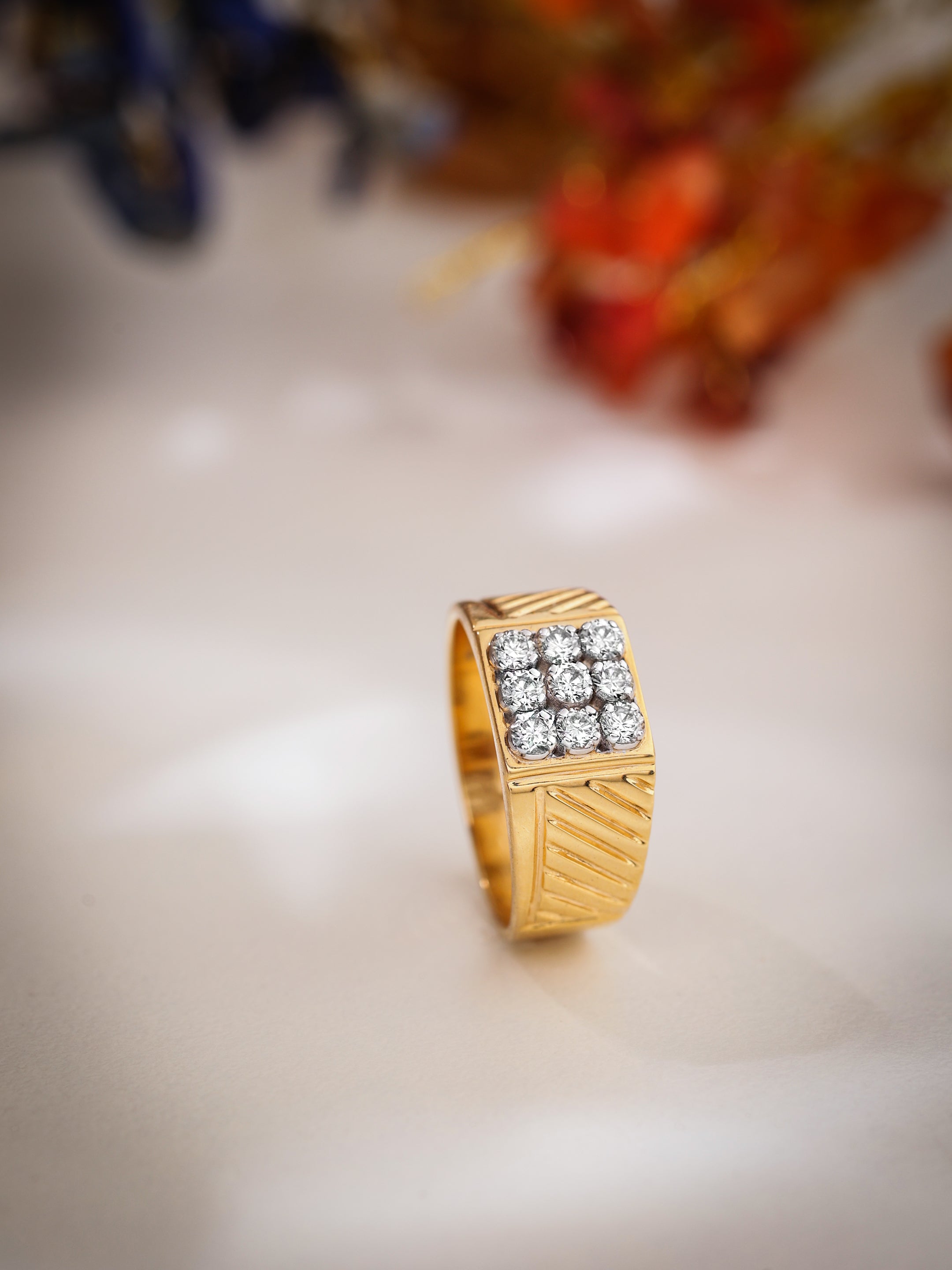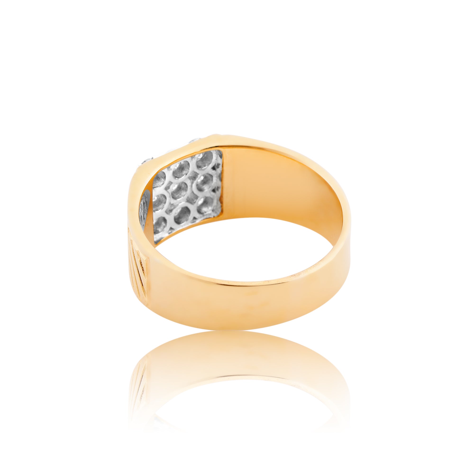 Introducing the Prestige Square-Cut Men's Diamond Ring: This distinguished piece features a bold and wide band adorned with nine exquisite natural diamonds, meticulously arranged to form a striking square at the center. The band is embellished with sleek and masculine linings, adding a touch of sophistication to your look.