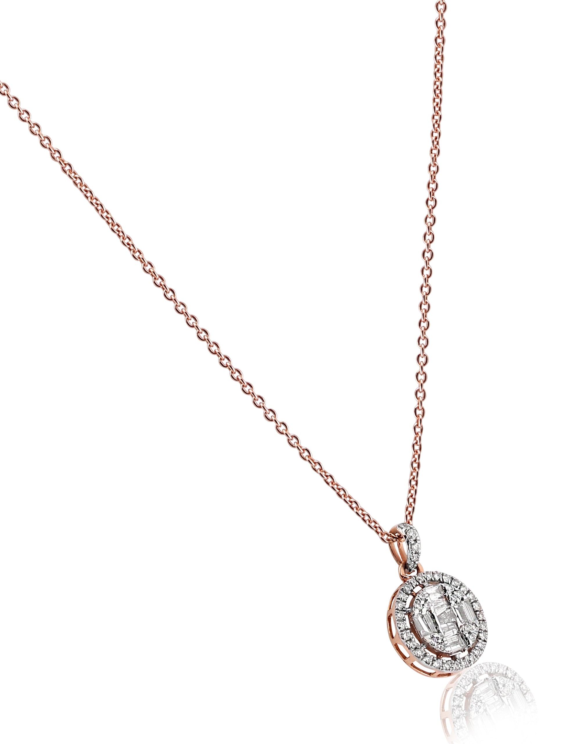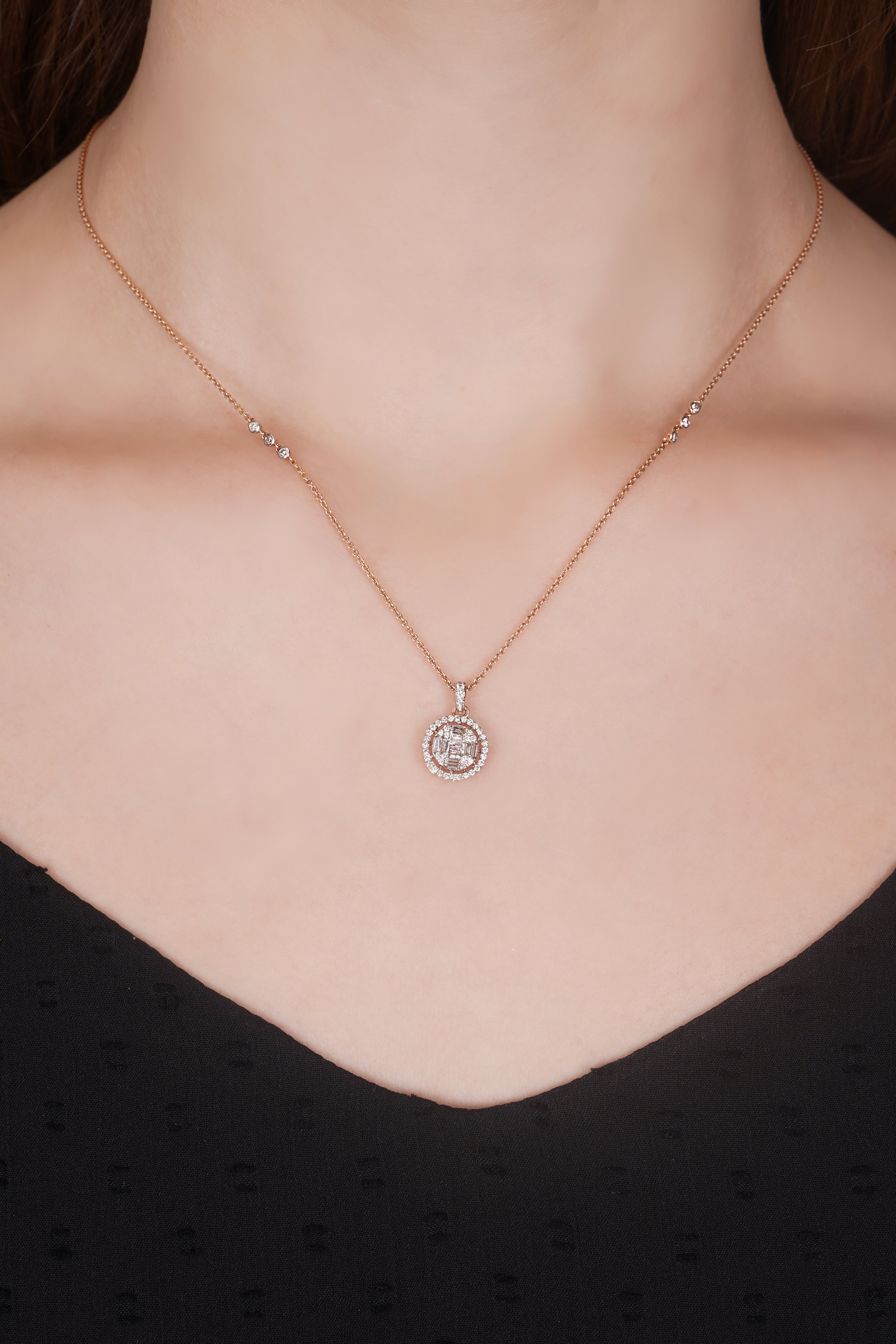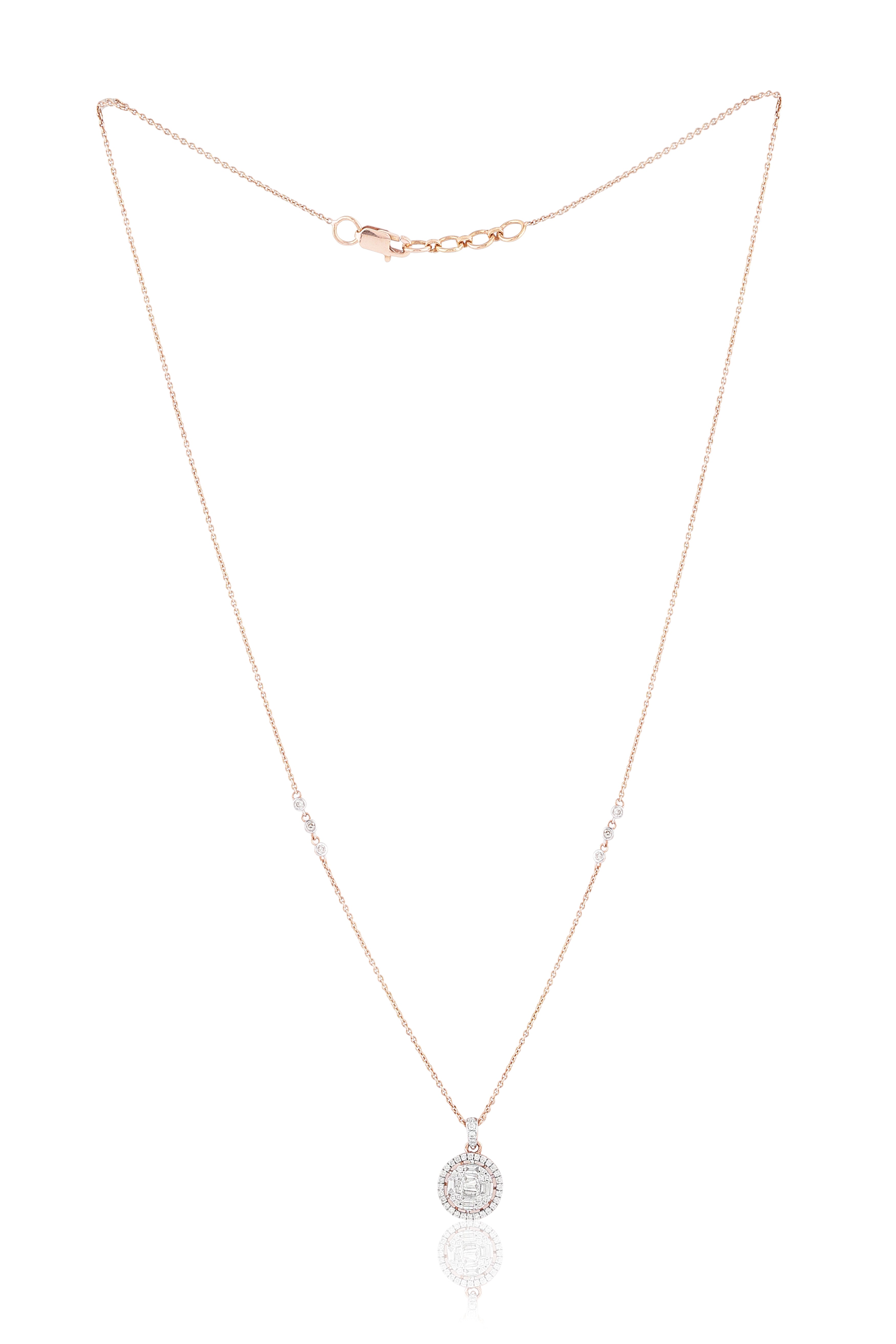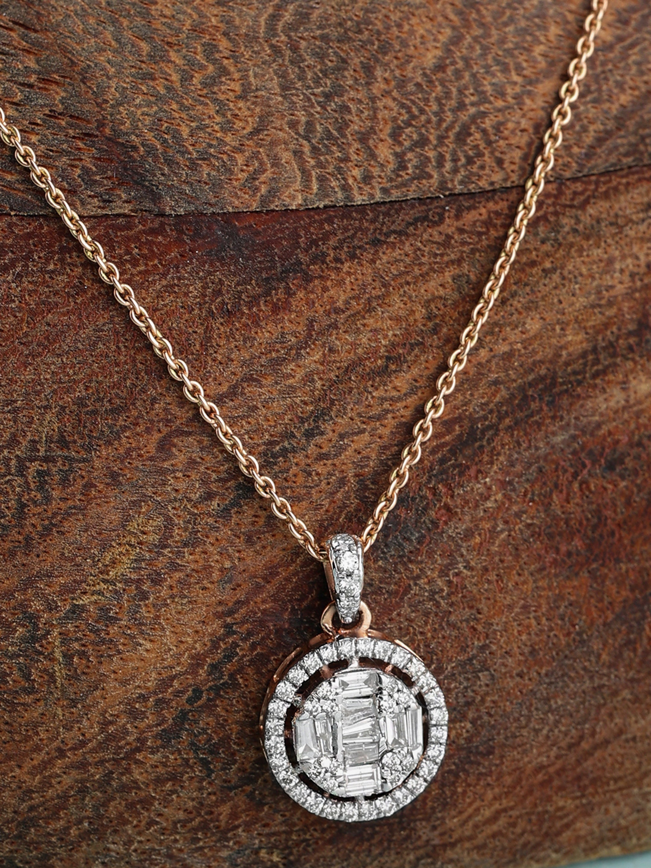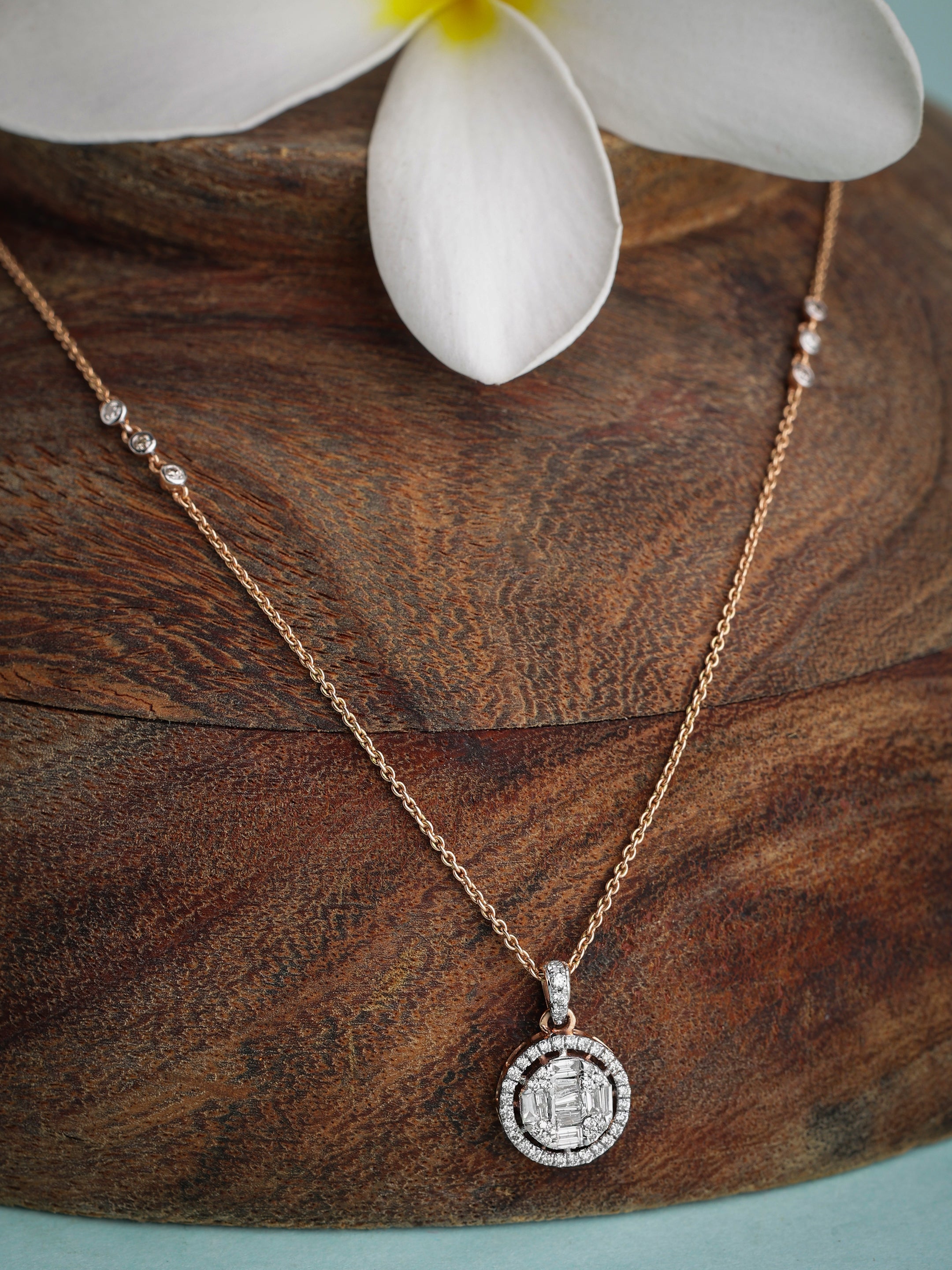 Introducing the Radiant Circlet Diamond Pendant - a symbol of timeless elegance and sophistication. This exquisite necklace showcases a captivating design of encircling circles adorned with a dazzling array of 60 natural diamonds. The round brilliant and baguette-cut diamonds are expertly set, creating a radiant and graceful look that is sure to captivate hearts.