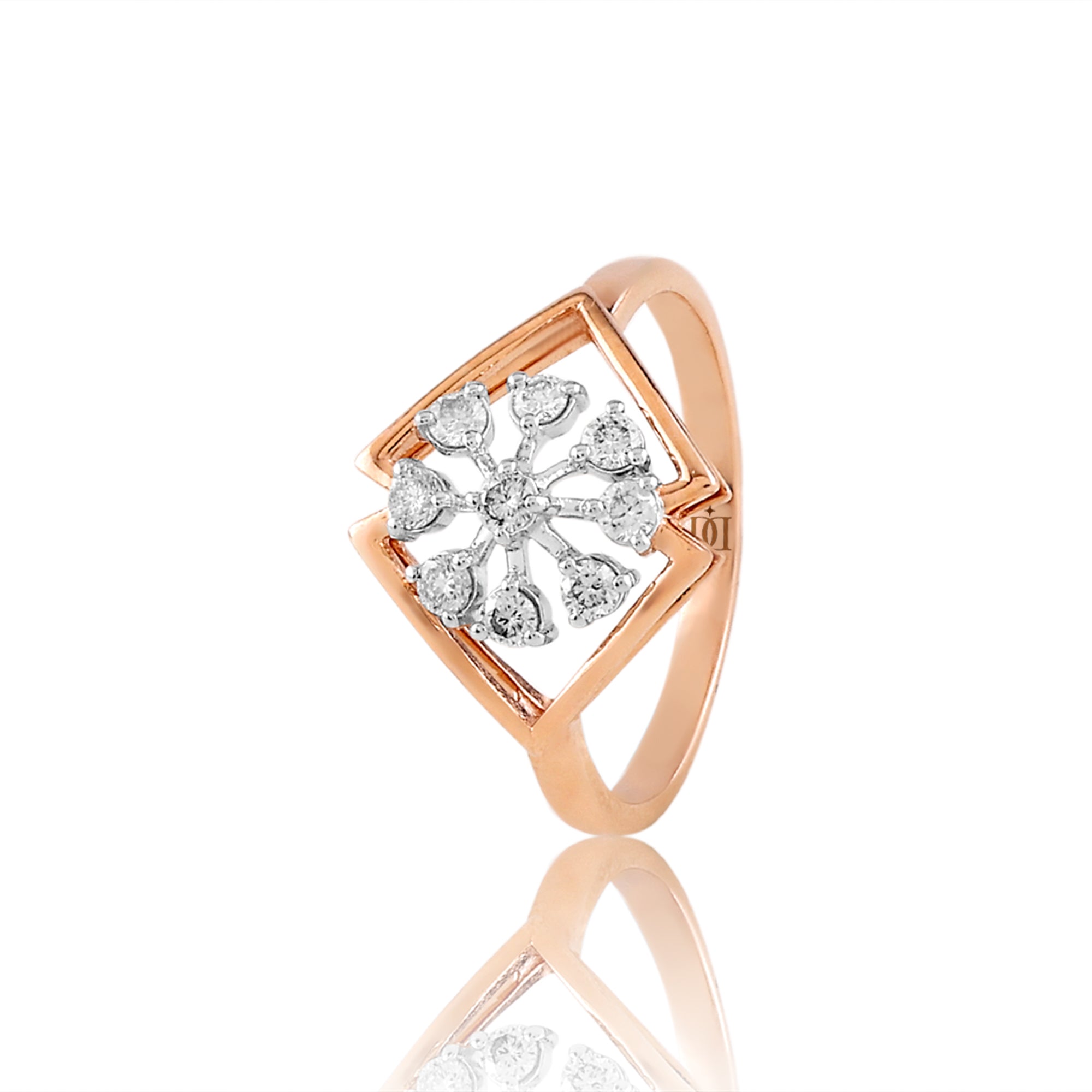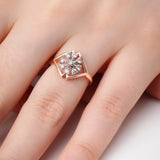 The Radiant Rose Symphony Ring is a stunning masterpiece that combines elegance and grace in a unique design. This exquisite ring showcases two open triangles facing each other, symbolizing harmony and balance, while gracefully intertwining with eight delicate rose flowers and stems adorned with sparkling diamonds.The diamonds, meticulouSIy set within the floral motifs, add a touch of brilliance and sparkle, enhancing the overall allure of the design.