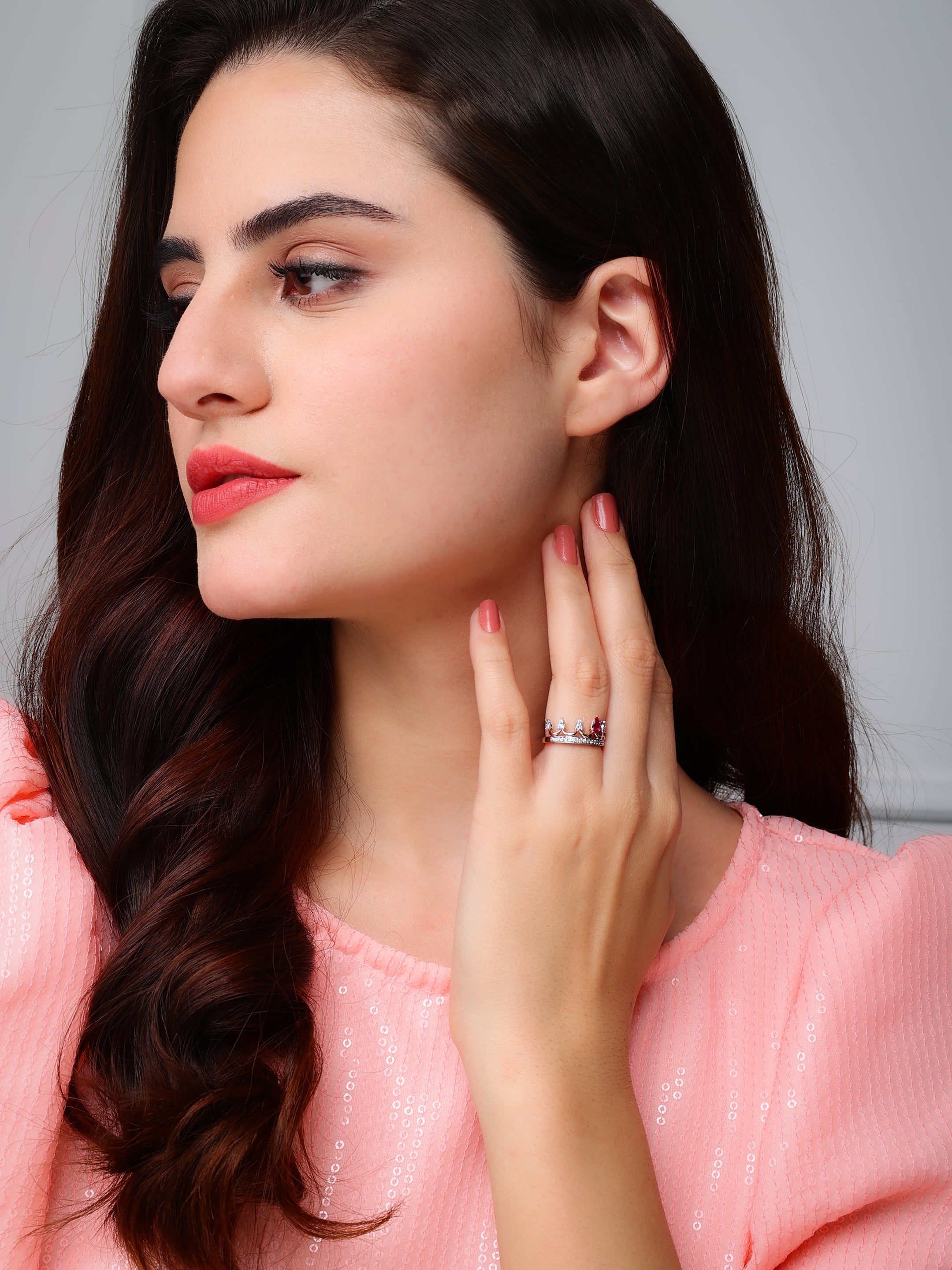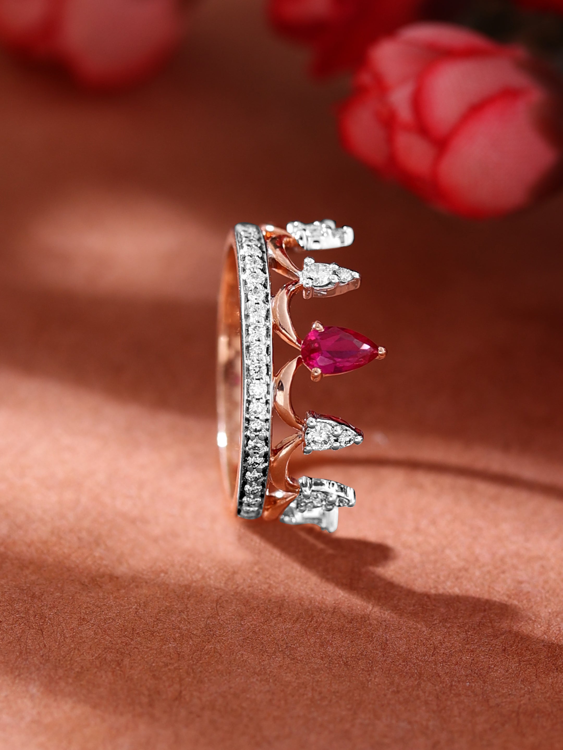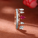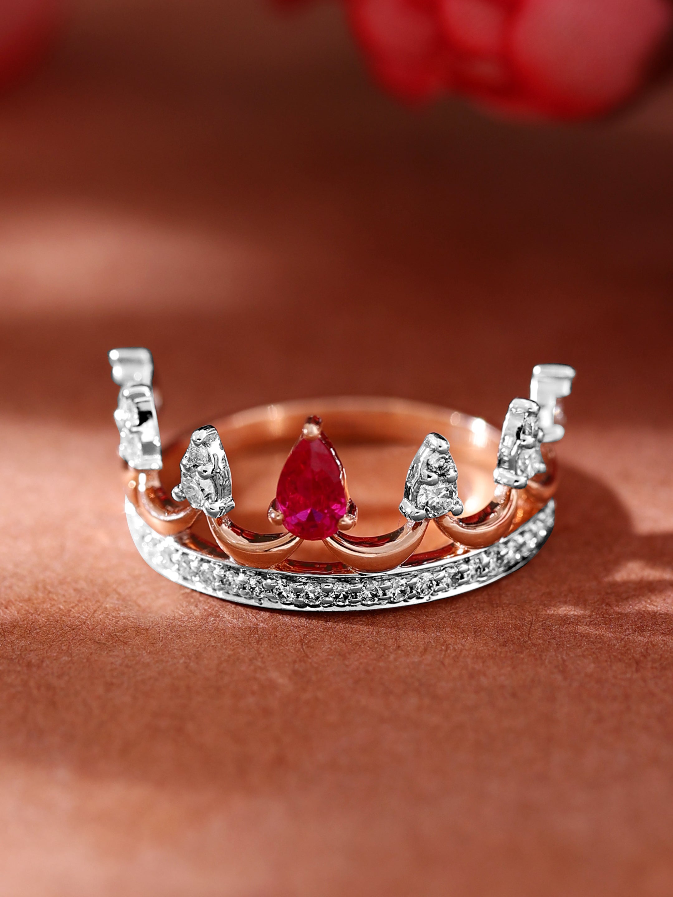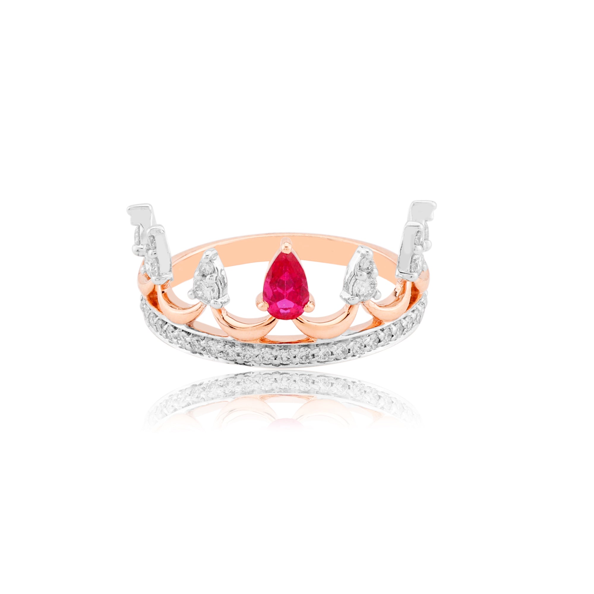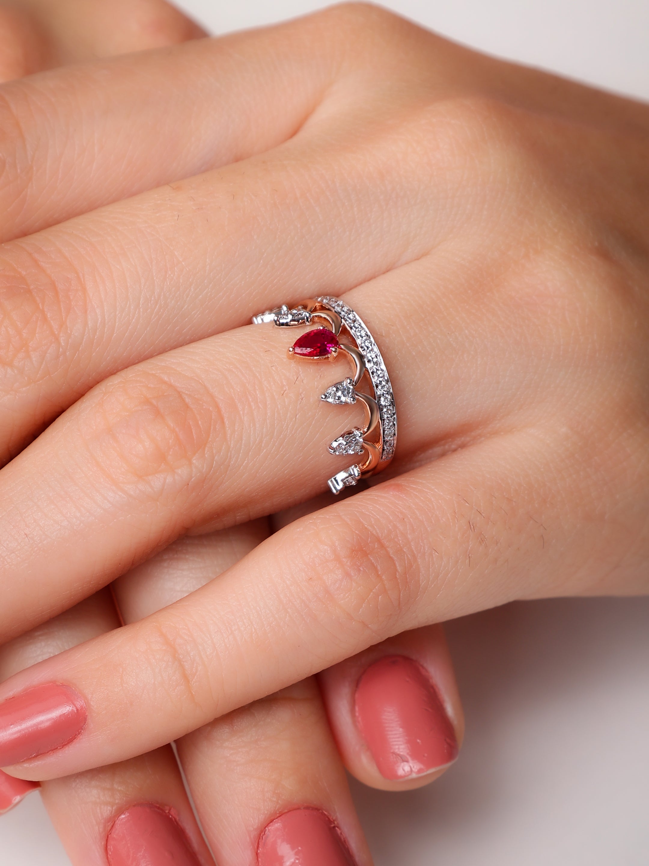 Adorn yourself with the majestic elegance of the Regal Ruby Crown Diamond Ring. This exquisite piece is crafted in a stunning combination of rose gold and white gold, designed to resemble a royal crown. At its pinnacle sits a vibrant pear-shaped ruby, symbolizing passion and nobility. The ring is further embellished with intricate diamond accents, enhancing its regal allure. Perfect for those who wish to feel like royalty, this ring is a true testament to luxury and refined craftsmanship.