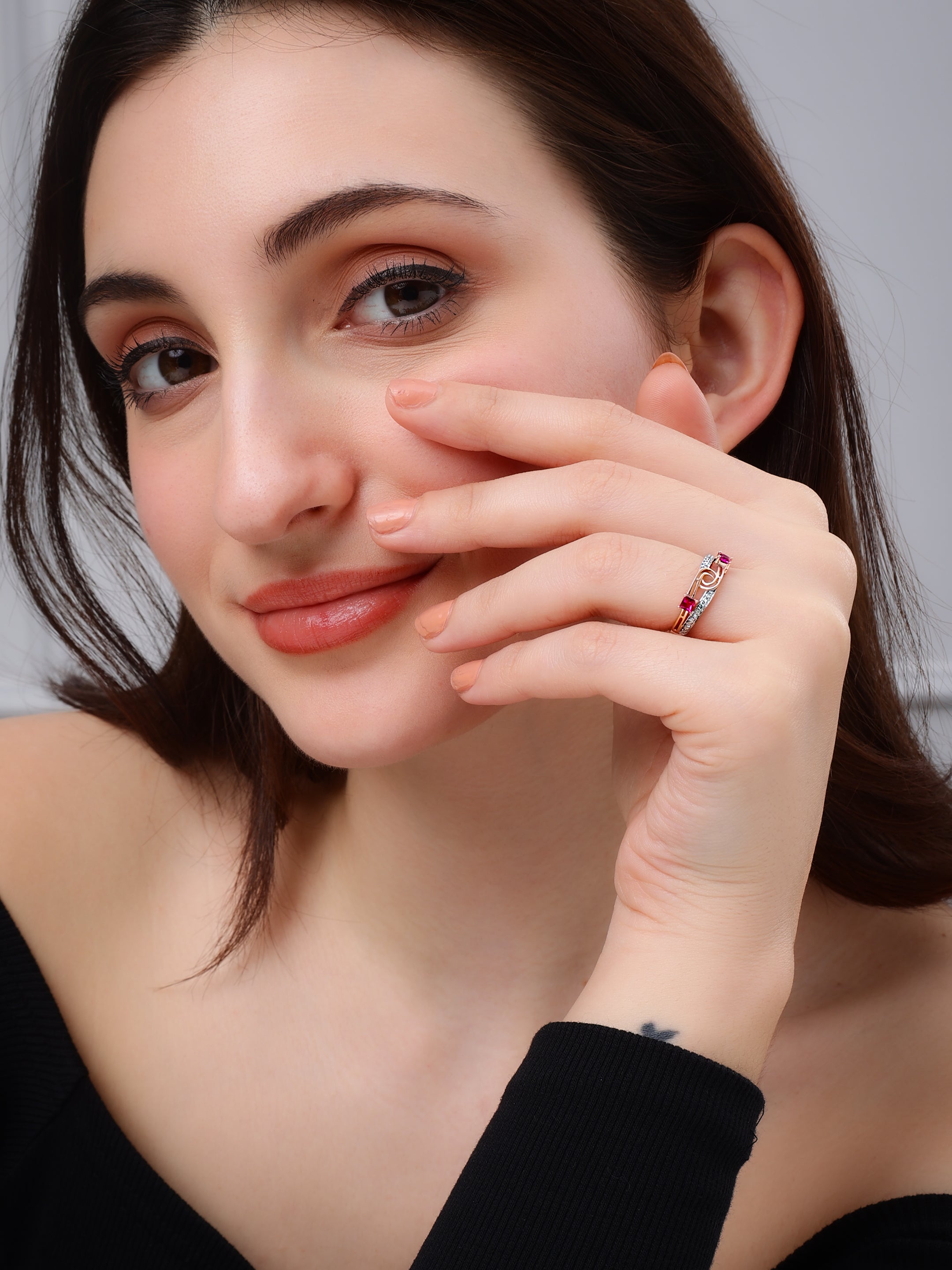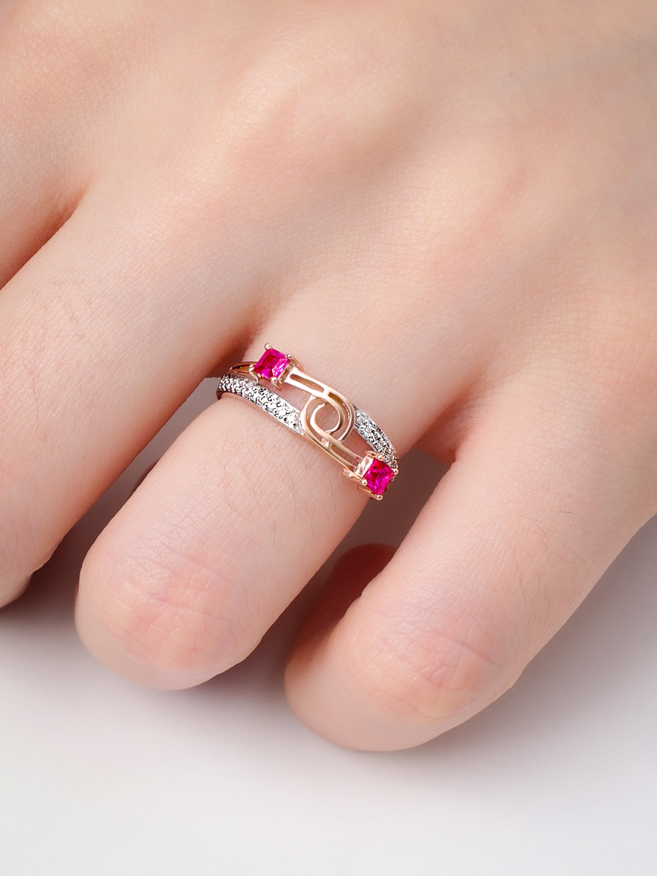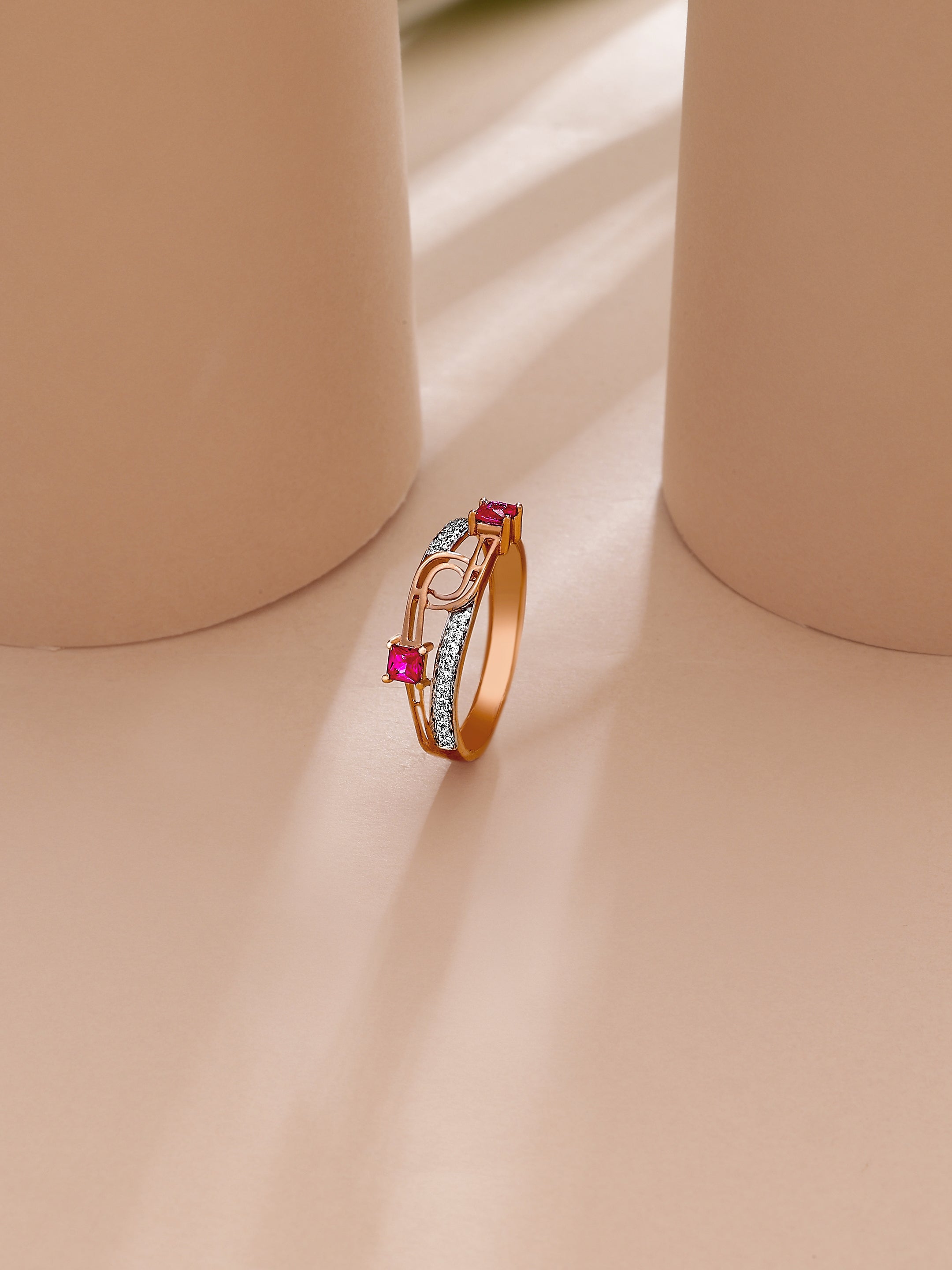 This stunning ring features a modern, sophisticated design that seamlessly combines elegance and vibrancy. The band, crafted in luxurious rose gold, is adorned with a captivating swirl motif that gracefully loops around two radiant square-cut rubies. These vibrant gemstones, symbolizing passion and vitality, are perfectly positioned to catch the eye. Enhancing the opulence of the piece, a row of meticulously set white diamonds cascades along the upper half of the band, creating a striking contrast with the rich hue of the rubies. The harmonious interplay between the shimmering diamonds and the vivid rubies, coupled with the intricate rose gold swirl, makes this ring a perfect embodiment of refined artistry and timeless beauty.