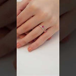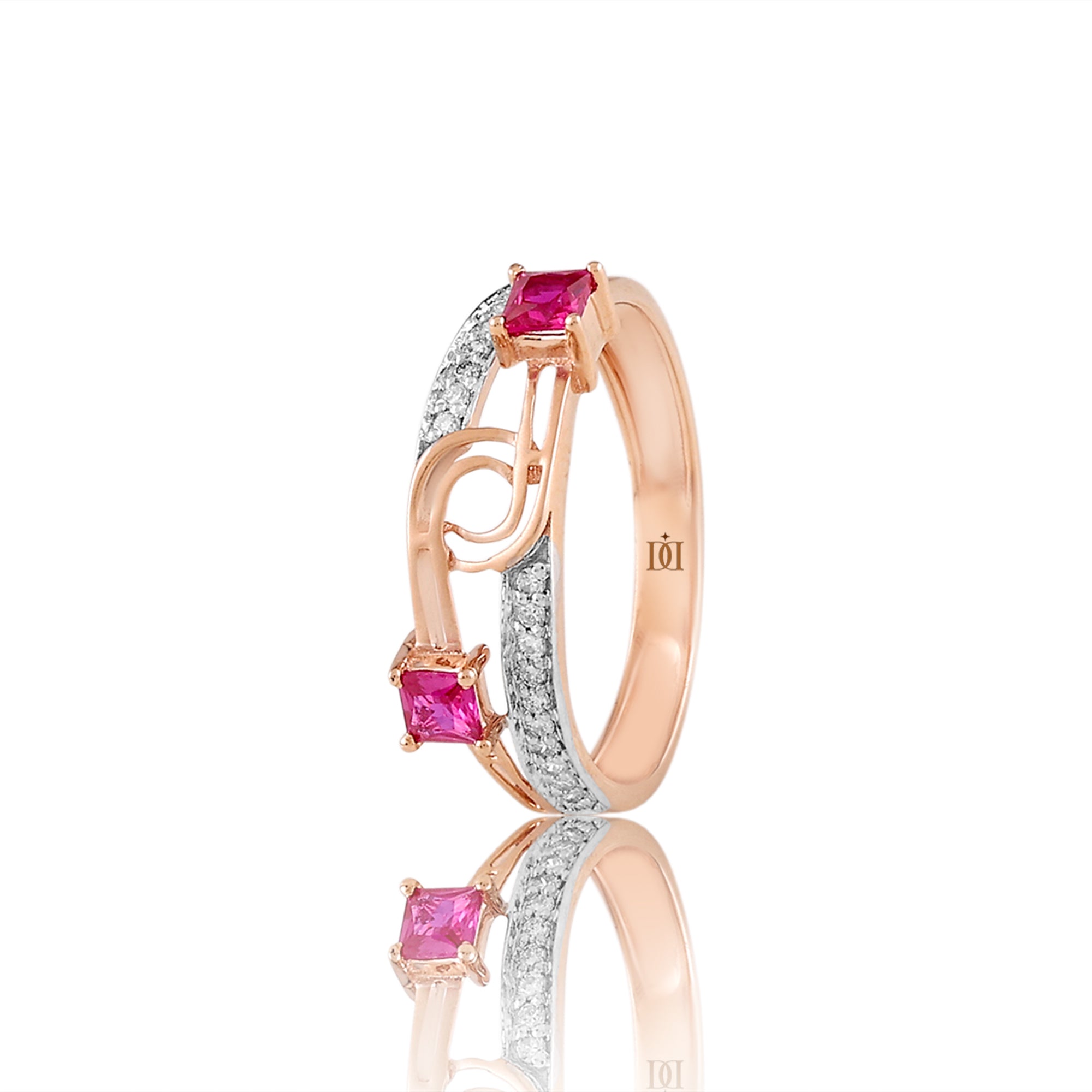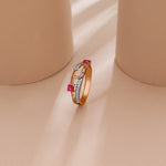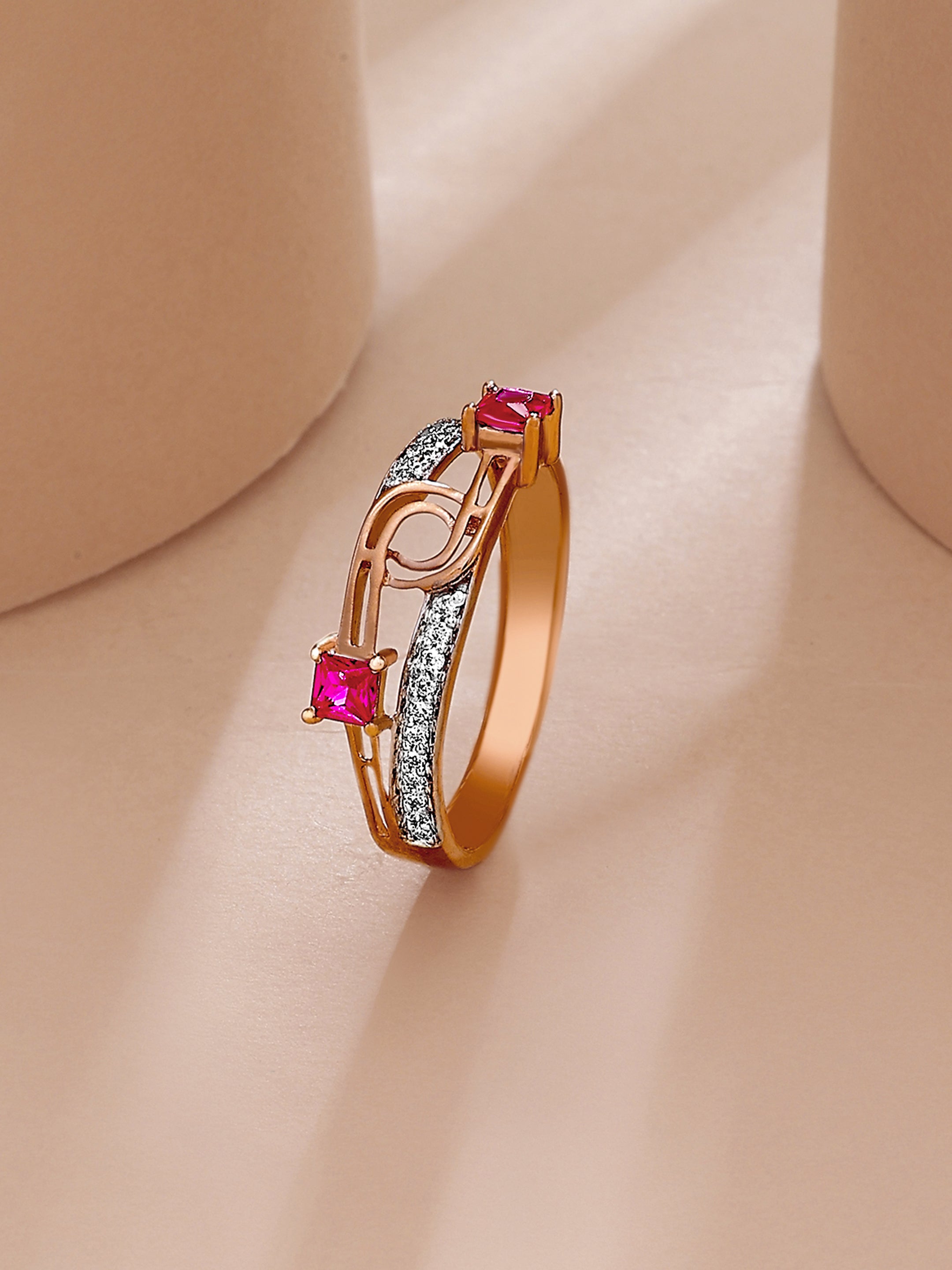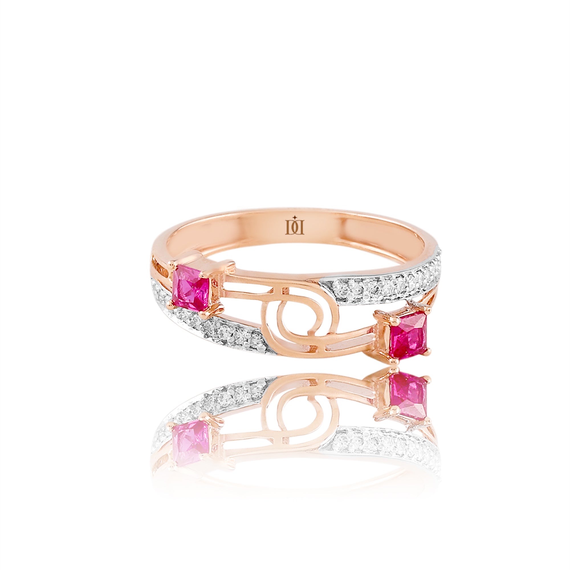 This stunning ring features a modern, sophisticated design that seamlessly combines elegance and vibrancy. The band, crafted in luxurious rose gold, is adorned with a captivating swirl motif that gracefully loops around two radiant square-cut rubies. These vibrant gemstones, symbolizing passion and vitality, are perfectly positioned to catch the eye. Enhancing the opulence of the piece, a row of meticulously set white diamonds cascades along the upper half of the band, creating a striking contrast with the rich hue of the rubies. The harmonious interplay between the shimmering diamonds and the vivid rubies, coupled with the intricate rose gold swirl, makes this ring a perfect embodiment of refined artistry and timeless beauty.