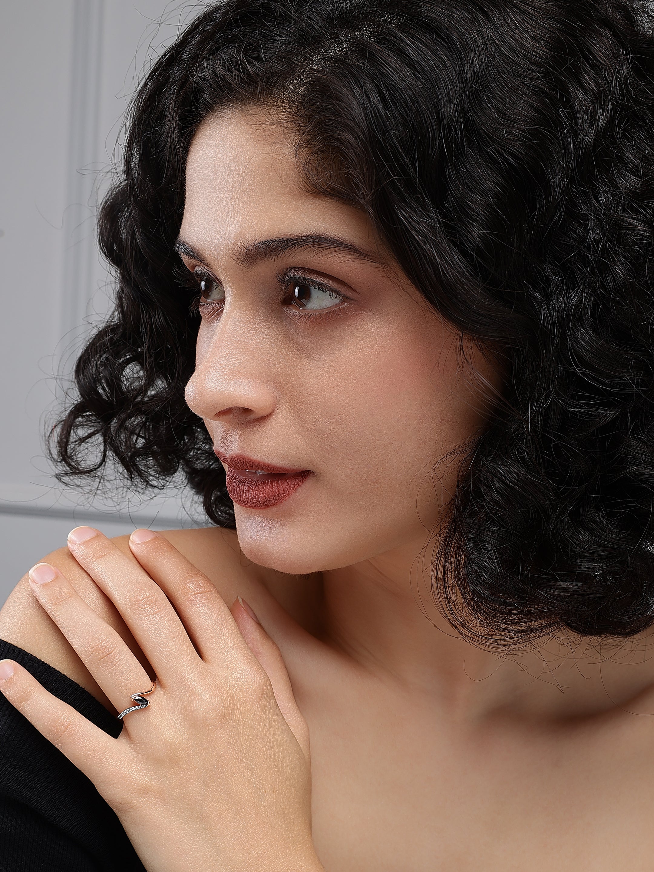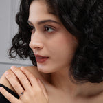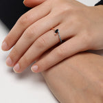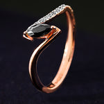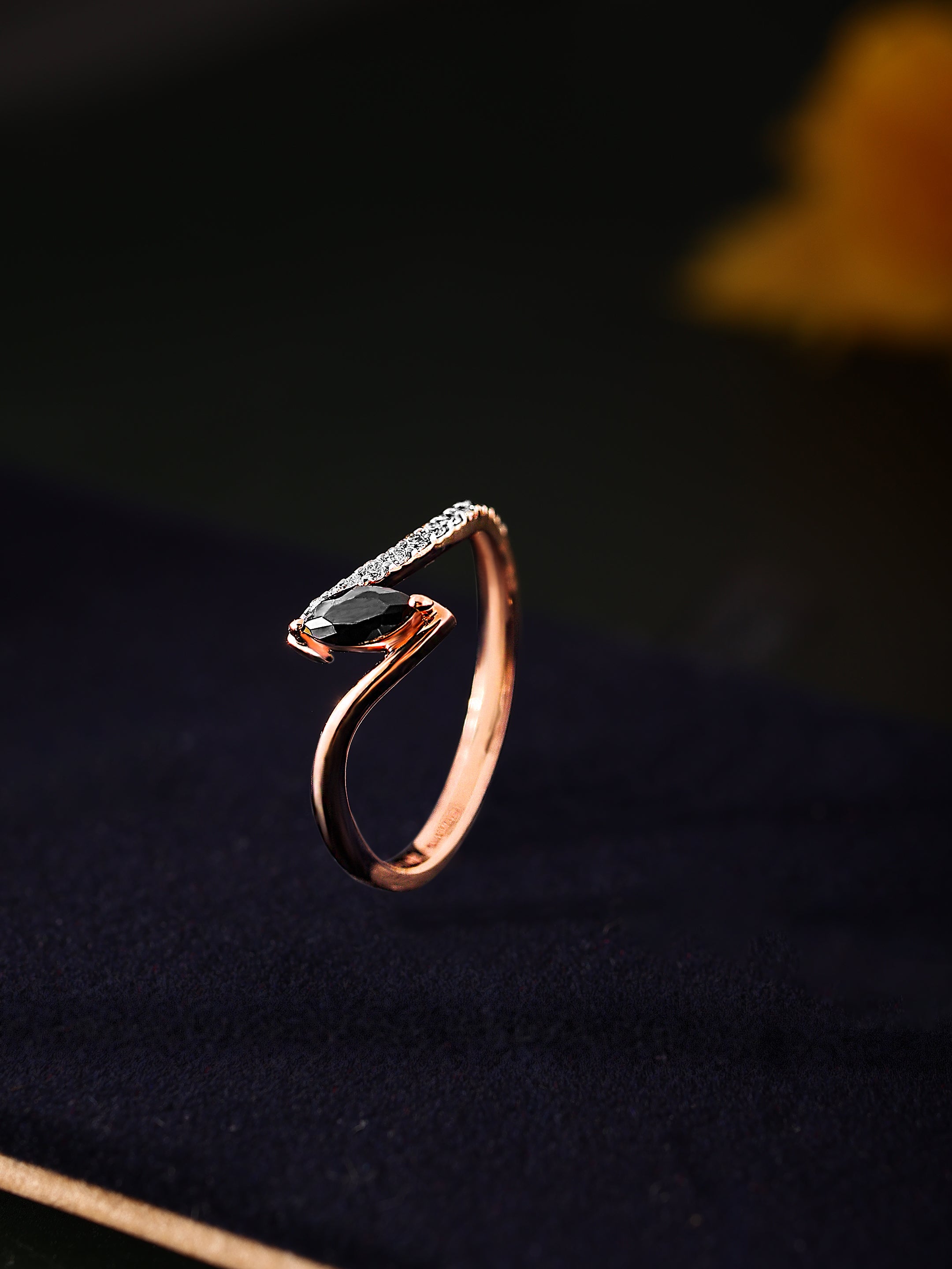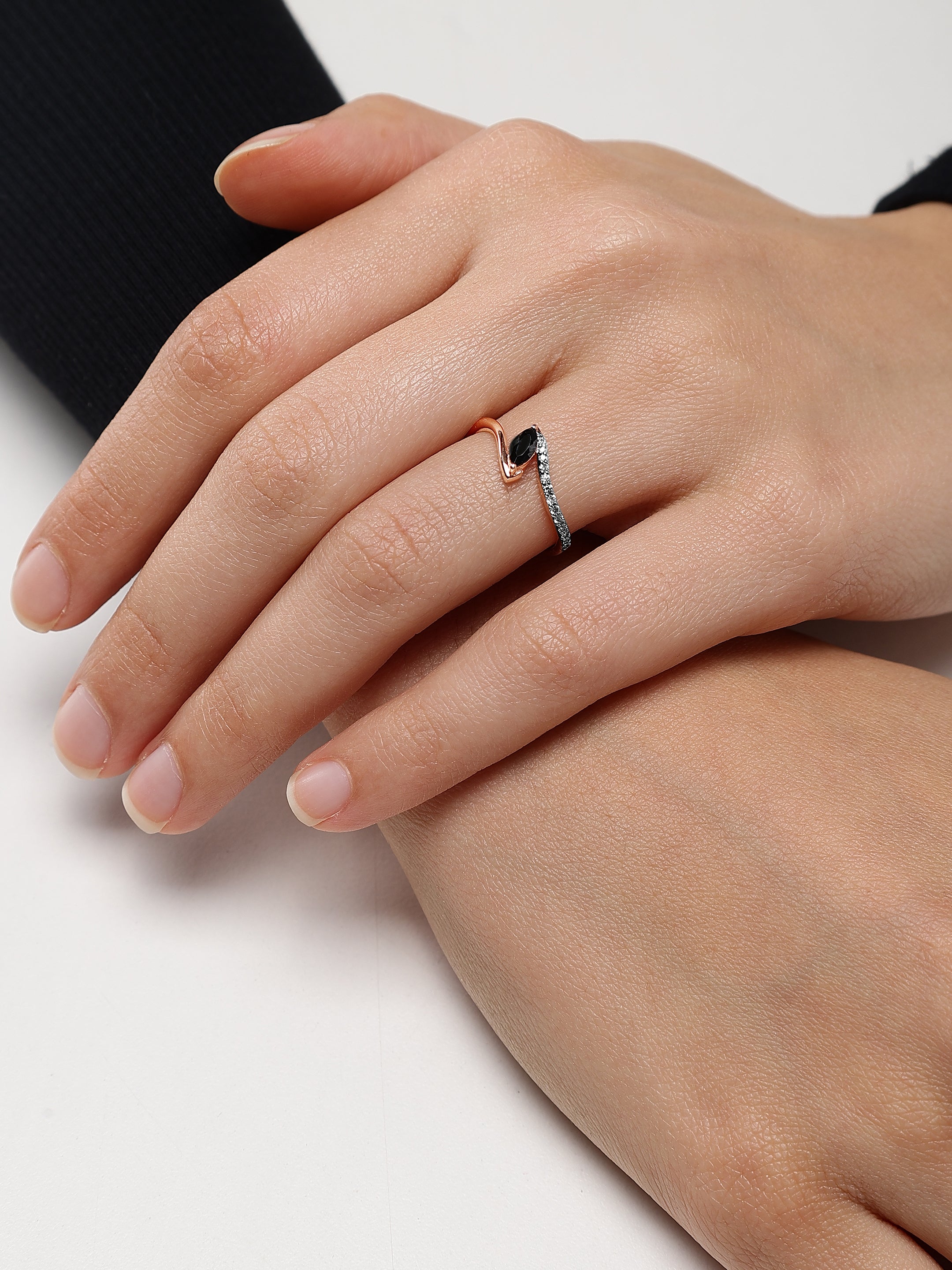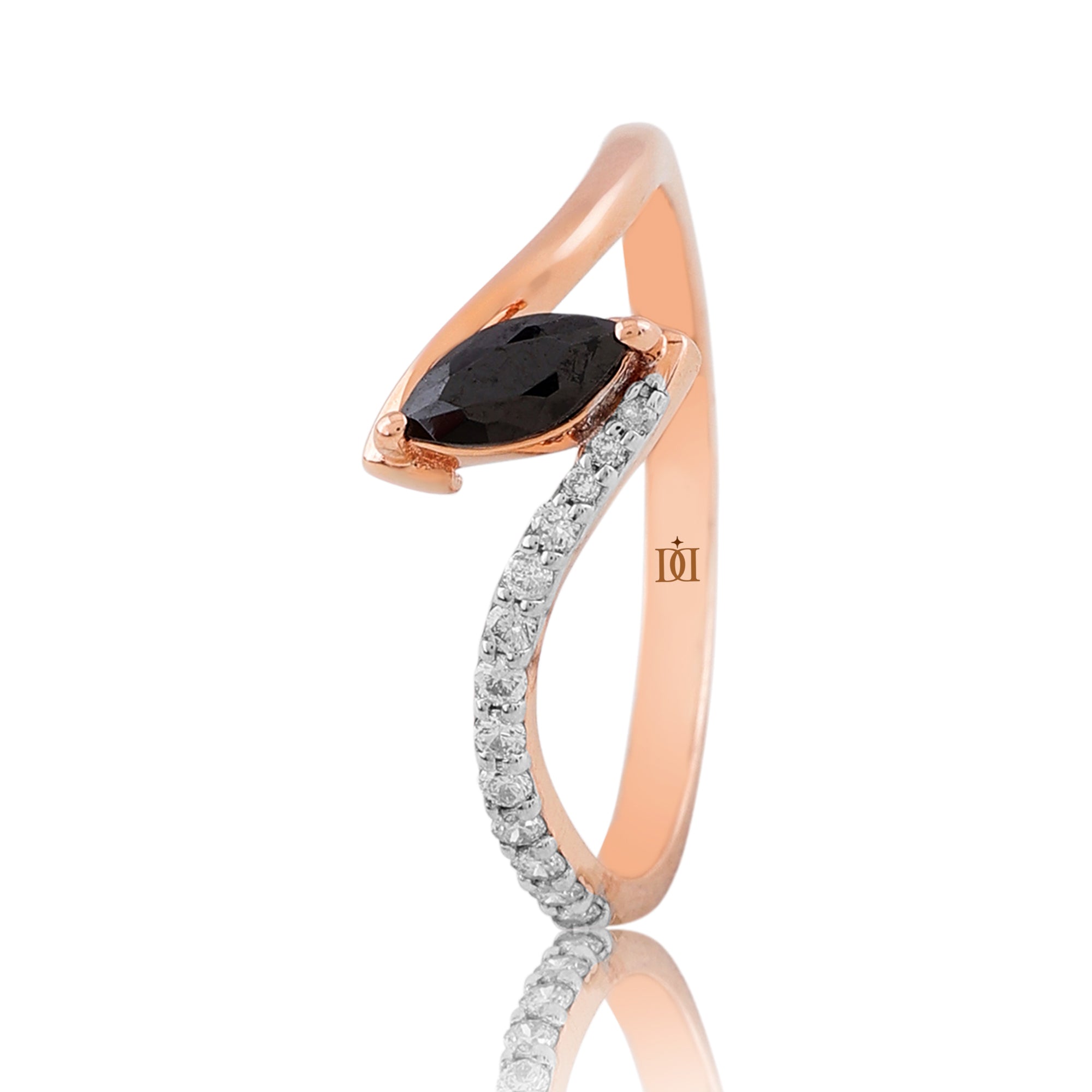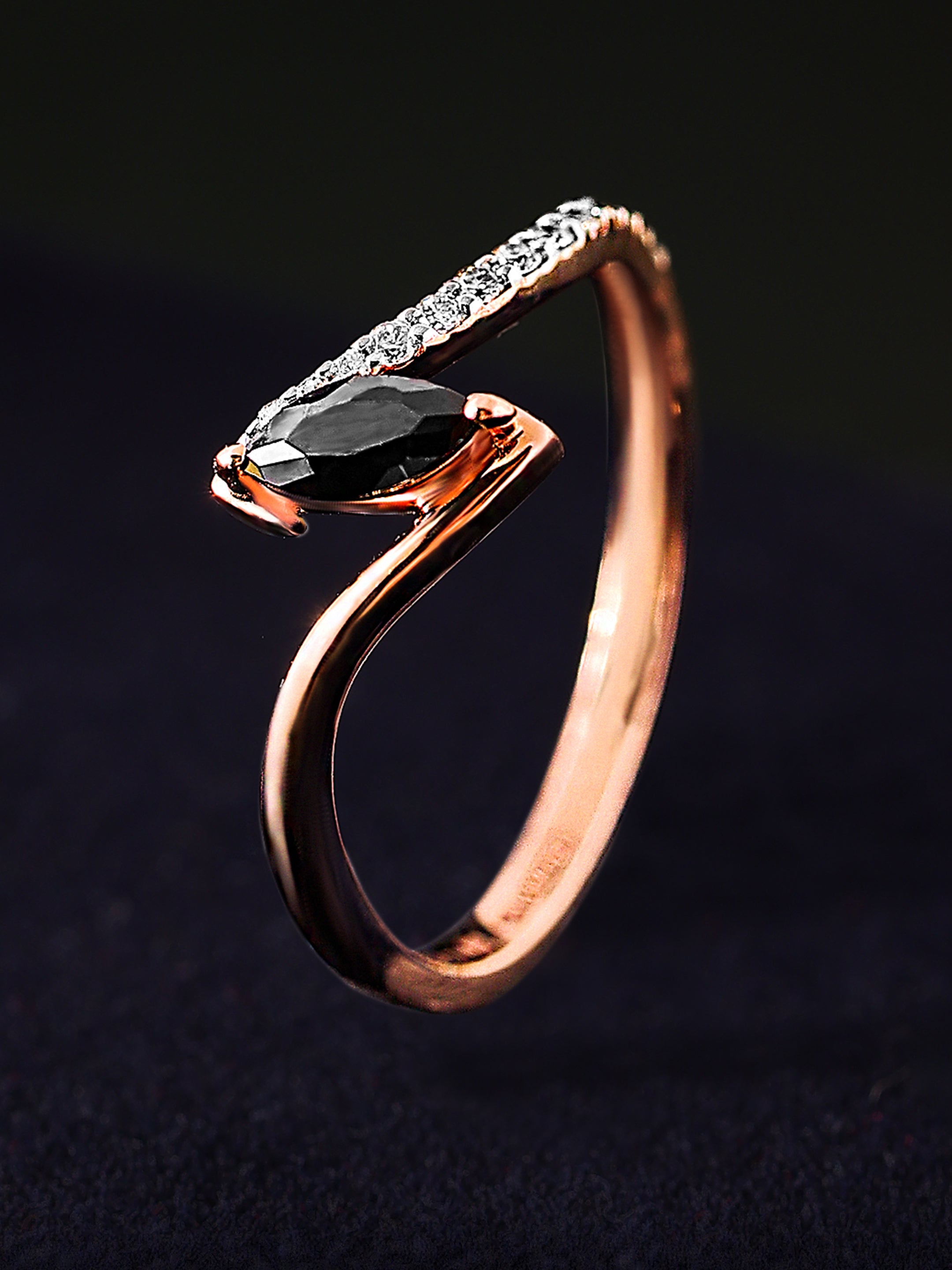 Experience the captivating elegance of the Serenade of the Dusk Diamond Ring. This exquisite ring features a striking marquise-cut black diamond, set gracefully within a sleek wave design of rose gold. A shimmering line of white diamonds enhances the fluidity of the design, symbolizing the seamless blend of strength and sophistication. Perfect for those who appreciate unique and contemporary elegance, this ring is a stunning representation of modern luxury and timeless allure.