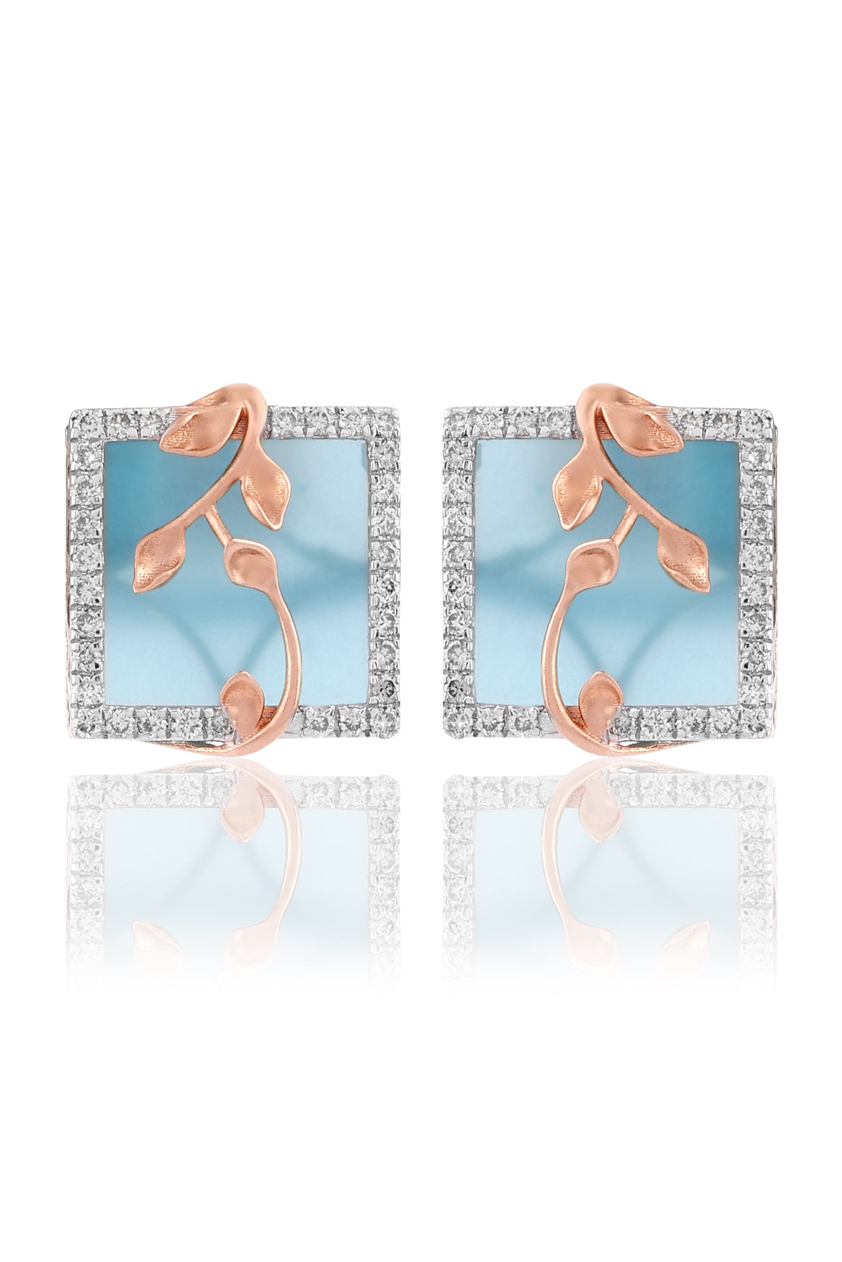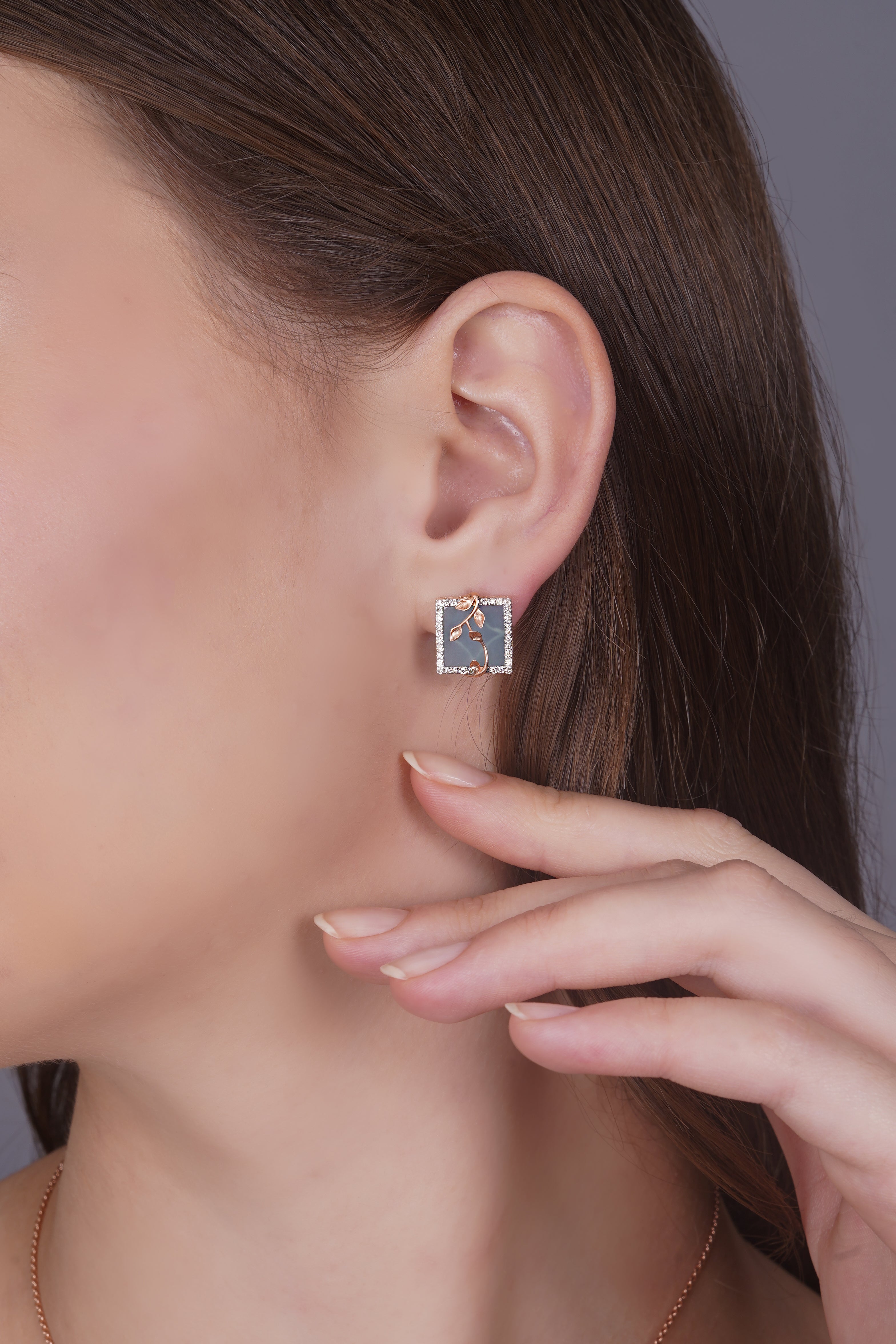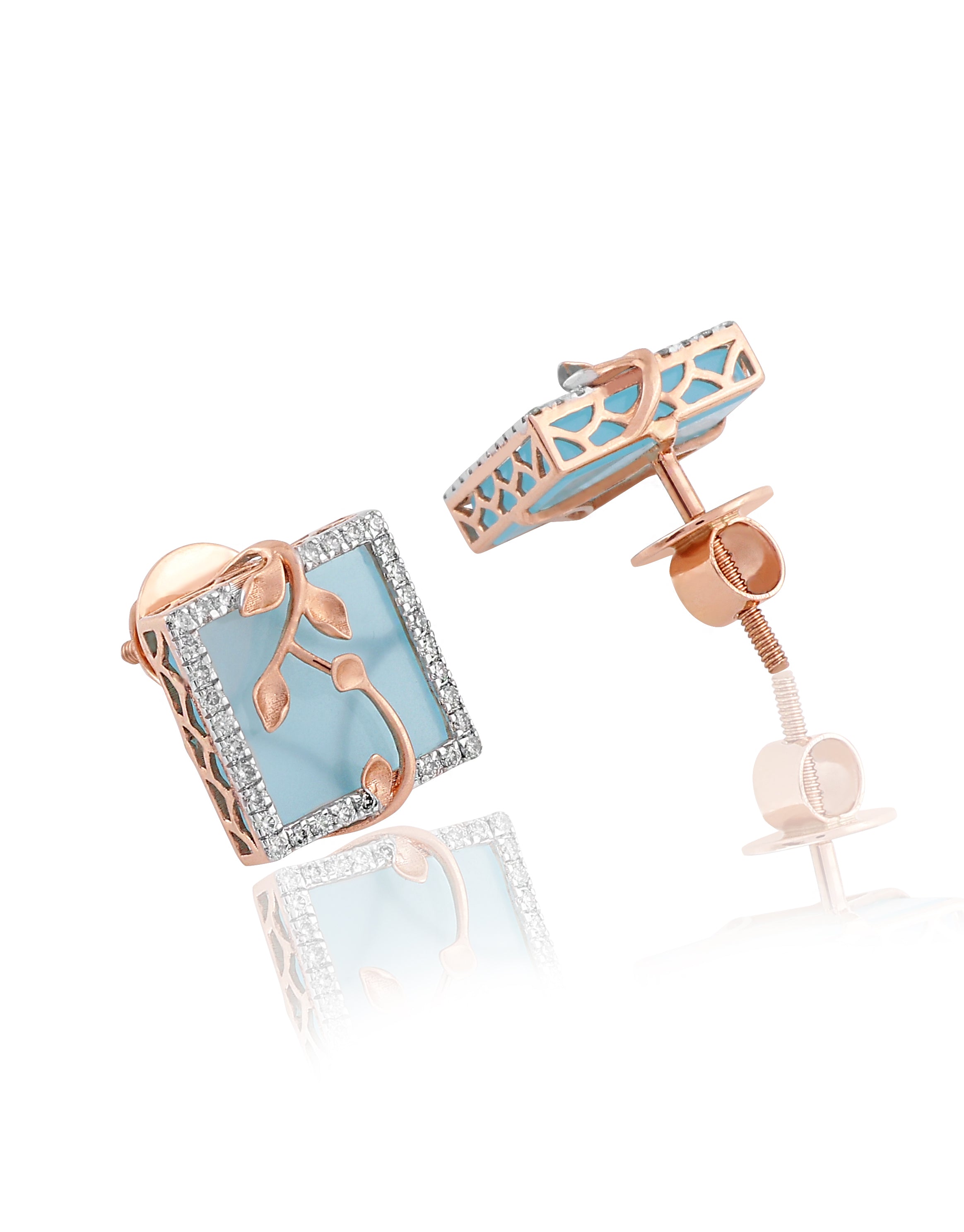 Discover the captivating allure of the Sky Strand Enamel Diamond Earrings – where brilliance meets enchanting blue hues. Indulge in the elegance of the Sky Strand Enamel Diamond Earrings. Crafted with precision, these earrings feature rectangular stud shapes, each adorned with intricate rose gold leaf motifs. The focal point of these earrings is the serene blue-enameled surface, reminiscent of the vast sky on a clear day.