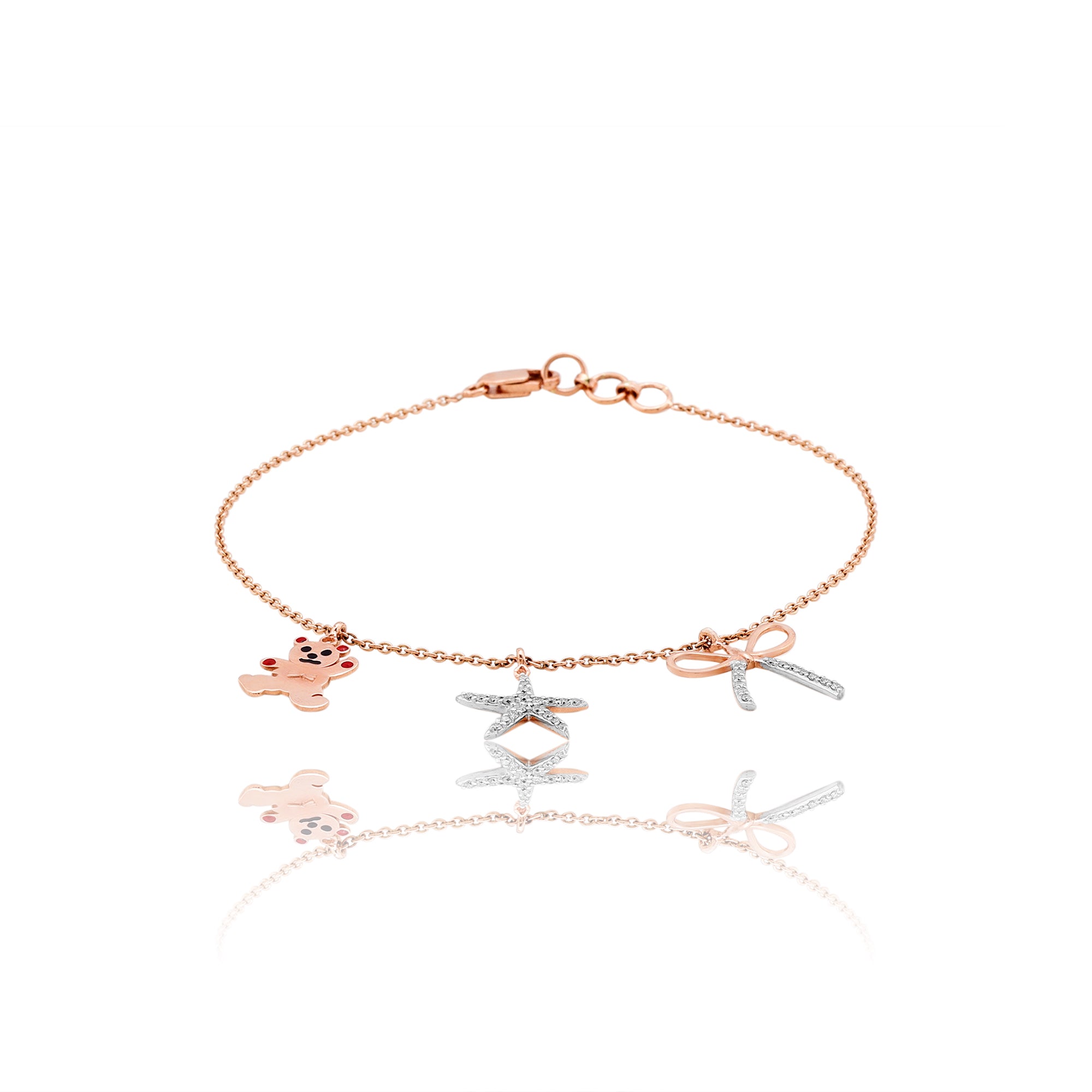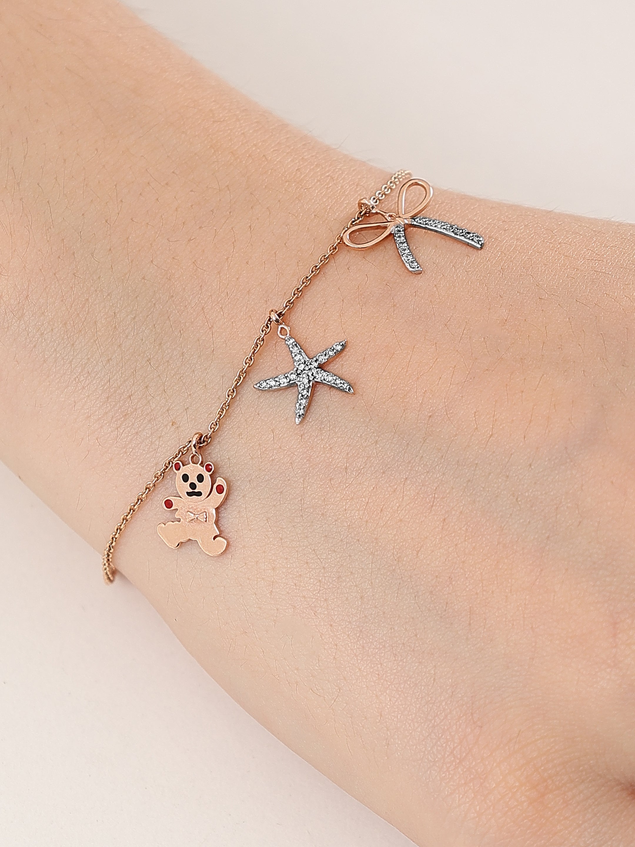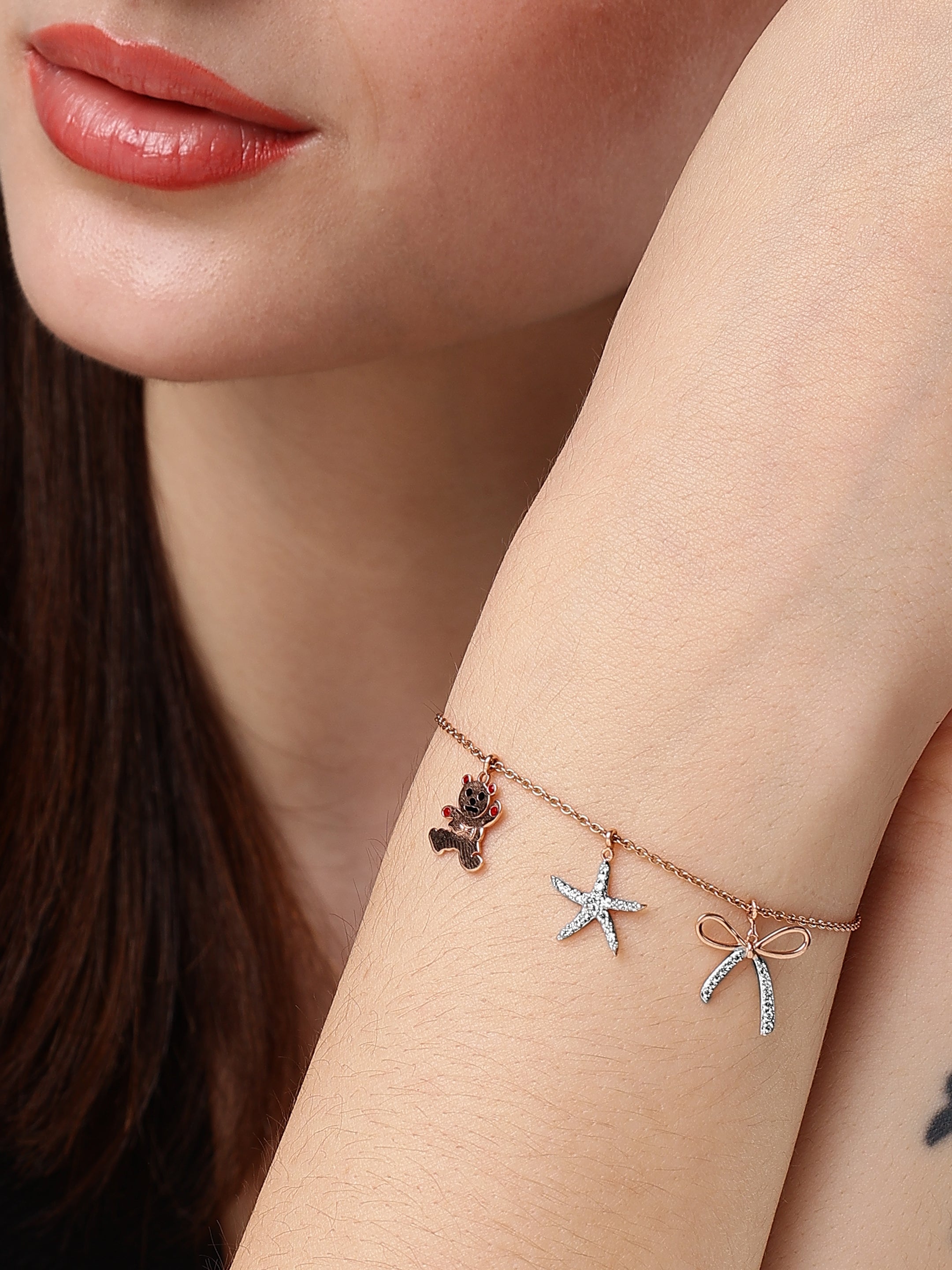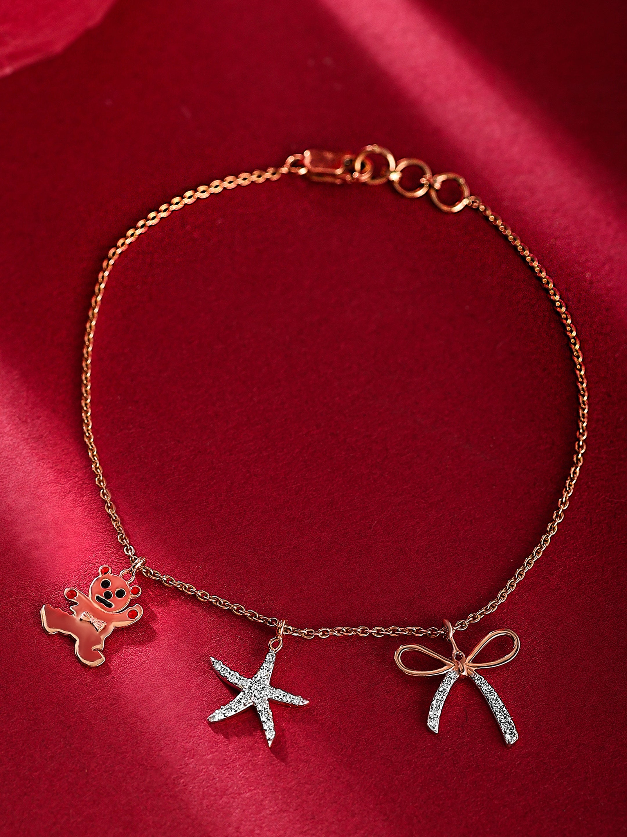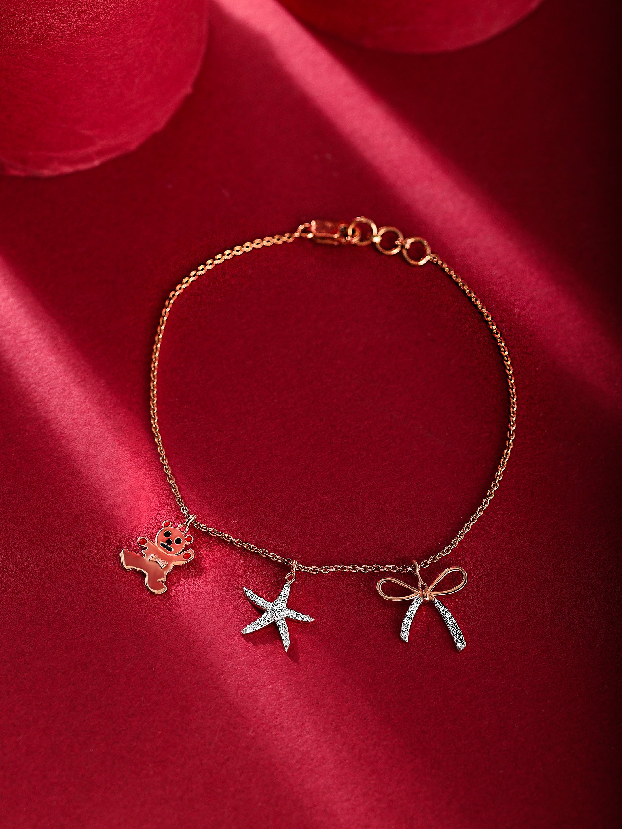 Introducing our enchanting "Starry Love" Diamond Bracelet. Embrace the whimsical charm of our "Starry Love" Diamond Bracelet. This exquisite piece showcases a delightful combination of star, bow, and teddy bear charms, creating a playful and adorable design. Each charm is meticulously crafted with round brilliant diamonds, adding a touch of elegance and sparkle to the bracelet.