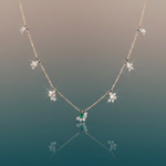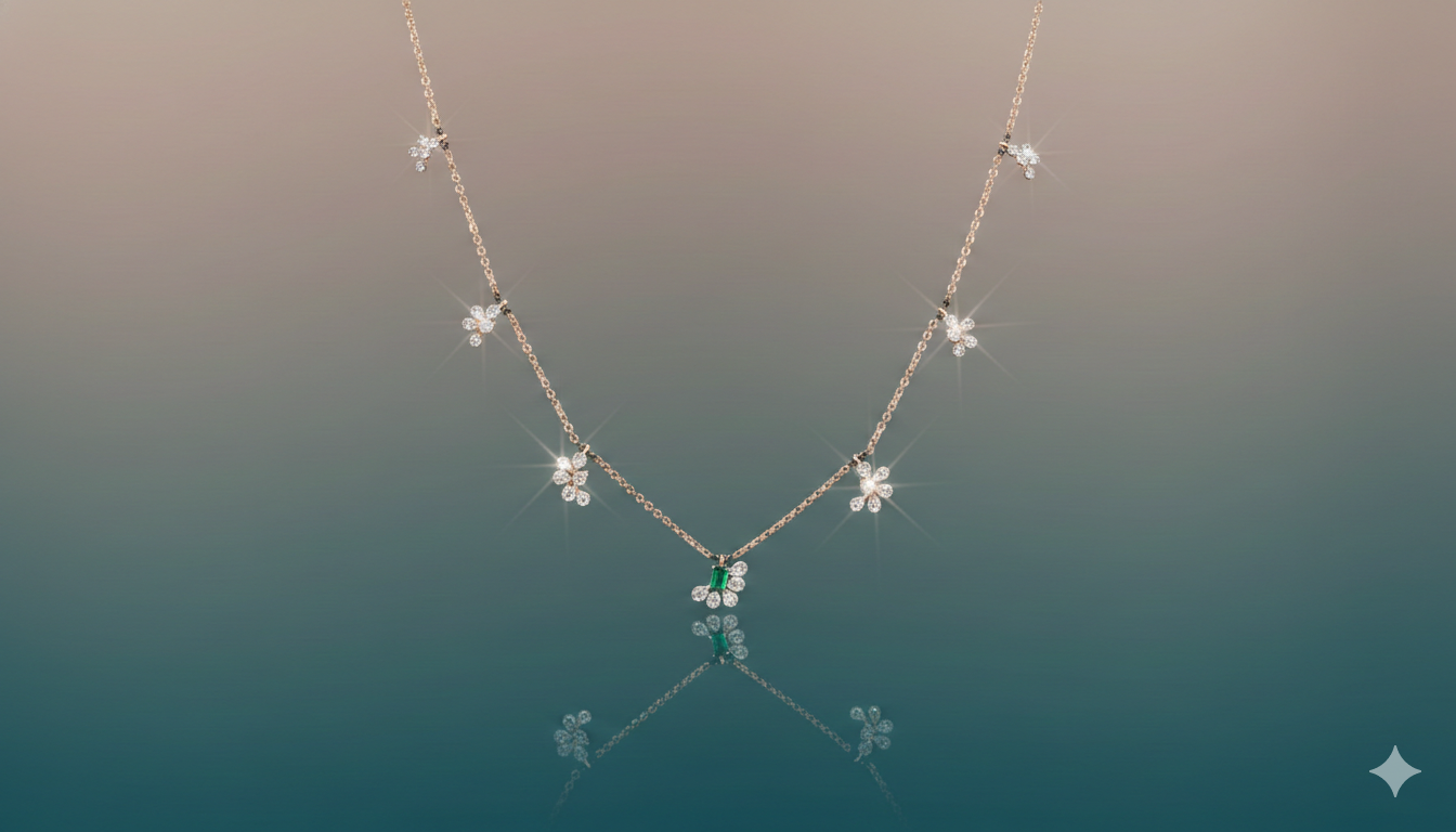 Experience the enchanting fusion of botanical grace and sacred tradition with the Emerald Flora Charm Mangalsutra, a contemporary masterpiece designed for the woman who loves a playful yet sophisticated aesthetic. This exquisite 14k rose gold necklace features a delicate chain accented with traditional black beads and adorned with a series of shimmering diamond floret charms that dance along the neckline. The central focal point is a unique floral motif featuring a vibrant green emerald at its heart, surrounded by brilliant-cut diamond petals that radiate a captivating glow. Each smaller floret charm mirrors this delicate petal design, creating a rhythmic and airy silhouette that feels light and modern. Handcrafted for those who seek a fresh perspective on heritage jewelry, this mangalsutra transitions effortlessly from refined daytime wear to a stunning statement for festive celebrations.