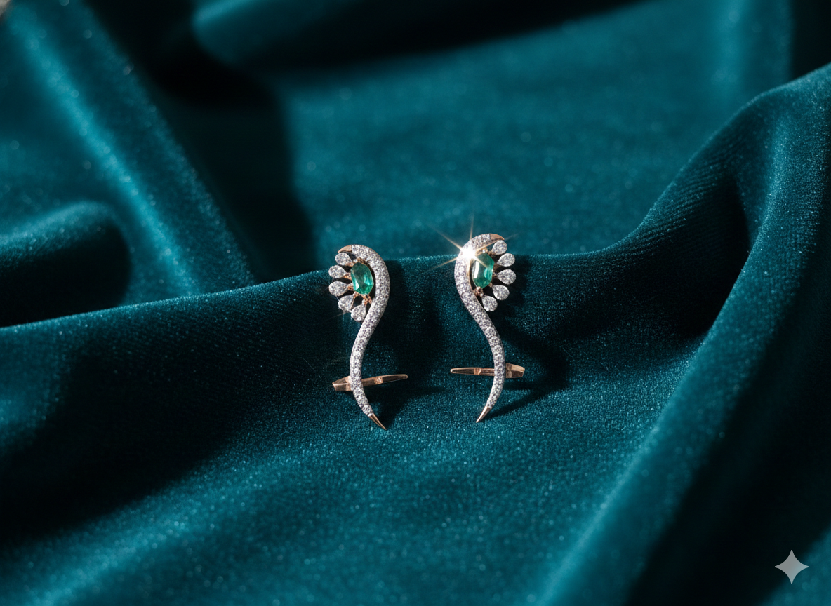 Embrace a fusion of avant-garde design and classic gemstone luxury with the Emerald Serpent Radiance Drops. These masterfully crafted earrings feature a fluid, serpentine silhouette in polished white gold that artfully curves behind the ear for a striking multi-dimensional effect. Each piece is anchored by a vibrant, marquise-cut emerald that radiates a deep, enchanting green. This focal gemstone is framed by a delicate halo of brilliant-cut diamonds and complemented by a trailing "tail" of shimmering pavé-set stones that taper to a sharp, modern point. Handcrafted for the woman who seeks a bold yet sophisticated statement, these earrings serve as a captivating masterpiece for high-profile evening events or a distinctive addition to a luxury heirloom collection.